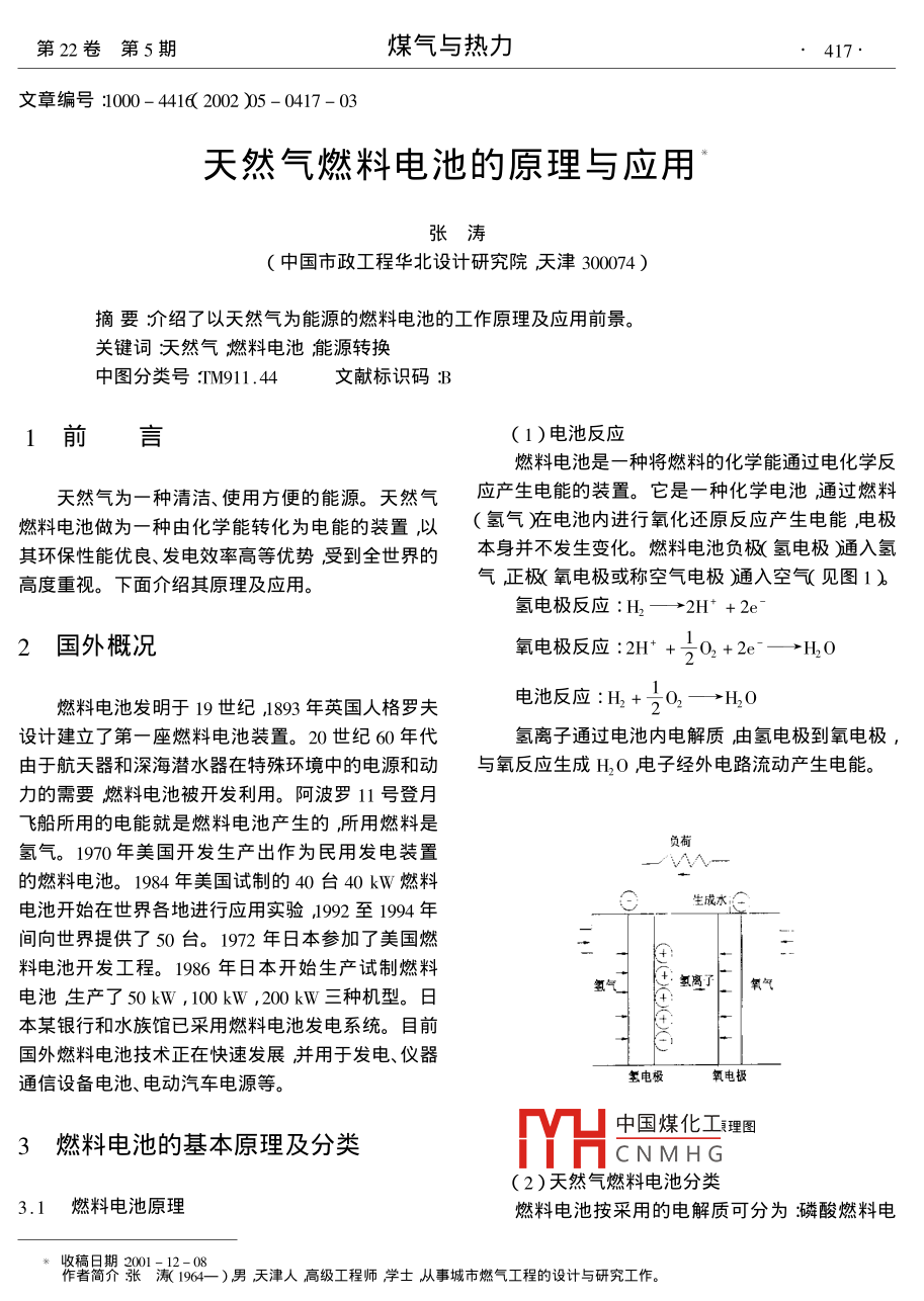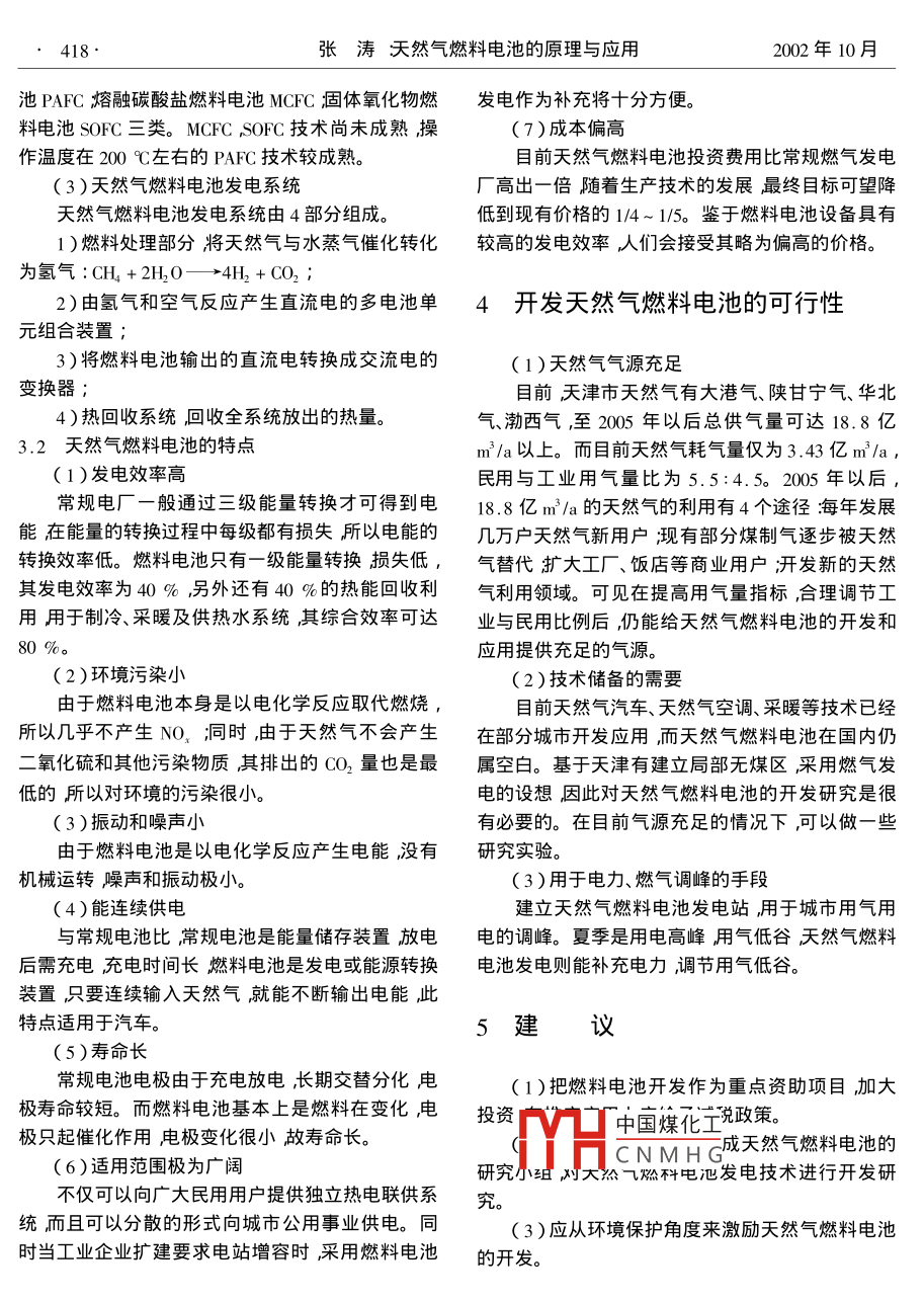 第22卷第5期煤氣與熱力417文章編號(hào):1000-44162002)5-0417-0天然氣燃料電池的原理與應(yīng)用張濤〔中國(guó)市政工程華北設(shè)計(jì)研究院天津300074)摘要介紹了以天然氣為能源的燃料電池的工作原理及應(yīng)用前景。關(guān)鍵詞夭然氣燃料電池能源轉(zhuǎn)換中圖分類號(hào):IM911.44文獻(xiàn)標(biāo)識(shí)碼3(1)電池反應(yīng)燃料電池是一種將燃料的化學(xué)能通過電化學(xué)反天然氣為一種清潔、使用方便的能源。天然氣應(yīng)產(chǎn)生電能的裝置。它是一種化學(xué)電池通過燃料燃料電池做為一種由化學(xué)能轉(zhuǎn)化為電能的裝置,以(氫氣在電池內(nèi)進(jìn)行氧化還原反應(yīng)產(chǎn)生電能電極其環(huán)保性能優(yōu)良發(fā)電效率高等優(yōu)勢(shì)受到全世界的本身并不發(fā)生變化。燃料電池負(fù)極氫電極通入氫高度重視。下面介紹其原理及應(yīng)用。氣正極氧電極或稱空氣電極通入空氣見圖1)氫電極反應(yīng):H,-2H++2e2國(guó)外概況氧電極反應(yīng):2H++10,+2e--H,O燃料電池發(fā)明于19世紀(jì),l893年英國(guó)人格羅夫電池反應(yīng):H2+2O—>HO設(shè)計(jì)建立了第一座燃料電池裝置。20世紀(jì)60年代氫離子通過電池內(nèi)電解質(zhì)由氫電極到氧電極由于航天器和深海潛水器在特殊環(huán)境中的電源和動(dòng)與氧反應(yīng)生成HO電子經(jīng)外電路流動(dòng)產(chǎn)生電能。力的需要燃料電池被開發(fā)利用。阿波羅11號(hào)登月飛船所用的電能就是燃料電池產(chǎn)生的所用燃料是氫氣。1970年美國(guó)開發(fā)生產(chǎn)出作為民用發(fā)電裝置負(fù)荷一的燃料電池。1984年美國(guó)試制的40臺(tái)40kW燃料電池開始在世界各地進(jìn)行應(yīng)用實(shí)驗(yàn),992至1994年生成水間向世界提供了50臺(tái)。1972年日本參加了美國(guó)燃料電池開發(fā)工程。1986年日本開始生產(chǎn)試制燃料氫離電池生產(chǎn)了50kW,100kW,200kW三種機(jī)型。日本某銀行和水族館已采用燃料電池發(fā)電系統(tǒng)。目前國(guó)外燃料電池技術(shù)正在快速發(fā)展并用于發(fā)電、儀器通信設(shè)備電池、電動(dòng)汽車電源等。氫電極氧電極中國(guó)煤化工理圖3燃料電池的基本原理及分類CNMHG(2)天然氣燃料電池分類3.1燃料電池原理燃料電池按采用旳電解質(zhì)可分為濋磷酸燃料電作著3-)男天津人高級(jí)工程師學(xué)士從事城市燃?xì)夤こ痰脑O(shè)計(jì)與研究工作418張濤天然氣燃料電池的原理與應(yīng)用2002年10月池PAFC嫆融碳酸鹽燃料電池MCFC固體氧化物燃發(fā)電作為補(bǔ)充將十分方便。料電池SOFC三類。 MCFC SOFC技術(shù)尚未成熟操(7)成本偏高作溫度在200℃左右的PAFC技術(shù)較成熟。目前天然氣燃料電池投資費(fèi)用比常規(guī)燃?xì)獍l(fā)電(3)天然氣燃料電池發(fā)電系統(tǒng)廠高岀一倍隨著生產(chǎn)技術(shù)的發(fā)展最終目標(biāo)可望降天然氣燃料電池發(fā)電系統(tǒng)由4部分組成。低到現(xiàn)有價(jià)格的1/4~1/5。鑒于燃料電池設(shè)備具有1)燃料處理部分將天然氣與水蒸氣催化轉(zhuǎn)化較高的發(fā)電效率人們會(huì)接受其略為偏高的價(jià)格。為氫氣:CH4+2H2O—·4H2+CO22)由氫氣和空氣反應(yīng)產(chǎn)生直流電的多電池單4開發(fā)天然氣燃料電池的可行性元組合裝置3)將燃料電池輸岀的直流電轉(zhuǎn)換成交流電的(1)天然氣氣源充足變換器;目前天津市天然氣有大港氣、陜甘寧氣、華北4)熱回收系統(tǒng)回收全系統(tǒng)放出的熱量。氣、渤西氣,至2005年以后總供氣量可達(dá)18.8億3.2天然氣燃料電池的特點(diǎn)m3/a以上。而目前天然氣耗氣量?jī)H為3.43億m/a(1)發(fā)電效率高民用與工業(yè)用氣量比為5.5:4.5。2005年以后常規(guī)電廠一般通過三級(jí)能量轉(zhuǎn)換才可得到電188億m3/a的天然氣的利用有4個(gè)途徑海年發(fā)展能在能量的轉(zhuǎn)換過程中每級(jí)都有損失所以電能的幾萬(wàn)戶天然氣新用戶現(xiàn)有部分煤制氣逐步被天然轉(zhuǎn)換效率低。燃料電池只有一級(jí)能量轉(zhuǎn)換損失低,氣替代大工廠、飯店等商業(yè)用戶汧發(fā)新的天然其發(fā)電效率為40%,另外還有40%的熱能回收利氣利用領(lǐng)域??梢娫谔岣哂脷饬恐笜?biāo)合理調(diào)節(jié)工用用于制冷、采暖及供熱水系統(tǒng)其綜合效率可達(dá)業(yè)與民用比例后,仍能給天然氣燃料電池的開發(fā)和應(yīng)用提供充足的氣源。(2)環(huán)境污染小(2)技術(shù)儲(chǔ)備的需要由于燃料電池本身是以電化學(xué)反應(yīng)取代燃燒目前天然氣汽車、天然氣空調(diào)、采暖等技術(shù)已經(jīng)所以幾乎不產(chǎn)生NO.洞同時(shí)由于天然氣不會(huì)產(chǎn)生在部分城市開發(fā)應(yīng)用而天然氣燃料電池在國(guó)內(nèi)仍二氧化硫和其他污染物質(zhì)其排出的CO2量也是最屬空白?;谔旖蛴薪⒕植繜o(wú)煤區(qū)采用燃?xì)獍l(fā)低的所以對(duì)環(huán)境的污染很小電的設(shè)想因此對(duì)天然氣燃料電池的開發(fā)研究是很(3)振動(dòng)和噪聲小有必要的。在目前氣源充足的情況下,可以做一些由于燃料電池是以電化學(xué)反應(yīng)產(chǎn)生電能沒有研究實(shí)驗(yàn)。機(jī)械運(yùn)轉(zhuǎn)噪聲和振動(dòng)極小(3)用于電力、燃?xì)庹{(diào)峰的手段(4)能連續(xù)供電建立天然氣燃料電池發(fā)電站用于城市用氣