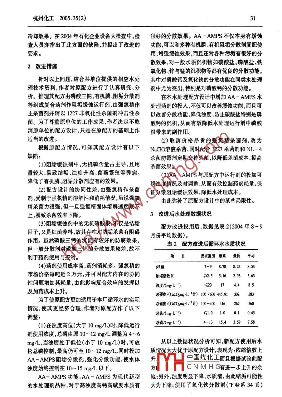 30杭州化工2005. 35(2)2 000 m3 /h循環(huán)水系統(tǒng)配方設(shè)計改進俞志橋(中石化集團杭州煉油廠,浙江杭州310005)摘要:介紹了煉油工藝2000m3/h循環(huán)水系統(tǒng)配方設(shè)計改進的情況及效果,由此證明新配方的改進是有效的,可行的。隨著AA- AMPS的加入和原配方設(shè)計用藥的調(diào)整使新配方的使用效果大大優(yōu)于原配方,取得了較好的成效。關(guān)鍵詞:循環(huán)水;配方設(shè)計;水處理;AA - AMPS循環(huán)冷卻水的處理除了先天的工藝條件外,1改進前循環(huán)水水質(zhì)狀況-個理想的水處理藥劑配方對循環(huán)水水處理的成功與否有決定性的影響。一般說,循環(huán)水配方設(shè)改進前(2004年1-6月份)循環(huán)水平均水質(zhì)計的主要原則是遵循相應(yīng)的水質(zhì)條件,運行工況數(shù)據(jù)見表1。和技術(shù)經(jīng)濟的綜合比較。從實用的角度看,一個表1改進前循環(huán)水水質(zhì)狀況成功的水處理配方應(yīng)具有緩蝕、阻垢、分散、殺菌項目要求范圍最高最低平均滅藻等整體功能。在許多水處理藥劑中,很少有一種藥劑能同時兼有以上各種功能的,因此,-一個pH值7.5~9 9.12 7.08 8.21旅縮倍敷K2.0~3.5 2.72 1.60 2.20配方中往往有多種藥劑組成,甚至同一種功能有時也會選擇兩種以上的藥劑復(fù)合使用,以利用其濁度/
