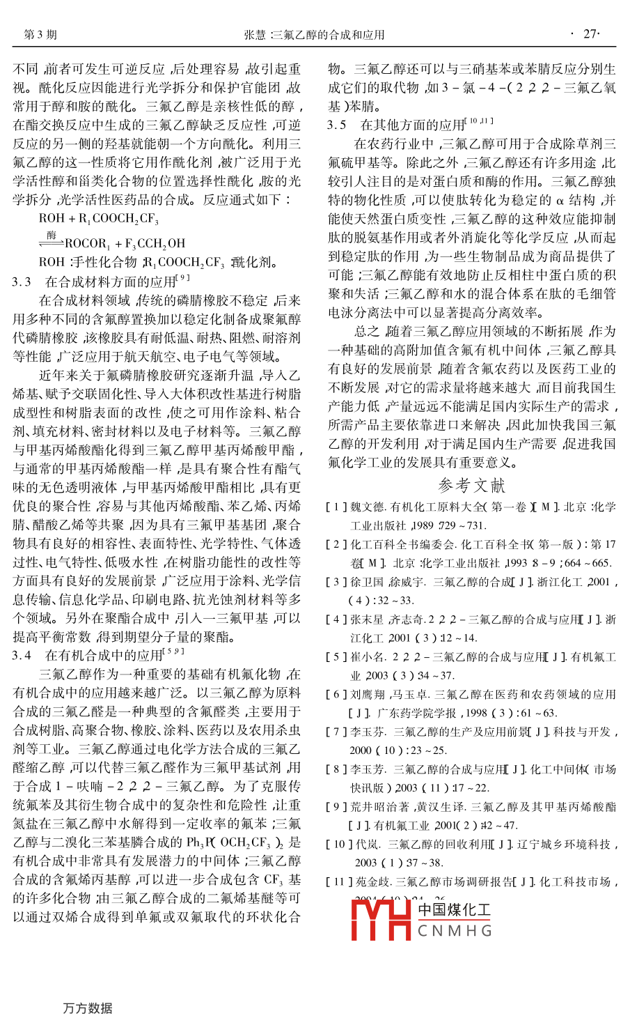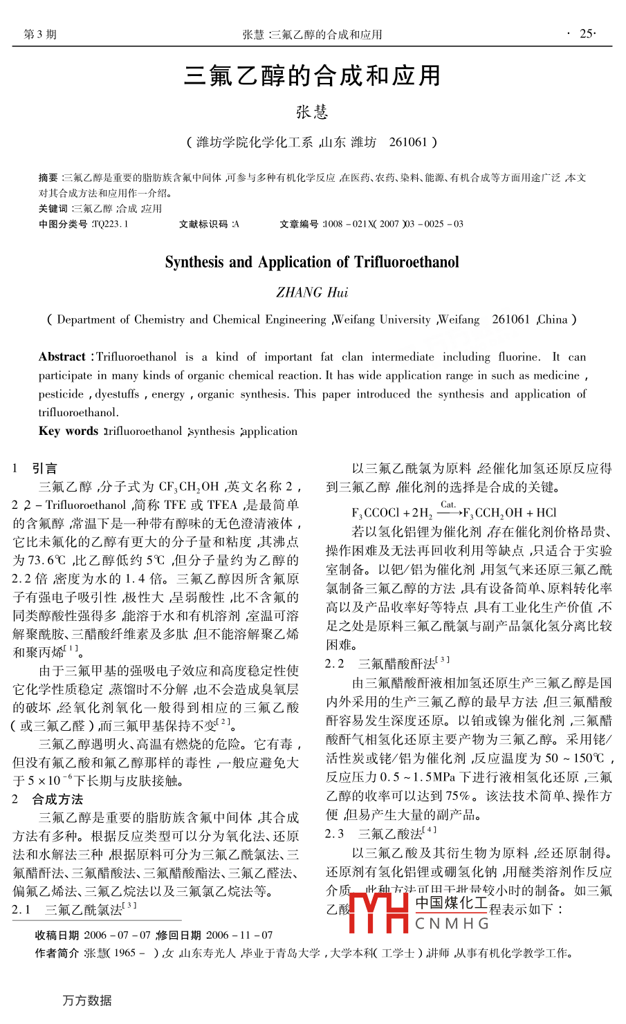 第3期張慧:三氟乙醇的合成和應(yīng)用氟乙醇的合成和應(yīng)用張慧濰坊學(xué)院化學(xué)化工系山東濰坊261061)摘要:三氟乙醇是重要的脂肪族含氟中間體可參與多種有機(jī)化學(xué)反應(yīng)在醫(yī)藥、農(nóng)藥、染料、能源、有機(jī)合成等方面用途廣泛本文對(duì)其合成方法和應(yīng)用作一介紹關(guān)鍵詞:三氟乙醇冾成應(yīng)用中圖分類號(hào)TQ223.1文獻(xiàn)標(biāo)識(shí)碼:A文章編號(hào)1008-021X(200703-0025-03Synthesis and application of TrifluoroethanolZHANG HurDepartment of Chemistry and Chemical Engineering Weifang University , Weifang 261061 ChinaAbstract: Trifluoroethanol is a kind of important fat clan intermediate including fluorine. It canparticipate in many kinds of organic chemical reaction. It has wide application range in such as medicinepesticide dyestuffs energy organic synthesis. This paper introduced the synthesis and application ofKey words Trifluoroethanol synthesis application1引言以三氟乙酰氯為原料經(jīng)催化加氫還原反應(yīng)得三氟乙醇分子式為CF3CH2OH,英文名稱2,到三氟乙醇催化劑的選擇是合成的關(guān)鍵。22- Trifluoroethanol簡(jiǎn)稱TFE或TFEA,是最簡(jiǎn)單F3 CCOCI+2H2-F, CCH, OH + HCl的含氟醇常溫下是一種帶有醇味的無(wú)色澄清液體它比未氟化的乙醇有更大的分子量和粘度,其沸點(diǎn)若以氫化鋁鋰為催化劑存在催化劑價(jià)格昂貴為73.6℃,比乙醇低約5℃但分子量約為乙醇的操作困難及無(wú)法再回收利用等缺點(diǎn),只適合于實(shí)驗(yàn)22倍密度為水的1.4倍。三氟乙醇因所含氟原至制備。以鈀/鋁為催化劑用氫氣來(lái)還原三氟乙酰子有強(qiáng)電子吸引性性大星弱酸性,比不含氟的氯制備三氟乙醇的方法具有設(shè)備簡(jiǎn)單、原料轉(zhuǎn)化率同類醇酸性強(qiáng)得多能溶于水和有機(jī)溶劑室溫可溶高以及產(chǎn)品收率好等特點(diǎn)具有工業(yè)化生產(chǎn)價(jià)值不解聚酰胺、三醋酸纖維素及多肽但不能溶解聚乙烯足之處是原料三氟乙酰氯與副產(chǎn)品氯化氫分離比較和聚丙烯1l困難。由于三氟甲基的強(qiáng)吸電子效應(yīng)和高度穩(wěn)定性使2三氟醋酸酐法3它化學(xué)性質(zhì)穩(wěn)定蒸餾時(shí)不分解也不會(huì)造成臭氧層由三氟醋酸酐液相加氫還原生產(chǎn)三氟乙醇是國(guó)的破壞經(jīng)氧化劑氧化一般得到相應(yīng)的三氟乙酸內(nèi)外采用的生產(chǎn)三氟乙醇的最早方法但三氟醋酸(或三氟乙醛)而三氟甲基保持不變21。酐容易發(fā)生深度還原。以鉑或鎳為催化劑,三氟醋三氟乙醇遇明火、高溫有燃燒的危險(xiǎn)。它有毒酸酐氣相氫化還原主要產(chǎn)物為三氟乙醇。采用銠/但沒(méi)有氟乙酸和氟乙醇那樣的毒性,般應(yīng)避免大活性炭或銠/鋁為催化劑,反應(yīng)溫度為50-150℃于5×10-6下長(zhǎng)期與皮膚接觸反應(yīng)壓力0.5~1.5MPa下進(jìn)行液相氫化還原,三氟2合成方法乙醇的收率可以達(dá)到75%。該法技術(shù)簡(jiǎn)單、操作方氟乙醇是重要的脂肪族含氟中間體其合成便但易產(chǎn)生大量的副產(chǎn)品。方法有多種。根據(jù)反應(yīng)類型可以分為氧化法、還原2.3三氟乙酸法4法和水解法三種根據(jù)原料可分為三氟乙酰氯法、三以三氟乙酸及其衍生物為原料,經(jīng)還原制得。氟醋酐法、三氟醋酸法、三氟醋酸酯法、三氟乙醛還原劑有氫化鋁鋰或硼氫化鈉用醚類溶劑作反應(yīng)偏氟乙烯法、三氟乙烷法以及三氟氯乙烷法等。可田干卌暑較小時(shí)的制備。如三氟2.1三氟乙酰氯法3ZMTYHE中國(guó)煤化工程表示如下CNMHG收稿日期2006-07-07修回日期2006-11-07作者簡(jiǎn)介漲慧(1965-)女山東壽光人畢業(yè)于青島大學(xué),大學(xué)本科(工學(xué)士)講師從事有機(jī)化學(xué)教學(xué)工作。東化26SHANDONG CHEMICAL INDUSTRY2007年第36卷LiAIH,/( C2Hs)OF3 COOHCF3 CH,OHF, CCHX+h0-F, CCh.oh +HX為避免使用昂貴的氫化鋁鋰或硼氫化鈉用催以鑭的磷酸鹽為催化劑,以三氟鹵乙烷氣相水化加氫還原法對(duì)生產(chǎn)更為有利,催化劑多以鉑、銠、解制備三氟乙醇轉(zhuǎn)化率可達(dá)62%錸等金屬做催化劑的中心金屬。在催化劑作用下,3三氟乙醇的應(yīng)用lmol的F3 CCOOH與2mol的H2反應(yīng),可生成lmol三氟乙醇是重要的基本有機(jī)氟化物,本身不僅的CF3CH2CH。反應(yīng)式如下具有獨(dú)特的物化性質(zhì)可直接用作各種溶劑熱力學(xué)工質(zhì)而且與其它物質(zhì)作用合成的產(chǎn)品大都具有十F3 COOH+2H2一→F3CCH2OH分優(yōu)異的性能隊(duì)從而在農(nóng)藥、醫(yī)藥合成、染料合成、有反應(yīng)可以在氣相中進(jìn)行也可以在液相中進(jìn)行機(jī)合成、材料等領(lǐng)域得到了廣泛的應(yīng)用。2.4三氟醋酸酯法43.1在醫(yī)藥方面的用途6先把三氟乙酸酯化后再用硼氫化鈉還原制得三氟乙醇最重要的用途是麻醉劑。由其衍生的反應(yīng)過(guò)程如下麻醉劑主要有:很久以前就開始使用的溴氟烷F3 COOH+PhCH2OH—→CF3 COOCH2Ph( CF CHBrCI)但因副作用問(wèn)題現(xiàn)在已不再使用CF COOCH, Ph NaBH4而代之以三氟乙醇的醚衍生物。當(dāng)初使用三氟乙醇→CF3CH2OH+PhCH2OH該工藝首先將三氟乙酸與芐醇混合并煮沸5h與乙炔加成合成的氟乙烯醚(CF3CH2OCH=CH2)但后來(lái)開發(fā)出無(wú)可燃性、低毒性的異氟烷同時(shí)蒸去反應(yīng)生成的水。然后反應(yīng)混合物冷卻至80℃再用NaBH4還原可得相當(dāng)純的三氟乙醇(CF