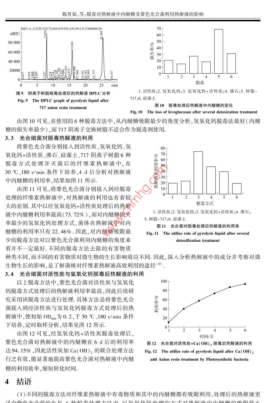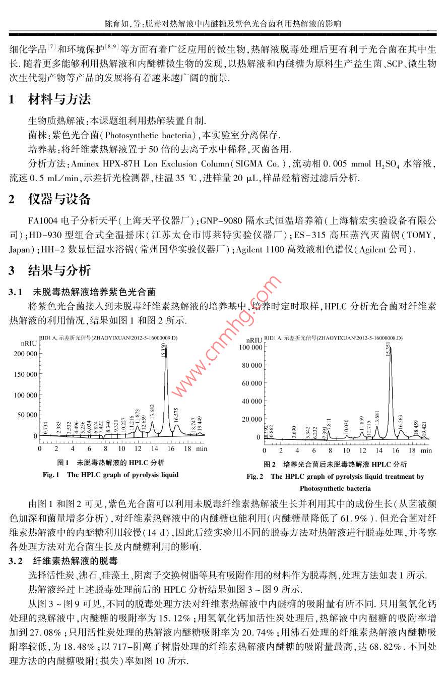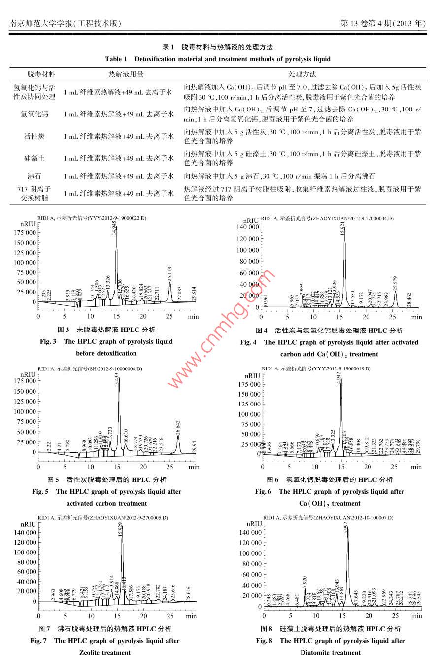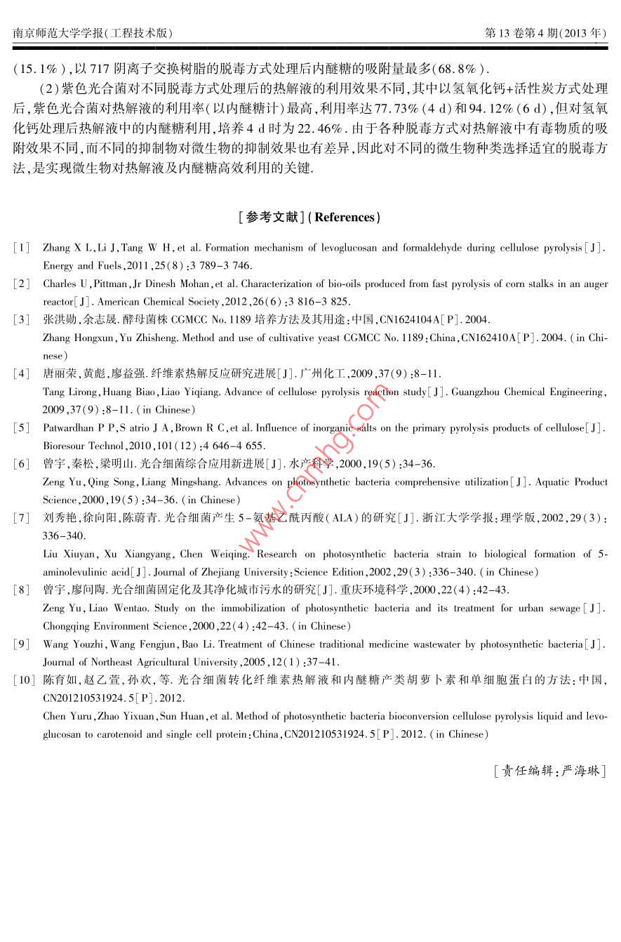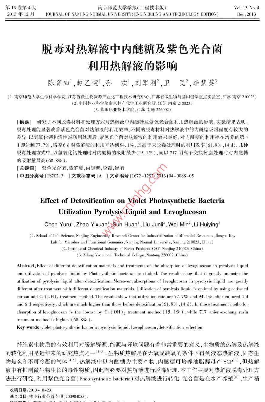 第13卷第4期南京師范大學(xué)學(xué)報(bào)(工程技術(shù)版)Vol 13 No 42013F H JOURNAL OF NANJING NORMAL UNIVERSITY( ENGINEERING AND TECHNOLOGY EDITION)Dec 2013脫毒對(duì)熱解液中內(nèi)醚糖及紫色光合菌利用熱解液的影響陳育如,趙乙萱,孫歡,劉軍利2,衛(wèi)民2,李慧英1.南京師范大學(xué)生命科學(xué)學(xué)院,江蘇省微生物資源產(chǎn)業(yè)化工程技術(shù)研究中心,江蘇省微生物與基因組學(xué)重點(diǎn)實(shí)驗(yàn)室,江蘇南京210023)(2,中國(guó)林業(yè)科學(xué)院南京林產(chǎn)化學(xué)工業(yè)研究所,江蘇南京210023)(3.紫瑯職業(yè)技術(shù)學(xué)院,江蘇南通226002)[摘要]研究了不同脫毒材料和處理方式對(duì)熱解液中內(nèi)醚糖及紫色光合菌利用熱解液的影響.實(shí)驗(yàn)結(jié)果表明脫毒處理能顯著改善紫色光合菌對(duì)熱解液的利用效率,不同的脫毒材料對(duì)熱解液中的內(nèi)醚糖吸附程度有較大的差異.以氫氧化鈣和活性炭聯(lián)用處理后,紫色光合菌對(duì)熱解液的利用效果最好,對(duì)內(nèi)醚糖的利用率在培養(yǎng)的第4d即達(dá)到77.7%,培養(yǎng)6d對(duì)熱解液的利用率達(dá)到94.1%,遠(yuǎn)高于未脫毒處理時(shí)的利用效率(61.9%,14d).幾種脫毒處理方式中,以氫氧化鈣處理時(shí)對(duì)內(nèi)醚糖的吸附最少(15.1%),而以717陰離子交換樹(shù)脂處理時(shí)對(duì)內(nèi)醚糖的吸附量最高(68.8%[關(guān)鍵詞]紫色光合菌,熱解液,內(nèi)醚糖,脫毒,影響[中圖分類(lèi)號(hào)]TS202.3[文獻(xiàn)標(biāo)志碼]A[文章編號(hào)]1672-1292(2013)04-0088-05Effect of Detoxification on Violet Photosynthetic BacteriaUtilization Pyrolysis Liquid and LevoglucosanChen Yuru, Zhao Yixuan, Sun Huan, Liu Junli, Wei Min, Li huiyingSchool of Life Science, Nanjing Engineering Research Center for Industrialization of Microbial Resources, Jiangsu Keyab for Microbes and Functional Genomics, Nanjing Normal University, Nanjing 210023, China(2. Institute of Chemical Industry of Forest Products, CAF, Nanjing 210023, China)(3. Zilang Vocational Technical College, Nantong 226002, ChinaAbstract: Effect of different detoxification materials and treatments on the absorption of levoglucosan in pyrolysis liquidand utilization of pyrolysis liquid by Photosynthetic bacteria are studied. The results show that it greatly promotes theutilization of pyrolysis liquid after detoxification. Moreover, absorptions of levoglucosan in pyrolysis liquid are greatlydifferent after treatment with different detoxification materials. Utilization of pyrolysis liquid is optimal by using activatedcarbon add Ca(OH), treatment method. The results show that utilization rate are 77. 7% and 94. 1% after cultured 4 dand 6 d respectively, which are much higher than those before detoxification( 61. 9%, 14 d). In those treatment methodsabsorption of levoglucosan is the lowest by Ca( OH)2 treatment method( 15. 1%), while 717 anion-exchang resintreatment method is hightest( 68. 8%)Key words: violet photosynthetic bacteria, pyrolysis liquid, Levoglucosan, detoxification, effection纖維素生物質(zhì)的有效利用對(duì)緩解資源、能源與環(huán)境問(wèn)題有著非常重要的意義,生物質(zhì)的熱解及熱解液的轉(zhuǎn)化利用是近年來(lái)的研究熱點(diǎn)之一-3.生物質(zhì)熱解是在無(wú)氧或缺氧的條件下得到液態(tài)熱解液、固態(tài)生物焦炭和不可冷凝的氣體3.熱解液中以?xún)?nèi)醚糖為主要產(chǎn)物,內(nèi)醚糖可培養(yǎng)油脂酵母產(chǎn)SCP3,但熱解液中有抑制微生物生長(zhǎng)的毒性物質(zhì),因此有必要對(duì)熱解液進(jìn)行脫毒處理.本工作主要對(duì)熱解液脫毒處理方法進(jìn)行研究,利用紫色光合菌( Photosynthetic bacteria)對(duì)熱解液進(jìn)行轉(zhuǎn)化光合菌是在水產(chǎn)養(yǎng)殖6、生產(chǎn)精收稿日期:2013-10-2基金項(xiàng)目:林業(yè)行業(yè)公益專(zhuān)項(xiàng)(200904055)陳育如,等:脫毒對(duì)熱解液中內(nèi)醚糖及紫色光合菌利用熱解液的影響細(xì)化學(xué)品和環(huán)境保護(hù)9等方面有著廣泛應(yīng)用的微生物,熱解液脫毒處理后更有利于光合菌在其中生長(zhǎng).隨著更多能夠利用熱解液和內(nèi)醚糖微生物的發(fā)現(xiàn),以熱解液和內(nèi)醚糖為原料生產(chǎn)益生菌、SCP、微生物次生代謝產(chǎn)物等產(chǎn)品的發(fā)展將有著越來(lái)越廣闊的前景.材料與方法生物質(zhì)熱解液:本課題組利用熱解裝置自制菌株:紫色光合菌( Photosynthetic bacteria),本實(shí)驗(yàn)室分離保存培養(yǎng)基:將纖維素?zé)峤庖褐糜?0倍的去離子水中稀釋,滅菌備用.分析方法: Aminex hPX87 H Lon Exclusion Column( SIGMA CO.),流動(dòng)相0.005 mmol H2SO4水溶液,流速0.5mL/min,示差折光檢測(cè)器,柱溫35℃,進(jìn)樣量20μL,樣品經(jīng)精密過(guò)濾后分析.2儀器與設(shè)備FA1004電子分析天平(上海天平儀器廠);GNP-9080隔水式恒溫培養(yǎng)箱(上海精宏實(shí)驗(yàn)設(shè)備有限公司);HD-930型組合式全溫?fù)u床(江蘇太倉(cāng)市博萊特實(shí)驗(yàn)儀器廠);ES-315高壓蒸汽滅菌鍋(TOMY,Japan);HH-2數(shù)顯恒溫水浴鍋(常州國(guó)華實(shí)驗(yàn)儀器廠); Agilent110高效液相色譜儀( agilent公司)3結(jié)果與分析3.1未脫毒熱解液培養(yǎng)紫色光合菌將紫色光合菌接入到未脫毒纖維素?zé)峤庖旱呐囵B(yǎng)基中,培養(yǎng)時(shí)定時(shí)取樣,HPLC分析光合菌對(duì)纖維素?zé)峤庖旱睦们闆r,結(jié)果如圖1和圖2所示2UFDA示差折光信號(hào)( ZHAOYIXUAN2012560nRIU RIDI A示差折光信號(hào)( ZHAOYIXUAN20