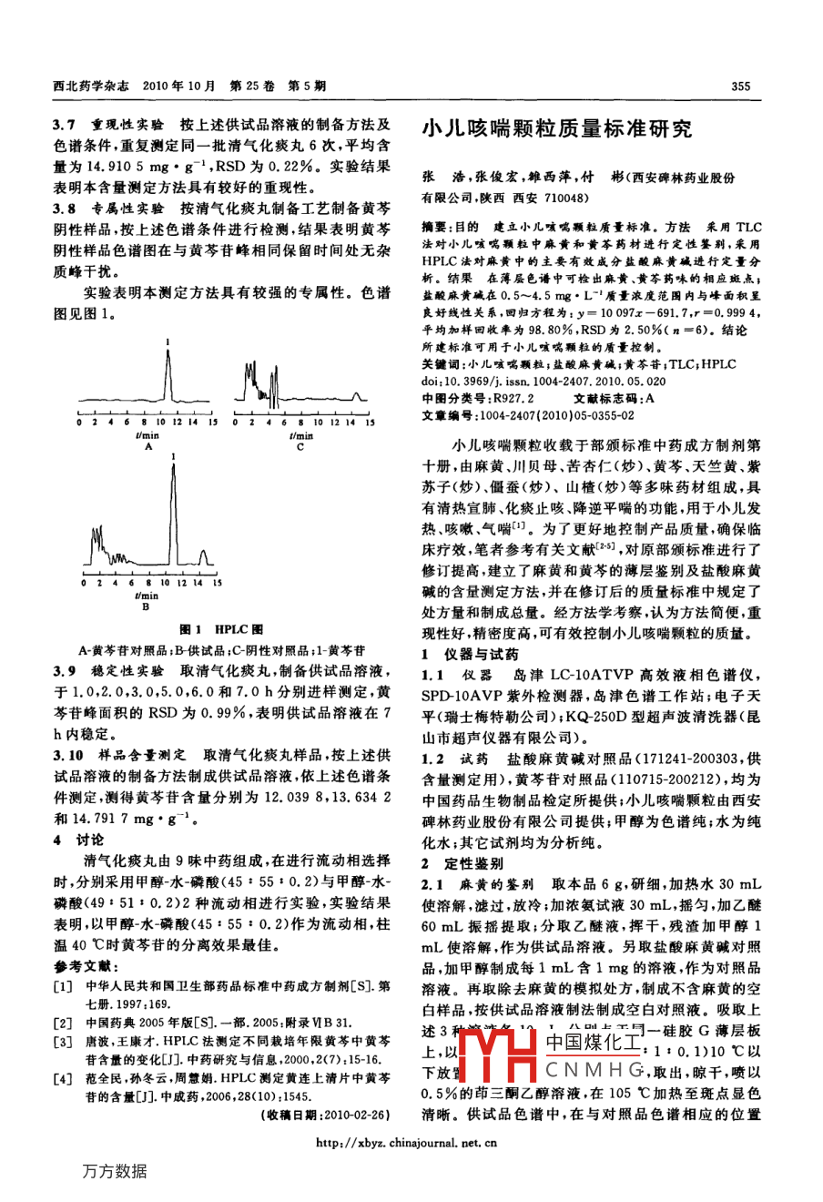 354西北藥學雜志2010年10月第25卷第5期參考文獻色譜中,在與對照品色譜相應的位置上,顯相同顏色[]中國藥典2005年版[S]一部2005:106-107.附錄64.的熒光斑點。陰性對照溶液色譜無干擾[2]徐昭璽中草藥種植技術(shù)指南[M]北京:中國農(nóng)業(yè)出版2.2黃芩的鑒別取本品5g研細加甲醇30mL,[3]李蘭,吳啟南.主產(chǎn)地澤瀉藥材頂空萃取揮發(fā)性成分的超聲處理30min,濾過;濾液蒸干,殘渣加甲醇2mLGCMS分析[].西北藥學雜志,2009,24(111-113.使溶解,作為供試品溶液。另取黃芩苷對照品適量,[4]王永林,劉拉平,艾葉揮發(fā)性成分固相微萃取GCMs分加甲醇制成每1mL含1mg的溶液,作為對照品溶析[].西北藥學雜志,2009,24(5):354-357液。照薄層色譜法實驗,吸取供試品溶液5μL和[5]張存蘭麥冬揮發(fā)油的提取與GCMS分析[食品工對照品溶液4μL,分別點于同一含4%醋酸鈉的羧甲業(yè)科技,2010,31(1):150-154基纖維素鈉溶液為黏合劑的硅膠G薄層板上,以醋[6]朱永新,劉林哲.麥冬揮發(fā)油化學成分的研究[J].藥物分析雜志,1993,13(1):254255酸乙酯丁酮-甲酸-水(5:3:1:1)為展開劑,展開,收稿日期:2010-05-17)取出,晾干,噴以5%三氯化鐵乙醇溶液。供試品色譜中,在與對照品色譜相應的位置上,顯相同顏色的清氣化痰丸厲量標準研究斑點。陰性對照溶液色譜無干擾3含量測定[3劉貽珍',李玲2(1.武警8670部隊醫(yī)院,甘肅平?jīng)?.1色譜條件色譜柱 phenomenex DDS-CIs(2507440002.甘肅省平?jīng)鍪兴幤窓z驗所,甘肅平?jīng)?44000mm×4.6mm,5m);流動相:甲醇水磷酸(45:55:摘要:目的建立清氣化痰丸的質(zhì)量標準方法用薄晝色0.2);檢測波長為315m;進樣量為10μL;柱溫40譜法對陳皮、黃芩進行了定性鑒別;用HPLC法測定了清氣化℃;流速為1.0mL·min-1。理論板數(shù)按黃芩苷峰計痰丸中黃箏苷的含量,結(jié)果TC法可鑒別出陳皮,黃茶,黃算應不低于3000葶苷在0.14~1.4匹范圍內(nèi)呈良好的線性關(guān)系,r=0.999平均回收為98,18%RSD為1.70%,結(jié)論方法簡便,結(jié)3.2對照品溶液的制備精密稱取黃芩苷對照品適果準確,靈敏度高,可用于清氣化痰丸的質(zhì)量控制。量,加甲醇制成每1mL含25pg的溶液即得關(guān)鍵詞:清氣化痰丸;TIC;HPLC;質(zhì)量標準3.3供試品溶液的制備取本品,研細,取細粉0.2doi:10.3969/j.issn.1004-2407.2010.05,019中圖分類號:R927.2文獻標志碼:Ag,精密稱定;置具塞三角瓶中,精密加入體積分數(shù)文章編號:1004-2407(2010)05-03540270%甲醇50mL,稱定質(zhì)量;超聲處理(功率120W,頻率40kHz)30min,放冷,再稱定質(zhì)量;用體積分數(shù)70%清氣化痰丸收載于《衛(wèi)生部藥品標淮》中藥成方甲醇補足減失的質(zhì)量,搖勻濾過取續(xù)濾液,即得制劑第七冊,由黃芩、瓜蔞仁霜、半夏、陳皮、膽南星、3.4線性關(guān)系考察取黃芩苷對照品約7.5mg,精生姜、苦杏仁、枳實、茯苓水煎提取加工制成,具有清密稱定,用甲醇溶解并稀釋至50mL,搖勻,作為儲備肺化痰功能,用于治療肺熱咳嗽、痰多黃稠、胸脘滿液(0.15g·L-)。精密量取儲備液2.5,5.0,10.0悶。為了有效控制藥品質(zhì)量筆者采用TLC法對和20.0mL,分別置于25mL量瓶中,加甲醇稀釋至陳皮、黃芩進行了定性鑒別;用HPLC法對清氣化痰刻度搖勻。按上述色譜條件分別進樣10μL,測定丸中黃芩苷進行了含量測定。峰面積。以峰面積積分值為縱坐標,對照品量為橫坐1儀器與試藥標繪制標準曲線,計算回歸方程為:Y=2296326X1.1儀器SCL10AP高效液相色譜儀(日本島-8898.112,r=0.999津);CQ250超聲清洗器(上海器械廠)3.5精密度實驗取黃芩苷對照品溶液(0.09612試藥硅膠G薄層板(青島海洋化工廠);乙g·L-),連續(xù)進樣5次測定色譜峰面積計算RSD腈、甲醇為色譜純;水為重蒸水;其他試劑均為分析為0.42%表明儀器精密度良好純;黃芩苷對照品(中國藥品生物制品檢定所,批號3.6回收率實驗精密稱取已知含量的清氣化痰丸110715200514);清氣化痰丸(市售)。2薄層色譜鑒別(15.1294mg·g-1)0.2g共取6份,分別精密加入黃芩苷對照品溶液(0.15g·L1)20mL,按含量測定方2.1陳皮的鑒別取本品4g,研細,加甲醇20mL法中色譜條件進行測定,并計算回收率結(jié)果見表1超聲處理30min,濾過,濾液作為供試品溶液。另取表1回收率測定結(jié)果橙皮苷對照品加甲醇制成飽和溶液,作為對照品溶樣品群品中黃加黃音出黃收率平均8D液。照薄層色譜法2實驗,吸取上述2種溶液各3/%回收率/%%pL,分別點于同一用0.5%氫氧化鈉溶液制備的硅膠中國煤化工920. 154G薄層板上,以醋酸乙酯甲醇水(100:17:13)為CNMHG.M肌1展開劑,展開,取出,晾干,噴以3%三氯化鋁甲醇溶2期323.052431液,熱風吹干,置紫外光燈(365mm)下檢視。供試品0.15582.35723.05.217296.67http://xbyz,chinajournal.netcn西北藥學雜志2010年10月第25卷第5期35537重現(xiàn)性實驗按上述供試品溶液的制備方法及小兒咳喘顆粒質(zhì)量標準研究色譜條件,重復測定同一批清氣化痰丸6次,平均含量為14.9105mg·g-1,RSD為0.22%。實驗結(jié)果表明本含量測定方法具有較好的重現(xiàn)性張浩,張俊宏,雒西萍,付彬(西安碑林藥業(yè)股份3.8專屬性實驗按清氣化痰丸制備工藝制備黃芩有限公司,陜西西安710048)陰性樣品,按上述色譜條件進行檢測,結(jié)果表明黃芩擁要:目的建立小幾咳喘顆粒質(zhì)量標準方法采用TLC陰性樣品色譜圖在與黃芩苷峰相同保留時間處無雜法對小幾顆粒中麻黃和黃茶藥材進行定性暴別,來用質(zhì)峰干擾析。結(jié)果在薄層色譜中可檢出麻黃、黃芩藥味的相應斑點;實驗表明本測定方法