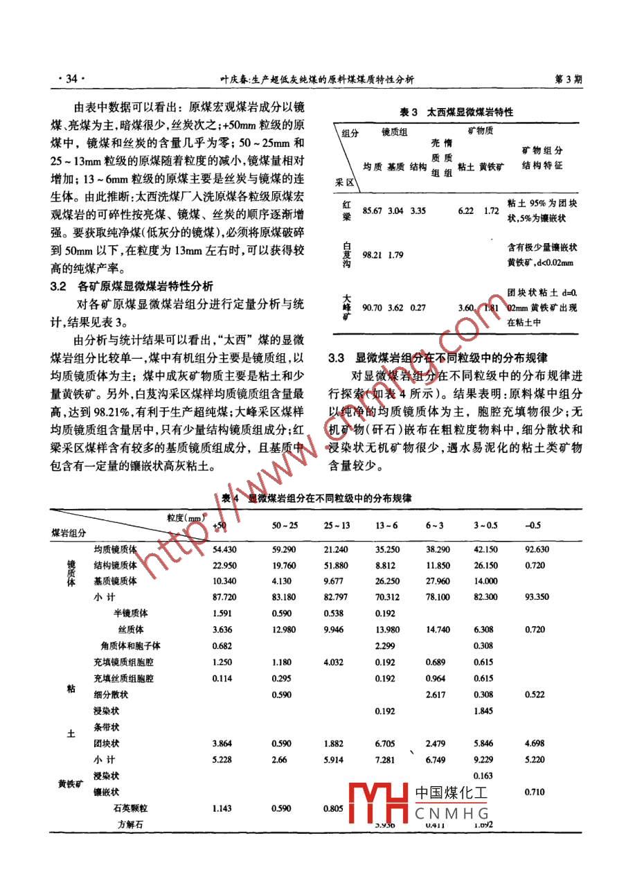 .第8謄第3期神苯科技2010年6月.VOL.8 NO.3jun.2010生產(chǎn)超低灰純煤的原料煤煤質(zhì)特性分析葉慶春李新軍(神華寧煤集團公司太西洗煤廠,寧夏 石嘴山,753000)摘要:通過煤巖學分析與常規(guī)浮沉試驗,對生產(chǎn)超低灰純煤的原料煤煤質(zhì)特性進行了分析,確定了生產(chǎn)超低灰純煤的入洗原料煤資源特性及理論分選條件,為煤炭深度脫灰技術(shù)研究提供新的途徑。關(guān)鍵詞:超低灰原料煤特性分析中圖分類號:TQ533文獻標識碼:B文章編號: 1674 -8492( 2010 )03- -033- -031前言12.36m,地質(zhì)儲量約6.4億t。經(jīng)過30年的開采,現(xiàn)可開采儲量約2.5億t。神華寧煤集團主要開采“太西”“煤炭超純制備工藝及設(shè)備研究"項目是潔凈煤無煙煤的礦井分別為白芨溝礦、大峰礦、紅梁礦,各技術(shù)的高端組成部分,是國家“九五”重點科技攻關(guān)礦區(qū)地質(zhì)結(jié)構(gòu)簡單,便于開采。礦井毛煤平均灰分和寧夏回族自治區(qū)火炬科技項目,榮獲2008年度國.14.38% ,硫分0.13% ~ 0.69%,揮發(fā)分5.04% ~ 7.49%,家科技進步二等獎。項目研究、設(shè)計了煤炭超純制備磷含量0.024% ~0.16%,屬于低灰、低硫、低磷、高發(fā)新工藝,采用跳汰粗選- -重介精選的梯級分選工藝,熱量、高含炭量、高產(chǎn)率、高化學活性、高塊煤率、高成功解決人洗原料煤+0.1含量大于90%不可物理機械強度的優(yōu)質(zhì)無煙煤。開采的無煙原煤由太西洗洗選的世界性難題,在國內(nèi)外率先實現(xiàn)了灰分≤.煤廠按照一定的人洗比例進行混合人洗,綜合人洗2.00%超低灰純煤規(guī)?;a(chǎn)。經(jīng)中國煤炭工業(yè)協(xié)會原煤及各礦原煤工業(yè)分析與元素分析結(jié)果見表1。鑒定,該項目整體技術(shù)達到“國際先進”水平,運用煤表1入洗原煤及各礦原煤工業(yè)分析與元素分析巖學分析和常規(guī)浮沉試驗相結(jié)合的研究方法,確定采區(qū)M.%A%V.fGS.%C.%H%N% 0。%生產(chǎn)超低灰純煤的入洗原料煤煤質(zhì)資源特性,是本人洗原煤14.38 7.85 0.26 77.57 2.85 0.66 7284項目的主要技術(shù)創(chuàng)新點之一一,現(xiàn)就生產(chǎn)超低灰純煤大峰礦1.35 12.85 7.38 0.2479.44 2.83 0.68 7217的原料煤煤質(zhì)特性分析作如下闡述。白芨溝礦1.24 15.44 7.93 0.16 76.29 292 0.66 6971紅梁礦 1.27 11.24 7.41 0.2978.45 2.84 0.65 73102典型原料煤資源分布.選擇優(yōu)質(zhì)“太西”無煙煤作為研究對象,進行煤3典型煤樣煤巖組成分析質(zhì)分析和特性研究,在此基礎(chǔ)上,分析滿足特定需要3.1入洗原煤各粒級宏觀煤巖組 成分析的原料煤煤質(zhì)特性。由于對-6mm的原煤進行宏觀煤巖組成鑒定相舉世聞名的“太西”無煙煤,賦存于侏羅紀延安當困難,本文只對+6mm以上各粒級的原煤進行宏觀組煤系地層,含可采和局部可采6層,煤層總厚度煤巖組成分析,分析結(jié)果見表2。表2太西洗煤廠 入洗原煤各粒級宏觀煤巖組分分析鏡煤%光亮煤%亮煤%亮暗煤%暗煤%絲炭%混合組分%礦 物質(zhì)%組分粒級mm+5054.6137.547.8550~25 .16.1566.8511.7625-1321.9916.49中國煤化工。4.3413~6 .JMYHCNMHG_●34●葉慶春:生產(chǎn)超低灰純煤的原料煤煤質(zhì)特性分析第3期由表中數(shù)據(jù)可以看出:原煤宏觀煤巖成分以鏡表3太西煤顯微煤巖特性煤亮煤為主,暗煤很少,絲炭次之;+50mm粒級的原組分鏡質(zhì)組礦物質(zhì)煤中,鏡煤和絲炭的含量幾乎為零; 50 ~ 25mm和殼惰礦物組分25 ~ 13mm粒級的原煤隨著粒度的減小,鏡煤量相對均質(zhì)基質(zhì)結(jié)構(gòu)質(zhì)質(zhì)粘土黃鐵礦結(jié)構(gòu)特征組組增加;13~6mm粒級的原煤主要是絲炭與鏡煤的連采區(qū)生體。由此推斷:太西洗煤廠人洗原煤各粒級原煤宏觀煤巖的可碎性按亮煤、鏡煤、絲炭的順序逐漸增紅85.673.04 3.356.22 1.72粘土95%為團塊狀,5%為鑲嵌狀強。要獲取純凈煤(低灰分的鏡煤),必須將原煤破碎到50mm以下,在粒度為13mm左右時,可以獲得較暴98211.79含有極少量鑲嵌狀高的純煤產(chǎn)率。黃鐵礦,d<0.02mm3.2各礦 原煤顯微煤巖特性分析團塊狀粘土d=0.對各礦原煤顯微煤巖組分進行定量分析與統(tǒng)孽90.703.620.273.60 1.81 02mm 黃鐵礦出現(xiàn)計,結(jié)果見表3。.在粘土中由分析與統(tǒng)計結(jié)果可以看出,“太西”煤的顯微煤巖組分比較單- -,煤中有機組分主要是鏡質(zhì)組,以3.3顯微煤巖組分 在不同粒級中的分布規(guī)律均質(zhì)鏡質(zhì)體為主;煤中成灰礦物質(zhì)主要是粘土和少對顯微煤巖組分在不同粒級中的分布規(guī)律進量黃鐵礦。另外,白芨溝采區(qū)煤樣均質(zhì)鏡質(zhì)組含量最行探索(如表4所示)。結(jié)果表明:原料煤中組分高,達到98.21%,有利于生產(chǎn)超純煤;大峰采區(qū)煤樣以純凈的均質(zhì)鏡質(zhì)體為主,胞腔充填物很少;無.均質(zhì)鏡質(zhì)組含量居中,只有少量結(jié)構(gòu)鏡質(zhì)組成分;紅機礦物(矸石)嵌布在粗粒度物料中,細分散狀和梁采區(qū)煤樣含有較多的基質(zhì)鏡質(zhì)組成分,且基質(zhì)中浸染狀無機礦物很少,遇水易泥化的粘土類礦物包含有一定量的鑲嵌狀高灰粘土。含量較少。表4顯微煤巖組分在不同粒級中的分布規(guī)律粒度(mm)s050-2525-1313~66~33-0.5-0.5煤巖組分均質(zhì)鏡質(zhì)體54.43059.29021.24035.25038.29042.15092.630結(jié)構(gòu)鏡質(zhì)體22.95019.76051.8808.81211.85026.1500.720基質(zhì)鏡質(zhì)體10.3404.1309.67726.25027.9604.000小計87.72083.18082.79770.31278.10082.30093.350半鏡質