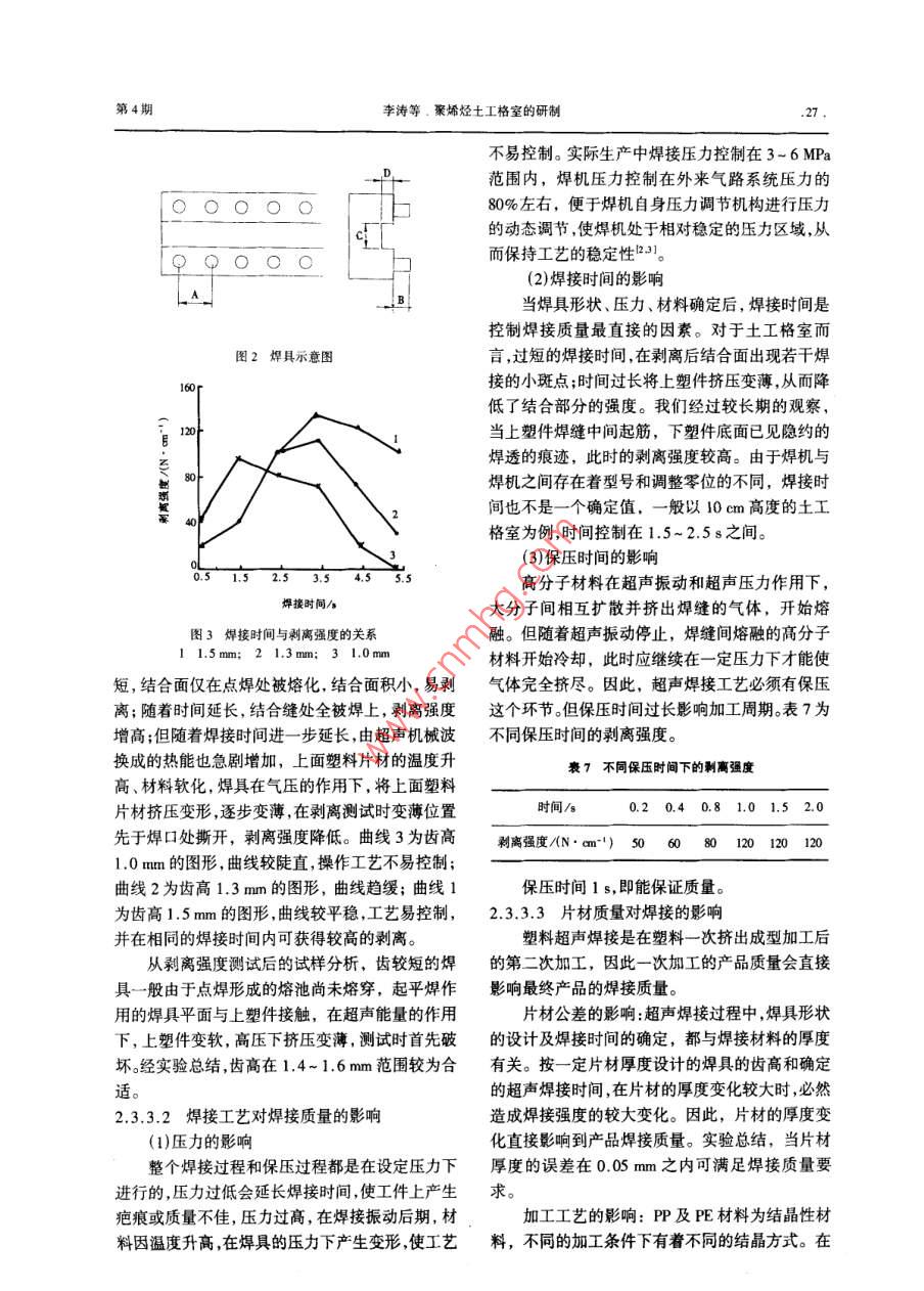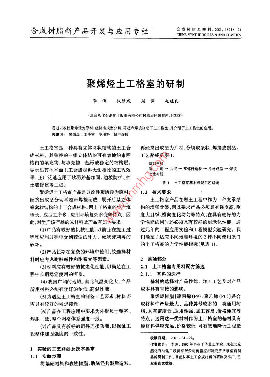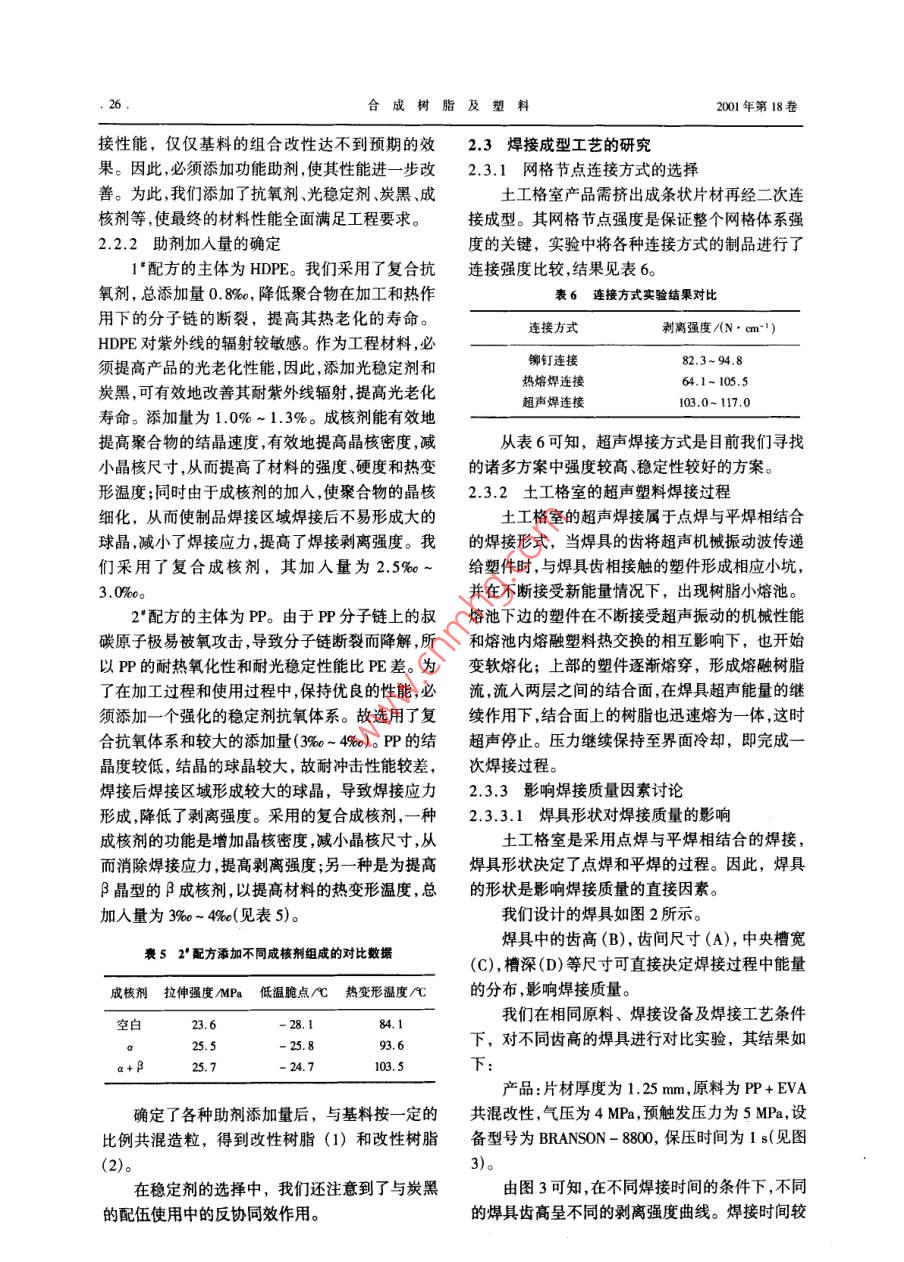 合成樹脂新產(chǎn)品開發(fā)與應(yīng)用專欄合成樹脂及塑料,2001, 18(4): 24CHINA SYNTHEIC RESIN AND PLASTICS.聚烯烴土工格室的研制李濤錢德成周瀾趙桂良(北京燕化石油化工股份有限公司樹脂應(yīng)用研究所,102500)通過以改性聚烯烴為原料,經(jīng)擠出成型分切.再超聲焊接制成了土工格室,并介紹了土工格室的應(yīng)用。關(guān)鍵詞:聚烯烴土工格室專用料超聲焊接土工格室是一種具有立體網(wǎng)狀結(jié)構(gòu)的土工合再經(jīng)擠出成型為片材,分切成條狀,焊接成制品。成材料。其獨(dú)特的三維立體結(jié)構(gòu)可有效地約束網(wǎng)工藝路線見圖1。格內(nèi)的填充物,與填充物一起形成穩(wěn)定的結(jié)構(gòu)層,基礎(chǔ)樹脂顯示出其他平面土工合成材料無法相比的工程效助劑→共混→雙螺桿造?!某尚汀附庸?正廣泛地應(yīng)用于軟弱路基加固、邊坡防護(hù)、擋改性樹脂圖1土工格室基本成型工藝路線土墻修建等工程。聚烯烴土工格室產(chǎn)品是以改性聚烯烴為原料,1.2技術(shù)要求經(jīng)擠出成型分切再超聲焊接而成,展開后呈立體土工格室產(chǎn)品在巖土工程中作為一種支承結(jié)蜂窩狀結(jié)構(gòu)的土工合成材料。因土工格室的生產(chǎn)流構(gòu)的增強(qiáng)骨架,因此要求產(chǎn)品必須具有強(qiáng)度高,剛程長、成型工序多、應(yīng)用環(huán)境復(fù)雜多變等特點(diǎn),因度大且縱、橫向變化均勻等特點(diǎn),在具有較好的力此,對生產(chǎn)該產(chǎn)品的原材料及產(chǎn)品有如下要求:學(xué)性能的同時還必須具有較好的耐老化性能。通(1)產(chǎn)品有較好的機(jī)械性能,以防止在施工過過幾年的工程應(yīng)用實(shí)驗(yàn)和工程模型實(shí)驗(yàn)研究,我程和應(yīng)用過程中受到較強(qiáng)的外力、硬物穿刺等的們確定了適應(yīng)不同地理環(huán)境的2種不同使用條件破壞。的土工格室的力學(xué)性能指標(biāo)(見表1)。(2)產(chǎn)品長期在復(fù)雜的環(huán)境中使用,故選擇材料時應(yīng)考慮耐酸堿性和耐霉變等因素。2實(shí)驗(yàn)部分(3)材料應(yīng)有較好的抗老化性能,以滿足在工2.1土工格室專 用料配方篩選程中長期穩(wěn)定使用的需要。2.1.1基料的選擇(4)我國廣闊的地域,南北氣溫變化大,產(chǎn)品基料的選擇對產(chǎn)品性能、加工工藝及對產(chǎn)品所用材料必須有較好的耐低、高溫性能。成本具有直接的影響。(5)為適應(yīng)土工格室的制備工藝要求,材料還聚烯烴樹脂[聚丙烯(PP)、聚乙烯(PE)]是合需具有較好的可焊接性。成材料中產(chǎn)量最大、品種牌號較多的一類通用樹(6)產(chǎn)品在工程應(yīng)用中要求為外形尺寸整齊、脂,具有密度低、適用性強(qiáng)、加工容易、價格便宜等焊距-致,整個網(wǎng)格體系強(qiáng)度-致。特點(diǎn)。選用這一類材料作為土工格室的基材具有(7)產(chǎn)品具有較好的組件連接功能,以保證工原材料供應(yīng)充足,價格較低,可有效地降低工程造程整體加固強(qiáng)度的- -致性。收稿日期: 2001-04-27。作者簡介:李濤, 1992 年畢業(yè)于華北工學(xué)院,現(xiàn)在北京1實(shí)驗(yàn)的工藝 路線及技術(shù)要求燕化石油化I股份有限公司樹脂應(yīng)用研究所從事塑料制1.1 實(shí)驗(yàn)步驟品的研制工作,目前從事土工合成材料的研制及推廣.已將基礎(chǔ)材料和改性樹/脂、助劑經(jīng)共混后造粒,發(fā)表論文數(shù)篇。第4期李濤等.聚烯烴土工格室的研制.25 .表1主要技術(shù)指標(biāo)表3 1'不同比例配方性能比較項(xiàng)測試方法項(xiàng)E1E4E屈服拉伸強(qiáng)度/MPaASTM D63823樹脂C+E C+ED+E彎曲模量/MPaASTMD638 600800MI/[g* (10 min)-"]0.15 0.070.190.09懸臂梁沖擊強(qiáng)度/(J.m~")ASTM D26580屈服強(qiáng)度MPa20.723.5低溫脆點(diǎn)/CASTM D746 - 50-2低溫脆點(diǎn)( - 60C)不斷不斷不斷負(fù)荷下的熱變形溫度/CASTM D6487010利離強(qiáng)度/N●cm"')850759:(0.45 MPa)ESCR(1 000h)3個有裂縫無裂縫2個有裂縫無裂縫耐環(huán)境應(yīng)力開裂性(ESCR)/h ASTM D1639 >1000 >1000注:以上各 試樣的制備方法、制作工藝、測試方法相同。常溫剝離強(qiáng)度/(N . cm"') GB8808- -8810101高溫刺離強(qiáng)度/(N.cm~1) C8808- -8830的剝離強(qiáng)度實(shí)驗(yàn)數(shù)據(jù)離散,這是由于2種產(chǎn)品的低溫剝離強(qiáng)度/(N . cm~')CB8808- -88相容性不好,共混效果較差,共混材料分子界面出注:該指標(biāo)為土工格室產(chǎn)品的性能指標(biāo)?,F(xiàn)分離,導(dǎo)致剝離強(qiáng)度下降。2E的綜合效果較好,價等優(yōu)勢。但單- -品種材料的綜合性能,不能同為首選配方。時滿足工程和加工要求,必須進(jìn)行合理的共混改(2)2*配方的確定性,使材料的性能均衡。為此,我們進(jìn)行了以下幾2"配方是為應(yīng)用于我國南方地區(qū)施工而研制方面的工作:選擇了PE和PP為基料,并確定了的。 在我國南方地區(qū),夏季炎熱,需要材料具有較PP共聚物(A. B)2種、高密度聚乙烯(HDPE)(C、高的熱變形 溫度。為此,我們選用具有較高熱變D、E) 3種以及改性劑乙烯-醋酸乙烯共聚物形溫度的共聚PP(A、B)為2*配方的基料,但其單(EVA)(F),進(jìn)行配方的篩選。獨(dú)使用時低溫性能和焊接性能較差(見表4中5P.2.1.2共混配方 的確定和8P),分別采用PE(E)和EVA(F)共混改性,以材料共混改性是將單- -基料的各自優(yōu)勢互改善基料的低溫和焊接性能。我們設(shè)計(jì)了10 種不補