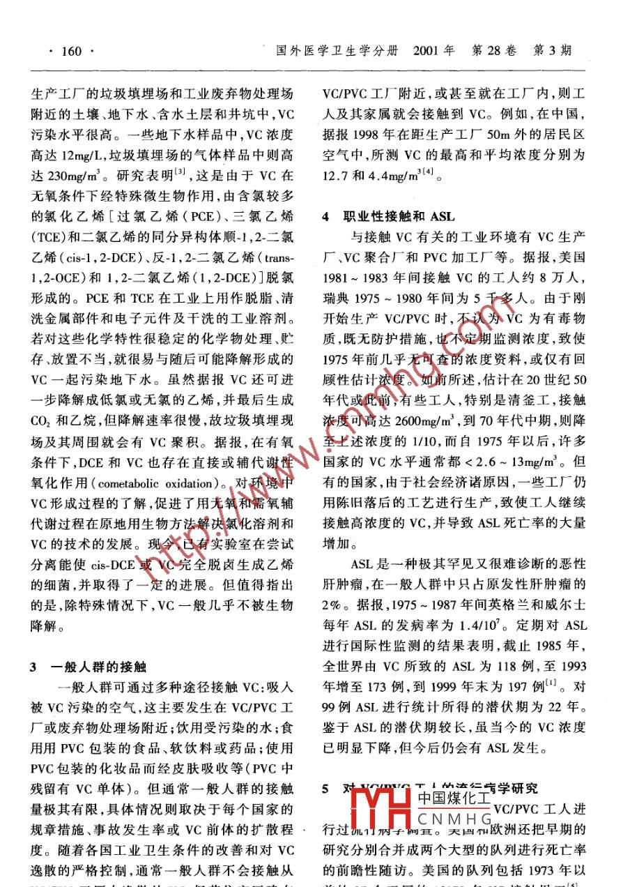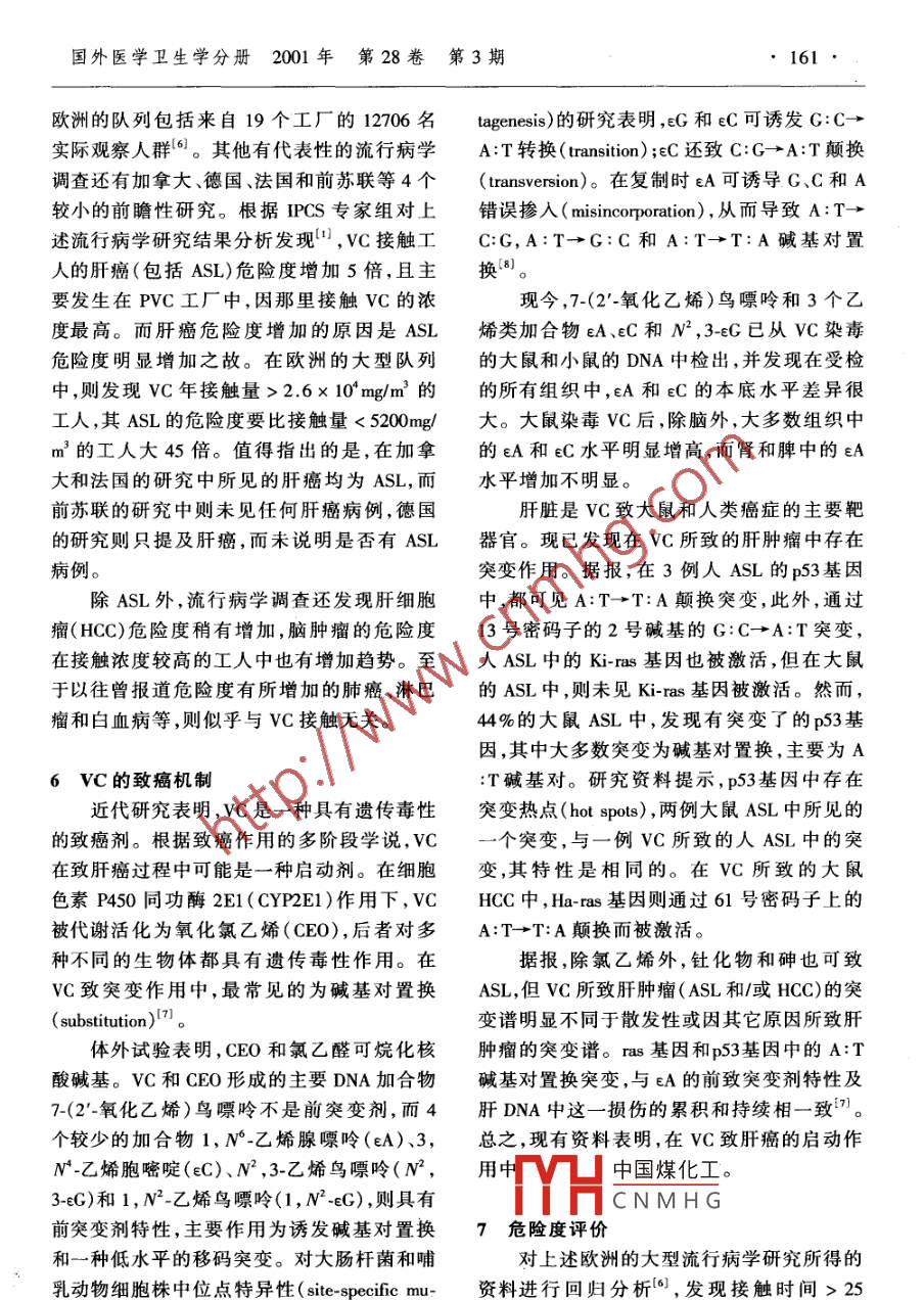 國外醫(yī)學(xué)衛(wèi)生學(xué)分冊(cè)2001年第28卷第3期159●063氯乙烯仍受關(guān)注的原因吳維皚,李霜(中國預(yù)防醫(yī)學(xué)科學(xué)院勞動(dòng)衛(wèi)生與職業(yè)病研究所,北京100050)摘要:雖然氯乙烯是一種 已知的致癌劑和應(yīng)控制的化學(xué)物,但在過去的20年中產(chǎn)量幾乎翻了一番。至今,有些國家職業(yè)性接觸氯乙烯的水平仍然很高,特別是尚未對(duì)其控制的國家則可能更高。最近的研究和監(jiān)測發(fā)現(xiàn),環(huán)境中的過氯乙烯、三氯乙烯等高氯乙烯類溶劑可降解生成氯乙烯,其垃圾填埋場的空氣和地下水中的濃度可分別高達(dá)200mg/m’和12mg/L,成為氯乙烯新的環(huán)境污染源。對(duì)各國有關(guān)的流行病學(xué)調(diào)查進(jìn)行合并研兗分析發(fā)現(xiàn),接觸氯乙烯工人的肝癌危險(xiǎn)度增加5倍,這主要是由于肝癌中的肝血管肉瘤的危險(xiǎn)度超量45倍所致。截止1998年底,全世界所報(bào)道的肝血管肉瘤數(shù)為197例,平均潛伏期為22年。氯乙烯所致的肝腫瘤,其突變譜明顯不同于非氯乙烯所致的肝腫瘤。氯乙烯代謝產(chǎn)物形成的DNA加合物,特別是1,N*-乙烯腺嘌呤有前致突變劑特性,是造成ras基因和p53基因中A:T堿基對(duì)發(fā)生置換突變的原因。從動(dòng)物實(shí)驗(yàn)所得資料進(jìn)行的危險(xiǎn)度評(píng)價(jià),似乎高估了實(shí)際的危險(xiǎn)度。關(guān)鍵詞:氣乙烯; 肝血管肉瘤;肝癌;危險(xiǎn)度評(píng)價(jià);垃圾填埋場中圖分類號(hào): R994.3文獻(xiàn)標(biāo)識(shí)碼: A文章編號(hào): 1001-1226(2001 )03-0159-04氯乙烯(VC)是毒性研究最充分的化學(xué)這些工人的肢端溶骨癥和類似雷諾現(xiàn)象的外物之一。早在20世紀(jì)70年代初,動(dòng)物研究周 循環(huán)改變的發(fā)病率增加。到1974年,又首和人的病例報(bào)道就提供了VC致癌的證據(jù)。次 報(bào)道VC接觸工人中發(fā)現(xiàn)多例罕見的ASL,此后,西方國家的氯乙烯/聚氯乙烯(VC/并在隨后的流行病學(xué)調(diào)查中又不斷有新病例PVC)生產(chǎn)工藝和工業(yè)衛(wèi)生方面發(fā)生了明顯報(bào)道,并結(jié)論ASL 與接觸高濃度VC有關(guān)。的變化:關(guān)閉了一些不能嚴(yán)格遵守法規(guī)和衛(wèi)此外,流行病調(diào)查還提示VC可能是一種多生標(biāo)準(zhǔn)的工廠,限制了PVC樹脂及其產(chǎn)品中系統(tǒng)、多器官的致癌劑,可誘發(fā)人類其他肝臟的Vc含量。結(jié)果在VC接觸工人中未再發(fā)腫瘤尤其是肝細(xì)胞癌、呼吸系統(tǒng)腫瘤、肝臟以現(xiàn)與VC接觸有關(guān)的罕見的肝血管肉瘤外的消化系統(tǒng)腫瘤、淋巴和造血系統(tǒng)腫瘤、腦(ASL)。但VC問題至今并未完全解決。最和其他神經(jīng)系統(tǒng)腫瘤,以及惡性黑色素瘤等。近流行病學(xué)、環(huán)境監(jiān)測及生物機(jī)制的研究表與此同時(shí),動(dòng)物致癌實(shí)驗(yàn)也表明VC具有遺明,VC仍然值得關(guān)注!本文主要針對(duì)VC新傳毒性和致癌作用,可在多種動(dòng)物中誘發(fā)近的一-些研究進(jìn)展,作--概要介紹。ASL及其他肝臟腫瘤、乳腺癌、成神經(jīng)細(xì)胞瘤、腎胚胎細(xì)胞瘤、前胃和肺腫瘤,以及Zym-1歷史背景bal腺瘤等多種腫瘤"。工業(yè).上使用VC始于20世紀(jì)20年代,但.到30年代才發(fā)明把VC聚合成PVC的技術(shù)。2對(duì)環(huán)境的污染聚合過程需在反應(yīng)釜內(nèi)進(jìn)行,而附著在釜內(nèi)當(dāng)今世界上大多數(shù)工業(yè)化國家都生產(chǎn)壁上的PVC層需要定期清除?,F(xiàn)在清釜使中國煤化工比1980年翻了用溶劑和自動(dòng)高壓噴槍,但在早先則需工人一番YHCN MH G產(chǎn)氯化溶劑(主進(jìn)入釜內(nèi)用刀、鏟、鑿子和錘等工具進(jìn)行手工要為1,1,1-三氯乙烷),其余95%用于生產(chǎn)操作。其時(shí),工人接觸VC的濃度可高達(dá)PVC。.2600 mg/m2 (1000 ppm) ,甚至更高。結(jié)果發(fā)現(xiàn)新近許多國家報(bào)道[2),在遠(yuǎn)離VC/PVC國外醫(yī)學(xué)衛(wèi)生學(xué)分冊(cè)2001年第28卷第3期生產(chǎn)工廠的垃圾填埋場和工業(yè)廢棄物處理場VC/PVC工廠附近,或甚至就在工廠內(nèi),則工附近的土壤、地下水、含水土層和井坑中,VC人及其家屬就會(huì)接觸到VC。例如,在中國,污染水平很高。- -些地下水樣品中,VC濃度據(jù)報(bào)1998年在距生產(chǎn)工廠50m 外的居民區(qū)高達(dá)12mg/L,垃圾填埋場的氣體樣品中則高空氣中,所測VC的最高和平均濃度分別為達(dá)230mg/m'。研究表明(3),這是由于VC在12.7和4.4mg/m3!4。無氧條件下經(jīng)特殊微生物作用,由含氯較多的氯化乙烯[過氯乙烯(PCE)、三氯乙烯4職業(yè)性接觸和ASL(TCE)和二氯乙烯的同分異構(gòu)體順-1,2-二氯與接觸VC有關(guān)的工業(yè)環(huán)境有VC生產(chǎn)乙烯(cis-1, 2-DCE)、反-1,2-二氯乙烯( trans-廠、VC聚合廠和PVC加工廠等。據(jù)報(bào),美國. 1,2-0CE)和 1,2-二氯乙烯(1,2-DCE)]脫氯1981~ 1983年間接觸VC的工人約8萬人,形成的。PCE和TCE在工業(yè)上用作脫脂、清瑞典1975~ 1980年間為5千多人。由于剛洗金屬部件和電子元件及干洗的工業(yè)溶劑。開始生產(chǎn)VC/PVC時(shí),不認(rèn)為VC為有毒物若對(duì)這些化學(xué)特性很穩(wěn)定的化學(xué)物處理、貯質(zhì),既無防護(hù)措施,也不定期監(jiān)測濃度,致使存、放置不當(dāng),就很易與隨后可能降解形成的1975年前幾乎無可查的濃度