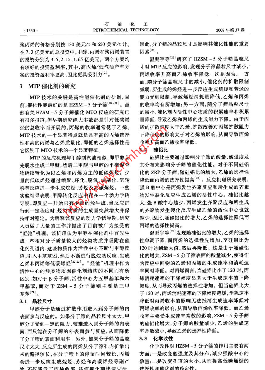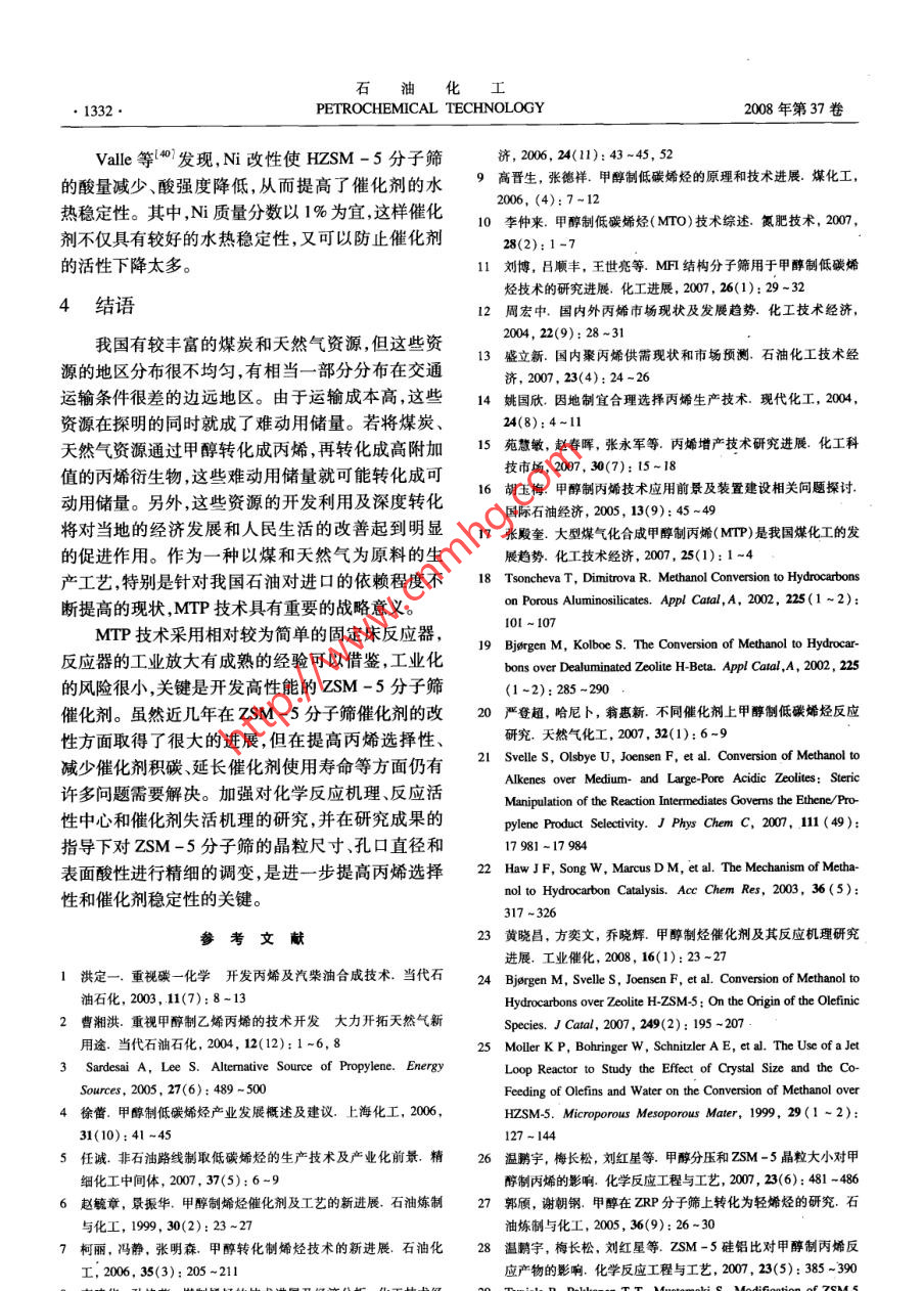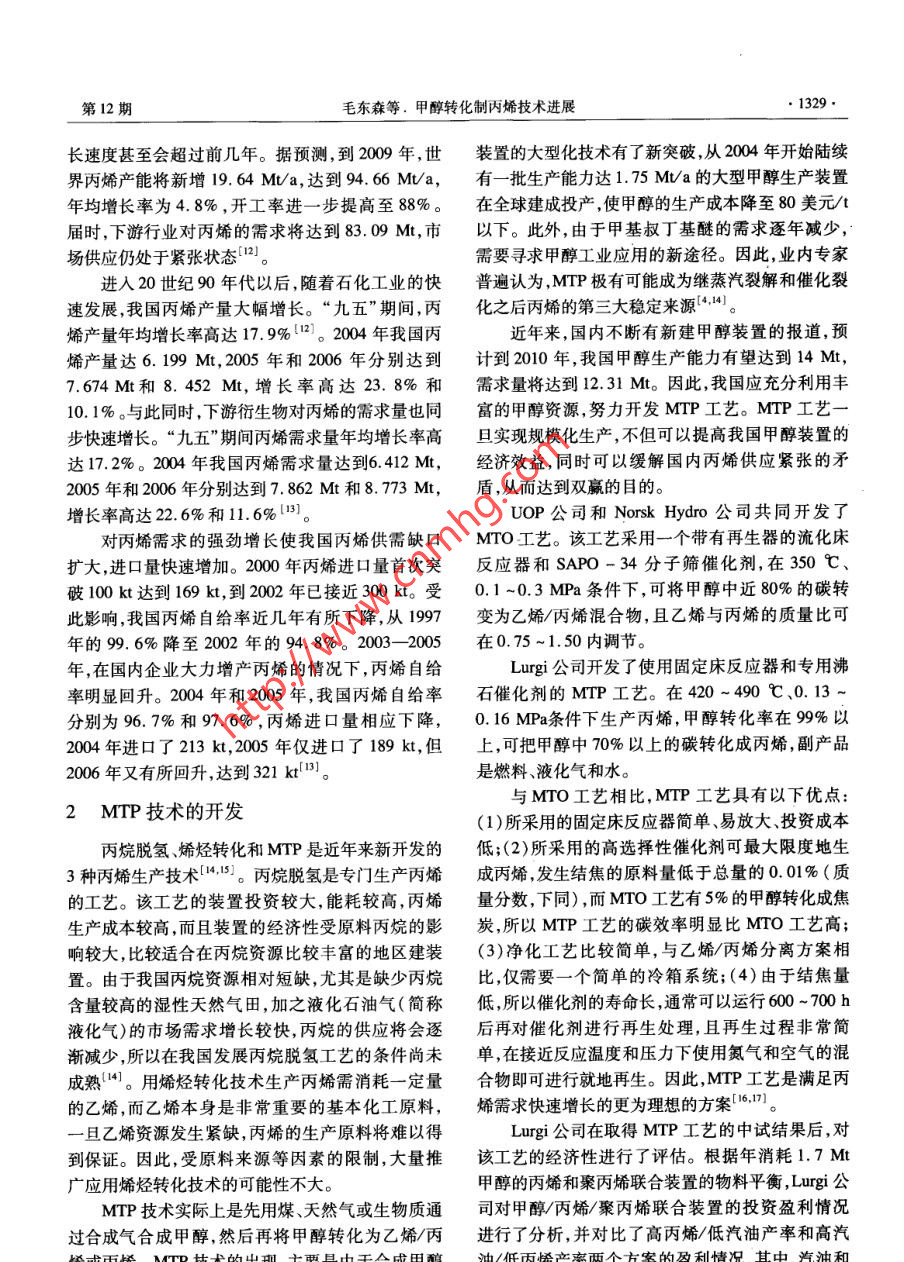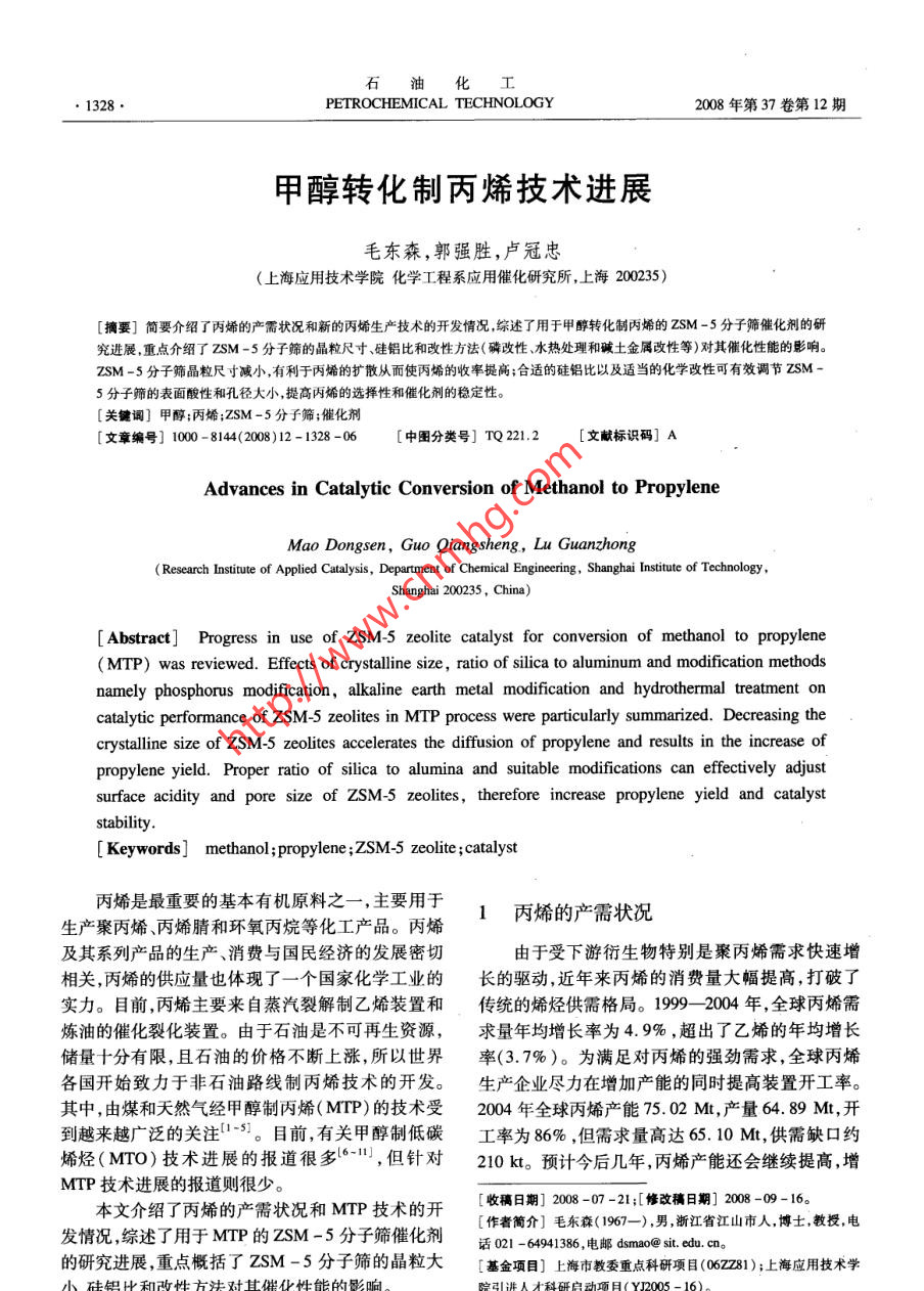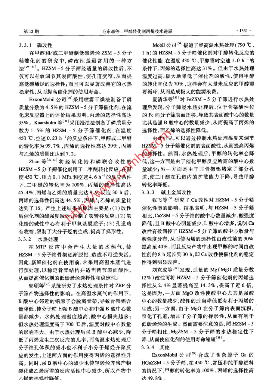 石油化工●1328 .PETROCHEMICAL TECHNOLOGY2008年第37卷第12期甲醇轉(zhuǎn)化制丙烯技術(shù)進(jìn)展毛東森,郭強(qiáng)勝,盧冠忠(上海應(yīng)用技術(shù)學(xué)院化學(xué)工程系應(yīng)用催化研究所,上海200235)[摘要]簡要介紹了丙烯的產(chǎn)需狀況和新的丙烯生產(chǎn)技術(shù)的開發(fā)情況,綜述了用于甲醇轉(zhuǎn)化制丙烯的ZSM -5分子篩催化劑的研究進(jìn)展,重點(diǎn)介紹了ZSM -5分子篩的晶粒尺寸、硅鋁比和改性方法(磷改性水熱處理和堿士金屬改性等)對其催化性能的影響。ZSM -s分子篩晶粒尺寸減小,有利于丙烯的擴(kuò)散從而使丙烯的收率提高;合適的硅鋁比以及適當(dāng)?shù)幕瘜W(xué)改性可有效調(diào)節(jié)ZSM -5分子篩的表面酸性和孔徑大小,提高丙烯的選擇性和催化劑的穩(wěn)定性。[關(guān)鍵詞]甲醇;丙烯;ZSM -5分子篩;催化劑[文章編號] 1000 - 8144(2008)12-1328 -06.[中團(tuán)分類號] TQ 221.2[文獻(xiàn)標(biāo)識碼] AAdvances in Catalytic Conversion of Methanol to PropyleneMao Dongsen, Guo Qiangsheng, Lu Guanzhong( Research Institute of Applied Catalysis, Depatment of Chemical Engineering, Shanghai Institute of Technology ,Shanghai 200235 , China)[ Abstract] Progress in use of ZSM-5 zeolite catalyst for conversion of methanol to propylene(MTP) was reviewed. Effects of crystalline size,ratio of silica to aluminum and modification methodsnamely phosphorus modifcation, alkaline earth metal modification and hydrothermal treatment oncatalytic performance of ZSM-5 zeolites in MTP process were particularly summarized. Decreasing thecrystalline size of ZSM-5 zeolites accelerates the diffusion of propylene and results in the increase ofpropylene yield. Proper ratio of silica to alumina and suitable modifications can effectively adjustsurface acidity and pore size of ZSM-5 zeolites, therefore increase propylene yield and catalyststability.[ Keywords] methanol;propylene ;ZSM-5 zeolite ;catalyst丙烯是最重要的基本有機(jī)原料之一,主要用于1丙烯的產(chǎn)需狀況生產(chǎn)聚丙烯、丙烯腈和環(huán)氧丙烷等化工產(chǎn)品。丙烯及其系列產(chǎn)品的生產(chǎn)、消費(fèi)與國民經(jīng)濟(jì)的發(fā)展密切由于受下游衍生物特別是聚丙烯需求快速增相關(guān),丙烯的供應(yīng)量也體現(xiàn)了一個(gè)國家化學(xué)工業(yè)的長的驅(qū)動(dòng),近年來丙烯的消費(fèi)量大幅提高,打破了實(shí)力。目前,丙烯主要來自蒸汽裂解制乙烯裝置和傳統(tǒng)的烯烴供需格局。1999- 2004 年,全球丙烯需煉油的催化裂化裝置。由于石油是不可再生資源,求量年均增長率為4.9%,超出了乙烯的年均增長儲量十分有限,且石油的價(jià)格不斷上漲,所以世界率(3.7%)。為滿足對丙烯的強(qiáng)勁需求,全球丙烯各國開始致力于非石油路線制丙烯技術(shù)的開發(fā)。生產(chǎn)企業(yè)盡力在增加產(chǎn)能的同時(shí)提高裝置開工率。其中,由煤和天然氣經(jīng)甲醇制丙烯( MTP)的技術(shù)受2004年全球丙烯產(chǎn)能75.02 Mt,產(chǎn)量64. 89 Mt,開到越來越廣泛的關(guān)注1-5]。目前,有關(guān)甲醇制低碳工率為86%,但需求量高達(dá)65.10Mt,供需缺口約烯烴(MTO)技術(shù)進(jìn)展的報(bào)道很多16-1川),但針對210 kt。預(yù)計(jì)今后幾年,丙烯產(chǎn)能還會繼續(xù)提高,增MTP技術(shù)進(jìn)展的報(bào)道則很少。本文介紹了丙烯的產(chǎn)需狀況和MTP技術(shù)的開[收稿日期] 2008 -07 -21;[修改稿日期] 2008 -09-16。發(fā)情況,綜述了用于MTP的ZSM-5分子篩催化劑[作者簡介]毛東森(1967- -) ,男,浙江省江山市人,博士,教授,電話021 - 64941386,電郵dsmao@ sit. edu. cD。的研究進(jìn)展,重點(diǎn)概括了ZSM -5分子篩的晶粒大[基金項(xiàng)目]上海市教委重點(diǎn)科研項(xiàng)目(062281);上海應(yīng)用技術(shù)學(xué)小硅鋁比和改性方法對其催化性能的影響。院引進(jìn)人才科研啟動(dòng)項(xiàng)目( YJ2005 -16)。第12期毛東森等。甲醇轉(zhuǎn)化制丙烯技術(shù)進(jìn)展●1329.長速度甚至?xí)^前幾年。據(jù)預(yù)測,到2009年,世裝置的大型化技術(shù)有了新突破,從2004年開始陸續(xù)界丙烯產(chǎn)能將新增19. 64 Mt/a, 達(dá)到94. 66 MVa,有一批生產(chǎn)能力達(dá)1. 75 Mt/a的大型甲醇生產(chǎn)裝置年均增長率為4.8% ,開工率進(jìn)- -步提高 至88%。在全球建成投產(chǎn) ,使甲醇的生產(chǎn)成本降至80美元/t屆時(shí),下游行業(yè)對丙烯的需求將達(dá)到83. 09 Mt,市以下。此外,由于甲基叔T基醚的需求逐年減少,場供應(yīng)仍處于緊張狀態(tài)[12。需要尋求甲醇工業(yè)應(yīng)用的新途徑。因此,業(yè)內(nèi)專家進(jìn)入20世紀(jì)90年代以后,隨著石化工業(yè)的快普遍認(rèn)為,MTP極有可能成為繼蒸汽裂解和催化裂速發(fā)展,我國丙烯產(chǎn)量大幅增長?!熬盼濉逼陂g,丙化之后丙烯的第三大穩(wěn)定來源(0.14)。烯產(chǎn)量年均增長率高達(dá)17. 9% [12]。2004年我國丙近年來,國內(nèi)不斷有新建甲醇裝置的報(bào)道,預(yù)烯產(chǎn)量達(dá)6.199Mt,2005年和2006年分別達(dá)到計(jì)到2010年,我國甲醇生產(chǎn)能力有望達(dá)到14Mt,7.674Mt和8.452Mt,增長率高達(dá)23.8%和.需求量將達(dá)到12. 31 Mt。因此,我國應(yīng)充分利用豐10.1%。與此同時(shí),下游衍生物對丙烯的需求量也同富的甲醇資源,努力開發(fā)MTP工藝。MTP工藝- -步快速增長?!?九五”期間丙烯需求量年均增長率高旦實(shí)現(xiàn)規(guī)模化生產(chǎn),不但可以提高我國甲醇裝置的達(dá
