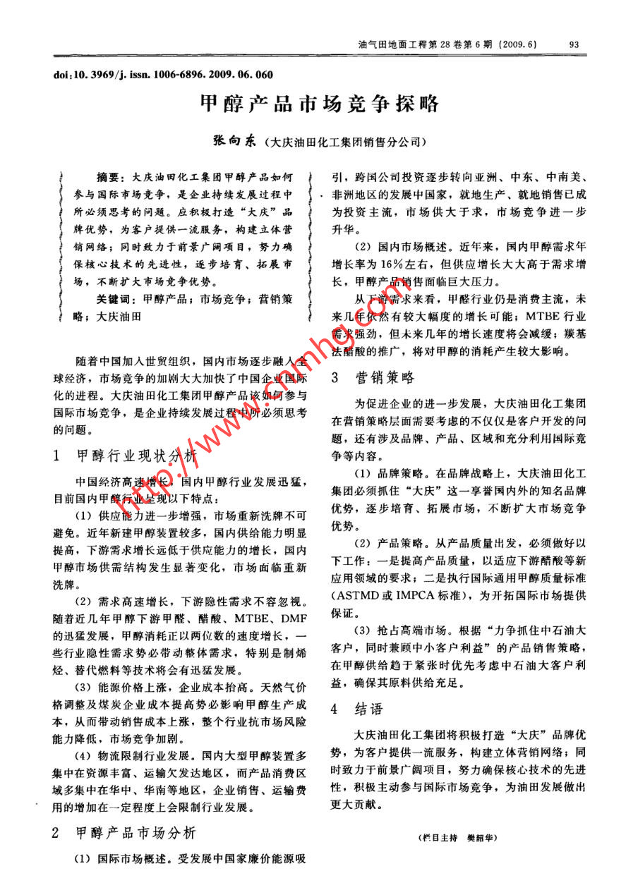 油氣田地面工程第28卷第6期(2009. 6))3doi:10. 3969/j. issn. 1006-6896. 2009.06.060甲醇產(chǎn)品市場(chǎng)競(jìng)爭(zhēng)探略張向東(大慶油田化工集團(tuán)銷(xiāo)售分公司)摘要:大慶油田化工集團(tuán)甲醇產(chǎn)品如何引,跨國(guó)公司投資逐步轉(zhuǎn)向亞洲、中東、中南美、參與國(guó)際市場(chǎng)競(jìng)爭(zhēng),是企業(yè)持續(xù)發(fā)展過(guò)程中非洲地區(qū)的發(fā)展中國(guó)家,就地生產(chǎn)、就地銷(xiāo)售已成所必須思考的問(wèn)題。應(yīng)積極打造“大慶”品為投資主流,市場(chǎng)供大于求,市場(chǎng)競(jìng)爭(zhēng)進(jìn)一步牌優(yōu)勢(shì),為客戶提供一-流服務(wù),構(gòu)建立體營(yíng)升華。銷(xiāo)網(wǎng)絡(luò);同時(shí)致力于前景廣闊項(xiàng)目,努力確(2)國(guó)內(nèi)市場(chǎng)概述。近年來(lái),國(guó)內(nèi)甲醇需求年保核心技術(shù)的先進(jìn)性,逐步培育、拓展市增長(zhǎng)率為16%左右,但供應(yīng)增長(zhǎng)大大高于需求增場(chǎng),不斷擴(kuò)大市場(chǎng)競(jìng)爭(zhēng)優(yōu)勢(shì)。長(zhǎng),甲醇產(chǎn)品銷(xiāo)售面臨巨大壓力。關(guān)鍵詞:甲醇產(chǎn)品;市場(chǎng)競(jìng)爭(zhēng);營(yíng)銷(xiāo)策從下游需求來(lái)看,甲醛行業(yè)仍是消費(fèi)主流,未略;大慶油田來(lái)幾年依然有較大幅度的增長(zhǎng)可能; MTBE行業(yè)需求強(qiáng)勁,但未來(lái)幾年的增長(zhǎng)速度將會(huì)減緩;羰基隨著中國(guó)加人世貿(mào)組織,國(guó)內(nèi)市場(chǎng)逐步融人全法醋酸的推廣,將對(duì)甲醇的消耗產(chǎn)生較大影響。球經(jīng)濟(jì),市場(chǎng)競(jìng)爭(zhēng)的加劇大大加快了中國(guó)企業(yè)國(guó)際3營(yíng)銷(xiāo)策略化的進(jìn)程。大慶油田化工集團(tuán)甲醇產(chǎn)品該如何參與為促進(jìn)企業(yè)的進(jìn)-步發(fā)展,大慶油田化工集團(tuán)國(guó)際市場(chǎng)競(jìng)爭(zhēng),是企業(yè)持續(xù)發(fā)展過(guò)程中所必須思考在營(yíng)銷(xiāo)策略層面需要考慮的不僅僅是客戶開(kāi)發(fā)的問(wèn)的問(wèn)題。題,還有涉及品牌、產(chǎn)品、區(qū)域和充分利用國(guó)際競(jìng)1甲醇行業(yè)現(xiàn)狀分析爭(zhēng)等內(nèi)容。中國(guó)經(jīng)濟(jì)高速增長(zhǎng),國(guó)內(nèi)甲醇行業(yè)發(fā)展迅猛,(1)品牌策略。在品牌戰(zhàn)略上,大慶油田化工集團(tuán)必須抓住“大慶”這一享譽(yù)國(guó)內(nèi)外的知名品牌目前國(guó)內(nèi)甲醇行業(yè)呈現(xiàn)以下特點(diǎn):(1)供應(yīng)能力進(jìn)--步增強(qiáng),市場(chǎng)重新洗牌不可優(yōu)勢(shì),逐步培育、拓展市場(chǎng),不斷擴(kuò)大市場(chǎng)競(jìng)爭(zhēng)避免。近年新建甲醇裝置較多,國(guó)內(nèi)供給能力明顯優(yōu)勢(shì)。提高,下游需求增長(zhǎng)遠(yuǎn)低于供應(yīng)能力的增長(zhǎng),國(guó)內(nèi)(2)產(chǎn)品策略。從產(chǎn)品質(zhì)量出發(fā),必須做好以甲醇市場(chǎng)供需結(jié)構(gòu)發(fā)生顯著變化,市場(chǎng)面臨重新下工作:一是提高產(chǎn)品質(zhì)量,以適應(yīng)下游醋酸等新應(yīng)用領(lǐng)域的要求;二是執(zhí)行國(guó)際通用甲醇質(zhì)量標(biāo)準(zhǔn)洗牌。(2)需求高速增長(zhǎng),下游隱性需求不容忽視。(ASTMD或IMPCA標(biāo)準(zhǔn)),為開(kāi)拓國(guó)際市場(chǎng)提供隨著近幾年甲醇下游甲醛、醋酸、MTBE、DMF保證。的迅猛發(fā)展,甲醇消耗正以兩位數(shù)的速度增長(zhǎng),一(3)搶占高端市場(chǎng)。根據(jù)“力爭(zhēng)抓住中石油大些行業(yè)隱性需求勢(shì)必帶動(dòng)整體需求,特別是制烯客戶,同時(shí)兼顧中小客戶利益”的產(chǎn)品銷(xiāo)售策略,在甲醇供給趨于緊張時(shí)優(yōu)先考慮中石油大客戶利烴、替代燃料等技術(shù)將會(huì)有迅猛發(fā)展。(3)能源價(jià)格上漲,企業(yè)成本抬高。天然氣價(jià)益,確保其原料供給充足。.格調(diào)整及煤炭企業(yè)成本提高勢(shì)必影響甲醇生產(chǎn)成4結(jié)語(yǔ)本,從而帶動(dòng)銷(xiāo)售成本上漲,整個(gè)行業(yè)抗市場(chǎng)風(fēng)險(xiǎn)大慶油田化工集團(tuán)將積極打造“大慶”品牌優(yōu)能力降低,市場(chǎng)競(jìng)爭(zhēng)加劇。(4) 物流限制行業(yè)發(fā)展。國(guó)內(nèi)大型甲醇裝置多勢(shì),為客戶提供- - 流服務(wù),構(gòu)建立體營(yíng)銷(xiāo)網(wǎng)絡(luò);同集中在資源豐富、運(yùn)輸欠發(fā)達(dá)地區(qū),而產(chǎn)品消費(fèi)區(qū)時(shí)致力于前景廣闊項(xiàng)目,努力確保核心技術(shù)的先進(jìn)域多集中在華中、華南等地區(qū),企業(yè)銷(xiāo)售、運(yùn)輸費(fèi)性,積極主動(dòng)參與國(guó)際市場(chǎng)競(jìng)爭(zhēng),為油田發(fā)展做出用的增加在一定程度上會(huì)限制行業(yè)發(fā)展。更大貢獻(xiàn)。2甲醇產(chǎn)品市場(chǎng)分析(欄目主持樊韶華)(1)國(guó)際市場(chǎng)概述。受發(fā)展中國(guó)家廉價(jià)能源吸