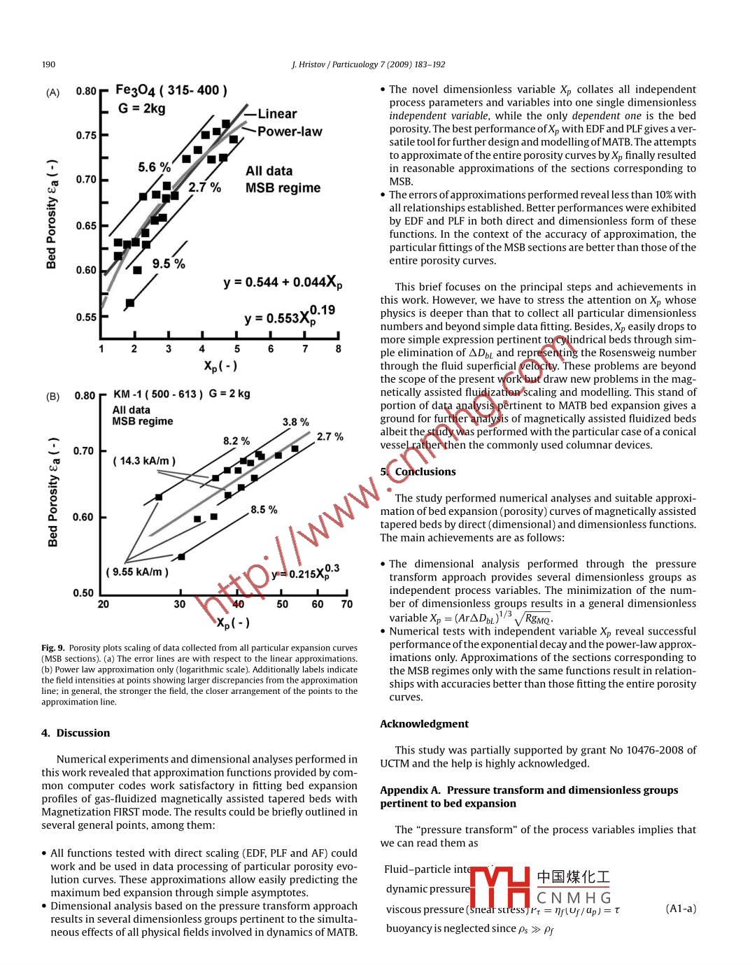 Particuology 7 (2009) 183-192Contents lists available at ScienceDirectPARTICLJOLOGY |ParticuologyEL SEVIERjournal homepage: www. elsevier. com/locate/particMagnetically assisted gas-solid fluidization in a tapered vessel: Part IIDimensionless bed expansion scalingJordan HristovDepartment of Chemical Engineering. University of Chemnical Technology and Metallurgy, 1756 Sofa, 8 KL Ohridsky BIvd, BulgariaA RTICLE . INFOABSTRACTArticle history:The article presents an effort to create dimensionless scaling correlations of the overall bed porosity inReceived 7 October 2008the case of magnetically assisted fluidization in a tapered vessel with external transverse magnetic field.Accepted 6 January 2009This is a stand of portion of new branch in the magnetically assisted fluidization recently created con-cerning employment of tapered vessels. Dimensional analysis based on "pressure transform" of the initialset of variables and involving the magnetic granular Bond number has been applied to develop scaling. Funidizationrelationships of dimensionless groups representing ratios of pressures created by the fluid flow, gravityMagnetization FIRSTand the magnetic field over an elementary volume of the fluidized bed. Special attention has been paid onTapered bedthe existing data correlations developed for non-magnetic beds and the links to the new ones especiallyDimensional analysisPressure transform of variablesdeveloped for tapered magnetic counterparts. A special dimensionless variable Xp = (ArADbl)/3 V RgmQMagnetic granular Bond numbercombining Archimedes and Rosensweig numbers has been conceived for porosity correlation. Data cor-Rosensweig numberrelations have been performed by powe-law, exponential decay and asymptotic functions with analysisPorosity correlationsof their adequacies and accuracies of approximation.◎2009 Chinese Society of Particuology and Institute of Process Engineering, Chinese Academy ofSciences. Published by EIsevier B.V. All rights reserved.1. Introductionof Geldart's class B has been reviewed by Hristov (2002, 2003a,2003b, 2004, 2006a, 2007a). Recently, promising results concern-Tapered gas-solid fluidization (Mathur & Epstein, 1974) origi-ing magnetically assisted nano-fuidization have been reported bynally conceived for gas-fluidization of Geldart's D particles (Geldart,Hao, Zhu, Lei, and Li (2008a), Hao, Zhu, Jjiang, and Li (2008b) with1973) have encountered in many areas of chemical, mining anddirect mass transfer applications pertinent to CH4-CO2 reforming.food industries. Recently fluidization of cohesive particles (DeivaThe present article addresses scaling correlations of overallVenkatesh, Chaouki, & Klvana, 1996; Erbil, 1998) and drying of pas-porosity of magnetically assisted gas fluidized tapered beds withtas (Bacelos & Freire, 2008; Bacelos, Passos, & Freire, 2007) haveMagnetization FIRST mode. The first report in this new trendbeen developed in two- and three-dimensional tapered vessels. Inin magnetically assisted fluidization was presented by Hristovthis context, remotely controlled tapered fuidized gas- solids beds(2008). Dimensionless groups provided by the“pressure trans-have been conceived (Hristov, 2008, 2009) by means of magnetiz-form" approach (Hristov, 2006a, 2007b) are used to develop furtherable solids and external transverse magnetic field.results on porosity scaling relationship. A special standpoint isThe magnetically assisted fluidization deals with magneticdeveloped to link the existing empirical and semi-empirical corre-solids fluidized by liquid(Hristov, 2006a), gas (Hristov, 2002, 2003a,lations pertinent to non-magnetic tapered beds (DiFelice, Foscolo,2005, 2006b, 2007c) or gas-liquid flow (Hristov, 2007a) withGibilaro, Wallis, & Carta, 1991; Gui & Grace, 2008; Kmiec, 1975, 1977,two basic magnetization modes: Magnetization FIRST (preliminary1980) to the new situation arising in magnetically assisted taperedmagnetization of fixed bed and consequent fluidization) and Mag-beds (MATB) with controlled interparticle forces.netization LAST (magnetization of preliminarily fluidized beds).The hydrodynamic behaviour of such beds with coarse particles2. ExperimentalThe experimental set-up was described in details by Hristov(2008) so only some basic information pertinent to the results is tobe provided in this work. A conical vessel(15° opening angle, 30 mmfunction.ID-bottom diam中國煤化1eter) surrounded byE-mail address: jordan.hristov@mail.bg.saddle coils (Hnm ID and 400 mmURL: http://www.hristov.com/jordan.in height was uYHC N M H Gnted transversely to1674- 2001/$ - see front matter 0 2009 Chinese Society of Particuology and Institute of Process Engineering, Chinese Academy of Sciences. Published by EIsevier B.V. All rights reserved.doi:10.1016/j.partic.2009.01.012184J Hristov / Particuology 7 (2009) 183- 192NomenclatureRep = pdbU/nj particle Reynolds numberAeddimensionless pre- factor in EDF expressed throughRg= (ρ2U2jμM2) Rosensweig number (basic definition),- -see Eq. (7)Rgm=(pjU21uoMsH) Rosensweig number expressed in termsdimensionless exponential pre-factor in EDIof Msexpressed through Xp- see Eq, (7)Rgme = ((16/r2D2)(pjQ2/uoMsH)) Rosensweig numberAaddimensionless asymiptote in the asymptotic func-expressed in terms of the volumetric flow rate Qtion expressed through Xp- see Eq. (8)Sb = πD7/4 cross-section area of the gas inlet orifice (m2 )ILfree term in the linear approximation y=al + brXpUsuperficial gas velocity (denoted also as Ug see theAr = (dPr(Ps - Pr)g)/nf Archimedes numbertext) (m/s)badimensionless pre-factor of the asymptotic functionJbsuperficial fluid velocity defined through the coneexpressed through- -see Eq. (8)Xpentance cross-see 1pre-factor in linear approximationy=an +bLXpMp/Ps volume occupied by the solids (m3)Bog-c= Pc/Pg = Pc/(Psgdp) Bond number of granular mate-(thbo/12)(D吃+ DrD, + Dg)(m3)rials with a natural cohesionindependent variable (see the text)Bog-m =(LoMH)/Psgdp magnetic Bond number for granularXp = (Ar