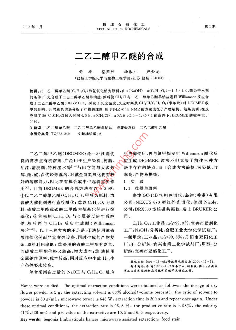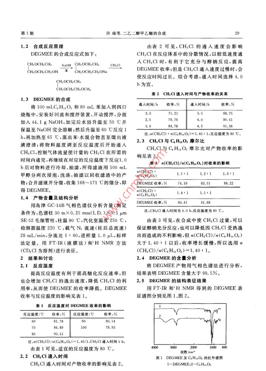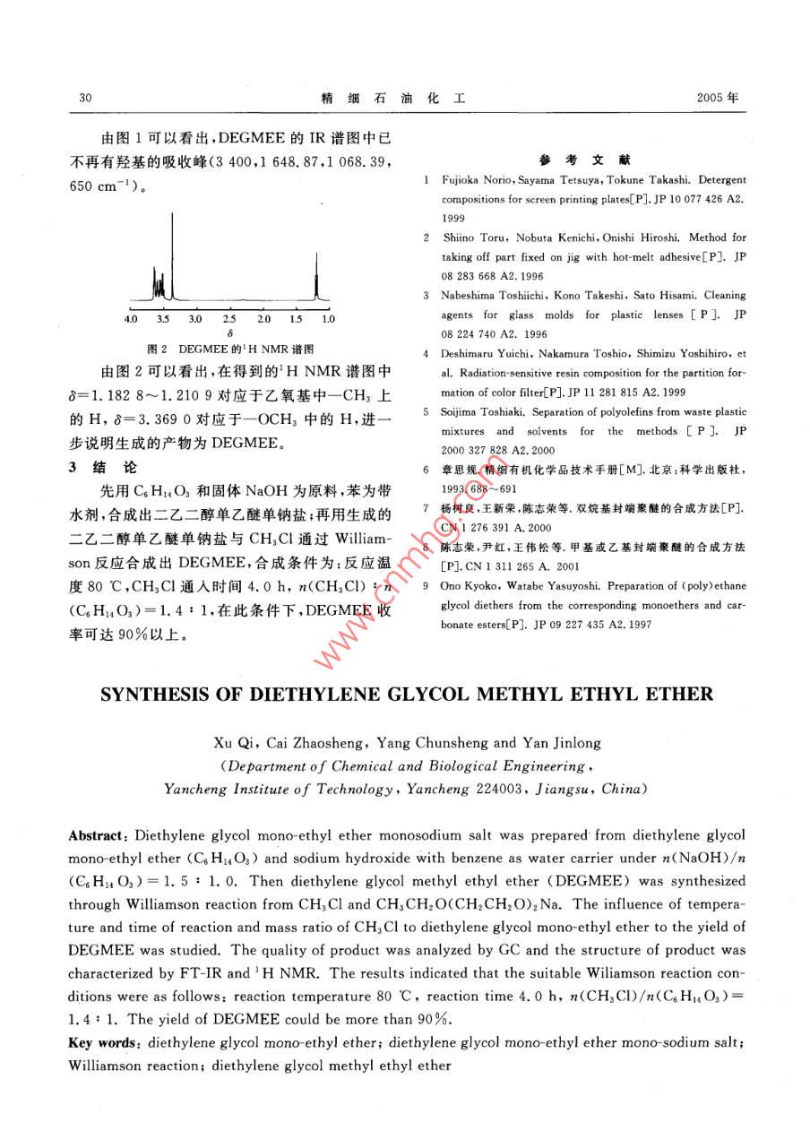 2005年1月精細(xì)石油化工SPECIALITY PETROCHEMICALS第1期二乙二醇甲乙醚的合成許琦蔡照勝楊春生嚴(yán)金龍(鹽城工學(xué)院化學(xué)與生物工程學(xué)院,江蘇鹽城224003)摘要:以二乙二醇單乙醚(CH14O3)和氫氧化鈉為原料在n(NaOH):n(CH14O3)=1.5:1.0,苯為帶水劑的條件下,先合成了二乙二醇單乙醚單鈉鹽,然后使CH3C1與二乙二醇單乙醚單鈉鹽進(jìn)行 Williamson反應(yīng)合成了二乙二醇甲乙醚( DEGMEE)。研究了反應(yīng)溫度、反應(yīng)時(shí)間及CH3Cl/C4H14O(摩爾比)對(duì) DEGMEE收率的影響。用氣相色譜法分析了產(chǎn)物的純度,用FTR和HNMR的方法表征了產(chǎn)物結(jié)構(gòu)。結(jié)果表明:在反應(yīng)溫度80℃,CHCl通入時(shí)間4.0h,n(CH3Cl):n(CH4O3)=1.40:1的條件下, DEGMEE的收率大于90%。關(guān)鍵詞:二乙二醇單乙醚二乙二醇單乙醚單鈉鹽威廉遜反應(yīng)二乙二醇甲乙醚中圖分類號(hào):TQ223.249文獻(xiàn)標(biāo)識(shí)碼:A二乙二醇甲乙醚( DEGMEE)是一種性能優(yōu)生成醇鈉后,再與氯甲烷發(fā)生 Williamson醚化反良的高沸點(diǎn)有機(jī)溶劑,廣泛用于生產(chǎn)染料、樹脂、應(yīng)生成 DEGMEE,該法不但克服了前述三種方油漆、清洗劑、特種墨水等-5;因它能與大多數(shù)法中存在的缺點(diǎn),而且合成方法簡(jiǎn)捷,污染低,收醇、酮、醚、鹵代烴等混溶,對(duì)堿金屬氫氧化物有較率高,產(chǎn)物易提純好的溶解能力因此在有機(jī)合成中也起著重要作1實(shí)驗(yàn)用。目前 DEGMEE的合成方法有以下3種:1.1儀器與原料①以二乙二醇單乙醚(C6H14O3)、甲醇為原料,濃島津GC-14B氣相色譜儀,島津(香港)有限硫酸為催化劑進(jìn)行直接醚化;②以C6H14O3為原公司; NEXUS670型紅外光譜儀,美國 Nicolet料,硫酸二甲酯或碳酸二甲酯為烷基化劑進(jìn)行烷公司;DRX500型核磁共振儀,瑞士 BRUKER公基化;③首先用CH14O3與金屬鈉反應(yīng)生成醇司鈉,然后再與CH3Br反應(yīng)生成醚( WilliamsonC5H14O3,工業(yè)品,v≥99.0%,宜興市助劑化法)6。以上三種方法的不足是:①法使用濃硫工廠;NaOH,分析純,合肥工業(yè)大學(xué)化學(xué)試劑廠;酸作催化劑而嚴(yán)重腐蝕設(shè)備,同時(shí)生成的產(chǎn)物復(fù)氯甲烷,工業(yè)品,v≥99.5%,丹陽市雙陽化工雜,原料利用率低;②法用的硫酸二甲酯有劇毒,廠;苯,分析純,宜興市第二化學(xué)試劑廠;甲醇,分而碳酸二甲酯價(jià)格又較高,增大成本;③法使用析純,宜興市亞盛化工廠。金屬鈉作原料,成本較高,同時(shí)反應(yīng)中生成H2,生收稿日期:2004-08-08;修改稿收到日期:2004-12-24產(chǎn)條件要求較高。作者簡(jiǎn)介:許琦(1965-,江蘇阜寧人,副教授,博士,主要從筆者采用在過量的NaOH與CH14O3反應(yīng)事工業(yè)水處理和應(yīng)用化學(xué)的教學(xué)及研究工作Hance were studied. The optimal extraction conditions were obtained as follows: the dosage of dryflower powder is 2 g, the extracting solvent is 60% alcohol( volume percent), the ratio of solvent topowder is 60 g/mL, microwave power is 648 W, extraction time is 200 s and repeat once again. Underthese optimal conditions, the extraction rate is 96. 8 %, the productive rate is 9. 98%, the colority(1%,526 nm)and ph value of the extractive are 10. 5 and 6. 5 respectively.Key words: begonia fimbristipula hance; microwave assisted extraction; food stain第1期許琦等.二乙二醇甲乙醚的合成1.2合成反應(yīng)原理由表2可見,CH3Cl的通入速度會(huì)影響DEGMEE的合成反應(yīng)式如下:CH3Cl在反應(yīng)體系中的分散情況,以較低速度通CH: OCH: CHs NaOH CH: OCH2 CH3入CH3C時(shí),有利于它充分與醇鈉反應(yīng),提高CH, OCH, CH: OH CH2 OCH,ONaDEGMEE收率;但是CH3Cl通入速度過慢時(shí),會(huì)使反應(yīng)時(shí)間過長。綜合考慮,通入時(shí)間選擇4.0CH: OCH, CHsh為宜。CH, OCH? CH2 OCH表2CHCl通入時(shí)間與產(chǎn)物收率的關(guān)系1.3 DEGMEE的合成將100mLC6H14O3和80mL苯加入到四口通人時(shí)間/h收率通入時(shí)間/h收率,%燒瓶中,安裝好回流和攪拌裝置,開動(dòng)攪拌,分批加入44.1 g NaOh,加完后水浴升溫至50℃并2.584.784.5保溫至NaOH完全溶解;然后升溫至60℃反應(yīng)191.36h,再加熱至65℃,蒸出苯-水混合物直至餾出液注:n(CH3Cl):n(C4H14O3)=1.40:1,反應(yīng)溫度為80滴澄清;將物料溫度調(diào)至反應(yīng)溫度后開始通入2.3CHC1與CH1;O3摩爾比CH3Cl與CH14O3摩爾比對(duì)產(chǎn)物收率的影CH3Cl,控制氣體流量使計(jì)量的CH3Cl在所需的響見表3。時(shí)間內(nèi)通完,再繼續(xù)在對(duì)應(yīng)的反應(yīng)溫度下反應(yīng)1h后對(duì)物料進(jìn)行冷卻、抽濾,所得濾渣用100mL表3m(CHC)/n(CH4O3)對(duì)收率的影響甲醇分兩次浸泡,洗滌,抽濾以回收濾渣中的產(chǎn)n(C4H1O3)1.1:11.2:11.3:1物;合并濾液并分餾,收集168~171℃的餾分,即 DEGMEE收率,%74.39得 DEGMEE。n(C Hi O31.5:11.4產(chǎn)物含量及結(jié)構(gòu)分析用島津GC14B氣相色譜儀分析含量,測(cè)定DEGMEE收率,%90.41條件為:色譜柱30m×0.25mm(.D.)×0.5pm注:CH3Cl通入時(shí)間為4.0h,反應(yīng)溫度為80℃SE-52毛細(xì)管柱,柱溫90℃,汽化室溫度250℃,由表3可見,在合成中使CH3Cl過量,可以檢測(cè)器溫度220℃,載氣N2流速(柱后總流速)保證醇鈉充分反應(yīng),也可以降低因CH3Cl受熱逸28mL/min,分流比1:60,進(jìn)樣量1.0μL,標(biāo)樣出而造成的不利影響,但n(CH3C)/n(CH14O3)法定量。用FTIR(液膜法)和HNMR方法大于1.40:1以后,收率增長緩慢,所以選用n(CD3Cl為溶劑)進(jìn)行表征。(CH3Cl)/n(C6H14O3)=1.40:1。2結(jié)果和討論2.4 D