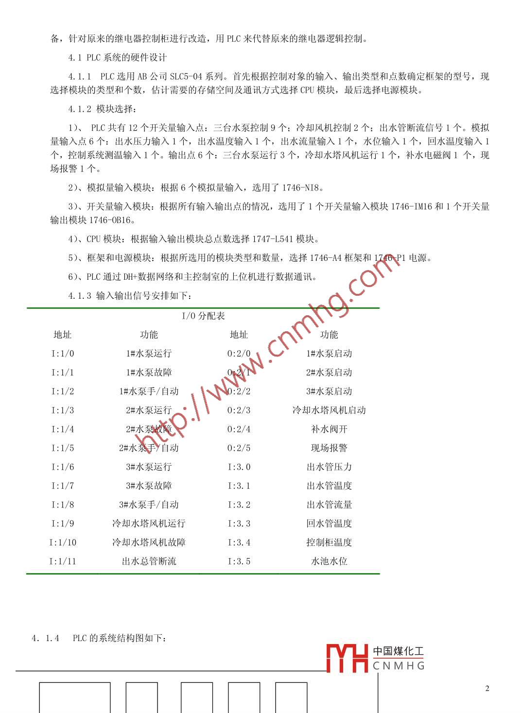 PLC在排煙風(fēng)機(jī)冷卻循環(huán)水系統(tǒng)中的應(yīng)用晉鵬方國晟李貴兵董云生/云南鋁業(yè)股份有限公司[摘要]本文采用羅克韋爾SLC 500 系列可編程控制器(PLC) 作為排煙風(fēng)機(jī)冷卻循環(huán)水系統(tǒng)的控制器,這種控制器具有通用性好,控制方式靈活,編程簡單,抗干擾能力強(qiáng)等特點(diǎn)。本文介紹了冷卻水控制系統(tǒng)的工作原理,冷卻水控制系統(tǒng)的軟件設(shè)計(jì)和硬件設(shè)計(jì),及在電解二二廠供料凈 化排煙風(fēng)機(jī)冷卻循環(huán)水控制系統(tǒng)改造中的應(yīng)用。[關(guān)鍵詞]風(fēng)機(jī)冷卻循環(huán)水系統(tǒng);可編程控制器; 羅克韋爾1AB公司SLC500系列PLC簡介美國AB公司SLC-500系列PLC,屬于中型PLC系統(tǒng),應(yīng)用非常廣泛。SLC-500 PLC是-一個基于機(jī)架的中型控制系統(tǒng),由控制器、離散量模塊、模擬量模塊和特殊輸入輸出模塊、外圍設(shè)備組成。SLC-500系列功能強(qiáng)大、配置靈活,可以提供廣泛的通訊配置、特點(diǎn)和內(nèi)存選項(xiàng)。RSLOGIX- -500梯形圖邏輯編程軟件包提供了靈活的編輯器、點(diǎn)擊式的輸入輸出配置、功能強(qiáng)大的數(shù)據(jù)庫編輯器,此外還帶有診斷和排錯工具以幫助開發(fā)人員節(jié)省項(xiàng)目開發(fā)時(shí)間和最大限度提高效率。SLC -500系列PLC具有以下特點(diǎn):功能強(qiáng)大,全面滿足應(yīng)用項(xiàng)目需要;模塊式設(shè)計(jì);先進(jìn)的指令集;豐富的輸入輸出模塊; SLC 500抗振性強(qiáng),耐高溫,抗電磁干擾,專門針對工業(yè)現(xiàn)場惡劣的工作環(huán)境而設(shè)計(jì);RSL0GIX500編程軟件使用簡單,方便,糾錯能力強(qiáng),可以最大程度發(fā)揮控制器的性能;集成了多種網(wǎng)絡(luò)聯(lián)接通訊選項(xiàng),可以使用工業(yè)以太網(wǎng),DH+ (高速數(shù)據(jù)通訊網(wǎng))網(wǎng),現(xiàn)場驅(qū)動網(wǎng)等進(jìn)行網(wǎng)絡(luò)組態(tài),實(shí)現(xiàn)PLC到PLC及PLC到PC間的數(shù)據(jù)通訊。2排煙風(fēng)機(jī)循環(huán)水系統(tǒng)排煙風(fēng)機(jī)循環(huán)水系統(tǒng)是為鋁電解供料凈化排煙風(fēng)機(jī)軸承實(shí)施水冷卻而配置的。其工作過程為:循環(huán)水由水泵輸送到出水總管,再分別進(jìn)入每臺排煙風(fēng)機(jī)的左右兩個軸承箱的冷卻部位后匯集到回水總管,經(jīng)過冷卻水塔上方的布水管向下噴淋,冷卻水塔頂部的風(fēng)機(jī)運(yùn)轉(zhuǎn)時(shí),回水在填料層中與空氣流進(jìn)行充分的熱交換后流回儲水池中。本循環(huán)水系統(tǒng)根據(jù)生產(chǎn)要求配置為:三臺離心式水泵,兩用一備,每天早班由人工完成水泵切換,水塔冷卻風(fēng)機(jī)一臺,由回水溫度控制運(yùn)行。3生產(chǎn)工藝對循環(huán)水系 統(tǒng)的控制要求3. 1排煙風(fēng)機(jī)對冷卻循環(huán)水系統(tǒng)依賴性較大,如果冷卻水系統(tǒng)發(fā)生故障,排煙風(fēng)機(jī)必須停機(jī),造成煙氣凈化系統(tǒng)停運(yùn),影響電解正常生產(chǎn)。3.2冷卻水運(yùn)行壓力不能低于0. 4mpa,如果壓力過低,距離較遠(yuǎn)的1#系統(tǒng)排煙風(fēng)機(jī)冷卻將出現(xiàn)問題。壓力值通過裝設(shè)在出水總管上的壓力傳感器測得。3.3冷卻水流量不能低于20m*/h,如果流量過小時(shí),所有排煙風(fēng)機(jī)的冷卻效果將會受到影響。流量值通過裝設(shè)在出水總管上的流量計(jì)測得。3.4在回水管上裝設(shè)溫度傳感器,當(dāng)回水溫度達(dá)到33"C時(shí),水塔冷卻風(fēng)機(jī)啟動,使回水溫度下降。當(dāng)降到30C時(shí),風(fēng)機(jī)停止,避免電能浪費(fèi)。3.5在向循環(huán)水池注水的水源管道上裝設(shè)注水用電磁閥。當(dāng)水位低于預(yù)定值時(shí)注水閥打開,向儲水池注水,當(dāng)水位達(dá)到預(yù)定值時(shí),注水閥關(guān)閉,停止向儲水池注水。儲水池水位信號通過池中裝設(shè)的水位傳感器獲得。3.6控制系統(tǒng)和主控制室的上位計(jì)算機(jī)要有通訊,當(dāng)水壓、流量、溫度等參數(shù)出現(xiàn)異常及水泵、水塔風(fēng)機(jī)出現(xiàn)故障時(shí)能在主控制室的上位機(jī)上出現(xiàn)提示,讓主控制室的操作人員及時(shí)發(fā)現(xiàn),以便通知巡檢人員處理。3.7水泵啟停具有現(xiàn)場/遠(yuǎn)程控制功能,操作人員可以根據(jù)工藝要求選擇在就地還是在主控室中啟停水.4系統(tǒng)設(shè)計(jì)中國煤化工根據(jù)以上控制要求,并且是在現(xiàn)有的控制系統(tǒng)上進(jìn)行升級改造。MYHCNMHG的大部分主要設(shè)備,針對原來的繼電器控制柜進(jìn)行改造,用PLC來代替原來的繼電器邏輯控制。4.1PLC系統(tǒng)的硬件設(shè)計(jì)4.1.1PLC選用AB公司SLC5-04系列。首先根據(jù)控制對象的輸入、輸出類型和點(diǎn)數(shù)確定框架的型號,現(xiàn)選擇模塊的類型和個數(shù),估計(jì)需要的存儲空間及通訊方式選擇CPU模塊,最后選擇電源模塊。4.1.2模塊選擇:1)、 PLC共有12個開關(guān)量輸入點(diǎn):三臺水泵控制9個;冷卻風(fēng)機(jī)控制2個;出水管斷流信號1個。模擬量輸入點(diǎn)6個:出水壓力輸入1個,出水溫度輸入1個,出水流量輸入1個,水位輸入1個,回水溫度輸入1個,控制系統(tǒng)測溫輸入1個。輸出點(diǎn)6個:三臺水泵運(yùn)行3個,冷卻水塔風(fēng)機(jī)運(yùn)行1個,補(bǔ)水電磁閥1個,現(xiàn)場報(b