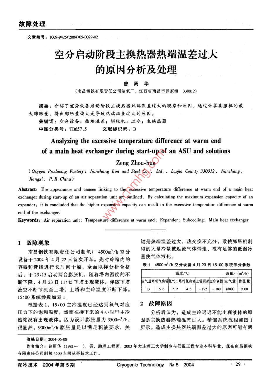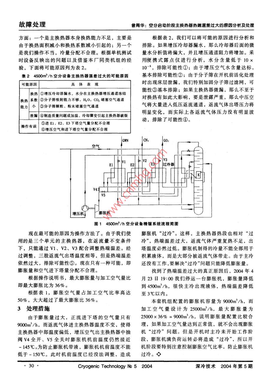 故障處理文章編號:1009-9425(2004)05-0029-02空分啟動階段主換熱器熱端溫差過大的原因分析及處理曾周華(南昌鋼鐵有限責(zé)任公司制氧廠,江西省南昌市羅家鎮(zhèn)330012)摘要:介紹了空分設(shè)備啟動階段主換熱器熱端溫差過大的現(xiàn)象和原因,通過計算膨脹機的最大膨脹量,得出膨脹量偏大是導(dǎo)致熱端溫差過大的原因。關(guān)鍵詞:空分設(shè)備;熱端溫差;膨脹機;過冷;主換熱器中圖分類號:TB657.5文獻標識碼:BAnalyzing the excessive temperature difference at warm endof a main heat exchanger during start-up of an asu and solutionsOxygen Producing Factory: Nanchang Iron and Steel Co, Ltd, Luojia County 330012, NanchangJiangxi. P R China)Abstract: The appearance and causes linking to the excessive temperature difference at warm end of a main heatexchanger during start-up of an air separation unit are outlined. By calculating the maximum expansion capacity of anexpander, it is concluded that the higher expansion capacity can result in the excessive temperature difference at warmKeywords: Air separation unit; Temperature difference at warm end; Expander; Subcooling: Main heat exchanger1故障現(xiàn)象鍵是熱端溫差過大,熱交換不充分,致使膨脹機制南昌鋼鐵有限責(zé)任公司制氧廠4500m3/h空分得的大量冷量被返流氣體帶走,沒有足夠的低溫冷設(shè)備于2004年4月22日首次開車。先對冷箱內(nèi)的量使氣體液化。容器和管線進行長時間干燥,全面取樣分析合格表140mh空分設(shè)備4月23日15:00系統(tǒng)部分參數(shù)后,于23:15啟動兩臺膨脹機,隨著塔內(nèi)溫度的不溫度/℃流量/(m3/h)斷下降,4月23日1:45下塔出現(xiàn)液體;伴隨下塔氣進塔氰氣出塔氯氣出出塔上塔頂部主冷氧空氣量膨脹量液空不斷節(jié)流至上塔,上塔和主冷溫度不斷下降。135.65.2481801800090015:00系統(tǒng)參數(shù)如表1根據(jù)表1,15:00主冷溫度已經(jīng)達到氧氣對應(yīng)2故障原因壓力下的飽和溫度,然而在接下來的4小時里主冷分析后認為,造成主冷遲遲不能出現(xiàn)液體的原始終沒有出現(xiàn)液體。因為設(shè)計膨脹量為300m3/h,因是主換熱器熱端溫差過大。精餾系統(tǒng)流程如圖很顯然,9000m3/h膨脹量足以滿足積液要求,關(guān)所示。造成主換熱器熱端溫差過大的原因可能有兩收稿日期:200406-08作者簡介:曾周華(1981—),男,助理工程師,2003年大連理工大學(xué)制冷與低溫工程專業(yè)本科畢業(yè),現(xiàn)在南昌鋼鐵有限責(zé)任公司制氧4500車間從事技術(shù)工作。深冷技術(shù)2004年第5期Cryogenic Technology No 5 2004故障處理曾周華:空分啟動階段主換熱器熱端溫差過大的原因分析及處理方面:一個是主換熱器本身換熱能力不足,主要是根據(jù)表2,我們可以將可能的原因進行分析和由于換熱面積減小和換熱系數(shù)減小引起的;另一個排除。如果增壓冷卻器漏水,那么冷卻器后面的微是我們操作不當(dāng),冷量分配不合理。根據(jù)單機測試量水分析值將偏大,并且增壓通道阻力將增加。采時設(shè)備反映出的問題以及借鑒本廠同類機組的經(jīng)用便攜式露點儀進行分析,水分含量低于10×驗,下面將可能原因列為表2。10-6,排除可能性①;由于增壓空氣水含量達標,表24500m3/h空分設(shè)備主換熱器溫差過大的可能原因基本排除可能性②;由于分子篩在開機前活化處理可能原因具體表現(xiàn)時出現(xiàn)床層泄漏,我們特別加固分子篩過濾網(wǎng),可能性③基本排除;如果主換熱器微漏,那么不至于換熱①增壓冷卻器漏水,水分在主換熱器增壓通道凍結(jié)換熱系數(shù)②分子篩吸附能力不夠,HQO,CO2堵塞空氣通道對換熱有如此大影響,要是泄露嚴重,那么中壓空能力?、鄯肿雍Y顆粒、粉末堵塞空氣通道氣將大量進入低壓返流通道,返流氣體出塔壓力將泄漏④制造質(zhì)量問題或加溫、冷卻驟變引起主換熱器破裂明顯變化,而實際上各返流氣體壓力沒有明顯波⑤進E1、F2、E3下塔空氣量分配不合理動,排除了可能性④。操作有誤⑥增壓空氣和進下塔空氣量分配不合理3世冷器增壓機膨脹機圖14500m3/h空分設(shè)備精餾系統(tǒng)流程簡圖現(xiàn)在最可能的原因為操作方法了。由于我們使膨脹機“過冷”。這樣,主換熱器熱段也相對“過用的是三個單元的主換熱器,在返流量不變條件冷”,熱端溫差過大,返流氣體嚴重復(fù)熱不足,出下,只能通過Ⅵ1、V2、V3配合調(diào)整熱端溫差。經(jīng)塔溫度必然過低。膨脹機制得的冷量不能全部用于過調(diào)整,三股返流氣出塔溫度相等,但是熱端溫差積累液體,而是大部分被返流氣體帶走。由于主冷依然過大,排除可能性⑤?,F(xiàn)在只有一種可能,即還沒有工作,要解決“過冷”問題只能降低膨脹量。膨脹量和空氣進下塔量分配不合理。找到了熱端溫差過大的真正原因后,2004年4根據(jù)操作說明書,最大膨脹量與加工空氣量比月23日19:00我們停運一臺膨脹機,膨脹量降低即最大膨脹比為36%。到4500m3h,很快主冷出現(xiàn)液體,熱端溫差降低根據(jù)表1,膨脹空氣量占加工空氣比率高達至3℃以內(nèi)50%,大大超過了最大膨脹比36%。本套機組配置的膨脹機容量為9000m3/h,而3處理措施加工空氣量設(shè)計為25000m3/h,最大膨脹量為由于膨脹量過大,正流進下塔的空氣量只有2500036%=900m/h,說明膨脹量配置比較合900m3/h,而返流氣體進主換熱器溫度不變,使得理,如果加工空氣量達到正常值,就不會出現(xiàn)膨脹主換熱器中部溫度偏低,增壓空氣出