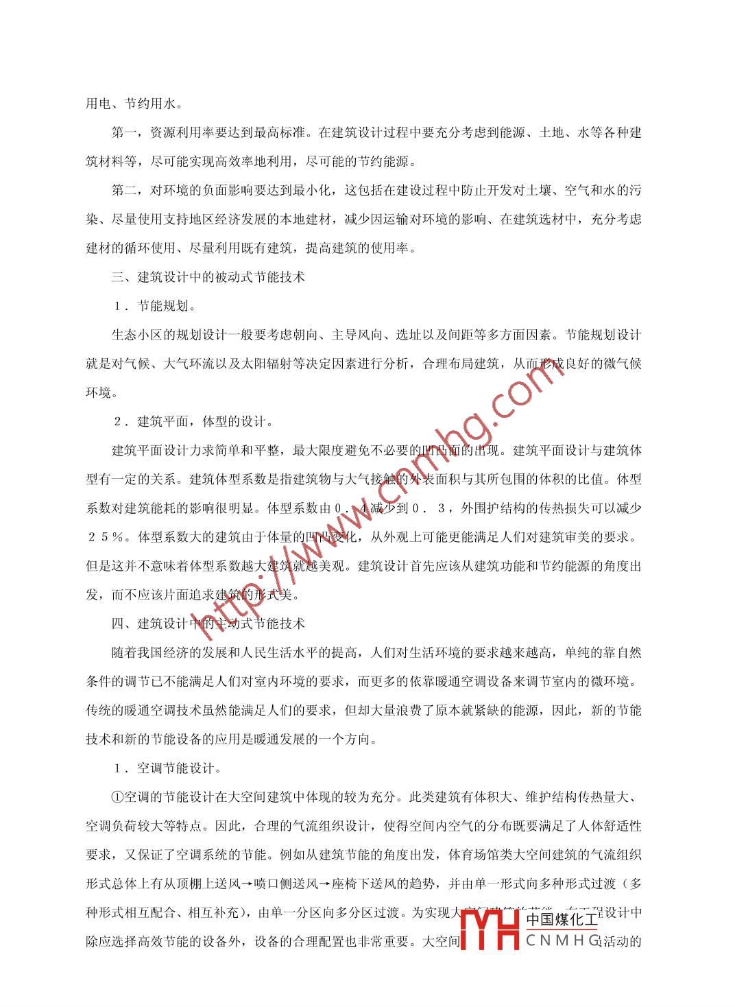 淺析設計中的節(jié)能設計吳鮮華李小紅浙江求新建筑設計有限公司浙江325000摘要:隨著可持續(xù)發(fā)展觀念的不斷深入開展,在設計中表現(xiàn)為節(jié)能高效設計理念的不斷應用,節(jié)能設計是--項非常復雜的系統(tǒng)工作。我國的領域未來的發(fā)展就是走節(jié)能環(huán)保的路線,利用先進技術立足于我國不同的節(jié)能特點,在設計階段通過技術集成化的解決手段,達到不斷降低能源需求。本文對建筑設計中的節(jié)能設計進行了分析。關鍵詞:節(jié)能設計;新能源;可再生資源Abstract: With the concept of sustainable development deeply, in the design of the performance for the continuousapplication of high-fficiency energy-saving design concepts, energy eficiency design is a very complex system. Futuredevelopment of China's trritry is energy saving and environmental protection of the route, based on the characteristicof energy saving China's use of advanced technology, in the design stage through technology integration solution, tocontinuously reduce energy demand. This paper analyzes the construction of energy-efficient design in the design.Key words: energy-saving design; new energy; renewable resources中圖分類號: TU201. 5建筑節(jié)能是一項全方位的綜合性的系統(tǒng)工程,建筑節(jié)能設計涉及建筑技術、材料技術、能源技術、智能技術、仿生技術、廢物再利用等技術的應用,也涉及設計、施工、管理、政策法規(guī)等諸多部門,是一項全方位的、綜合性的系統(tǒng)工程。目前我國正在提倡可持續(xù)發(fā)展的戰(zhàn)略,為使能源得到最合理的利用,在建筑設計中融入節(jié)能的概念,可以改善我國能源緊缺的現(xiàn)狀,并為國民經(jīng)濟的健康發(fā)展做出貢獻。、建筑節(jié)能設計中--些容易被忽視的因素隨著我國城市化進程的加快,建筑市場也在快速發(fā)展,為適應當前經(jīng)濟的發(fā)展步伐并將各類先進技術融入建筑設計中,節(jié)能技術在建筑設計中越來越受到重視。多型建筑已被建設部納入今后城市建設的重點發(fā)展方向,相關的指引、標準和法規(guī)也相繼出臺,建筑節(jié)能設計已成為今后建筑設計的重要組成部分。但在目前的建筑節(jié)能設計中有一些問題與建筑節(jié)能有密切關系,但又容易在設計中被忽視。它們涉及到建筑規(guī)劃、建筑通風、建筑外遮陽等方面,對這些問題進行深入探討有著重要的現(xiàn)實意義。二、節(jié)能建筑設計的原則隨著能源短缺帶來的壓力和環(huán)保節(jié)能意識的增強,“綠色建筑"“可持續(xù)發(fā)展的設計”成為當今建筑行業(yè)最熱門的話題,節(jié)能的建筑應該充分體現(xiàn)出利用陽光、中國煤化工的節(jié)約YHCNMHG用電、節(jié)約用水。第一,資源利用率要達到最高標準。在建筑設計過程中要充分考慮到能源、土地、水等各種建筑材料等,盡可能實現(xiàn)高效率地利用,盡可能的節(jié)約能源。第二,對環(huán)境的負面影響要達到最小化,這包括在建設過程中防止開發(fā)對土壤、空氣和水的污染、盡量使用支持地區(qū)經(jīng)濟發(fā)展的本地建材,減少因運輸對環(huán)境的影響、在建筑選材中,充分考慮建材的循環(huán)使用、盡量利用既有建筑,提高建筑的使用率。三、建筑設計中的被動式節(jié)能技術1.節(jié)能規(guī)劃。生態(tài)小區(qū)的規(guī)劃設計一-般要考慮朝向、主導風向、選址以及間距等多方面因素。節(jié)能規(guī)劃設計就是對氣候、大氣環(huán)流以及太陽輻射等決定因素進行分析,合理布局建筑,從而形成良好的微氣候環(huán)境2.建筑平面,體型的設計。建筑平面設計力求簡單和平整,最大限度避免不必要的凹凸面的出現(xiàn)。建筑平面設計與建筑體型有一定的關系。建筑體型系數(shù)是指建筑物與大氣接觸的外表面積與其所包圍的體積的比值。體型系數(shù)對建筑能耗的影響很明顯。體型系數(shù)由0. 4減少到0.3,外圍護結(jié)構(gòu)的傳熱損失可以減少25%。體型系數(shù)大的建筑由于體量的凹凸變化,從外觀.上可能更能滿足人們對建筑審美的要求。但是這并不意味著體型系數(shù)越大建筑就越美觀。建筑設計首先應該從建筑功能和節(jié)約能源的角度出發(fā),而不應該片面追求建筑的形式美。四、建筑設計中的主動式節(jié)能技術隨著我國經(jīng)濟的發(fā)展和人民生活水平的提高,人們對生活環(huán)境的要求越來越高,單純的靠自然條件的調(diào)節(jié)已不能滿足人們對室內(nèi)環(huán)境的要求,而更多的依靠暖通空調(diào)設備來調(diào)節(jié)室內(nèi)的微環(huán)境。傳統(tǒng)的暖通空調(diào)技術雖然能滿足人們的要求,但卻大量浪費了原本就緊缺的能源,因此,新的節(jié)能技術和新的節(jié)能設備的應用是暖通發(fā)展的-一個方向。1.空調(diào)節(jié)能設計。①空調(diào)的節(jié)能設計在大空間建筑中體現(xiàn)的較為充分。此類建筑有體積大、維護結(jié)構(gòu)傳熱量大、空調(diào)負荷較大等特點。因此,合理的氣流組織設計,使得空間內(nèi)空氣的分布既要滿足了人體舒適性要求,又保證了空調(diào)系統(tǒng)的節(jié)能。例如從建筑節(jié)能的角度出發(fā),體育場館類大空間建筑的氣流組織形式總體.上有從頂棚上送風→噴口側(cè)送風→座椅下送風的趨勢,并由單-形式向多種形式過渡(多種形式相互配合、相互補充),由單-分區