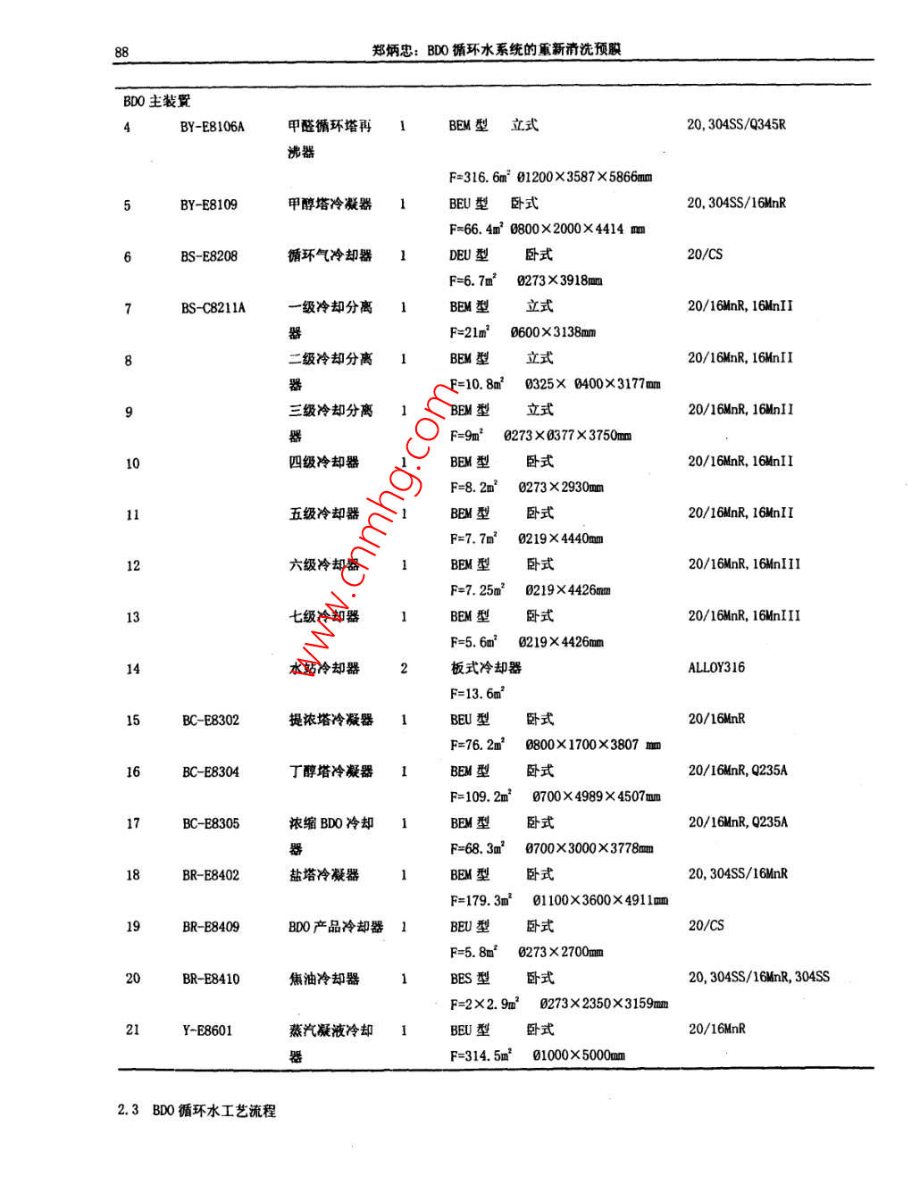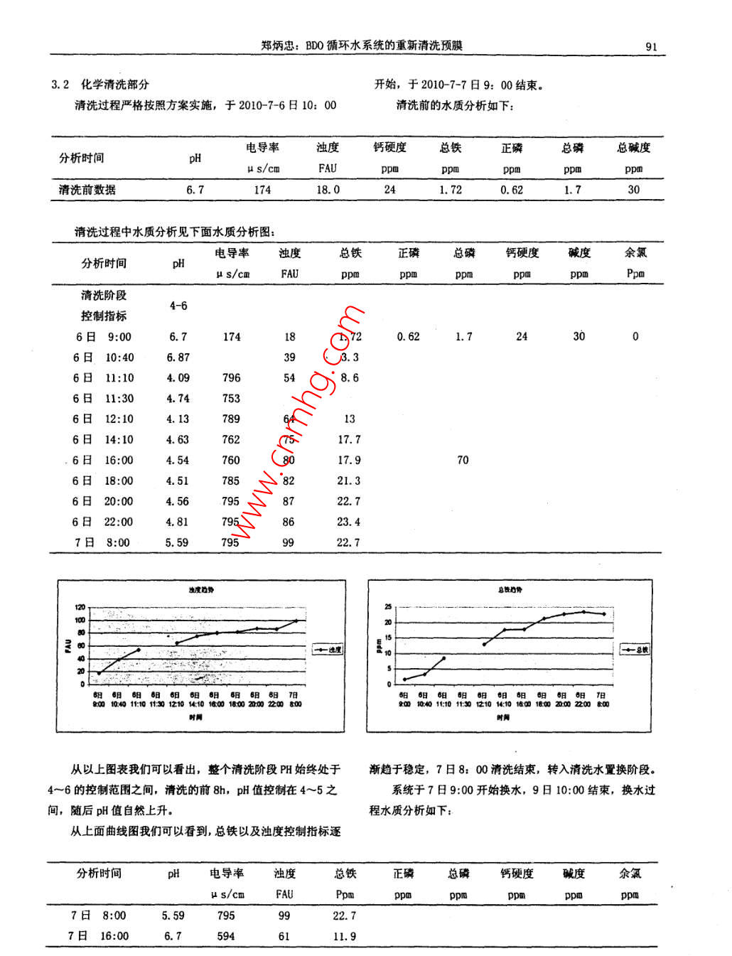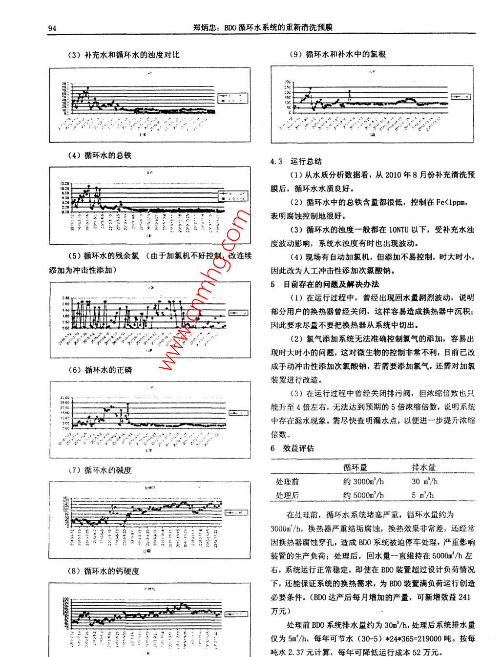 化學(xué)工程與裝備2011年9期Chemical Engineering 星Equipment87BDO循環(huán)水系統(tǒng)的重新清洗預(yù)膜鄭炳忠(湄洲灣氯堿工業(yè)有限公司,福建泉州362801)關(guān)鍵詞:循環(huán)水;系統(tǒng)清洗;預(yù)膜1概述蝕劑的成膜效果,常在循環(huán)水開(kāi)車(chē)初期投加較高的緩蝕劑-套完整的循環(huán)水處理方案包括清洗、預(yù)膜和正常處理量,待成膜后,再降低藥劑濃度維持補(bǔ)膜,即所謂的正常處程序。循環(huán)冷卻水系統(tǒng),無(wú)論是新系統(tǒng)或是老系統(tǒng),在開(kāi)車(chē)?yán)?。這種預(yù)膜處理,其目的是希望在金屬表面上能很快的形正常投藥之前都要進(jìn)行系統(tǒng)清洗和預(yù)膜工作.清洗和預(yù)膜工成- -層保護(hù)膜, 提高緩蝕劑抑制腐蝕的效果。實(shí)踐也證明在作被稱為循環(huán)水系統(tǒng)化學(xué)處理的預(yù)處理。對(duì)于新系統(tǒng)來(lái)說(shuō),同- -個(gè)系統(tǒng)中,經(jīng)過(guò)預(yù)膜和未經(jīng)預(yù)膜的設(shè)備,在用同樣的的設(shè)備和管道在安裝過(guò)程中,難免會(huì)有碎屑、雜物和塵土留在緩蝕劑情況下,其緩蝕效果卻相差很大。因此,循環(huán)水開(kāi)車(chē)系統(tǒng)之中,有時(shí)冷卻設(shè)備的銹蝕和油污也很?chē)?yán)重,這些雜物初期的預(yù)膜工作必須要給以高度重視。和油污如不清洗干凈,將會(huì)影響下-步的預(yù)膜處理。老系統(tǒng)循環(huán)水系統(tǒng)除了在開(kāi)車(chē)時(shí)必須要進(jìn)行預(yù)膜外,在發(fā)生以的冷卻設(shè)備還常有垢、粘泥和金屬腐蝕產(chǎn)物,嚴(yán)重影響設(shè)備下情況時(shí)也必須重新預(yù)膜:壽命和換熱效率。因此,清洗工作做的好,對(duì)新系統(tǒng)來(lái)說(shuō),(1)年度大檢修系統(tǒng)停水后:可以提高預(yù)膜效果,減少腐蝕和結(jié)垢的產(chǎn)生:對(duì)已投產(chǎn)的老(2)系統(tǒng)進(jìn)行酸洗之后:系統(tǒng)來(lái)說(shuō),可以提高換熱效率,改善工藝操作條件,保證長(zhǎng)(3)停水40h或換熱設(shè)備暴露在空氣中12 h后:的生產(chǎn)周期,降低能耗和延長(zhǎng)設(shè)備使用壽命。所以,清洗工(4)循環(huán)水系統(tǒng)出現(xiàn)了低PH值漂移(PH<4達(dá)2 h),作是循環(huán)水系統(tǒng)開(kāi)車(chē)必不可少的-一個(gè)環(huán)節(jié)。但被復(fù)原到控制的PH值之后:預(yù)膜處理又稱基礎(chǔ)處理,是在系統(tǒng)清洗之后、正常運(yùn)行(5)系統(tǒng)經(jīng)過(guò)長(zhǎng)周期運(yùn)行之后。之前化學(xué)處理的必要步驟.循環(huán)水系統(tǒng)的預(yù)膜是為了提高緩2 BDO循環(huán)水系統(tǒng)簡(jiǎn)介2.1循環(huán)冷卻水系統(tǒng)參數(shù)循環(huán)水量4800m2/h保有水量1500 m'設(shè)備主要材質(zhì)碳鋼、不銹鋼、銅2.2 BDO 裝置換熱器情況序號(hào)設(shè)備位號(hào)設(shè)備名稱數(shù)量型號(hào)規(guī)格.結(jié)構(gòu)材質(zhì)(管程/殼程)乙炔裝置粗乙炔冷卻器BEM型立式02E0201F=91. 1m2 0900 1989X4445 m20/ 16MnR2BA-E8004調(diào)溫水換熱器BEM型臥式20/16MnRF=26. 41m’0500X 26003310mm3乙炔升壓機(jī)出304SS/Q235A88鄭炳忠: BDO 循環(huán)水系統(tǒng)的重新清洗預(yù)膜BDO主裝覺(jué)BY-E8106A甲醛循環(huán)塔再1BEM型立式20, 304SS/Q345R沈器F=316. 6m2 01200X 3587 X 5866mmBY-E8109甲醇塔冷凝器1BEU型臥式20, 304SS/ 16MnRF=66. 4m? 0800X2000X4414 mBS-E8208循環(huán)氣冷卻器1DEU型20/CSF=6. 7m2 0273X 3918mmBS-C8211A- -級(jí)冷卻分離1BEM型立式20/ 16MnR, 16MnII器F=21m° 0600X 3138mm二級(jí)冷卻分離1F=10. 8m20325X 0400X3177mm9三級(jí)冷卻分離1立式.20/16MnR, 16Mn1IF=9m° 0273X0377 X 3750mml0四級(jí)冷卻器1臥式20/16MnR, 16MnIIF=8. 2m2 0273 X2930mm11五級(jí)冷卻器F=7. 7m’0219X 440mm12六級(jí)冷卻器20/ 16MnR, 16MnIIIF=7. 25m° 0219X 4426mm13七級(jí)冷卻器120/16MnR, 16MnIIIF=5. 6m20219X 426mm14水站冷卻器2板式冷卻器ALLOY316F=13. 6m'15BC E8302提濃塔冷凝器1BEU型20/16MnRF=76. 2m’0800X1700X3807 m16BC-E8304丁醇塔冷凝器120/16MnR, Q235AF=109. 2m’0700X 4989X 4507mm17BC-E8305濃縮BDO冷卻1F=68. 3m2 0700X3000>3778mm18BR-E8402鹽塔冷凝器20, 304SS/16MnRF=179. 3m201 100X 3600X 491 lmBR-E8409BDO產(chǎn)品冷卻器1F=5. 8m2 0273X 2700mm20BR- -E8410焦油冷卻器BES型20, 304SS/16MnR, 304SSF=2X2. 9m' 0273X 2350X3159mm21Y-E8601蒸汽凝液冷卻1F=314. 5m° 01000X 5000mm2.3 BDO 循環(huán)水工藝流程鄭炳忠: BDO 循環(huán)水系統(tǒng)的重新清洗預(yù)膜3.2 化學(xué)清洗部分開(kāi)始,于2010-7-7日9: 00 結(jié)束。清洗過(guò)程嚴(yán)格按照方案實(shí)施,于2010-7-6日10: 00清洗前的水質(zhì)分析如下:電導(dǎo)率濁度鈣硬度總鐵正磷總磷總堿度分析時(shí)間pHμ s/cmFAUppmppn清洗前數(shù)據(jù)6.717418. 0241. 720. 62.730清洗過(guò)程中水質(zhì)分析見(jiàn)下面水質(zhì)分析圖:堿度余氯FALpmPpm清洗階段4-6控制指標(biāo)6日9:0081.721. 706日10:406. 873.36日11:104. 097968.66日11:304.747536日12:1078936日14:104. 6376217. 76日16:0076017.976日18:004.5178521. 36日20:004. 5622. 76日22:004.8179523.4.7日8:005.599922.7發(fā)度趨勢(shì)20 r0o上mE20一一8鐵憫從以上圖表我們可以看出,整個(gè)清洗階段PH始終處于漸趨于穩(wěn)定,7日8: 00 清洗結(jié)束,轉(zhuǎn)入清洗水置換階段。4~6的控制范圍之間,清洗的前8h, pH 值控制在4~5之系統(tǒng)于7日9:00開(kāi)始換水,9日10:00結(jié)束,換水過(guò)間,隨后pH值自然上升。程水質(zhì)分析如下:從上面曲線圖我們可以看到,總鐵以及濁度控制指標(biāo)逐)H