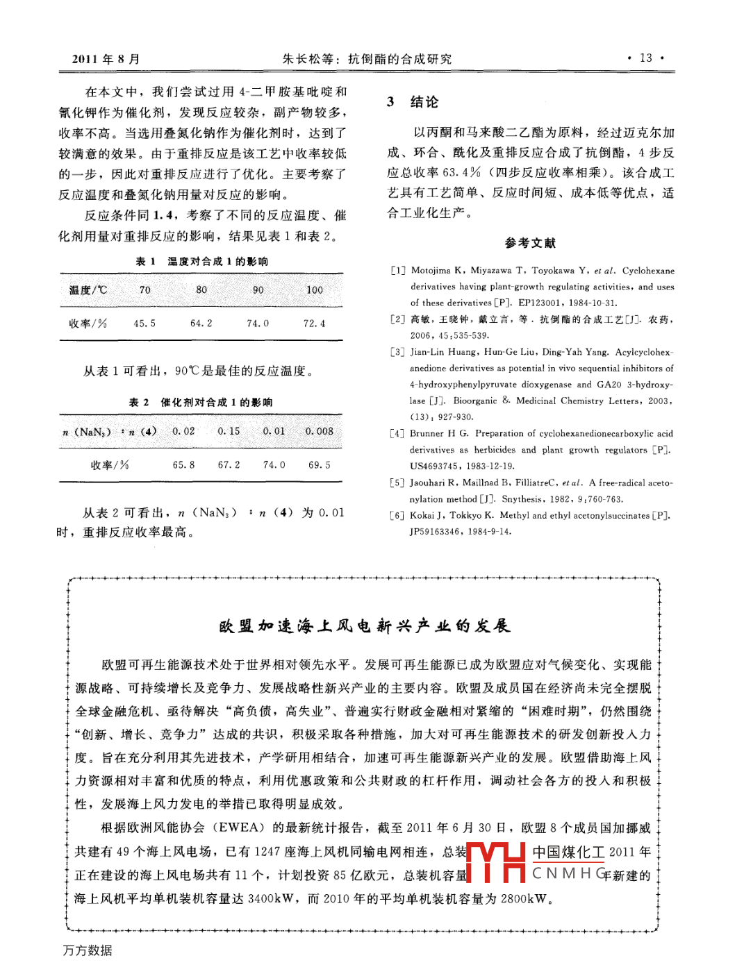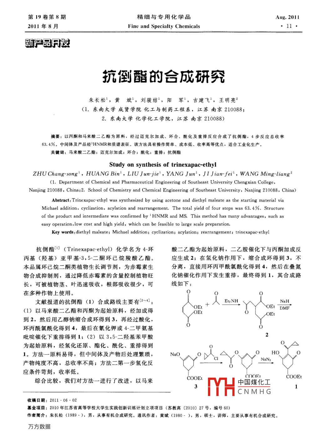 第19卷第8期精細(xì)與專用化學(xué)品Aug.20112011年8月Fine and Specialty Chemicals11.新嚴(yán)品開潑抗倒酯的合成研究朱長松',黃斌,劉駿結(jié)',陽軍', 吉建飛,王明亮2(1. 東南大學(xué)成賢學(xué)院化工與制藥工程系,江蘇南京210088;2.東南大學(xué)化學(xué)化工學(xué)院,江蘇南京210088)摘要:以丙酮和馬來酸二乙酯為原料,經(jīng)過邁克爾加成、環(huán)合、?;爸嘏欧磻?yīng)合成了抗倒酯,4步反應(yīng)總收率63. 4%。中間體及產(chǎn)品經(jīng)'HNMR和質(zhì)譜表征。該方法具有操作簡單、成本低、收率高等優(yōu)點(diǎn),適合工業(yè)化生產(chǎn)。關(guān)鍵詞:馬來酸二乙酯;邁克爾加成;環(huán)合;?;?重排;抗倒酯Study on synthesis of trinexapac-ethylZHU Chang-song', HUANG Bin', LIU Jun-jie', YANG Jun', JI Jian-fei',WANG Ming -liang2(1. Department of Chemical and Pharmaceutical Engineering of Southeast University Chengxian College,Nanjing 210088,China;2. School of Chemistry and Chemical Engineering of Southeast University, Nanjing 210088, China)Abstract: Trinexapac -ethyl was synthesized by using acetone and diethyl maleate as the starting material viaMichael addition, cyclization, acylation and rearrangement. The total yield of four steps was 63. 4%. Structureof the product and intermediate was confirmed by ' HNMR and MS. This method has many advantages, such aseasy operation,low cost and high yield, which can be feasible to large scale preparation.Key words:diethyl maleate; Michael addition; cyclization; acylation; rearrangement; trinexapac-ethy!抗倒酯0] (Trinexapac-ethyl) 化學(xué)名為4-環(huán)酸二乙酯為起始原料,二乙胺催化下與丙酮加成反丙基(羥基)亞甲基-3,5-二酮環(huán)己烷羧酸乙酯。應(yīng)生成2;在氫化鈉作用下,縮合成環(huán)得到3,不本品屬環(huán)已烷二酮類植物生長調(diào)節(jié)劑,為赤霉素生分離,直接用環(huán)丙甲酰氯?;玫?,然后在疊氮物合成抑制劑,通過降低赤霉素的含量控制植物旺化鈉催化作用下發(fā)生重排,最終得到1,其合成路長,可被植物莖、葉迅速吸收,根部吸收很少,可線如下:在多種作物上使用。0文獻(xiàn)報道的抗倒酯(1) 合成路線主要有(2~4:+, 人。 EIrNHNaHOEtOEt DMF(1)以馬來酸二乙酯和丙酮為起始原料,經(jīng)加成得到2,然后用乙醇鈉縮合成環(huán)得到3,再經(jīng)過酸化,環(huán)丙酰氯?;玫?,最后在氰化鉀或4-二甲氨基吡啶催化下重排得到1; (2)以3,5-二羥基苯甲酸為起始原料,經(jīng)氫化還原、酯化、酰化、重排得到9A1。方法一原料易得,但中間體及產(chǎn)物后處理繁瑣,NaO)HONaN3.產(chǎn)物純度不高,總收率不高;方法二第一步氫化反應(yīng)條件苛刻,收率低。COOEt綜合比較,我們對方法一-進(jìn)行了改進(jìn),以馬來中國煤化工MYHCNMH G收稿日期: 2011 -06-02基金項(xiàng)目: 2010 年江蘇省高等學(xué)校大學(xué)生實(shí)踐創(chuàng)新訓(xùn)練計劃立項(xiàng)項(xiàng)目(蘇教高[2010] 27 號,編號60)作者簡介:朱長松(1989-), 男,從事有機(jī)合成研究。通訊作者:黃斌(1980- ),男,碩士,講師,主要從事有機(jī)合成研究。12●精細(xì)與專用化學(xué)品第19卷第8期該工藝操作簡單,后處理容易,反應(yīng)條件溫.(3),0.52g (0. 8mmol)疊氮化鈉,1.6g (2.2和,反應(yīng)收率高,易于工業(yè)化。mmol) N,N-二甲基甲酰胺,0.8g (79.2 mol)三乙胺,100mL 甲苯,90C攪拌反應(yīng)4h,TLC監(jiān)測1實(shí)驗(yàn)部分(展開劑: V (乙酸乙酯) : V (石油醚) -1 : 2),1.1 儀器和試劑原料消失,反應(yīng)結(jié)束。將反應(yīng)液冷卻至室溫,加入儀器: X4型熔點(diǎn)測定儀,溫度計未校正,上25mL水,用濃鹽酸調(diào)節(jié)pH至3~4,分液,水相海金鵬分析儀器有限公司; Brucker 400M核磁共用甲苯萃取(2X70mL),合并有機(jī)相,再用飽和振儀; Agilent 6120質(zhì)譜儀。試劑:馬來酸二乙酯、丙酮、二乙胺、NaH食鹽水洗(2X 20mL),無水硫酸鈉干燥,濃縮得(60%礦物油)、N,N-二甲基甲酰胺、乙酸乙酯、到棕黃色液體,減壓(lmmHg)蒸餾收集175~石油醚、環(huán)丙甲酰氯、甲苯、飽和食鹽水、無水硫180C餾分,得到14.8g黃綠色油狀物,冷卻固化得到白色固體1,收率74.0%。熔點(diǎn)34~35°C(文酸鈉、三乙胺,均為市售分析純。1.2 2-丙酮基-丁二酸二乙酯(2) 的合成獻(xiàn)[36°C)。' HNMR (CDCI3 , 400MHz),8:1.13~將馬來酸二乙酯18g (0. 10mol),丙酮48g1.18 (m,2H);1. 25~ 1.34(m,5H);1.31~1.39(0. 83mol),二乙胺1.49g (0. 02mol)投人(m,2H);2.69~ 2.97(m,4H);3.04~ 3.10(m,250mL高壓釜,加熱至160C,保溫反應(yīng)24h。冷1H);3.63~3.60(m,1H);4.15~4.23(q, 2H)。卻至室溫,首先常壓蒸餾除去低沸物,然后減壓MS(m/z) :253.2(M+,100%)。(2mmHg)蒸餾收集125~ 130C餾分,得到21.46g淡黃色液體2,收率為89. 2% , HNMR2結(jié)果與討論.(CDCI3 ,400MHz),8:1.20~ 1.27(t, 6H);2.17(s,2.1 2- 丙酮基-丁二酸二乙酯(2) 的合成3H);2.60~3.30(m,5H);4.10~4.15(q,4H)。2-丙酮基-丁二酸二乙酯(2)的合成方法主要1.3 3乙氧羰基-5-氧環(huán)己-1-烯-1-醇環(huán)丙甲酸酯有2種I5.6]: (1)以氯甲酸異丙烯酯、過氧叔丁醇、(4)的合成句250mL的四口瓶中加人氫化鈉3.8g丁二酸乙酯為主要原料經(jīng)過自由基反應(yīng)得到; (2)(60.55%,0. 18mol)和N,N-二甲基甲酰胺以馬來酸二乙酯和丙酮經(jīng)過邁克爾加成反應(yīng)得到。100mL,攪拌,60°C以 下滴加20g (0. 087mol) 2后者原料易得,收率高,故采用第二種方法。到反應(yīng)液中,滴加完之后加熱至90°C,反應(yīng)1h。2.2環(huán)合反應(yīng)、 ?;磻?yīng)TLC檢測(展開劑為乙酸乙酯),反應(yīng)結(jié)束,得到文獻(xiàn)報道C2.31的環(huán)合、?;磻?yīng)工