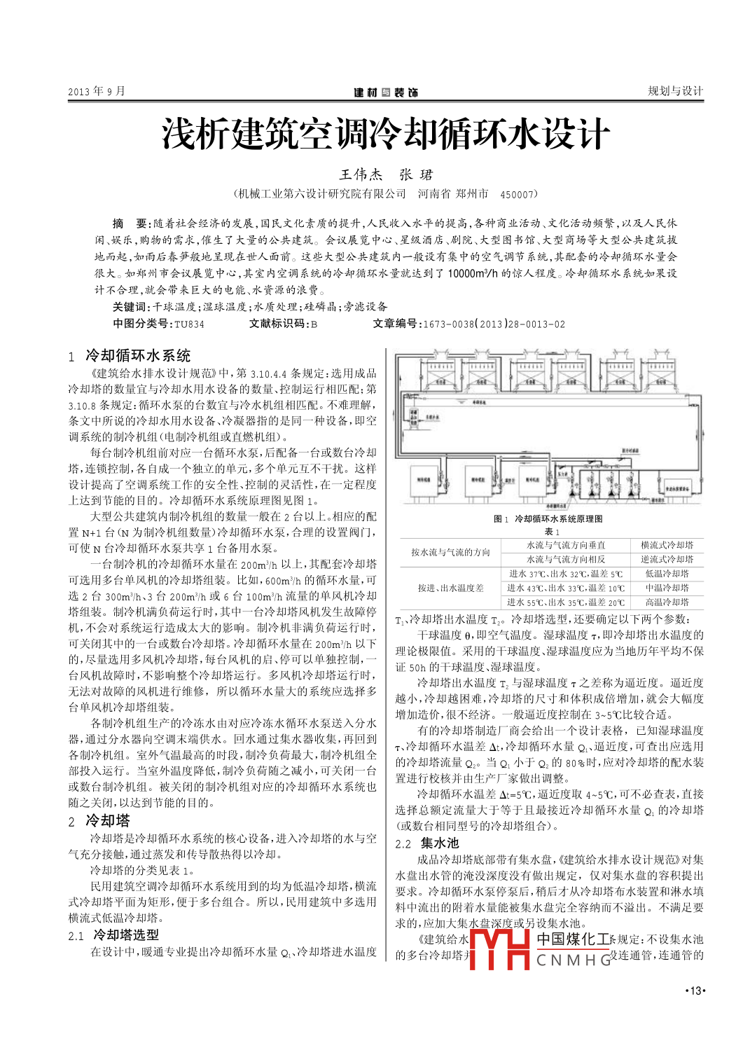 2013年9月建前與裝飾規(guī)劃與設(shè)計(jì)淺析建筑空調(diào)冷卻循環(huán)水設(shè)計(jì)王偉杰張珺(機(jī)械工業(yè)第六設(shè)計(jì)研究院有限公司河南省鄭州市450007)摘要:隨著社會(huì)經(jīng)濟(jì)的發(fā)展,國(guó)民文化素質(zhì)的提升,人民收入水平的提高,各種商業(yè)活動(dòng)、文化活動(dòng)頻繁,以及人民休閑、娛樂(lè),購(gòu)物的需求,催生了大量的公共建筑。會(huì)議展覽中心、星級(jí)酒店、劇院、大型圖書(shū)館、大型商場(chǎng)等大型公共建筑拔地而起,如雨后春筍般地呈現(xiàn)在世人面前。這些大型公共建筑內(nèi)一般設(shè)有集中的空氣調(diào)節(jié)系統(tǒng),其配套的冷卻循環(huán)水量會(huì)很大。如鄭州市會(huì)議展覽中心,其室內(nèi)空調(diào)系統(tǒng)的冷卻循環(huán)水量就達(dá)到了10000m∽的倞人程度。冷卻循環(huán)水系統(tǒng)如果設(shè)計(jì)不合理,就會(huì)帶來(lái)巨大的電能、水資源的浪費(fèi)。關(guān)鍵詞:干球溫度;濕球溫度;水質(zhì)處理;硅磷晶;旁濾設(shè)備中圖分類號(hào):TU834文獻(xiàn)標(biāo)識(shí)碼:B文章編號(hào):1673-0038(2013)28-0013-021冷卻循環(huán)水系統(tǒng)《建筑給水排水設(shè)計(jì)規(guī)范》中,第3.10.4,4條規(guī)定:選用成品冷卻塔的數(shù)量宜與冷卻水用水設(shè)備的數(shù)量、控制運(yùn)行相匹配;第條文中所說(shuō)的冷卻水用水設(shè)備冷凝器指的是同一種設(shè)備,即空m3.10.8條規(guī)定:循環(huán)水泵的臺(tái)數(shù)宜與冷水機(jī)組相匹配。不難理解調(diào)系統(tǒng)的制冷機(jī)組(電制冷機(jī)組或直燃機(jī)組每臺(tái)制冷機(jī)組前對(duì)應(yīng)一臺(tái)循環(huán)水泵,后配備一臺(tái)或數(shù)臺(tái)冷卻塔,連鎖控制,各自成一個(gè)獨(dú)立的單元,多個(gè)單元互不干擾。這樣設(shè)計(jì)提高了空調(diào)系統(tǒng)工作的安全性、控制的靈活性,在一定程度上達(dá)到節(jié)能的目的。冷卻循環(huán)水系統(tǒng)原理圖見(jiàn)圖1。大型公共建筑內(nèi)制冷機(jī)組的數(shù)量一般在2臺(tái)以上。相應(yīng)的配圖1冷卻循環(huán)水系統(tǒng)原理圖置N+1臺(tái)(N為制冷機(jī)組數(shù)量)冷卻循環(huán)水泵,合理的設(shè)置閥門(mén)可使N臺(tái)冷卻循環(huán)水泵共享1臺(tái)備用水泵。水流與氣流方向垂直橫流式冷卻塔按水流與氣流的方向一臺(tái)制冷機(jī)的冷卻循環(huán)水量在200mh以上,其配套冷卻塔逆流式冷卻塔可選用多臺(tái)單風(fēng)機(jī)的冷卻塔組裝。比如,600m3h的循環(huán)水量,可進(jìn)水37℃C、出水32℃,溫差5℃低溫冷卻塔選2臺(tái)300mh、3臺(tái)200m沿h或6臺(tái)100mh流量的單風(fēng)機(jī)冷卻按進(jìn)出水溫度差進(jìn)水43℃,出水3℃,溫差10℃中溫冷卻塔塔組裝。制冷機(jī)滿負(fù)荷運(yùn)行時(shí),其中一臺(tái)冷卻塔風(fēng)機(jī)發(fā)生故障停進(jìn)水55℃、出水35℃溫差20℃高溫冷卻塔機(jī)不會(huì)對(duì)系統(tǒng)運(yùn)行造成太大的影響。制冷機(jī)非滿負(fù)荷運(yùn)行時(shí),T冷卻塔出水溫度r。冷卻塔選型,還要確定以下兩個(gè)參數(shù)干球溫度θ,即空氣溫度。濕球溫度τ,即冷卻塔出水溫度的可關(guān)閉其中的一臺(tái)或數(shù)臺(tái)冷卻塔。冷卻循環(huán)水量在200m3h以下的,盡量選用多風(fēng)機(jī)冷卻塔,每臺(tái)風(fēng)機(jī)的啟、??梢詥为?dú)控制,理論極限值。采用的干球溫度、濕球溫度應(yīng)為當(dāng)?shù)貧v年平均不保臺(tái)風(fēng)機(jī)故障時(shí),不影響整個(gè)冷卻塔運(yùn)行。多風(fēng)機(jī)冷卻塔運(yùn)行時(shí),證50的干球溫度濕球溫度無(wú)法對(duì)故障的風(fēng)機(jī)進(jìn)行維修,所以循環(huán)水量大的系統(tǒng)應(yīng)選擇多冷卻塔出水溫度T2與濕球溫度τ之差稱為逼近度。逼近度越小,冷卻越困難,冷卻塔的尺寸和體積成倍增加,就會(huì)大幅度臺(tái)單風(fēng)機(jī)冷卻塔組裝各制冷機(jī)組生產(chǎn)的冷凍水由對(duì)應(yīng)冷凍水循環(huán)水泵送入分水增加造價(jià),很不經(jīng)濟(jì)。一般逼近度控制在3~5℃比較合適。器,通過(guò)分水器向空調(diào)末端供水。回水通過(guò)集水器收集,再回到有的冷卻塔制造廠商會(huì)給出一個(gè)設(shè)計(jì)表格,已知濕球溫度各制冷機(jī)組。室外氣溫最高的時(shí)段,制冷負(fù)荷最大,制冷機(jī)組全π、冷卻循環(huán)水溫差Δ,冷卻循環(huán)水量Q:、逼近度,可査出應(yīng)選用部投入運(yùn)行。當(dāng)室外溫度降低,制冷負(fù)荷隨之減小,可關(guān)閉一臺(tái)的冷卻塔流量Q2。當(dāng)Q1小于Q2的80號(hào)時(shí),應(yīng)對(duì)冷卻塔的配水裝或數(shù)臺(tái)制冷機(jī)組。被關(guān)閉的制冷機(jī)組對(duì)應(yīng)的冷卻循環(huán)水系統(tǒng)也置進(jìn)行校核并由生產(chǎn)廠家做出調(diào)整隨之關(guān)閉,以達(dá)到節(jié)能的目的卻循環(huán)水溫差Δt=5℃,逼近度取4~5℃,可不必查表,直接2冷卻塔選擇總額定流量大于等于且最接近冷卻循環(huán)水量Q1的冷卻塔(或數(shù)臺(tái)相同型號(hào)的冷卻塔組合)。冷卻塔是冷卻循環(huán)水系統(tǒng)的核心設(shè)備,進(jìn)入冷卻塔的水與空22集水池氣充分接觸,通過(guò)蒸發(fā)和傳導(dǎo)散熱得以冷卻。成品冷卻塔底部帶有集水盤(pán),《建筑給水排水設(shè)計(j