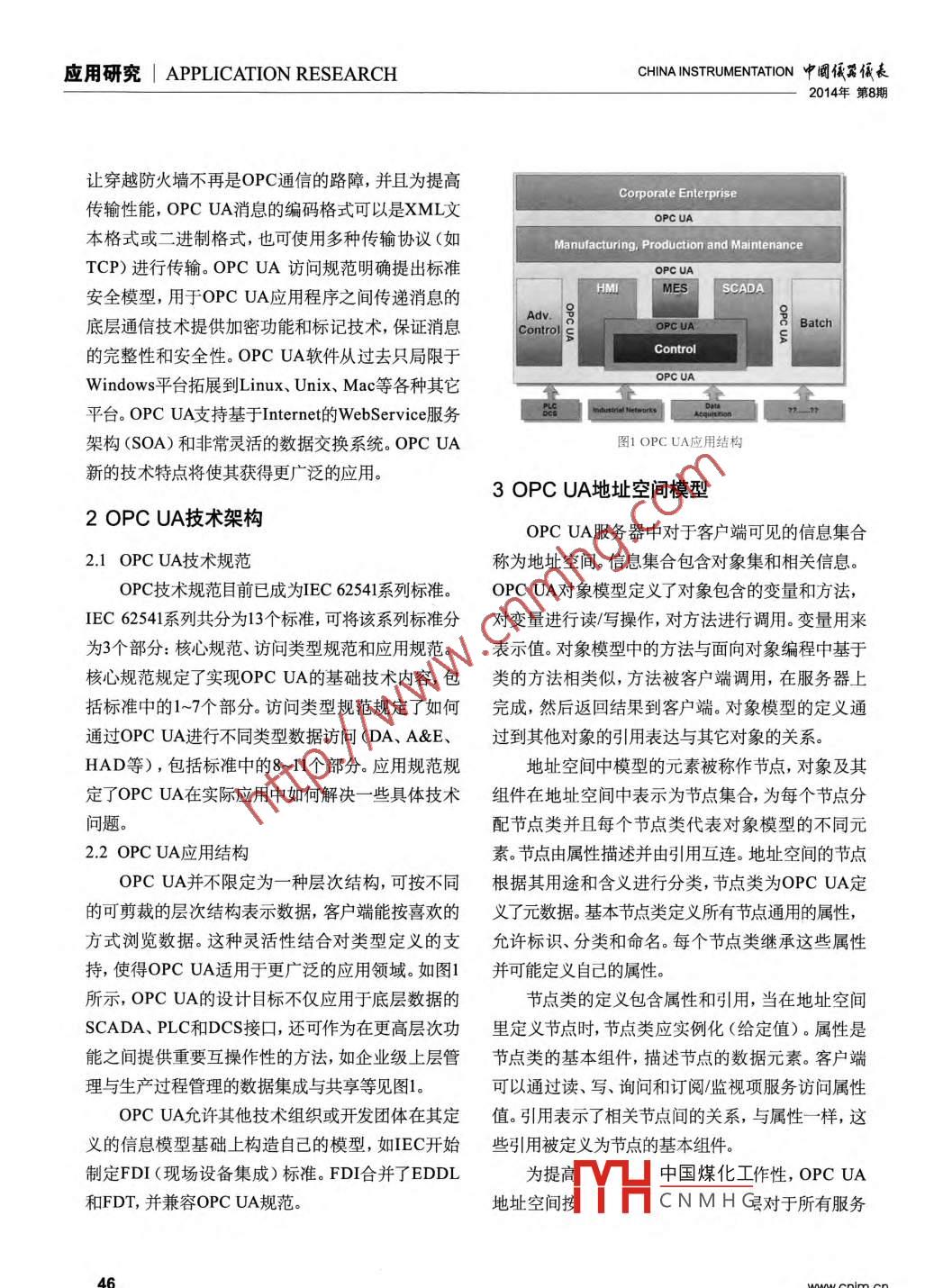 中國儀器依表CHINA INSTRUMENTATIONAPPLICATION RESEARCH|應(yīng)用研究2014年第8期OPC UA技術(shù)簡介Introduction of OPC UA Technology方曉時王麟琨(機(jī)械工業(yè)儀器儀表綜合技術(shù)經(jīng)濟(jì)研究所,1概述北京100055)目前工業(yè)控制系統(tǒng)使用技術(shù)的多樣性,為企業(yè)多層次的數(shù)據(jù)集成帶來很大問題。如:現(xiàn)場總線和摘.要:OPC UA技術(shù)的發(fā)展?fàn)顩r,闡述OPC UA技工業(yè)以太網(wǎng)總計有超過20種解決方案。因此需要一術(shù)的總體架構(gòu)、信息建模、服務(wù)及安全等關(guān)種能夠有效進(jìn)行數(shù)據(jù)訪問和管理的開放標(biāo)準(zhǔn),能夠鍵技術(shù)要素,并給出應(yīng)用展望。在工業(yè)控制計算環(huán)境中的各個數(shù)據(jù)源之間靈活進(jìn)關(guān)鍵詞: OPC UA COM/DCOM 地址空間行通信。.信息建模服務(wù)OPC (Object Linking and Embedding (OLE)for Process Control)是微軟公司的對象鏈接和嵌入Abstract: In this paper, current status of OPC技術(shù)在過程控制方面的應(yīng)用,被稱為控制系統(tǒng)“中UA technology is introduced, moreover some間件技術(shù)”,是專為在現(xiàn)場設(shè)備、自控應(yīng)用、企業(yè)key technical elements of OPC UA including管理應(yīng)用軟件之間實現(xiàn)系統(tǒng)無縫集成而設(shè)計的接architecture, information model, services and口規(guī)范。OPC自發(fā)布以來已廣泛應(yīng)用在工業(yè)控制系security of OPC UA are described and analyzed.統(tǒng)的信息集成,但由于對微軟COM/DCOM技術(shù)的Key words: OPC UA COM/DCOM依賴性,導(dǎo)致其在OPC的安全性、跨平臺性以及連Address space Information model通性方面都存在很多問題。如:很難通過Internet/ServicesIntranet,尤其是企業(yè)防火墻;難運行在非微軟系統(tǒng),也難以在嵌入式系統(tǒng)中實現(xiàn);很多上層應(yīng)用沒有OPC-COM接口,難以進(jìn)行遠(yuǎn)程調(diào)用等。鑒于此,OPC基金會發(fā)布了最新的數(shù)據(jù)通信統(tǒng)-方法一-OPC統(tǒng)- -架構(gòu)(OPC UA)。OPC UA有效地將現(xiàn)有的OPC規(guī)范(DA、A&E、HDA、命令、復(fù)雜數(shù)據(jù)和對象類型)集成進(jìn)來,并進(jìn)行擴(kuò)展。OPCUA提供-致、完整的地址空間和服務(wù)模型,解決過去同一-系統(tǒng)的中國煤化工方問的問題。項目編號:國家科技支撐計劃課題(2012BAB18B02)OPC UA規(guī)范YHCNMHG進(jìn)行通信。這www.cnim.cn4!