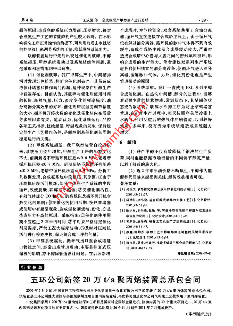第4期王成夏等合成氨聯(lián)產(chǎn)甲醇生產(chǎn) 運(yùn)行總結(jié)●27●化劑床層溫度以及調(diào)整各塔生產(chǎn)負(fù)荷。加熱器控制升溫速率( <30 C/h)。當(dāng)催化劑熱點(diǎn)(2)可根據(jù)雙塔催化劑的使用時(shí)間,及時(shí)調(diào)節(jié)溫度達(dá)到70 C后升溫速率降至<5 C/h。溫度達(dá)合成塔在串并聯(lián)生產(chǎn)中的位序;并可根據(jù)各塔催化到80C以后,因有少量反應(yīng)熱放出,應(yīng)放慢升溫速劑活性的強(qiáng)弱,及時(shí)提高催化劑床層的熱點(diǎn)溫度率,并試放水。此時(shí)操作上以催化劑床層溫差為主(≤5C/次),始終保持催化劑活性控制在最佳反要控制依據(jù),即床層頂部與底部溫差控制在8C之應(yīng)區(qū)域提高CO和CO2轉(zhuǎn)化率。內(nèi)。如果加電后溫度達(dá)到8 C,應(yīng)降電恒溫操作,(3)串聯(lián)使用時(shí),可適當(dāng)加大前塔新鮮氣的補(bǔ)當(dāng)恒溫到頂部與底部渴差又降至5 C以下時(shí),再加人量,可在滿足合成塔技術(shù)指標(biāo)的范圍以內(nèi)多開(kāi)循電進(jìn)行升溫。環(huán)機(jī),增加生產(chǎn)負(fù)荷,以產(chǎn)醇為主。后塔可以通過(guò)(2)還原初期。當(dāng)溫度達(dá)到90 C以后,應(yīng)重點(diǎn)少量補(bǔ)充新鮮氣氣量,不開(kāi)循環(huán)機(jī),以方便熱點(diǎn)操注意每次提溫后溫差的變化情況,只要能夠?qū)⒋呋鳛橹鳌Mㄟ^(guò)減少后塔生產(chǎn)負(fù)荷,達(dá)到控制醇后氣劑床層的頂部與底部溫差控制在8C以內(nèi),并經(jīng)過(guò)成分的目的,提高甲醇轉(zhuǎn)化率。操作中控制醇后氣恒溫后又縮小到5 C以下,可繼續(xù)提溫操作。在這一CO和CO2體積分?jǐn)?shù)在≤0.5%以下。若采用上述組時(shí)期操作上不宜以出水量的多少?zèng)Q定是否提溫,而應(yīng)合方法,醇后氣仍然超過(guò)標(biāo)準(zhǔn),則要考慮更換催化劑。以催化劑床層溫度的變化來(lái)判斷是否提溫或恒溫。(4)醇氨比的調(diào)整范圍大,可以根據(jù)產(chǎn)品市場(chǎng)(3)還原主期。當(dāng)溫度在105 ~ 130 C之間時(shí),情況任意調(diào)整醇氨比負(fù)荷。在甲醇市場(chǎng)利潤(rùn)較大應(yīng)重點(diǎn)關(guān)注催化劑床層頂部與底部的溫差以及系的情況下,可以采用并聯(lián)雙塔進(jìn)行生產(chǎn),雙塔各自統(tǒng)壓力、循環(huán)氫含量、水汽濃度和出水量的變化。配備循環(huán)機(jī),增加入塔循環(huán)氣體,使反應(yīng)不完全的由于均溫型合成塔及銅基催化劑的特性,決定了銅基催化劑在還原過(guò)程中將會(huì)產(chǎn)生出水量集中、出水氣體再次得到利用,提高甲醇產(chǎn)量。(5)雙塔工藝生產(chǎn)調(diào)整后,一塔更換催化劑,放熱量多的問(wèn)題。此時(shí)期是催化劑還原的關(guān)鍵時(shí)期,溫升速率應(yīng)控制在<2 C/h。如果加電提溫后另-塔仍可維持正常生產(chǎn)。(6)雙塔工藝生產(chǎn)的缺點(diǎn)是操作過(guò)程中雙塔進(jìn)行降電恒溫操作時(shí),溫度沒(méi)有按照前期溫度的運(yùn)溫度的操作相互制約,相互影響。行曲線的規(guī)律停止在預(yù)期的溫度上,而又有繼續(xù)上升的趨勢(shì),同時(shí)系統(tǒng)壓力下降、氫比降低,此時(shí)不管3催化劑升溫還原醇分能否放出還原水,都應(yīng)果斷及時(shí)地進(jìn)行大幅度撤電操作,利用降低電爐負(fù)荷、減少電爐發(fā)熱量來(lái)3.1 方案降低催化劑層的溫度。此時(shí)利用催化劑還原放出催化劑升溫還原方案見(jiàn)表2。的熱量來(lái)維持催化劑床層的熱量平衡,控制溫度進(jìn)表2催化劑升溫還原方案行恒溫出水操作,必要時(shí)可開(kāi)冷副線調(diào)節(jié)塔溫。時(shí)間催化劑升溫系統(tǒng)出水出塔水(4)還原后期。由于此階段大量出水期已過(guò),階段重展床層溫速率壓力速率汽濃度不會(huì)有溫度突然上升的情況發(fā)生,可繼續(xù)按照控制催際計(jì)度/C /心 ●h-' /MPa /hg.h- /g.m-3化劑床層溫差的辦法進(jìn)行操作。但應(yīng)注意, 160~升溫22室溫~70 305.0180 C附近仍有出水量稍大的現(xiàn)象。為了使還原完5 7 70-9050全徹底,底部溫度應(yīng)提升至235 9C恒溫,實(shí)際出水量還原初期7 14 90~105 22.5達(dá)到理論出水量的90%以上。當(dāng)頂部與底部溫差控中期25 39 105-13080制在6 ~8 C ,出水量低于10 kg/h,且水汽濃度小于后期27 66 130-235 53.00.1 g/m2時(shí),再恒溫1 h左右,確認(rèn)還原結(jié)束。恒溫2682310.5(5)換氣階段。換氣過(guò)程中因壓力提高較快、2 70 ~20氣體組分變化大,極易引起溫度失控,造成超溫垮注:空速為3 000 h-' ,氫含量體積分?jǐn)?shù)為70%。溫。因此,換氣過(guò)程必須緩慢而有準(zhǔn)備地進(jìn)行。當(dāng)3.2 過(guò)程出現(xiàn)溫度控制不住時(shí),則應(yīng)立即恢復(fù)原狀,待工況通過(guò)專用管線導(dǎo)人精煉氣,系統(tǒng)補(bǔ)壓至5.0穩(wěn)定后再進(jìn)行換氣。我廠在換氣時(shí),事先通知變換MPa,開(kāi)1臺(tái)4.7 m'/min和1臺(tái)5.0 m'/min循環(huán)工序降低CO含量至1.5%左右,經(jīng)前塔反應(yīng)后,醇后機(jī),循環(huán)量全部加足進(jìn)行升溫還原。整個(gè)過(guò)程可分氣CO含量低于0.8% ,該工況下?lián)Q氣操作較為順利。為升溫、還原恒溫和換氣4個(gè)階段。33 注意事項(xiàng).(1)升溫階段。此階段主要以升溫為主,由電(1)在還原主期發(fā)現(xiàn)熱點(diǎn)變化且同時(shí)有系統(tǒng)●28●化肥設(sh