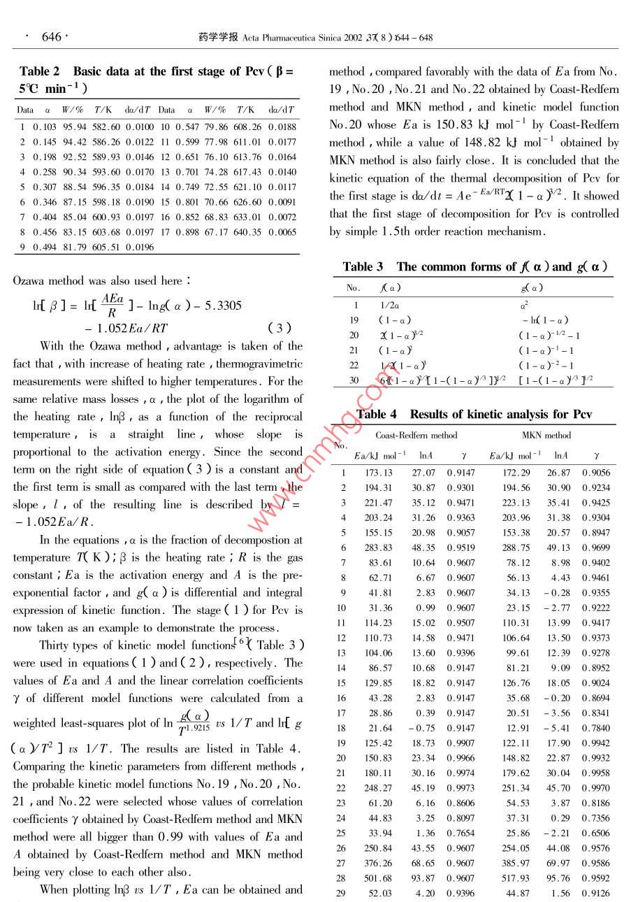 644●藥學學報Acta Pharmaceutica Sinica 2002 37 8)544 - 648STUDIES ON THE THERMAL DECOMPOSITION PROCESSAND KINETICS OF PURINE DRUGSZHANG Jian* , SHENG Rui-long , MAI Wen-peng( Cllge of Chemistry and Life Sciences , South-central Uniersity for Nationalities , Wuhan 430074 , China )ABSTRACT :AIM To study the thermal stability , decomposition process and kinetics of such purine pharmaceuticals asaciclovir( Acv ) , penciclovir( Pev ) , and their parent substance ,guanine. METHODS Using infrared technique , acceleratingtest method and thermogravimetry to investigate the thermal decomposition processes and using Coast- Redferm method , MKN methodand Ozawa method to deal with the data to get kinetic functions. RESULTS The decomposition process and the formned productswere derived , the kinetie model function was suggested by comparison of the kinetic parameters. CONCLUSION Pev and Aev' s .degrading product for the first step is guanine. The sequences of their thermal stabilities is : Pev> Acv'The two dnugs' kineticequation of themal decomposition is expressed as :da/dt= Ae~ E( 1-a)2KEY WORDS : aciclovir ; penciclovir ; guanine ; accelerating test ; thermal stability ; thermogravimetry ; non-isothermalkineticsCLC number : R912Document code :AArticle ID :0513 - 48702002 )08- 0644 - 05Purine drugs are a kind of low toxicity ,highlyElmer Co. ,USA ), used under the following conditions :effective antivirus pharmaceuticals. It has inhibition effectsample mass : 3.00 mg ; atmosphere : static air ; heatingon the duplication of DNA in virus such as HIV-1 , HIV-rate:2.5 ,4 ,5 ,8,10 and 15C min-' ; temperature2 , VZV[12]. Acyclovir( Aev ) and penciclovir( Pev )arerange: 30 ~ 630C. Infrared spectrograph FT-IR Nexustwo important members in the family of purine drugs.470( America Nicolet ). All the thermogravimetric dataSome related research work has been reported. Thewere analysed on a PT-1II computer.capsuleof penciclovir was prepared and theMaterials Pev and Acv were obtained from Hubeibioequivalence was studied using HPLC with fluorescencePharmaceutical Industry Institute ( Wuhan ) , guanine wasmethoc 31. Acyelovir inhibition of induced hepes simplexpurchased from Sigma Co. Purity of all raw drugs wasvirus type 1 was investigatet 41 by temporal analysisbetter than 99.4% .method. SreisSI studied the effect of partide sizedistribution and excipients on the dissolution of acyclovirRESULTS AND DISCUSSIONSfrom gelatin capsules , tablets and powders .Thermal stabilities and thermal decomposition1 Thermal decomposition processes of Pev and Acvkinetics of purine drugs are the interesting problem insamplesindustrial applications , they are important in evaluatingThermogravimetric( TG ) curves of Pev and Acv areand periods of validity , and for controlling the quality inshown in Figure 1.the process of manufacture. In this paper ,the thermal100}decomposition process and kinetics of 3 typical raw80Acv一-PcvGuanincmaterials of purine drugs ,penciclovir ,acyclovir andguanine 3 were investigated by infrared spectrometry ,β =SK. min-'accelerating test and thermogravimetry .E 40-MATERIALS AND METHODS2(Instruments TGS-2 model thermobalance( Perkin-0b 0 200Temperaturv°C00500 600 市Received date : 2002-01-04.Fionure1藥學學報Acta Pharmaceutica Sinia 2002 37 8)644 - 648645●As shown in Figure 1 , the thermal decomposition( Figure 2).processes involved two weight-loss stages. For Pev , theAs shown in Figure 2 and Table 1 , the absorptiontemperature range of the first stage was 276.45 ~bands of remnants are almost the same as those of398. .209C with the mass loss being 39.21 % ( theoretical ,guanine. It could be infferred that the, side 。chain40.25% ); for Aev , the temperature range of the first-CH2CH( CH20H) of Pev and - CH20CH2CH2OHstage was 235.85 ~ 357.919C with the mass loss ofof Acv were lost in the process of heating. So the30.45% ( theoretical , 32.81 % ), the remainders of theprocesses of thermal decomposition was deduced in Figureirst stage decomposition were analyzed by R spectra 3.00b10012090f1108070寶970f608174050304000 3000 2000 10004000 30020010004000 30002000Wave number/cm-!Figure 2 Infrared spectra of remainder and guaninea. Remainder of Pev ib. Remainder of Acv ic. GuanineHCH,CH2CH(CH2OH)2NH+CO+HOPev°7五NNH2GuanineCH2OCH2CH2OHAcvFigure 3 The reaction formulations of the first stage of thermal decompositionFigure 1 shows that guanine was relatively stableWave number / cm-Samplewhen the temperature was below 400C and could not meltWIH2_ vaH__ Vc=0比-N 8c-H33182899I695I367I470because of the stability of the aromatic heterocyclicRemainder of Acv3328 2899 1695 1 385 1 471compound. With the bonds broken irregularly it degradedRemainder of Pev33382899169513851471and carbonized when the temperature was above 400C.Because the experiment was carried out in air , thermalCoats- Redferm method and MKN method were useddecomposition of Pev and Acv which was accompaniedhere. The equations are shown below :with thermal oxidation at the second stage was veryg(a)AREacomplicated.IrT2= lnβE- RT(1)2 Thermal decomposition kineticsAEaIn g51g15s=In+ 3.7721 - 1.9215lnEa .From the TG curve of Pev,the basic data( T,a,71.9βRda/dT ) for stage( 1 ) can be obtained as shown in Table0.12039 Ea(2)646 .藥學學報Acta Pharmaceutica Sinia 2002 37 8)644 - 648Table2 Basic data at the first stage of Pev( β=method,compared favorably with the data of Ea from No.5C min-1 )19 ,No.20 ,No.21 and No.22 obtained by Coast- RedfemData a W/% T/K da/dT Data a W/% T/K da/dTmethod and MKN method ,and kinetic model function1 0.103 95.94 582.60 0.0100 10 0.547 79.86 608.26 0.0188No.20 whose Ea is 150.83 kJ mol -1 by Coast-Redfermn.2 0.145 94.42 586.26 0.0122 11 0.599 77.98 611.01 0.0177method ,while a value of 148.82 kJ mol- 1 obtained by3 0.198 92.52 589.93 0.0146 12 0.651 76.10 613.76 0.0164MKN method is also fairly close. It is concluded that the4 0.258 90.34 593.60 0.0170 13 0.701 74.28 617.43 0.0140kinetic equation of the thermal deco