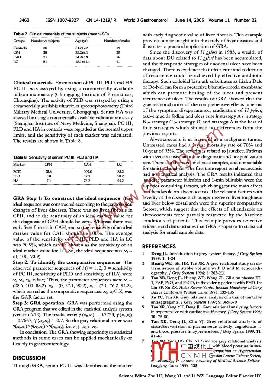 PO Box 2345, Beijing 00023, ChinaWorld JGastoenterol 205112):3457 3460www .wignet.comWorld Jourmal of Gastroenterology ISSN 1007-9327wjg@wignet.com◎2005 The WJG Press and Elsevier Inc. All rights reserved.ELSEVIER●BRIEF REPORIS●Applications of gray relational analysis in gastroenterologyXue-Rui Tan, Yu-Guang Li, Ming-Zhe ChenXue-Rui Tan, Yu-Guang Li, First Affiliated Hospital of Shantouconsulting sequence, x;∈X(i= 1,2..... m, m≥2, as theUniversity MedicalCollege, Shantou 510041,Guangdong Province, Chinacomparative factors) be the comparative sequence, x andMing-Zhe Chen, Medical School of Tsinghua University, Beijingx; are named factor sequences. The x0(問(wèn)) and x(k) are the100083, ChinaSupported by the National Natural Science Foundation of China,values of xo and xat k point(k= 1,2.... 街n≥3). Thus,the formulae of gray relational coefficient Y(xo(k), x:(k))No. 30271158Correspondence to: Xue Rui Tan, MD, PhD, First Affiliatedand gray relational grade Y(xo,x) are the following:Hospital of Shantou University Medical College, Shantou 510041,Guangdong Province, China. tanxuenui@ vip.sina.comF(k)-x(kN+ζ maxmat.()-x(Q)and x1-中_2.()Telephone: +86-754-8552841 Fax: +86-754-861 1690Received: 2004-02-02 Accepted: 2004-02-21The gray relational order, based on the gray relationalgrade Y(xo,x) which represents the strength of relationshipbetween x0 and x, can be constructed. In the formula,min min|xo(k)-x,(k) and max max |xo(k)-x;(k)| are the absoluteAbstractvalues of the minimum and maximum from the differencesAIM: To introduce the basic methods of gray relational analysisbetween x(l) and xo(). x(k) and x0() are the values at(GRA) and to ilustrate its applications in gastroenterology.point k in the x and x the sequences without dimension.Here,ζ = 0.5.METHODS: With the essential formulae of GRA andDis-dimension method Let x=(x(1), 2).... x() beseveral typically practical examples, the procedure ofthe sequence with dimension. Thus,fx- * x,GRA was introduced. Examples were drawn from thegastroenterological studies. Thus the trait of GRA couldbe demonstrated.Consider parameter sequence x=(x(1),x(2), ... wherei=1, 2...N;RESULTS: The superiority of GRA in gastroenterological=(x()(10..();. .study was proved by the examples.陽(yáng)=(+(2--.(2);CONCLUSION: GRA can be applied mechanically or fexiblyYn =(+)*.x..);.x(k)- min y(k)in gastroenterology.Thus,fx- *X, f(x,(k))=max y(k)- min y(k)= x(k).x,(k)∈s(1).⑥2005 The WJG Press and Elsevier Inc. All rights reserved.Here, max y(k)= max x(k), min y(k)= min x(k),k∈K,K = 12.k...Key words: Gray relational analysis; GastroenterologyEvaluation matrix of GRA Suppose xay∈xo be a groupTan XR, uYG, Chen MZ. Applications of gray relational analysisof the consulting factors,j= 1, 2... e. Thus, there is thein gastroenterology. World J Gastroenterol 2005; 11(22):gtay relational matrix R about向and x; as the following:3457-3460http://www.wjgnet.com/1007-9327/11/3457.aspR(x)=y(x0x) r(x021x2) .. y(x。,x2) r(,x)[rex,xm) r(x02.xm) .. Yax,.xm)}rqe,xm)GRA model of clinical trial Let x;∈X, x:=(x<(1), x:(2),,INTRODUCTIONx(1) be the observing parameter sequences of group iGray relational analysis (GRA) was initiated by Professoror case;i=1, 2.... m m≥2, as the number of trial group orJu-I ong Deng, the famous scientist and founder of gray systemtrial case.theory, Huazhong University of Science and Technology'".Let x∈X, xo= (x0(1), x>()... x(m)) be the idealPrevious applications of GRA in medical researches wereparamostly in cardiology2n. In our viewpoint, it is very usefulx0 ar中國(guó)煤化工1, 2...n. n≥3, as the .to introduce GRA to gastroenterologists.numlIYHCNMH(uences. Hence, the grayrclati: 2eflcction of approachingthe ideal effects. Then, the formulae:MATERIALS AND METHODSr(axk)x()-min minx()- x(kX+ζ max mlka(k)- x0(x)Essential formulae of GRALet X be the gray relational factor set, x∈X be theare called GRA model of clinical trial.3458ISSN 1007-9327CN 14-1219/ RWorld J GastroenterolJune 14, 2005 Volume 11 Number 22Table 1 Baseline values in four patients before treatmentAfyr)Course of jaundiceToughness degreeLiver below costalL iver belowSplenomegaly(mo) (x)of liver (x)arch (cm) (x)xiphoid (cm) (x)P (cm)(2)585.0304320270.7481Table 2 Hepatic functions in four patients before and after albendazole treatment(u BirtinOne muinute bingbinALPGU)GOTA/G&(L)No.(K)BeforeAfter89211.32.1176.628.430.045.5/37544.2/27.5602898.0558.0510.76.03041.0/56.045.1/33.9620923.4481.0280/54.048.0/36.02129129.2194630470.135.033.0/45.0 .45 0/227.0Examplesrx7,網(wǎng)) Yx8,x) Y(x9,x) Y(x10,x) YXx11,網(wǎng))GRA on small sample data backgtound The objectiveY(x0x) -0.83086 0.84450 0.68009 0.59362 0.68935 70.72768Y(x0,x2)| 0.65564 0.63919 0.58232 0.57313 0.56608 0.60327of this study was to evaluate the relationship between the20x3)| 0.82607 0.82195 0.68418 0.56399 0.75575 0.73039baseline condition of patients with alveococcosis and theR(0x= r(r0,x0)| 0.75198 0.78167 0.75162 0.49046 0.77538 0.71112therapeutic effects by using albendazole regularly. FourY(x0,x)| 0.66376 0.67106 0.64311 0.58631 0.52690|0.61823patients with complete data who were diagnosed clinicallyr(x0x6) L -0.65423 0.65564 0.62717 0.59336 0.76081 - 0.658240.73042 0.73567 0.66217 0.56681 0.67905and complicated by obstructive jaundice were entrolled inthis study. Albendazole was orally given twicc daily for overThe GRA results revealed in the gray relational factor1 year with a dosage of 20 mg/kg each day in all cases.set that the superior consulting factors were對(duì)and雞theBaseline values of the observation parameters are shownsuperior comparative factors were x1, x and X4.in Table 1. The effects of albendazole on hepatic functionsare shown in Table 2.Analysis Step 1: To calculate the improved ratio of hepaticGRA for four therapeutic strategies of duodenal ulcer relatedto Helicobacter pylorifunctions.The improved ratio was calculated by using theformula:|a-bBackgtound The purpose of this pro