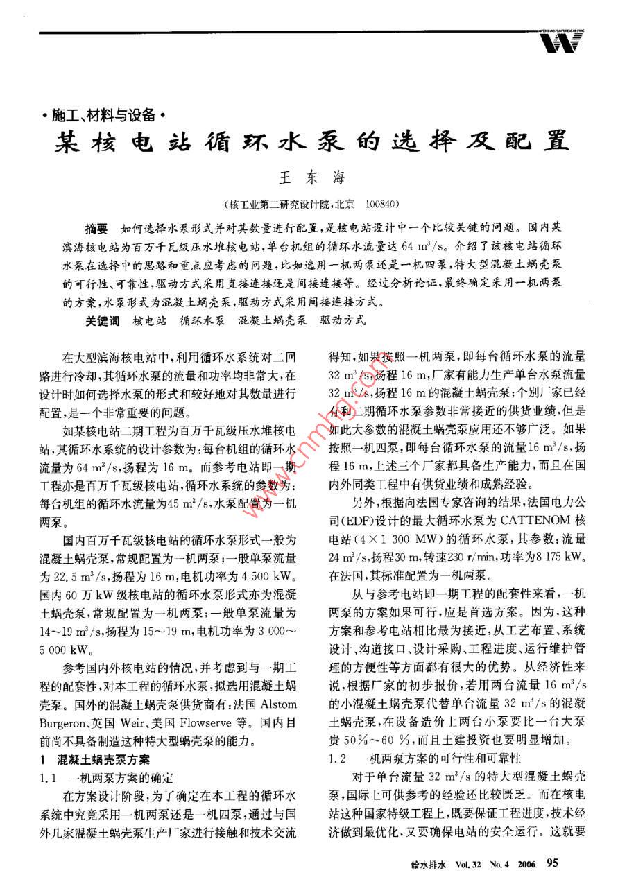 施工、材料與設(shè)備·某核電站循環(huán)水泵的選擇及配置王東海(核工業(yè)第二研究設(shè)計院,北京00840)摘要如何選擇水泵形式并對其數(shù)量進行配置,是核電站設(shè)計中一個比較關(guān)鍵的問題。國內(nèi)某濱海核電站為百萬千瓦級壓水堆核電站,單臺機組的循環(huán)水流量達64m/s。介紹了該核電站循環(huán)水泵在選擇中的思路和重點應(yīng)考慮的問題,比如選用一機兩泵還是一機四泵,特大型混凝土蝸殼泵的可行性、可靠性,驅(qū)動方式采用直接連接還是間接連接等。經(jīng)過分析論證,最終確定采用一機兩泵的方案,水泵形式為混凝土蝸殼泵,驅(qū)動方式采用間接連接方式。關(guān)鍵詞核電站循環(huán)水泵混凝土蝸殼泵驅(qū)動方式在大型濱海核電站中,利用循環(huán)水系統(tǒng)對二回得知如果按照一機兩泵,即每臺循環(huán)水泵的流量路進行冷卻,其循環(huán)水泵的流量和功率均非常大,在32m3/s,揚程16m,廠家有能力生產(chǎn)單臺水泵流量設(shè)計時如何選擇水泵的形式和較好地對其數(shù)量進行32m3s,揚程16m的混凝土蝸殼泵;個別廠家已經(jīng)配置,是一個非常重要的問題有和二期循環(huán)水泵參數(shù)非常接近的供貨業(yè)績,但是如某核電站二期工程為百萬千瓦級壓水堆核電如此大參數(shù)的混凝土蝸殼泵應(yīng)用還不夠廣泛。如果站,其循環(huán)水系統(tǒng)的設(shè)計參數(shù)為:每臺機組的循環(huán)水按照一機四泵即每臺循環(huán)水泵的流量16m3/s,揚流量為64m3/s,揚程為16m。而參考電站即一期程16m,上述三個廠家都具備生產(chǎn)能力,而且在國T程亦是百萬千瓦級核電站,循環(huán)水系統(tǒng)的參數(shù)為:內(nèi)外同類丁程中有供貨業(yè)績和成熟經(jīng)驗。每臺機組的循環(huán)水流量為45m3/s,水泵配置為一機另外,根據(jù)向法國專家咨詢的結(jié)果,法國電力公兩泵司(EDF)設(shè)計的最大循環(huán)水泵為 CATTENOM核國內(nèi)百萬千瓦級核電站的循環(huán)水泵形式一般為電站(4×130MW)的循環(huán)水泵,其參數(shù):流量混凝土蝸殼泵,常規(guī)配置為一機兩泵;一般單泵流量24m2/s揚程30m,轉(zhuǎn)速230r/mn,功率為8175kW為22.5m3/s,揚程為16m,電機功率為4500kW。在法國,其標準配置為一機兩泵。國內(nèi)60萬kW級核電站的循環(huán)水泵形式亦為混凝從與參考電站即一期工程的配套性來看,一機土蝸殼泵,常規(guī)配置為一機兩泵;一般單泵流量為兩泵的方案如果可行,應(yīng)是首選方案。因為,這種14-~19m3/s,揚程為15~19m,電機功率為3000~方案和參考電站相比最為接近,從工藝布置、系統(tǒng)5000kW。設(shè)計、溝道接口、設(shè)計采購、工程進度、運行維護管參考國內(nèi)外核電站的情況,并考慮到與一期工理的方便性等方面都有很大的優(yōu)勢。從經(jīng)濟性來程的配套性,對本工程的循環(huán)水泵,擬選用混凝土蝸說根據(jù)廠家的初步報價,若用兩臺流量16m3/s殼泵。國外的混凝土蝸殼泵供貨商有:法國Asom的小混凝土蝸殼泵代替單臺流量32m2/s的混凝Burgeon、英國Weir、美國 Flowserve等。國內(nèi)目土蝸殼泵,在設(shè)備造價上兩臺小泵要比一臺大泵前尚不具備制造這種特大型蝸殼泵的能力貴50%~60%,而且土建投資也要明顯增加1混凝土蝸殼泵方案1.2機兩泵方案的可行性和可靠性1.1機兩泵方案的確定對于單臺流量32m3/s的特大型混凝土蝸殼在方案設(shè)計階段,為∫確定在本工程的循環(huán)水泵,國際上可供參考的經(jīng)驗還比較匱乏。而在核電系統(tǒng)中究竟采用一機兩泵還是一機四泵,通過與國站這種國家特級工程上,既要保證工程進度,技術(shù)經(jīng)外幾家混凝土蝸殼泵生產(chǎn)廠家進行接觸和技術(shù)交流濟做到最優(yōu)化,又要確保電站的安全運行。這就要給水排水V.32.4200695求我們必須從理論和實際生產(chǎn)能力上對其可行性和mm的軸。可靠性進行論證(3)功率。二期循環(huán)水泵的軸功率為5700kW1.2.1一期循環(huán)水泵參數(shù)國外的蝸殼泵廠曾生產(chǎn)過單臺功率達8000kW的單臺流量2248m3/s,揚程16m,轉(zhuǎn)速l614r/min電機。功率4000kW,效率91%。(4)業(yè)績方面。根據(jù)日前掌握的情況,法國廠家曾為韓國KNU核電站提供過的最大混凝土蝸殼=349泵參數(shù):流量為30.9m3/s,揚程為15.05m,功率式中n—比轉(zhuǎn)數(shù);5300kW,共4臺。該泵運轉(zhuǎn)18年來一直良好,幾Q流量,m3/s;乎沒有任何維修。與本工程的循環(huán)水泵參數(shù)非常接H—揚程,m;近n——轉(zhuǎn)速,r/min。根據(jù)設(shè)計院的要求,蝸殼泵廠家提供了滿足本1.2.2二期循環(huán)水泵參數(shù)程設(shè)計參數(shù)的蝸殼泵性能曲線和水泵布置圖。本單臺流量32m3/s,揚程16m。通過調(diào)整水泵程循環(huán)水泵的性能曲線詳見圖1。根據(jù)水泵的性的轉(zhuǎn)速,使得一期和二期的循環(huán)水泵比轉(zhuǎn)數(shù)基本能曲線,在流量Q=32m3/s,揚程H=16m處,水致。從而使得二期和一期的循環(huán)水泵為相似泵。這泵軸功率P=5700kW,效率n=90%,汽蝕余量樣即可確定二期循環(huán)水泵的轉(zhuǎn)速為135r/minNFSH=6.4m。n=3.65nxQ2=3489000由丁一期和二期的水泵流量、轉(zhuǎn)速均已知,所以可利用水泵的流量相似定律,對一期的水泵進行放大,求出放大系數(shù)為1.194(代表葉輪直徑的比D2/600根據(jù)功率相似定律,二期循環(huán)水泵的功率P2=3000HP1×(D2/D1)5×(n2/m1)3=5700kW對于水泵效率,由于水