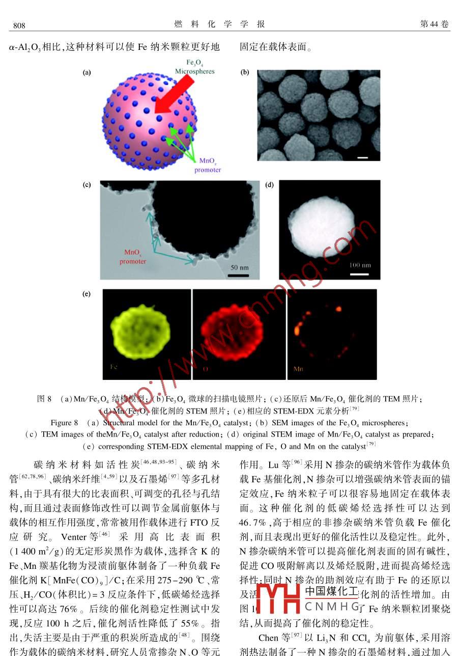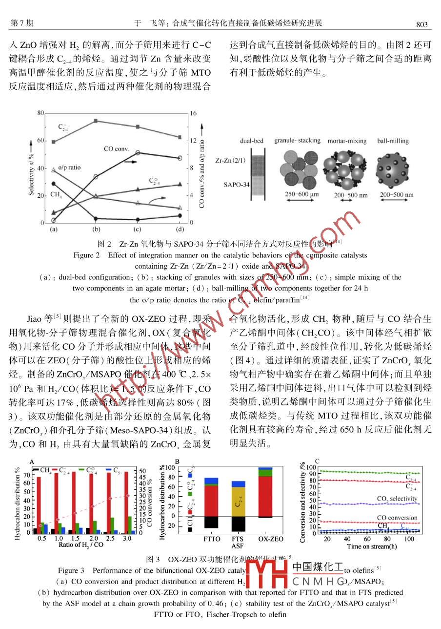 第44卷第7期燃料化學(xué)學(xué)報(bào)016年7月Journal of Fuel Chemistry and TechnologyJul.2016文章編號(hào):0253-2409(2016)070801合成氣催化轉(zhuǎn)化直接制備低碳烯烴研究進(jìn)展于飛32,李正甲2,安蕓蕾2,高鵬2,鐘良樞…“,孫予罕2(1.上海大學(xué)環(huán)境與化學(xué)工程學(xué)院,上海2004442.中國(guó)科學(xué)院上海高等研究院中國(guó)科學(xué)院低碳轉(zhuǎn)化科學(xué)與工程重點(diǎn)實(shí)驗(yàn)室,上海201210摘要:合成氣直接催化轉(zhuǎn)化制備低碳烯烴是CⅠ化學(xué)與化工領(lǐng)域中一個(gè)極具挑戰(zhàn)性的研究課題,具有流程短、能耗低等優(yōu)勢(shì),已成為非石油路徑生產(chǎn)烯烴的新途徑。直接轉(zhuǎn)化方式主要包括經(jīng)由OⅹZEO雙功能催化劑直接制低碳烯烴的雙功能催化路線以及經(jīng)由費(fèi)托反應(yīng)直接制備低碳烯烴的FIO路線。綜述簡(jiǎn)述了近年來(lái)在合成氣直接制備低碳烯烴方面的研究進(jìn)展重點(diǎn)討論了低碳烯烴的形成機(jī)理、新型催化劑的研發(fā)及助劑對(duì)其催化性能的影響,并對(duì)合成氣直接制烯烴的未來(lái)進(jìn)行了展望關(guān)鍵詞:低碳烯烴;合成氣;費(fèi)托反應(yīng);雙功能催化;反應(yīng)機(jī)理;納米催化中圖分類(lèi)號(hào):Q643,TQ519文獻(xiàn)標(biāo)識(shí)碼:AResearch progress in the direct conversion of syngas to lower olefinsYU Fei, LI Zheng-jia', AN Yun-lei, GAO Peng, ZHONG Liang-shu", SuN Yu-han(1. Environmental and Chemical Engineering College, Shanghai University, Shanghai 20042. CAS Key Laboratory of Low-Carbon Conversion Science and EngineeringShanghai Advanced Research Institute, Chinese Academy of Sciences, Shanghai 201210, China)Abstract: The direct conversion of syngas to lower olefins is one of the most challenging subjects in the field ofCl chemistry; it is considered as a new attractive route for producing lower olefins from non-petroleumresources, owing to its process simplicity and low energy consumption. Bifunctional catalysis using compositecatalysts such as OX-ZEO and Fischer-Tropsch to olefins( FTO reaction are two main pathways for the directconversion of syngas to lower olefins. In this paper, the recent research progress made in the direct conversion ofsyngas to lower olefins via these ways was reviewed. The catalysis mechanism for olefins formation, the designand development of novel catalysts, as well as the effect of various additives on the catalyst performance wereconsidered; lastly, an expectation outlook was given on the future trend for the direct conversion of syngas tolower olefinKey words: lower olefins; syngas; Fischer-Tropsch reaction; bifunctional catalysis; reaction mechanismnanometer catalysis低碳烯烴(乙烯、丙烯、丁烯)是重要的有機(jī)化對(duì)石油資源的依賴,世界各國(guó)的硏究主要以非石油工原料,其產(chǎn)業(yè)發(fā)展水平和市場(chǎng)供需平衡情況直接路線為主,即利用煤炭、天然氣、生物質(zhì)等含碳資源影響整個(gè)石化工業(yè)的發(fā)展水平和產(chǎn)業(yè)規(guī)模。隨著國(guó)通過(guò)合成氣直接或間接制備烯烴,路徑示意圖見(jiàn)圖民經(jīng)濟(jì)的快速增長(zhǎng),中國(guó)對(duì)低碳烯烴的需求急速增1。以合成氣制備得到的甲醇為原料,通過(guò)甲醇或長(zhǎng),低碳烯烴的生產(chǎn)硏發(fā)也受到了越來(lái)越多的關(guān)注。甲醚路線是發(fā)展非石油資源生產(chǎn)乙烯、丙烯等產(chǎn)品在傳統(tǒng)工業(yè)中,乙烯主要通過(guò)石腦油、石油氣和凝析的核心技術(shù)3。該技術(shù)包括兩個(gè)步驟,即合成氣經(jīng)油裂解得到。丙烯可從石腦油蒸汽裂解制乙烯銅基催化劑合成甲醇,甲醇再經(jīng)分子篩催化劑轉(zhuǎn)化副產(chǎn)物或流化催化裂化過(guò)程的裂化氣中得到。在蒸為低碳烯烴。如果能減少反應(yīng)步驟,將合成氣直接汽裂解工藝中,通過(guò)調(diào)整裂解深度可以改變丙烯和高選擇性合成低碳烯烴,將體現(xiàn)岀流程更短、能耗更乙烯的比例,輕度裂解可產(chǎn)生更多丙烯2。由于石低的優(yōu)勢(shì),有較強(qiáng)的競(jìng)爭(zhēng)力,未來(lái)發(fā)展前景更為良油資源的日益減少和Cl化學(xué)的迅速發(fā)展,為緩解好中國(guó)煤化立來(lái)合成氣催化轉(zhuǎn)化制Received. 2016-03-28: Revised: 2016-04-13CNMHGCorresponding author.Tel:+864021-20608002,+86021-20325009;Fax:+86021-20325034,+86-021-20325039E-mail:zhongls@sari.ac.cn,sunyh(@sari.accnThe project was supported by the National Natural Science Foundation of China(21403278, 21573271, 91545112)and Shanghai Municipal Scienceand Technology Commission, China( 15DZ1170500)國(guó)家自然科學(xué)基金(21403278,21573271,91545112)和上海市科委項(xiàng)目(15DZ1170500)資助802燃料化學(xué)學(xué)報(bào)第44卷備低碳烯烴(尤其是費(fèi)托反應(yīng)路線直接制備低碳烯率可以達(dá)到70%。烴)的相關(guān)進(jìn)展進(jìn)行簡(jiǎn)要的評(píng)述。2合成氣直接制備低碳烯烴OX- ZEO2.1雙功能催化路線catalysis盡管MTO過(guò)程具有較髙的低碳烯烴選擇性及methanol轉(zhuǎn)化率,但需先將合成氣轉(zhuǎn)化為甲醇,再經(jīng)由分子篩十2一催化得到低碳烯烴,其兩步法工業(yè)化成本較高,經(jīng)濟(jì)效益較低??茖W(xué)家們一直致力于制備含兩種組元的雙功能催化劑,試圖將上述兩個(gè)步驟耦合在一起,合COMTO并為一步法,這樣可以簡(jiǎn)化工業(yè)過(guò)程。該類(lèi)雙功能Fischer-Tropsch復(fù)合催化劑中的一種組分用于活化CO并將其轉(zhuǎn)化to olef