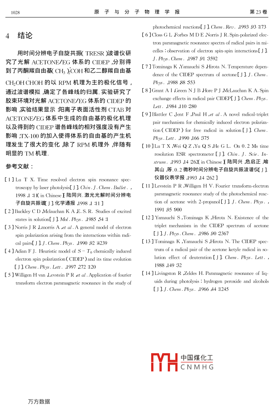 第23卷第6期原子與分子物理學(xué)報(bào)2006年12月JOURNAL OF ATOMIC AND MOLECULAR PHYSICSDeC.2006文章編號(hào):1000364200606-1025-04光解丙酮/乙二醇體系的 CIDEP實(shí)驗(yàn)研究朱光來(lái)”許新勝洪新季學(xué)韓崔執(zhí)鳳陸同興安徽師范大學(xué)物理系原子與分子物理實(shí)驗(yàn)室蕪湖241000摘要:紫外激光照射下用時(shí)間分辨電子自旋共振( TRESR)波譜儀研究了光解 ACETONE/EG體系的化學(xué)誘導(dǎo)動(dòng)態(tài)電子極做 CIDEP)得到了丙酮羰自由基CH3)COH和乙二醇羰自由基CH2 OH CHOH的發(fā)射/吸收E/A型極化信號(hào)這是一個(gè)RPM極化過(guò)程.在膠束環(huán)境中不同表面活性劑以及不同的濃度對(duì)體系極化的影響是不同的陽(yáng)離子表面活性劑CIAB對(duì)體系中生成的自由基的極化機(jī)理沒(méi)有產(chǎn)生顯著影響而加入體系中TX-100的濃度對(duì)體系的極化機(jī)理卻產(chǎn)生了很大的影響在 ACETONE/EG體系中隨著TX-100濃度的增加,TM機(jī)理對(duì)極化強(qiáng)度的貢獻(xiàn)明顯增大關(guān)鍵詞北化學(xué)誘導(dǎo)動(dòng)態(tài)電孑自旋極化自由基對(duì)機(jī)理丙酮膠束中圖分類號(hào):O56文獻(xiàn)標(biāo)識(shí)碼An experimental investigation on the Cidep of acetone/EG systemZHU Guang-lai, XU Xin-sheng, HONG Xin JI Xue-han CUI Zhi-feng, LU Tong-xingLaboratory of Atomic and Molecular Physics Anhui Normal University Wuhu 241000PR ChinaAbstract: When the acetone/EG system was photolyzed, the E/A pattern CIDEP spectrum of( CH3 )COHand CH,OH CHOH generated from RPM were obtained experimentally with the time-resolved ESR spectrometer. In micellar microenvironment, different micellar and its concentration have different influence onCIDEP. With the addition of Ctab to sample solution the polarization mechanism and the signal intensitywere the same as in homogenous solutions. When ACeToNE/ EG/TX-100 micellar solution was photolyzedthe tm accompanying the rPm appeared and the relative ratio of tm to RPM increased with the increasingof tx-100 concentrationKey words: CIDEP, RPM acetone micellar1引言Polarization( CIDEP)j-61對(duì)于光解瞬態(tài)自由基的 CIDEP,可以用時(shí)間分辨電子自旋共振瞬態(tài)自由基在兩自旋態(tài)之間粒子數(shù)的分布往( TRESR)波譜技術(shù)對(duì)其檢測(cè)往偏離 Boltzman分布從而導(dǎo)致了化學(xué)誘導(dǎo)動(dòng)態(tài)電子極化[ Chemically Induced Dynamic Electron定YH中國(guó)煤化了電子自旋極化強(qiáng)度P之差與兩自旋態(tài)的總CNMHG收稿日期20050803基金項(xiàng)目安徽省原子與分子物理重點(diǎn)學(xué)科基金作者簡(jiǎn)1972-)男講師主要研究方向?yàn)樵优c分子光譜通訊作者ai8818@163.com1026原子與分子物理學(xué)報(bào)第23卷布居數(shù)的比115 mjP(NB-Na)實(shí)驗(yàn)中輸入到樣品諧振腔的微波功率≤」mW約為4mW.在記錄 CIDEP的磁場(chǎng)譜時(shí)Box-式中N和N分別為上、下 Zeeman能級(jí)上的粒子ar平均器取樣門的門寬一般取為0.3~0.4ps根數(shù).P為正時(shí) CIDEP譜為吸收譜,P為負(fù)時(shí),據(jù)所需測(cè)量時(shí)刻的要求 Boxcar的取樣門相對(duì)于激CIDEP譜為發(fā)射譜光激發(fā)時(shí)刻的延時(shí)在0.4~2s范圍內(nèi)變化對(duì)激光光解丙酮自由基的研究文獻(xiàn)主要報(bào)道實(shí)驗(yàn)中所用的丙酮、乙二醇試劑均為分析純了丙酮/醇類體系,特別是丙酮/異丙醇體系的所用表面活性劑為xTAB(+六烷基三甲基溴化究證實(shí)了在丙酮/異丙醇體系中產(chǎn)生的極化信號(hào)醚onX100(7X100,辛基苯基聚氧乙烯CIDEP研究791-13 Seigo yamauchi12等人研銨),T以S-T。態(tài)混合的RPM機(jī)理為主但在適當(dāng)?shù)臐舛群蜏囟认掳殡S有一定比例的TM機(jī)理的貢3實(shí)驗(yàn)結(jié)果與討論獻(xiàn). Keisuke tominaga研究小組7詳細(xì)研究了丙酮羰自由基CH3COH的極化信號(hào)與溫度的關(guān)系.3.1 ACETONE/EG體系他們研究從室溫到-90℃范圍內(nèi),S-TM總是純乙二醇或丙酮經(jīng)激光照射沒(méi)有ESR共振占主導(dǎo)地位但是在-45℃以下,TM和S-T信號(hào)產(chǎn)生.丙酮/乙二醇溶液經(jīng)激光照射,在285M對(duì)整體譜圖貢獻(xiàn)比例相對(duì)增加mm激光激發(fā)1.0s延時(shí)下的 CIDEP信號(hào)如圖1我們的工作以乙二醇為溶劑還以12丙二所示與文獻(xiàn)712等對(duì)照,可以看到譜圖中除了醇為溶劑進(jìn)行了研究將另文報(bào)道)分別得到了丙丙酮羰自由基(CH3)COH的信號(hào)外,在酮羰自由基(CH3)(OH和乙二醇羰自由基(CH3)(OH的兩個(gè)最強(qiáng)峰之間還有四條弱峰如CH2 OH CHOH的以RPM機(jī)理為主的極化信號(hào)圖1中興所示)根據(jù)它們的位置可知道他們應(yīng)該通過(guò)波譜模擬,確定了各峰線的歸屬.還實(shí)驗(yàn)硏究屬于乙二醇羰自由基 CH,OH CHOH; CH,OH CH了幾種膠束微環(huán)境對(duì) ACETONE/EG體系的OH的位于最外側(cè)的兩條峰分別與CH3)COH的CIDEP譜的影響M=±1的兩峰重合.由于掃場(chǎng)范圍的限制,丙酮羰自由基CH3COH位于兩側(cè)的M=±3的兩條2實(shí)驗(yàn)超精細(xì)弱峰沒(méi)有記錄下來(lái)如圖1a)廝所示.另外整個(gè)譜圖呈現(xiàn)E/A極化模式,可見(jiàn)光解ACE實(shí)驗(yàn)中所用的 TR-ESR波譜儀是本研究小組ONE/EG體系是RPM極化過(guò)程自行研制的其詳細(xì)情況在文獻(xiàn)10]已作報(bào)道這里作簡(jiǎn)單介紹如下:微波源采用K-129反射速調(diào)管微波頻率約為9400MHLz微波系統(tǒng)采用平(a)衡反射橋式電路和零差拍平衡混頻方式無(wú)