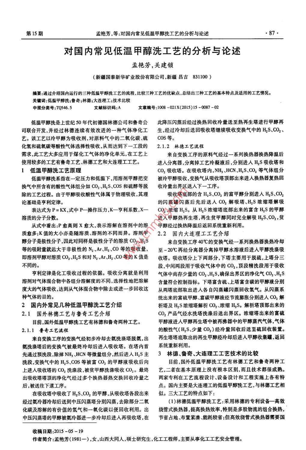 第15期孟艷芳,等:對國內(nèi)常見低溫甲醇洗工藝的分析與論述對國內(nèi)常見低溫甲醇洗工藝的分析與論述孟艷芳,關(guān)建鎖(新疆國泰新華礦業(yè)股份有限公司,新疆昌吉831100摘要:通過介紹國內(nèi)運(yùn)行的三種低溫甲醇洗工藝的流程,比較三種工藝的優(yōu)缺點(diǎn),總結(jié)出三種工藝的基本特點(diǎn)及適用的工藝情況。關(guān)鍵詞:低溫甲醇洗;魯奇;林德;大連理工;技術(shù)比較中圖分類號:TQ546.5文獻(xiàn)標(biāo)識碼:A文章編號:1008-021X(2015)15-0087-02低溫甲醇洗是上世紀(jì)50年代初德國林德公司和魯奇公此降壓閃蒸后經(jīng)過換熱回收冷量送至熱再生塔進(jìn)行甲醇再司聯(lián)合開發(fā),并經(jīng)過林德連續(xù)有效改進(jìn)的一種氣體凈化工生,經(jīng)過冷卻后送回吸收塔繼續(xù)吸收變換氣中的H2S、CO2、藝。該工藝以冷甲醇為吸收劑,對原料氣中的二氧化碳、硫C0S等。化氫和硫氧碳等酸性氣體選擇性吸收,從而達(dá)到下一工段的2.1.2林德工藝流程需求,此工藝大多應(yīng)用于煤化工氣體的凈化單元,在工藝上來自變換工序的原料氣經(jīng)過一系列換熱器換熱降溫后使用較多的工藝有魯奇工藝林德工藝和大連理工工藝。進(jìn)入分離器,分離掉工藝?yán)淠汉?分別進(jìn)入H2S吸收塔和低溫甲醇洗工藝原理CO2吸收塔。在吸收塔內(nèi),NH3HCN、H2S、CO2等氣體組分低溫甲醇洗系指在一定壓力和低溫下,用溶劑甲醇把變被冷甲醇吸收,變換氣從吸收塔頂部出來進(jìn)人換熱器復(fù)熱回?fù)Q氣中所含有的酸性氣體組分如CO2、H2S、COS和硫醇等脫收冷量出界區(qū)送入下一工序。除的工藝過程。由于甲醇吸收酸性氣體屬于物理吸收,其理吸收塔底部的含H2SCO2的富甲醇分別進(jìn)入H2S、CO2論基礎(chǔ)是亨利定律。的閃蒸罐閃蒸后先后送入CO2解吸塔、H2S濃縮塔解吸表達(dá)式為P=KX,式中P一操作壓力K一享利系數(shù),XCO2濃縮H2S。從H2S濃縮塔底部出來的富含H2S的甲醇溶質(zhì)的分子分?jǐn)?shù)進(jìn)入甲醇熱再生塔,再生貧甲醇同時(shí)完全解吸H2S、CO2,貧從式中看出P愈高則X愈大,表示溶解在溶劑中的溶甲醇經(jīng)過換熱降溫后返回系統(tǒng)重新利用。質(zhì)意多;K值的大小亦是隨溶質(zhì)、溶劑的不同而異。溶劑甲2.2國內(nèi)大連理工工藝介紹醇分子是極性分子,因此對同樣是極性分子的溶質(zhì)CO2H2S來自變換工序40℃的變換氣經(jīng)一系列換熱器換熱冷卻等的吸附量就遠(yuǎn)大于非極性的N2、Ar、H2、CO等的吸收量,至-20℃再經(jīng)分離器分離掉甲醇水溶液后進(jìn)入甲醇洗滌吸即溶劑甲醇對溶質(zhì)CO2H2S和對N2、Ar、H2、CO等的K值是收塔。吸收塔分上下兩部分,下塔主要用于脫硫,上塔分三不同的。段,中間兩段用于吸收氣體中的CO2,頂段精洗段用于吸收亨利定律是化工吸收過程的依據(jù)。吸收分離就是利用體中尚存少量的CO2、H1,確保出界區(qū)的凈化氣CO2、H1S溶劑對氣體混合物中各組分溶解度的不同,選擇性地把溶解含量符合控制指標(biāo)。下塔富含硫、上塔富含碳的甲醇液分別度大的氣體吸收達(dá)到從氣體混合物中除去或進(jìn)一步回收這從兩塔底部取出進(jìn)入各自閃蒸罐閃蒸回收氫氣。從閃蒸系種氣體的目的。統(tǒng)出來的富硫甲醇富碳甲醇液經(jīng)節(jié)流膨脹分別進(jìn)人CO2解2國內(nèi)外常見幾種低溫甲醇洗工藝介紹析塔及H2S濃縮塔解析CO2、濃縮H2S。解析塔頂部出來的2.1國外林德工藝與魯奇工藝介紹CO2產(chǎn)品氣經(jīng)水洗塔洗滌后送出界區(qū)。濃縮塔出來的富硫目前國外低溫甲醇洗工藝有林德和魯奇兩種工藝甲醇液進(jìn)人甲醇再生塔中被再沸器中的甲醇蒸汽氣體氣體1.1魯奇工藝流程的酸性氣(H2S、少量CO2)經(jīng)冷量回收后送至硫回收裝置。來自變換工序的變換氣經(jīng)初步冷卻去氨洗滌塔脫氨,出再生塔塔底取出的再生甲醇經(jīng)冷卻后進(jìn)入甲醇收集縷,返回氨洗滌塔后的變換氣被最終冷卻后進(jìn)入吸收塔。在塔內(nèi)首系統(tǒng)重新利用。先通過預(yù)洗段,除掉NH、HCN等微量組分然后進(jìn)人H2S主3林德、魯奇、大連理工工藝技術(shù)的比較洗段變換氣中的H2S、COS等被富CO2的甲醇液吸收后向目前,國外低溫甲醇洗工藝有林德工藝和魯奇兩種工上進(jìn)入吸收塔的CO2洗滌段被貧甲醇洗滌吸收CO2。最終藝,二者在基本原理上沒有根本區(qū)別而且技術(shù)都很成熟出吸收塔塔頂?shù)膬艋瘹饨?jīng)過多個(gè)換熱器熱交換回收冷量之兩家專利在工藝流程設(shè)計(jì)、設(shè)備設(shè)計(jì)和工程實(shí)施上各有特后,被送往下道工序。點(diǎn)。國內(nèi)主要是大連理工的低溫甲醇洗工藝,與林德工藝相在吸收塔中吸收了H2SCO2的甲醇,從吸收塔各段出來似。三大工藝的特點(diǎn)如下經(jīng)過氨冷器冷卻后送到中壓閃蒸塔分別閃蒸,去除部分二氧(1)林德低溫甲醇洗工藝:采用林德的專利設(shè)備一高效化碳及溶解的有價(jià)值的氫氣和一氧化碳以便回收利用。出繞管式換熱器提高換熱效率特別是多股物流的組合換熱,中壓閃蒸塔的甲醇被氨冷器進(jìn)一步冷卻后進(jìn)入再吸收塔,在節(jié)省占地、布置緊湊能耗較省;但高效繞管式換熱器需要國收稿日期:2015-05-19作者簡介:孟艷芳(1981-),女,山西大同人,碩士研究生,化工工程師,主要從事化工工藝安全管理。山東化工SHANDONG CHEMICAL INDUSTR