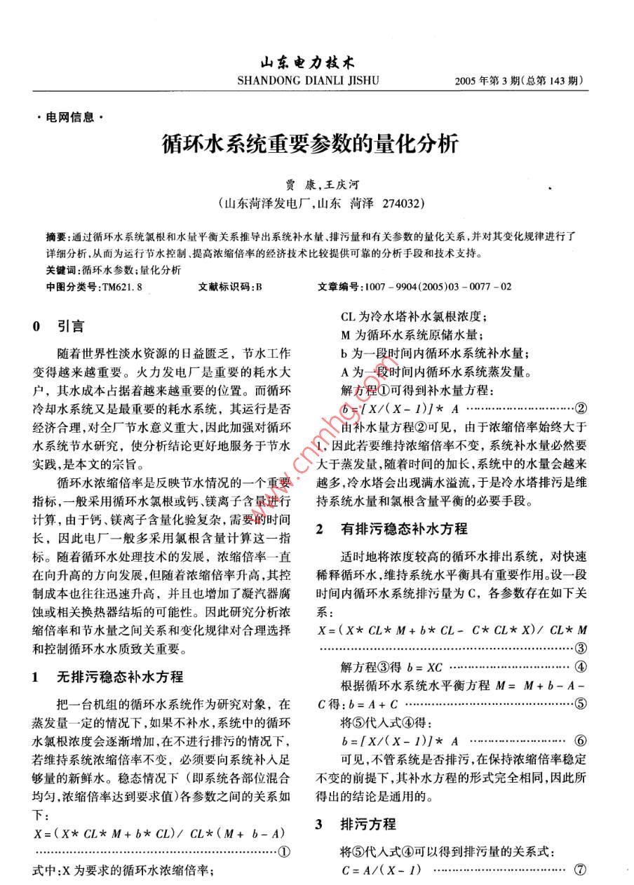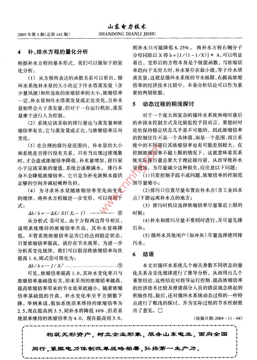 山東電力技術(shù)SHANDONG DIANLI JISHU2005年第3期(總第143期)●電網(wǎng)信息●循環(huán)水系統(tǒng)重要參數(shù)的量化分析賈康,王慶河(山東菏澤發(fā)電廠,山東菏澤274032)摘要:通過循環(huán)水系統(tǒng)氯根和水量平衡關(guān)系推導(dǎo)出系統(tǒng)補(bǔ)水量、排污量和有關(guān)參數(shù)的量化關(guān)系,并對(duì)其變化規(guī)律進(jìn)行了詳細(xì)分析,從而為運(yùn)行節(jié)水控制、提高濃縮倍率的經(jīng)濟(jì)技術(shù)比較提供可靠的分析手段和技術(shù)支持。關(guān)鍵詞:循環(huán)水參數(shù);量化分析中圖分類號(hào):TM621.8文獻(xiàn)標(biāo)識(shí)碼:B文章編號(hào):1007 - 9904(2005)03 - 0077 - 02CL為冷水塔補(bǔ)水氯根濃度;0引言M為循環(huán)水系統(tǒng)原儲(chǔ)水量;隨著世界性淡水資源的日益匱乏,節(jié)水工作b為一段時(shí)間內(nèi)循環(huán)水系統(tǒng)補(bǔ)水量; :變得越來越重要?;鹆Πl(fā)電廠是重要的耗水大A為一段時(shí)間內(nèi)循環(huán)水系統(tǒng)蒸發(fā)量。戶,其水成本占據(jù)著越來越重要的位置。而循環(huán)解方程①可得到補(bǔ)水量方程:冷卻水系統(tǒng)又是最重要的耗水系統(tǒng),其運(yùn)行是否b=[X/(X- 1)]* A ...............經(jīng)濟(jì)合理,對(duì)全廠節(jié)水意義重大,因此加強(qiáng)對(duì)循環(huán)由補(bǔ)水量方程②可見,由于濃縮倍率始終大于水系統(tǒng)節(jié)水研究,使分析結(jié)論更好地服務(wù)于節(jié)水1,因此若要維持濃縮倍率不變,系統(tǒng)補(bǔ)水量必然要實(shí)踐,是本文的宗旨。大于蒸發(fā)量,隨著時(shí)間的加長,系統(tǒng)中的水量會(huì)越來循環(huán)水濃縮倍率是反映節(jié)水情況的一一個(gè)重要越多,冷水塔會(huì)出現(xiàn)滿水溢流,于是冷水塔排污是維指標(biāo),一般采用循環(huán)水氯根或鈣鎂離子含量進(jìn)行持系統(tǒng)水量和氯根含量平衡的必要手段。計(jì)算,由于鈣、鎂離子含量化驗(yàn)復(fù)雜,需要的時(shí)間2有排污穩(wěn)態(tài)補(bǔ)水方程;長,因此電廠一般多采用氯根含量計(jì)算這一指標(biāo)。隨著循環(huán)水處理技術(shù)的發(fā)展,濃縮倍率-直適時(shí)地將濃度較高的循環(huán)水排出系統(tǒng),對(duì)快速在向升高的方向發(fā)展,但隨著濃縮倍率升高,其控稀釋循環(huán)水,維持系統(tǒng)水平衡具有重要作用。設(shè)一-段制成本也往往迅速升高,并且也增加了凝汽器腐時(shí)間內(nèi)循環(huán)水系統(tǒng)排污量為C,各參數(shù)存在如下關(guān)蝕或相關(guān)換熱器結(jié)垢的可能性。因此研究分析濃系:縮倍率和節(jié)水量之間關(guān)系和變化規(guī)律對(duì)合理選擇X=(x*CL*M+b*CL-C*CL*X)/CL*M.和控制循環(huán)水水質(zhì)致關(guān)重要。③解方程③得b= XC ....1無 排污穩(wěn)態(tài)補(bǔ)水方程根據(jù)循環(huán)水系統(tǒng)水平衡方程M= M+b-A-把一臺(tái)機(jī)組的循環(huán)水系統(tǒng)作為研究對(duì)象,在C得:b=A+ C ......................蒸發(fā)量一定的情況下,如果不補(bǔ)水,系統(tǒng)中的循環(huán)將⑤代人式④得:水氯根濃度會(huì)逐漸增加,在不進(jìn)行排污的情況下,b=[X/(x- 1)]* A .............. ⑥若維持系統(tǒng)濃縮倍率不變,必須要向系統(tǒng)補(bǔ)人足可見,不管系統(tǒng)是否排污,在保持濃縮倍率穩(wěn)定夠量的新鮮水。穩(wěn)態(tài)情況下(即系統(tǒng)各部位混合不變的前提下,其補(bǔ)水方程的形式完全相同,因此所均均,濃縮倍率達(dá)到要求值)各參數(shù)之間的關(guān)系如得出的結(jié)論是通用的。下:X=(X* CL* M+ b* CL)/ CL*(M+ b-A)3排污方程將⑤代入式④可以得到排污量的關(guān)系式:式中:X為要求的循環(huán)水濃縮倍率;C= A/(X- 1) ................... ⑦山東電力技術(shù)2005年第3期(總第143期)SHANDONG DIANLI JISHU則補(bǔ)水只可能降低6.25%。將補(bǔ)水方程右側(cè)分子4補(bǔ)、排水方程的量化分析分母同除以X得b=[1/(1-1/x)]* A,可以明顯根據(jù)補(bǔ)水方程的基本形式,我們可以做如下的量看出,變形后的方程本身是個(gè)極值函數(shù),當(dāng)濃縮倍化分析。率趨向于無窮大時(shí),補(bǔ)水量存在最小值,等于冷水塔(1)從方程所表達(dá)的函數(shù)關(guān)系可以看出,循蒸發(fā)量,這就是循環(huán)水系統(tǒng)的節(jié)水極限。在提高濃縮環(huán)水系統(tǒng)補(bǔ)水量的大小決定于冷水塔蒸發(fā)量(含倍率的經(jīng)濟(jì)技術(shù)比較中,本條分析結(jié)論可以作為重少量風(fēng)損)和所選取的濃縮倍率的大小,濃縮倍率要的判別依據(jù)。一定, 補(bǔ)水量和冷水塔蒸發(fā)量成正比變化,且補(bǔ)水5動(dòng)態(tài)過程的粗淺探討量始終會(huì)大于蒸發(fā)量,但對(duì)于一臺(tái)運(yùn)行機(jī)組,蒸發(fā)量難于進(jìn)行人為控制。.對(duì)于一個(gè)龐大而復(fù)雜的循環(huán)水系統(tǒng)和相對(duì)落后(2)系統(tǒng)應(yīng)該采取的排污量也與蒸發(fā)量和濃的補(bǔ)排水控制方式及化驗(yàn)監(jiān)控手段而言,要想時(shí)時(shí)縮倍率有關(guān),它與蒸發(fā)量成正比,與濃縮倍率反向處處保持穩(wěn)定狀態(tài)幾乎是不可能的,因此濃縮倍率變化。的控制往往不是一個(gè)具體值,而是-一個(gè)范圍,而且系(3)在合理的排污量范圍內(nèi),補(bǔ)水量的大小統(tǒng)中的不同部位其濃縮倍率也有可能差別較大。在和系統(tǒng)是否排污沒有關(