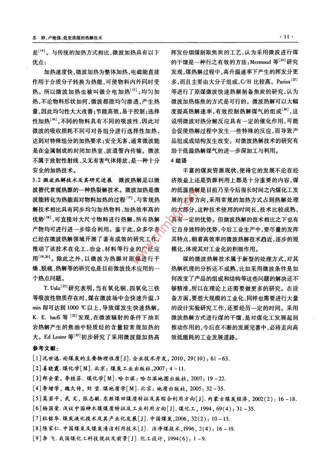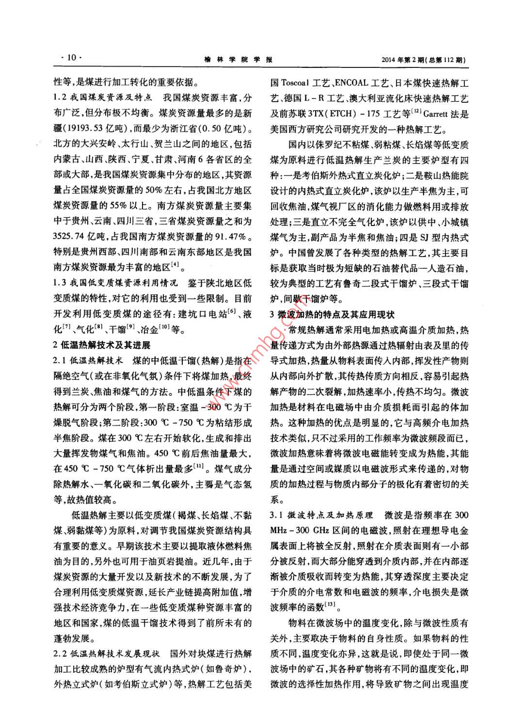 2014年3月榆林學(xué)院學(xué)報(bào)Mar.2014第24卷第2期JOURNAL OF YULIN UNIVERSITYVol 24 No. 2低變質(zhì)煤的熱解技術(shù)蘇婷,盧艷強(qiáng)榆林學(xué)院化學(xué)與化工學(xué)院,陜西榆林71900摘要:我國(guó)低變質(zhì)煤的儲(chǔ)量十分豐富,對(duì)其充分有效的利用可以極大的緩減當(dāng)前資源緊缺的現(xiàn)狀,同時(shí)也帶來較大的經(jīng)濟(jì)效益,而對(duì)低變質(zhì)煤進(jìn)行熱解處理是比較常用的方式。微波熱解技術(shù)是一種節(jié)能高效、加熱速率高、反應(yīng)速率快的新型煤炭轉(zhuǎn)化技術(shù),在煤、油頁(yè)巖及生物質(zhì)等綜合利用領(lǐng)域有著廣泛的前景。在對(duì)我國(guó)低變質(zhì)煤資源性質(zhì)、特點(diǎn)分析的基礎(chǔ)上,歸納總結(jié)了煤的低溫?zé)峤饧夹g(shù)及微波熱解技術(shù)的研究發(fā)展現(xiàn)狀和利用情況,研究了低變質(zhì)煤的熱解特性。關(guān)鍵詞:低變質(zhì)煤;低溫?zé)峤?微波熱解中圖分類號(hào):TQ530.2文獻(xiàn)標(biāo)志碼:A文章編號(hào):1008-3871(2014)02-0009-0中國(guó)是以煤炭為主要能源的大國(guó),占一次能源雜,歸納起來可分為有機(jī)質(zhì)和無機(jī)質(zhì)兩大類以有機(jī)消費(fèi)的70%以上,這一格局在中國(guó)未來能源和煤化質(zhì)為主體。煤中的有機(jī)質(zhì)主要由碳、氫、氧、氮和有工領(lǐng)域中將不會(huì)有大的改變。在以后很長(zhǎng)一段時(shí)期機(jī)硫等五種元素組成。其中,碳、氫、氧占有機(jī)質(zhì)的內(nèi),中國(guó)還必須走以煤炭為基礎(chǔ)能源的可持續(xù)發(fā)展95%以上,此外,還有極少量的磷和其他元素。煤中道路。我國(guó)低變質(zhì)煤資源占煤炭資源的60%以上,的無機(jī)質(zhì)主要是水分和礦物質(zhì),它們的存在降低了這類煤具有灰分低、硫分低、發(fā)熱量高、可選性好、煤煤的質(zhì)量和利用價(jià)值,其中絕大多數(shù)是煤中的有害質(zhì)優(yōu)良等特點(diǎn)因此,大力發(fā)展低變質(zhì)煤的潔凈轉(zhuǎn)化成分。另外,還有一些稀有、分散和放射性元素,例技術(shù)和綜合利用技術(shù),進(jìn)一步延伸產(chǎn)業(yè)鏈生產(chǎn)各種如,鍺、鎵、銦釷、釩、鈦、鈾等,它們分別以有機(jī)或無化工產(chǎn)品及油天然氣等能源對(duì)我國(guó)經(jīng)濟(jì)可持續(xù)發(fā)機(jī)化合物的形態(tài)存在于煤中。其中某些元素的含展具有重大戰(zhàn)略意義。量,一旦達(dá)到工業(yè)品位或可綜合利用時(shí),就是重要的1煤的概述礦產(chǎn)資源。1.1煤的性質(zhì)及分類煤是植物遺體經(jīng)過復(fù)雜的生煤的物理性質(zhì)是煤的一定化學(xué)組成和分子物化學(xué)、地球化學(xué)物理化學(xué)作用轉(zhuǎn)變而成的一種固結(jié)構(gòu)的外部表現(xiàn),是由成煤的原始物質(zhì)及其聚積條體可燃礦產(chǎn)。成煤大致可分為兩個(gè)階段。第一階段件轉(zhuǎn)化過程煤化程度和風(fēng)化、氧化程度等因素所是植物在泥炭沼澤中不斷繁衍,其遺體在微生物的決定的,主要包括顏色、光澤、粉色、比重和容重、硬參加下不斷分解、化合、聚集的過程。第二階段是煤度脆度、斷口及導(dǎo)電性等。其中,除了比重和導(dǎo)電化作用階段煤化過程是一個(gè)增碳化過程,即泥炭、性需要在實(shí)驗(yàn)室測(cè)定外,其他根據(jù)肉眼觀察就可以腐泥在以溫度和壓力起主導(dǎo)作用下轉(zhuǎn)變?yōu)槊旱倪^確定。煤的物理性質(zhì)可以作為初步評(píng)價(jià)煤質(zhì)的依程。這個(gè)階段包括成巖作用和變質(zhì)作用,起主導(dǎo)作據(jù),并用以研究煤的成因、變質(zhì)機(jī)理和解決煤層對(duì)比用的是物理化學(xué)作用。等地質(zhì)問題。根據(jù)成煤植物種類的不同煤主要可分為兩大煤的工藝性質(zhì)主要包括粘結(jié)性和結(jié)焦性、發(fā)熱類,即腐殖煤和腐泥煤。煤的化學(xué)組成很復(fù)量、化學(xué)反應(yīng)性、熱穩(wěn)定性、透光率、機(jī)械強(qiáng)度和可選牧藕日期:2013-基金項(xiàng)目:檎林學(xué)院高層次人才科研啟動(dòng)基金項(xiàng)目(12CK32);榆林市科技計(jì)劃項(xiàng)日(Cy12-15);榆林學(xué)院大學(xué)生創(chuàng)新創(chuàng)業(yè)訓(xùn)練計(jì)劃項(xiàng)目作者簡(jiǎn)介:蘇婷(1984一),女,陜西愉林人,助教,碩士,從事化學(xué)工程與工藝的教學(xué)與研究,Emal:stl010iy@126.cm榆林學(xué)院學(xué)2014年第2期(總第112性等,是煤進(jìn)行加工轉(zhuǎn)化的重要依據(jù)。國(guó) Toscoal工藝、 ENCOAL工藝、日本煤快速熱解工1.2我國(guó)煤炭資源及特點(diǎn)我國(guó)煤炭資源豐富,分藝、德國(guó)L-R工藝澳大利亞流化床快速熱解工藝布廣泛,但分布極不均衡。煤炭資源量最多的是新及前蘇聯(lián)3TX(ETCH)-175工藝等 garrett法是疆(19193.53億噸),而最少為浙江省(0.50億噸)。美國(guó)西方研究公司研究開發(fā)的一種熱解工藝。北方的大興安嶺、太行山、賀蘭山之間的地區(qū),包括國(guó)內(nèi)以侏羅紀(jì)不粘煤、弱粘煤、長(zhǎng)焰煤等低變質(zhì)內(nèi)蒙古、山西、陜西、寧夏、甘肅河南6各省區(qū)的全煤為原料進(jìn)行低溫?zé)峤馍a(chǎn)蘭炭的主要爐型有四部或大部,是我國(guó)煤炭資源集中分布的地區(qū),其資源種:一是考伯斯外熱式直立炭化爐;二是鞍山熱能院量占全國(guó)煤炭資源量的50%左右,占我國(guó)北