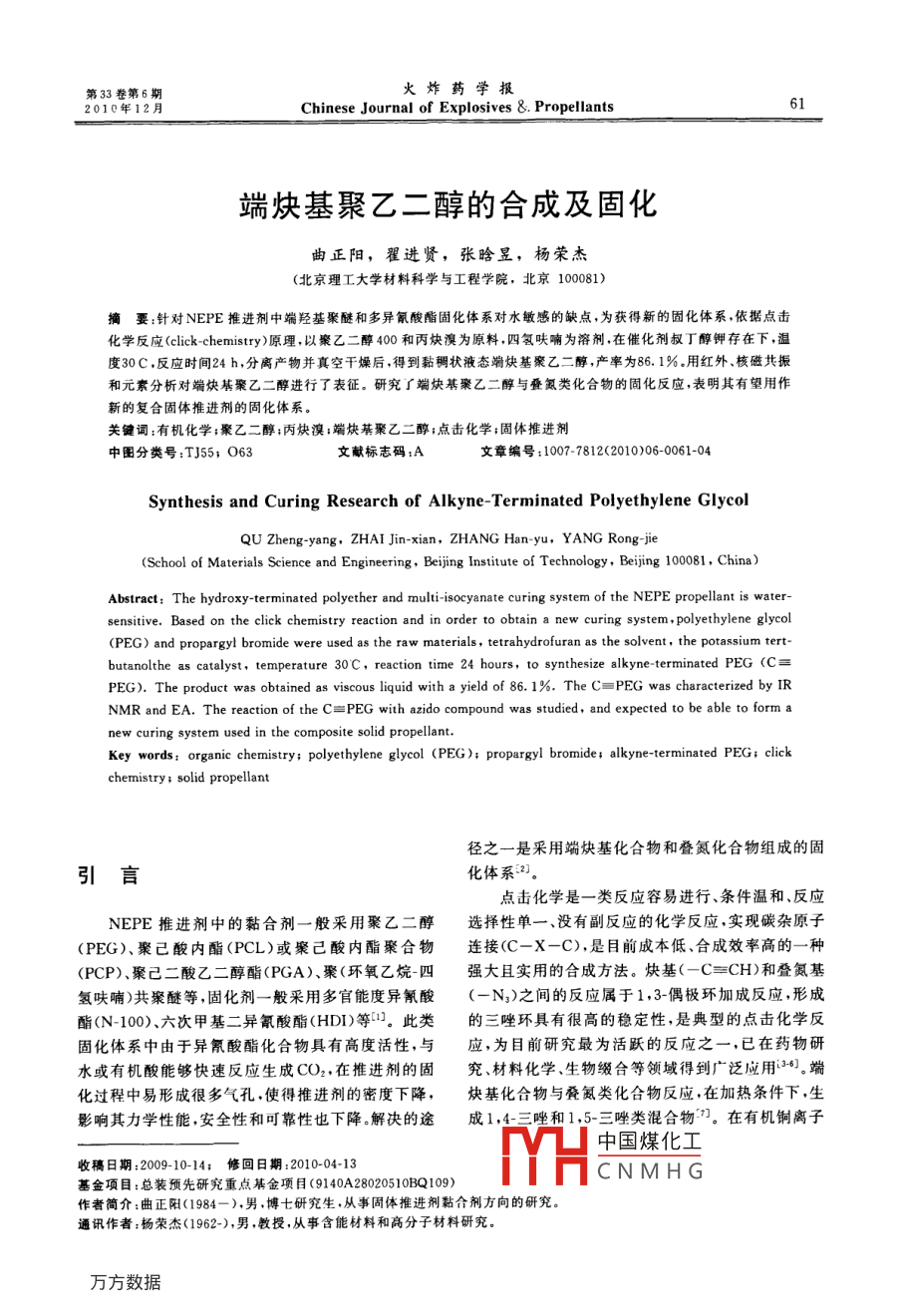 第33卷第6期火炸藥學報2010年12月Chinese Journal of Explosives & Propellants端炔基聚乙二醇的合成及固化曲正陽,翟進賢,張晗昱,楊榮杰(北京理工大學材料科學與工程學院,北京100081)摘要:針對NEPE推進劑中端羥基聚醚和多異氰酸酯固化體系對水敏感的缺點,為獲得新的固化體系,依據(jù)點擊化學反應( click-chemistry)原理,以瘢乙二醇400和丙炔溴為原料四氫呋喃為溶劑在催化劑叔丁醇鉀存在下,溫度30C,反應時間24h,分離產(chǎn)物并真空干燥后,得到黏稠狀液態(tài)端炔基聚乙二醇,產(chǎn)率為86.1%用紅外、核磁共振元素分析對端炔基聚乙二醇進行了表征。研究了端炔基聚乙二醇與疊氮類化合物的固化反應,表明其有望用作新的復合固體推進劑的固化體系。關(guān)鍵詞:有機化學;聚乙二醇;丙炔溴;端炔基聚乙二醇;點擊化學;固體推進劑中圖分類號:T55;063文獻標志碼:A文章編號:1007-7812(2010)06-0061-04Synthesis and Curing Research of Alkyne-Terminated Polyethylene GlycolQU Zheng-yang, ZHAI Jin-xian, ZHANG Han-yu, YANG Rong-jie(School of Materials Science and Engineering, Beijing Institute of Technology, Beijing 100081, China)Abstract: The hydroxy-terminated polyether and multi-isocyanate curing system of the NEPE propellant is watersensitive. Based on the click chemistry reaction and in order to obtain a new curing system, polyethylene glycol(PEG)and propargyl bromide were used as the raw materials, tetrahydrofuran as the solvent the potassium tert-butanolthe as catalyst, temperature 30 C, reaction time 24 hours, to synthesize alkyne-terminated PEG (CPEG). The product was obtained as viscous liquid with a yield of 86. 1%. The C=PEG was characterized by IRNMR and EA. The reaction of the C=PEG with azido compound was studied, and expected to be able to form anew curing system used in the composite solid propellantKey words: organic chemistry: polyethylene glycol (PEG ): propargyl bromide, alkyne-terminated PEG: clickhemistry solid propellant徑之一是采用端炔基化合物和疊氮化合物組成的固引言化體系點擊化學是一類反應容易進行、條件溫和、反應NEPE推進劑中的黏合劑一般釆用聚乙二醇選擇性單一、沒有副反應的化學反應,實現(xiàn)碳雜原子(PEG)、聚己酸內(nèi)酯(PCL)或聚己酸內(nèi)酯聚合物連接(C-X一C),是目前成本低、合成效率高的一種(PCP)、聚己二酸乙二醇酯(PGA)、聚(環(huán)氧乙烷四強大且實用的合成方法。炔基(-C≡CH)和疊氮基氫呋喃)共聚醚等,固化劑一般采用多官能度異氰酸(一N3)之間的反應屬于1,3-偶極環(huán)加成反應,形成酯(N-100)、六次甲基二異氰酸酯(HDI)等。此類的三唑環(huán)具有很高的穩(wěn)定性,是典型的點擊化學反固化體系中由于異氰酸酯化合物具有高度活性,與應,為目前研究最為活躍的反應之一,已在藥物研水或有機酸能夠快速反應生成CO2,在推進劑的固究、材料化學、生物綴合等領(lǐng)域得到廣泛應用36。端化過程中易形成很多氣孔使得推進劑的密度下降,炔基化合物與疊氮類化合物反應,在加熱條件下,生影響其力學性能,安全性和可靠性也下降解決的途成1,4三唑和1,5三唑類混合物。在有機銅離子中國煤化工收稿日期:2009-10-14;修回日期:2010-0413CNMHG基金項目:總裝預先研究重點基金項目(9140A28020510BQ109)作者簡介:曲正陽(1984-),男,博士研究生,從事固體推進劑黏合劑方向的研究。通訊作者:楊榮杰(1962-),男,教授,從事含能材料和高分子材料研究。火炸藥學報第33卷第6期的催化作用下,選擇性地生成1,4三唑類化合物。??跓恐蟹謩e加入1.4g叔丁醇鉀,2.0g聚乙二醇本研究以聚乙二醇400和丙炔溴為原料,四氫400,3.0g丙炔溴和95mL四氫呋喃,通氮氣保護,呋喃為溶劑,合成了端炔基聚乙二醇( Alkyne-水浴加熱,反應溫度30C,反應24h。用飽和食鹽水Terminated PEG,C≡PEG400),以期以兩個端炔溶液萃取,上層液旋蒸,真空干燥后,得到黏稠狀液基與多疊氮基有機化合物組成新的固化體系,在態(tài)產(chǎn)物,產(chǎn)率86.1%。NEPE推進劑中得到應用將得到的產(chǎn)物與官能度為3.82的某疊氮類化劑進行固化反應,以CuI為催化劑,醋酸三甘油酯1實驗為增塑劑,得到固化產(chǎn)物1.1材料及儀器2結(jié)果與分析材料:丙炔溴和叔丁醇鉀,化學純, Alfa Aesar公司;聚乙二醇400,化學純廣東汕頭市西龍化工廠;2.1C≡PEG的反應機理四氫呋喃、氯化鈉和水,化學純,北京化學試劑公司。叔丁醇鉀具有強堿性,置換出PEG端羥基中的儀器: Nicolet6700FT-IR(全反射法),美國熱氫,生成PEG的鉀鹽。C-X(X為鹵原子)鍵具有極電公司; AVANCE DRX-500型超導核磁共振波譜性,鹵原子帶部分負電荷,與之相連的碳原子帶部分儀,德國布魯克公司; Vario el ll元素分析儀,德國正電荷,易受帶負電荷或未共用電子對試劑的進攻,Elementar公司。鹵原子帶一對電子離開,發(fā)生取代反應,烯丙型鹵代1.2實驗烴分子中的鹵原子活潑,容易與親核試劑作用發(fā)生在裝有磁力攪拌器、回流冷凝管和溫度計的三取代反應。其反應式如下:HO +CH-CHH+H C-C-CH+HC-c一CHO-KK-o+CH-CH -0+K+HCBC-CH-BrHC=C-CH2-0 +CH, CH, -0+CH,-C=CH+KBr2.2C≡PEG400的結(jié)構(gòu)表征2.2.2核磁共振譜圖分析2.2.1紅外譜圖分析以TMS為內(nèi)標,CDCl3為溶劑,假定PEG400PEG400和C≡PEG400的紅外譜圖見圖1。和C≡PEG400的分子結(jié)構(gòu)和不同化學環(huán)境H的位置如式(1)和式(2)所示2107669Ho一總-2-0+是-0-總-0(110c-是-0-2-+-ccm對PEG400和C≡PEG400進行HNMR分析。PEG400: HNMR(CDCI),8: 3. 14(s, 2H4000300020001000sie1),3.54~3.56(t,4H,site3),3.59~3.6l(m,圖1PEG400和C≡PEG400的紅外譜圖24H,site4),3.6