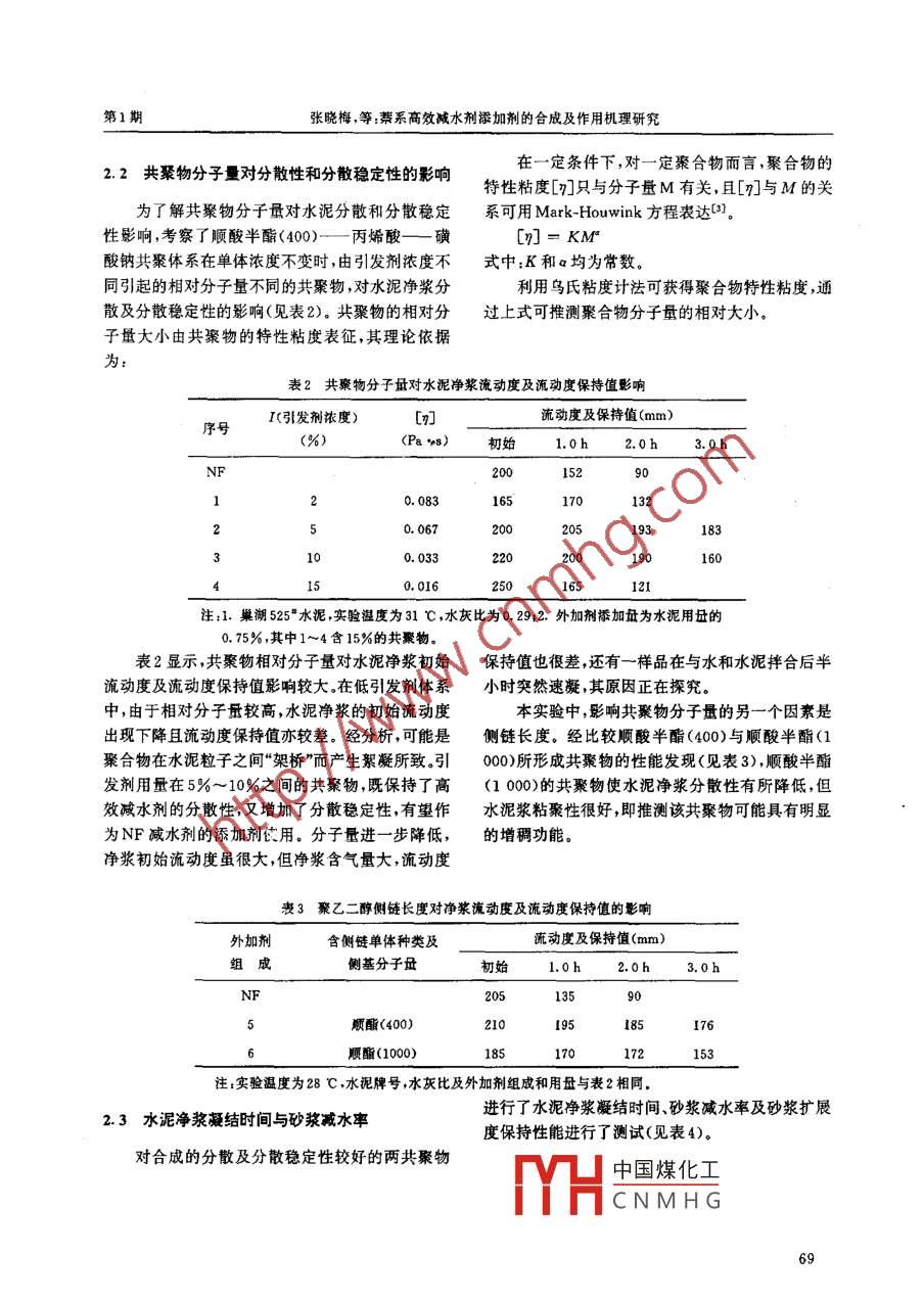 第24卷第1期安徽理工大學學報(自然科學版)Vol. 24 No. 12004年3月Journal of Anhui University of Science and Technology (Natural Science)Mar. 2004萘系高效減水劑添加劑的合成及作用機理研究張曉梅',鄧成剛”,唐軍”,朱宗軍”,胡 義*(1.安徽理工大學化學工程系,安徽淮南232001;2. 淮南礦業(yè)集團合成材料有限責任公司,安徽淮南232046)摘要:為提高萘系高效減水劑的分散穩(wěn)定性,進行了以順丁烯二酸聚乙二酵(400,1 000)單酯、烯丙基磺酸鈉等烯類單體為原料,經(jīng)共聚合反應合成的聚羧酸型高分子表面活性劑,作為萘泉高效減水劑的分散穩(wěn)定劑的研究。研究了共聚物分子結(jié)構(gòu)中單體種類、相對分子量及側(cè)鏈長度對水泥凈漿分散性及分散穩(wěn)定性的影響,合成產(chǎn)物對水泥凈漿基本無緩凝作用又可使砂漿減水率有所提高、砂漿擴展度保持值亦明顯改善;對作用機理進行探討,認為,摻加了所合成的聚羧酸共聚物的萘系高效減水劑,保留了萘系減水劑對水泥較高的分散性,又賦予水泥顆粒較好的分散穩(wěn)定性,這是靜電斥力與立體效應綜合作用的結(jié)果。關鍵詞:蔡系高效威水劑;聚羧酸型共聚物;共聚合反應;分散穩(wěn)定性;作用機理中圖分類號:TQ314.2文獻標識碼:A文章編號:1672-1098<2004>01-0067-04(甲基)丙烯酸;丙烯酸羥乙酯;烯丙基磺酸鈉(簡稱前言磺酸鈉);過硫酸銨;次亞磷酸鈉;過氧化氫;分子量高性能減水劑(又稱超塑化劑)是高性能混凝調(diào)節(jié)劑等。土中的一種核心技術材料。萘系高效減水劑是我國性能測試材料:巢湖525#水泥,NF高效減水目前工程應用中的主要品種,它以煤焦油提取物工劑,共聚物(自制)。業(yè)萘為原料,具有成本較低,臧水率較高,應用廣1.2共聚物的合成.泛,與其它外加劑復合性能好,對水泥適應性好等優(yōu)點,但其坍落度損失大,直接影響了減水劑的使(1)順酐一甲基丙烯 酸共聚物的合成,將一定用效果。近年來,業(yè)內(nèi)人士將研究目光轉(zhuǎn)向了被稱量的順酐加入三口燒瓶中,用氫氧化鈉中和后加入次為第三代高效減水劑的以聚氧乙烯基醚為側(cè)鏈的亞磷酸鈉,攪拌,升溫,滴加過氧化氫和甲基丙烯酸,聚羧酸型梳狀共聚物。田于具有對分散質(zhì)微粒的超100 C左右反應5 h,氫氧化鈉中和,即得產(chǎn)物。分散性和對超分散體系穩(wěn)定的特性,聚羧酸型超塑聚順酸半酯的合成用上述引發(fā)劑體系?;瘎┑难芯块_發(fā)非?;钴S。本文在國內(nèi)外文獻、專(2)其它共聚物的合成共分兩步進行,首先,利的基礎上,對可提高蔡系高效減水劑分散穩(wěn)定性將順酐和丙烯酸分別與聚乙二醇部分或全部酯化的添加劑聚羧酸型共聚物進行研究,為進一-步完善成相應的酯(本文中簡稱順酸半酯和丙烯酸酯),通蔡系超塑化劑的性能,為其繼續(xù)發(fā)揮成本低,性能過反應體系的酸值控制酯化程度;而后,在三口瓶好的優(yōu)勢提供實驗依據(jù)及技術支持。中加入一定量水,將烯丙基磺酸鈉溶解,加熱、攪拌至一定溫度,分批加入相應引發(fā)劑和烯類單體,在1實驗一定溫度下反應約5 h.反應結(jié)束后,以氫氧化鈉中和產(chǎn)物至pH為7.5.1.1實驗藥品及材料用Sartrius水分測定儀測定產(chǎn)物固含量,由烏.合成原料:順酐;聚乙二醇(分子量400, 1000) ;氏粘度計法獲得特性粘度數(shù)據(jù)。中國煤化工收稿日期:2003-10-14薔金項目:淮南礦業(yè)集團2000年科學技術資助項目CTH.CNMH G作者簡介r張曉梅(1962-),女,海南人,副教授,博士.長期從事農(nóng)藥及工業(yè)高分子表面活性劑的合成、應用研究。67安徽理工大學學報(自然科學版)第24卷1.3性能表征聚羧酸系表面活性劑可由不同種類烯類單體經(jīng)均按照文獻[1],測定NF及含共聚物的NF高效聚或共聚合而成,所得產(chǎn)物性能依單體種類及分子減水劑的水泥凈漿流動度,水泥凈漿凝結(jié)時間及砂量不同差異很大,因此,必須根據(jù)使用目的選擇適漿減水率。水泥凈漿流動度保持值測定實驗為:一當?shù)膯误w和分子量。實驗結(jié)果表明,水泥分散性及次性拌合1 200 g水泥凈漿,取300 g左右測初始流分散穩(wěn)定性與聚羧酸系共聚物的結(jié)構(gòu)有密切關系。動度,其余部分分別置于3個加蓋容器中,于相應分子結(jié)構(gòu)中極性基團種類及比例、共聚物分子量、主鏈.上有否支鏈等,都使共聚物應用性能有較大差時間經(jīng)攪拌后測定流動度。異。本實驗設計合成的共聚物結(jié)構(gòu)見圖1.2結(jié)果與討論CH;H CH-CH一Hy4CH2-C- t 4CH2-CH-tH0=CC=OCH2ONaSO;Na(EO)nH圖1聚羧酸型表面活性劑2.1極性基團種類對分 散和分散穩(wěn)定性的影響度緩凝。在聚順酐鏈上增加聚氧乙烯鏈(NF+2" )后,分散性和分散穩(wěn)定性有了明顯提高,可能是分本實驗條件下順酐、丙烯酸的均聚物對水泥幾子主鏈中降低了羧基密度,并增加了支鏈引起的立平無分散性;其共聚物(NF+1#)可改善水泥分散體效應造成的。分子主鏈上引入磺酸基,共聚物性(分散性出現(xiàn)滯后現(xiàn)象),且對分散體系表現(xiàn)出很(NF +3# )對水泥的分散性進- -步 提高;在主鏈上好的分散穩(wěn)定性。水泥凈漿在3~4 h內(nèi)流動度基接枝聚氧乙烯片段,得到了分散性略高于NF而分本保持不變,甚至放置12 h仍未初凝,即產(chǎn)生了過散穩(wěn)定性較好的共聚物(NF +4# )(見表1)。表1含不同極性基團 的聚合物的水泥猙漿分散和分散穩(wěn)定性外加劑共聚物分子的流動度及保持