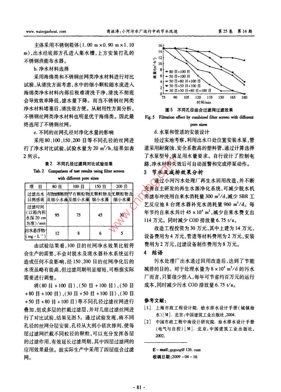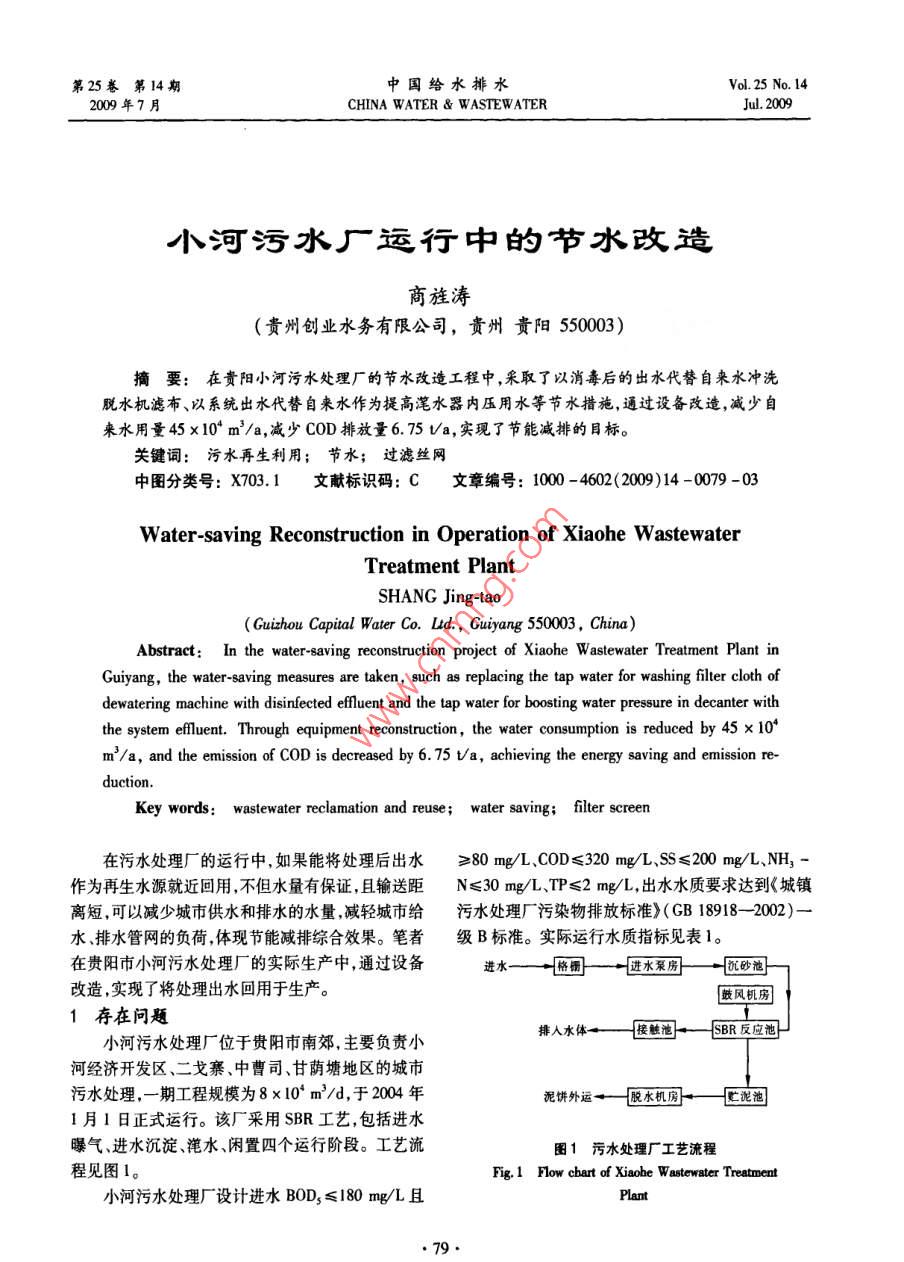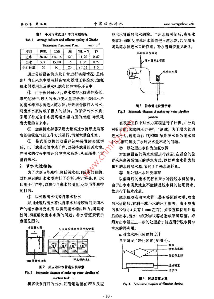 第25卷第14期中國(guó)給水排水Vol 25 No 142009年7月CHINA WATER WASTEW ATERJul.2009小河污水廠遠(yuǎn)行中的節(jié)水改造商旌濤(貴州創(chuàng)業(yè)水務(wù)有限公司,貴州貴陽(yáng)550003摘要:在貴陽(yáng)小河污水處理廠的節(jié)水改造工程中,采取了以消毒后的出水代替自來(lái)水沖洗脫水機(jī)濾布、以系統(tǒng)出水代替自來(lái)水作為提高潷水器內(nèi)壓用水等節(jié)水措施,通過(guò)設(shè)備改造,減少自來(lái)水用量45×10m3/a,減少COD排放量675Ua,實(shí)現(xiàn)了節(jié)能減排的目標(biāo)。關(guān)鍵詞:污水再生利用;節(jié)水;過(guò)濾絲網(wǎng)中圖分類(lèi)號(hào):Ⅺ703.1文獻(xiàn)標(biāo)識(shí)碼:C文章編號(hào):1000-4602(2009)14-0079-03Water-saving Reconstruction in Operation of Xiaohe WastewaterTreatment PlantSHANG Jing-taoGuizhou Capital Water Co. Ltd, Guiyang 550003, China)Abstract: In the water-saving reconstruction project of Xiaohe Wastewater Treatment Plant inGuiyang, the water-saving measures are taken, such as replacing the tap water for washing filter cloth ofdewatering machine with disinfected effluent and the tap water for boosting water pressure in decanter withthe system effluent. Through equipment reconstruction, the water consumption is reduced by 45 x 10m/a, and the emission of CoD is decreased by 6. 75 ta, achieving the energy saving and emissionKey words: wastewater reclamation and reuse; water saving; filter screen在污水處理廠的運(yùn)行中,如果能將處理后出水≥80mg/L、COD≤320 mg/L, ss≤200mg/、NH3作為再生水源就近回用,不但水量有保證,且輸送距N≤30mg/L、TP≤2mg/L,出水水質(zhì)要求達(dá)到《城鎮(zhèn)離短,可以減少城市供水和排水的水量減輕城市給污水處理廠污染物排放標(biāo)準(zhǔn)》(GB18918-200水、排水管網(wǎng)的負(fù)荷體現(xiàn)節(jié)能減排綜合效果。筆者級(jí)B標(biāo)準(zhǔn)。實(shí)際運(yùn)行水質(zhì)指標(biāo)見(jiàn)表1。在貴陽(yáng)市小河污水處理廠的實(shí)際生產(chǎn)中,通過(guò)設(shè)備進(jìn)水格—[進(jìn)水泵房寬改造,實(shí)現(xiàn)了將處理出水回用于生產(chǎn)鼓風(fēng)機(jī)房1存在問(wèn)題接觸池SBR反應(yīng)池小河污水處理廠位于貴陽(yáng)市南郊,主要負(fù)責(zé)小河經(jīng)濟(jì)開(kāi)發(fā)區(qū)、二戈寨、中曹司、甘蔭塘地區(qū)的城市污水處理,一期工程規(guī)模為8×10m3/d,于2004年泥餅外運(yùn)水機(jī)房—〖泥泡1月1日正式運(yùn)行。該廠采用SBR工藝,包括進(jìn)水曝氣、進(jìn)水沉淀、潷水、閑置四個(gè)運(yùn)行階段。工藝流圖1污水處理廠工藝流程程見(jiàn)圖1。Fig. 1 Flow chart of Xiaohe Wastewater Treatment小河污水處理廠設(shè)計(jì)進(jìn)水BOD5≤180mg/L且79第25卷第14期國(guó)給水排水www.w81小河污水處理廠年均水質(zhì)指標(biāo)池出水管道的出水閥前。當(dāng)出水閥關(guān)閉后,高壓水Tab 1 Average influent and effluent quality of Xiaohe流就沿SBR反應(yīng)池出水管道進(jìn)入潷水器,起到增壓Wastewater Treatment Plant閉緊潷水器進(jìn)水口的作用。補(bǔ)水管道位置見(jiàn)圖3。項(xiàng)目BOD3CODNH,-N補(bǔ)給水水流方向進(jìn)水56.8211416120120087出水515.00151:35027潷水器補(bǔ)水管道通過(guò)分析設(shè)備構(gòu)造及日常運(yùn)行實(shí)際情況,總結(jié)電動(dòng)出水閥出廠內(nèi)自來(lái)水主要消耗在潷水器增壓補(bǔ)給水、加氯機(jī)水射器用水及脫水機(jī)濾布的沖洗等環(huán)節(jié)中。①由于長(zhǎng)時(shí)間運(yùn)行潷水器排水閥彈性降低,曝氣過(guò)程中,較大的壓力使大量混合液由關(guān)閉不嚴(yán)的潷水器排水閥進(jìn)入潷水器,導(dǎo)致混合液混入出水,圖3補(bǔ)水管道位置示意對(duì)出水水質(zhì)構(gòu)成了極大的威脅。為保證出水水質(zhì),Fig 3 Schematic diagram of makes-up water pipeline采用了補(bǔ)充自來(lái)水提高潷水器內(nèi)壓的措施,導(dǎo)致耗費(fèi)大量的自來(lái)水在改造工作中對(duì)水力高程進(jìn)行了計(jì)算,并分別②加氯機(jī)水射器采用大量高速水流形成局部對(duì)管道前末端的壓力進(jìn)行了測(cè)試。為了增大管道負(fù)壓抽吸氯氣的工作方式運(yùn)行消耗大量自來(lái)水。進(jìn)水壓力選用兩臺(tái)YQS200深井潛水泵為潷水器③帶式壓濾機(jī)的濾帶經(jīng)卸料裝置卸去泥餅補(bǔ)水,徹底解決了水壓及水量不足的問(wèn)題。后,上、下濾帶必須沖洗干凈以保持濾帶的透水性。②以處理出水作為加氯水在脫水的過(guò)程中需開(kāi)啟沖洗水系統(tǒng),從而耗費(fèi)了大對(duì)加氯設(shè)備的供水水源進(jìn)行改造,在適合的位量自來(lái)水置采用多級(jí)泵加壓的供水方式,以處理出水作為加2節(jié)水改造措施氯機(jī)的水射器水源,節(jié)約了自來(lái)水消耗量。為了達(dá)到節(jié)能減排降低污水處理成本的目的,③用處理出水沖洗濾布對(duì)處理后的出水水質(zhì)進(jìn)行了分析,決定將處理出水以消毒后的出水代替自來(lái)水沖洗脫水機(jī)濾布。回用于生產(chǎn)中以減少自來(lái)水的用量達(dá)到節(jié)能減排由于出水水質(zhì)及地點(diǎn)不能滿(mǎn)足脫水機(jī)的使用要求,的目的。故進(jìn)行了技術(shù)改造①以處理出水代替自來(lái)水補(bǔ)水脫水機(jī)濾布清洗水管上裝有等距的噴嘴,噴出采用處理后出水替代自來(lái)水對(duì)橡膠閥門(mén)關(guān)閉不的水呈扇形有利于減小水的壓力