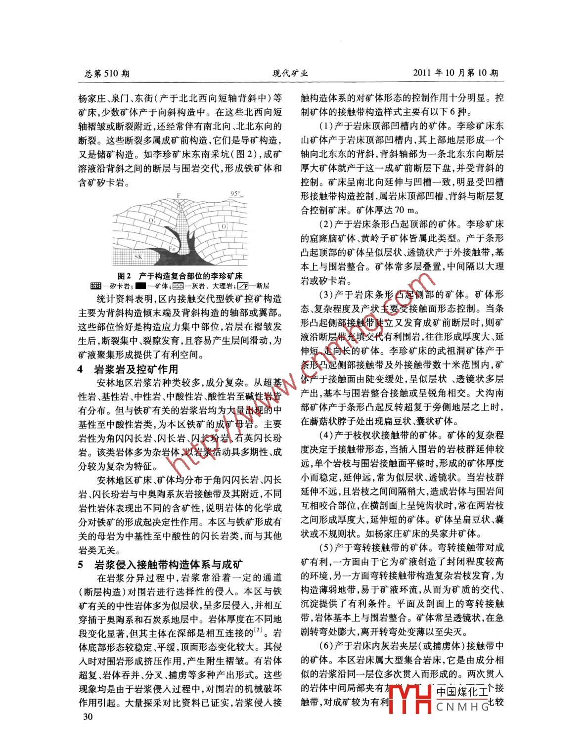 Serial No. 510現(xiàn)代礦業(yè)總第510期._October. 2011MODERN MINING2011年10月第10期●地質(zhì)●測量●河南省安林地區(qū)構(gòu)造、巖漿活動與成礦關(guān)系牛文革'.2黃凱旭'(1.中國地質(zhì)大學(xué)地球科學(xué)與資源學(xué)院;2.河南省有色金屬地質(zhì)礦產(chǎn)局第一地質(zhì)大隊; .3.河南省有色金屬地質(zhì)礦產(chǎn)局第二地質(zhì)大隊)摘要 通過分析安林地區(qū) 區(qū)域構(gòu)造特征和礦床地質(zhì)特征,認為 斷裂構(gòu)造為巖漿的侵入提供了通道,區(qū)域構(gòu)造擠壓形成的背斜為巖漿侵入的主要部位;巖漿侵入接觸構(gòu)造體系對礦體規(guī)模、形態(tài)、產(chǎn)狀起著重要的控制作用;斷裂構(gòu)造不僅控制與成礦有關(guān)的巖漿活動,而且改造了礦體的空間分布;褶鈹構(gòu)造提供了有利的成礦空間。關(guān)鍵詞安林地區(qū) 矽卡巖礦床 鐵礦構(gòu)造巖 漿活動安林地區(qū)是河南省重要的矽卡巖型鐵礦集中區(qū)部位對區(qū)內(nèi)巖體和礦體形成起著主導(dǎo)作用。其中,之一,迄今已查明小型以上的礦床10個,發(fā)現(xiàn)礦點北北東、北東向構(gòu)造由一系列壓扭性斷裂和寬緩褶20多處。已發(fā)現(xiàn)的鐵礦床在空間上形成東礦帶和皺組成,自北西向南東呈現(xiàn)3個雁列發(fā)育帶:東冶一西礦帶,與區(qū)內(nèi)分布的兩個中基性、中酸性巖漿巖帶晉家莊-東街北東向構(gòu)造帶控制著西礦巖漿巖帶及關(guān)系密切,巖漿活動及礦床的分布明顯受2個北東相關(guān)鐵礦;李珍-泉門- 采桑北北東向構(gòu)造帶控制向和1個北西向構(gòu)造帶控制。因此,加強構(gòu)造、巖漿著東部巖漿巖帶及相關(guān)鐵礦;水冶一馬鞍山- 東姚活動與成礦關(guān)系的研究,對本區(qū)深部及外圍找礦潛構(gòu)造帶控制著東南礦化帶及巖體的分布。北西西向力評價具有重要意義。構(gòu)造帶位于礦田中部,與北東向構(gòu)造帶的復(fù)合部位1區(qū)域構(gòu)造特征共同控制著中部巖漿巖帶及相關(guān)鐵礦的分布。安林地區(qū)鐵礦分布于早古生代碳酸鹽臺地中太2礦床地 質(zhì)特征行山(中段)陸緣巖漿弧,沿燕山造山帶東側(cè)北北東礦床成因類型為接觸交代變質(zhì)型(矽卡巖型)向展布,受控于北北東向閃長巖帶”。侵人巖大多礦床,嚴格受侵人巖體內(nèi)外接觸帶構(gòu)造控制,成礦母呈巖蓋、巖床和小巖株產(chǎn)出。巖體規(guī)模不大,空間上巖為閃長巖、石英閃長玢巖,少數(shù)為角閃閃長巖。成由西向東組成3個近平行的巖漿巖帶,呈北北東向礦圍巖主要為奧陶系中統(tǒng)灰?guī)r,主要賦礦層位為奧串珠狀分布。由西向東依次劃分為角閃閃長巖系、陶系中統(tǒng)馬家溝組第3巖性段和第5巖性段。閃長巖系、正長巖系三大巖石系列,分別為東冶一-晉鐵礦體空間上主要賦存于燕山期中性侵人巖和家莊巖帶、李珍-馬鞍山巖帶和九龍山巖體,前兩者碳酸鹽巖的接觸帶,少量產(chǎn)于碳酸鹽巖內(nèi)及侵人巖為本區(qū)矽卡巖型鐵礦重要的成礦母巖。體內(nèi)部。礦體的長度- -般為幾十米到幾百米,厚度受東、西兩個巖漿巖帶的控制,區(qū)內(nèi)鐵礦分為一般為幾米至幾十米。礦體形態(tài)多樣, 中型礦床的東、西2個礦帶。東礦帶自北而南有都里鐵礦、李珍礦 體形態(tài)較為簡單,多呈似層狀、透鏡狀及扁豆狀,鐵礦、泉門鐵礦、楊家莊鐵礦、下莊東坡十字嶺鐵礦,小型礦床的礦體形態(tài)相對復(fù)雜,多為囊狀及其他不西礦帶自北而南有東冶鐵礦、石村-栗家溝鐵礦、晉規(guī)則狀礦體。家莊鐵礦、曹家莊鐵礦、東街鐵礦。礦石的化學(xué)成分以鐵為主,其次有硅、鋁、鈣等。.區(qū)內(nèi)構(gòu)造形跡以褶皺為主,斷裂次之,其中北北有益伴生元素有硫鈷、銅等。礦石礦物主要為磁鐵東、北東向構(gòu)造帶與經(jīng)改造的近東西向構(gòu)造帶組成礦,其他金屬礦物有赤鐵礦、鏡鐵礦、黃鐵礦,少量的本區(qū)的基本構(gòu)造骨架。各種構(gòu)造體系的復(fù)合、聯(lián)合鈦鐵礦、磁黃鐵礦、黃銅礦。鐵礦石品位30%~50%。脈石礦物以透輝石、石榴子石為主,次為方解牛文革(1966- -) ,男,副總工程師,博士研究生.45006河南省石、陽起石、透閃石等。中國煤化工大結(jié)鄭州市鄭東新區(qū)金水東路16號。構(gòu)為主,其次為交代殘fYHCNMH G'28牛文革黃凱旭:河南省安林地區(qū)構(gòu)造、 巖漿活動與成礦關(guān)系2011年10月第10期發(fā)育(如石村礦床),礦體形態(tài)取決于夾層的形態(tài)與多重因素控制。構(gòu)造一巖漿活動對安林地區(qū)鐵礦形構(gòu)造,常呈似層狀產(chǎn)于接觸帶上。成起決定作用。斷裂構(gòu)造為巖漿的侵人提供了通綜上所述并非所有的接觸帶都有利成礦,而接道,區(qū)域構(gòu)造擠壓形成的背斜為巖漿侵人的主要部觸帶是否有利成礦,其形態(tài)特征上是有顯著差別的。位。巖漿侵人接觸構(gòu)造體系對礦體規(guī)模、形態(tài)產(chǎn)狀主要表現(xiàn)為:本區(qū)鐵礦體主要產(chǎn)于接觸帶的內(nèi)彎及外起著重要的控制作用。接觸帶構(gòu)造形式受褶皺、斷彎處,也就是圍巖的舌狀突出部位;在接觸帶產(chǎn)狀陡裂及巖漿侵入方式等多因素制約。斷裂構(gòu)造不僅控緩變化處,或走向劇烈變化的部位是成礦的有利部制與成礦有關(guān)的巖漿活動,而且控制著礦體的空間位巖體頂部與奧陶系中統(tǒng)碳酸鹽