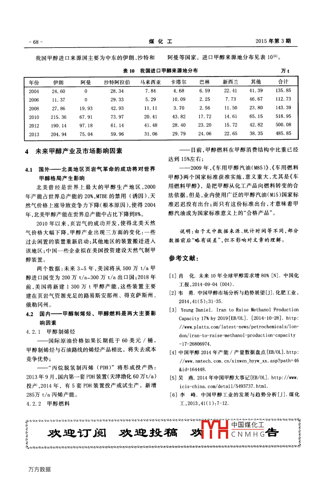 第43卷第3期煤化工Vol 43 No. 32015年6月Coal Chemical IndustJun.2015國內外甲醇產業(yè)及市場分析肖建新(福州耀隆化工集團公司,福建福州350014)摘要分析了世界甲醇市場格局,并對世界主要大型甲醇裝置、新增甲醇產能情況進行了介紹。著重介紹了中國甲醇產業(yè)的現狀,分析了我國甲醇的生產、消費、大型裝置、進出口情況等。最后對影響國內外甲醇產業(yè)及市場的因素進行了分析。關鍵詞甲醇,市場,發(fā)展?jié)摿?生產,消費,進出口文章編號:1005-9598(2015)-03-006307中圖分類號:TQ223.121文獻標識碼:A1世界甲醇市場情況能12070萬t/a,生產能力主要集中在中國、中東、南美和東歐部分地區(qū),其中中國約4900萬t/a、中東11世界甲醇的生產、消費、進出口1610萬t/a、美洲1360萬t/a,這3個區(qū)域產能占甲醇是全球流通的大宗產品,中國、歐洲、北美作全球甲醇產能的2/3以上。除中國是集生產和需求于為甲醇的最主要需求地區(qū),其貿易量約占全球甲醇貿體,其余兩個地區(qū)均以出口為主,本地消化甲醇極易的3/4。目前甲醇行業(yè)的全球主要貿易流向是南美少。2013年國際甲醇供需情況見表1。全球(除中國大產品流向北美市場,對其他區(qū)域的影響力相對較弱;陸外)主要大型甲醇生產裝置及產能情況見表2。中東產品流向歐洲和東北亞,兼顧東西市場,是全球1.2世界甲醇主要新增產能甲醇市場的主要供應商;另外還有部分東北亞的甲醇未來新增甲醇產能主要集中在中國、南北美、伊來自東南亞市場,但數量不大。中東、南美為主要出口朗。中國由于MT0/MTP項目大量投產,甲醇供大于求地區(qū),東亞、西歐、北美為主要進口地區(qū)。的市場情況將發(fā)生改變;加上中國國內天然氣價格上據安迅思(ICIS)統(tǒng)計,2013年,全球甲醇有效產漲,致使天然氣制甲醇裝置大面積停產,和國內對于表12013年國際甲醇供需情況有效產能/萬t·a1產量/萬t需求量/萬t進口量/萬t出口量/萬t凈進口量/萬t全球120707675767627032703非洲215歐洲l010370美洲13601080800210中東1610亞洲79704390(+1180)5478(+1328)392l088印度140東北亞地區(qū)73303890(+1090)507811901188東南亞地區(qū)580470(+90)370注:數據來源安迅思中國,括號內數據為相對上年變化量。中國煤化工收稿日期:2015-04-10CNMHG作者簡介:肖建新(1964—),男,福建福州,高級工程師,學士,1987年本科畢νm亞,現主要從事煤化工等行業(yè)產品的生產、經銷及研發(fā)工作,E-mail:139059297870139.c0m。煤化工2015年第3期表2全球(中國大陸除外)主要甲醇生產裝置及產能統(tǒng)計D公司名稱/地點產能/萬t·a備注新西蘭( Waitara Valley和 Motunui)2014年產量219.6萬t特立尼達和多巴哥( Atlas)3112.52014年產量90.7萬t持立尼達和多巴哥( Titan)87.52014年產量66.4萬t埃及4年產量41.6萬Methanex加拿大( Medicine Hat14年產量50.5萬t智利I和Ⅳ2014年產量16.5萬t100智利兩座工廠搬遷過來, Geismar美國路易斯安那州( Geismar1和 Geismar2)1預計2015年初投產, Geismar2l00預計2016年投產合計9422014年產量485.3萬t75SABIC與三菱瓦斯公司各投Saudi Methanol Company(Al-Jubail)資50%的合資公司SABIC(沙特阿拉伯)170Gulf Petrochemical Industries Company(巴林)由巴林王國政府、 SABIC和科威特PIC共同擁有National Methanol Company( Ibn Sina)(Al-Jubail)105SABIC和CTE各50%所有權合計6452013年產量約480萬t165Zagros Petrochemical Co, (ZPC1653NPC(伊朗)Fanavaran Petrochemical Co. (FPC)Kharg Petrochemical Co.( KPCShiraz petrochemi cal co4 Methanol Holdings Trinidad Ltd.-(MHTL)(特立尼達和多巴哥)5 Petronas methanol Labuan Sdn bhd-(PML)(馬來西亞Salalah Methanol Co.(阿曼)109.50 man Methanol Co.LLC(OMC)(阿曼8 Atlantic Met hanol Production Co.-( Ampco)(赤道幾內亞)Metafrax(俄羅斯)Togliatti Azot(Toaz)(俄羅斯)100International Methanol Co.-(IMC)(沙特阿拉伯)由沙特阿拉伯 Sipchem投資65%日本JAMC投資35%12Qatar Fuel Additives Co.Ltd.-( Mafac)(卡塔爾)注:1)數據主要來源于各公司官方網站;2)考慮天然氣供應情況,有效產能約600萬t/a;3) Methanex占股63.1%,裝置總產能180萬t/a4) Methanex占股50%,裝置總產能130萬t/aV凵中國煤化工環(huán)境問題的重視,長遠來看,相對便宜的國際甲醇價機構預測,CNMHG產能約560萬格將帶動中國甲醇進口量上升。南北美方面,據相關t/a,非洲和南美將新增300萬t/a,2016年以后北美2015年6月肖建新:國內外甲醇產業(yè)及市場分析65甲醇基本實現自給,南美甲醇產能出現大量過剩,南t,約消耗2800萬t甲醇;二是甲醇制芳烴技術取得美地區(qū)也將到東北亞、尤其是中國尋找甲醇的出口市突破,華電集團世界首套萬噸級煤基甲醇制芳烴工業(yè)場。隨著甲醇產能進一步的增加,北美也將逐步成為試驗成功,華電榆橫年產300萬t甲醇、100萬t芳甲醇凈出口地區(qū),將與中東爭奪歐洲和亞洲市場。未烴項目已經開工建設;三是甲醇燃料(汽油)將保持來10年,歐洲甲醇進口量有望繼續(xù)增加,而東北亞地10%~15%的增速增長(2。因此,未來幾年,中國甲醇的區(qū)的進口量有望增至當前的3倍。產能和需求都將繼續(xù)大幅度增長,裝置向煤基大型化1.2.1中國發(fā)展,甲醇產能過剩的狀態(tài)將得到有效緩解,中國的中國將成為全球甲醇需求增長的主要驅動力。甲醇市場將保持平穩(wěn)向好的發(fā)展態(tài)勢。IHS化學的最新研究報告顯示,至2023年全球甲醇1.2.2美國需求將增加至逾1.09億t,增幅達到80%。中國是全頁巖氣革命啟動甲醇產能。美國的頁巖氣大發(fā)展球最大的甲醇生產國,由于MT0產業(yè)快速發(fā)展,未來使