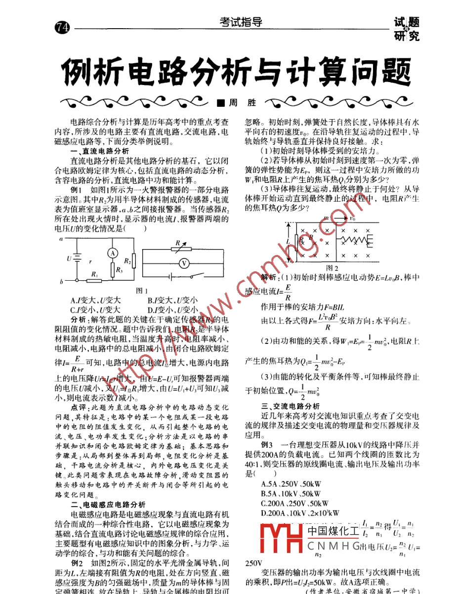 ④考試指導試題研究例析電路分析與計算問題飛K日CrC■周勝vvee電路綜合分析與計算是歷年高考中的重點考查忽略。初始時刻,彈簧處于自然長度,導體棒具有水內容,所涉及的電路主要有直流電路,交流電路.電平向右的初速度v。。在沿導軌往復運動的過程中.導磁感應電路等,下面分類舉例說明。軌始終與導軌垂直并保持良好接觸。求:-、直流電路分析(1)初始時刻導體棒受到的安培力。直流電路分析是其他電路分析的基石,它以閉(2)若導體棒從初始時刻到速度第-一次為零,彈合電路歐姆定律為核心,包括直流電路的動態(tài)分析,簧的彈性勢能為Ep,則這一過程中安培力所做的功含容電路的分析.直流電路中功和能計算。w和電阻R上產(chǎn)生的焦耳熱Q分別為多少?例1如圖1所示為一火警報警 器的- -部分電路(3)導體棒往復運動,最終將靜止于何處?從導示意圖。其中R,為用半導體材料制成的傳感器,電流體棒開始運動直到最終靜止的過程中,電阻R產(chǎn)生表為值班室顯示器,a .b之間接報警器。當傳感器R2的焦耳熱Q為多少? .所在處出現(xiàn)火情時,顯示器的電流1、報警器兩端的m電壓U的變化情況是(FrivE墜R,R,R2O-圖2解析:(1)初始時刻棒感應電動勢E=Lw,B.棒中圖1感應電流|= EA.變大,U變大B.I變大,U變小C.I變小,U變大D.[變小, U變小作用于棒的安培力F=BIL分析:解答此題的關鍵在于確定傳感器R,的電由以上各式得F-L50B安培方向:水平向左。阻阻值的變化情況。題中告訴我們電阻R,是半導體R材料制成的熱敏電阻,當溫度升高時,電阻率減小、(2)由功和能的關系,得W=Ei=!m品電阻R上.電阻減小,電路中的總電阻減小,由閉合電路歐姆定律I=-上可知,電路中的總電流l增大.電源內電路產(chǎn)生的焦耳熱為Q=、mog-EpR+i上的電壓降Ur=lgr增大,由U=E-U,可 知報警器兩端(3)由能的轉化及平衡條件等.可知棒最終靜止的電壓U減小,又U=lgR增大,由U=U/+U;可知U;減于初始位置,Q=,mo3小,則電流表示數(shù)1減小。點評:此題為直流電路分析中的電路動態(tài)變化三.、交流電路分析問題,其特征是:電路中的某一個電阻或某一段電路近幾年來高考對交流電知識重點考查了交變電中的電阻的阻值發(fā)生變化,從而引起整個電路的電.流的規(guī)律及描述交變電流的物理量和變壓器規(guī)律及流、電壓、電功率發(fā)生變化;分析方法是以電路的串應用并聯(lián)知識和閉合電路歐姆定律為基礎;基本思路和例3一臺理想變壓器從10kV的線路中降壓并步驟是:從局部到整體再到局部,電阻變化分析是基提供200A的負載電流。已知兩個線圈的匝數(shù)比為礎,干路電流分析是核心,內外電路電壓變化是關40:1,則變壓器的原線圈電流、輸出電壓及輸出功率鍵。此類問題常表現(xiàn)在電路故障分析,滑動變阻器的是(觸頭移動和電路中的開關斷開與閉合等所引起的電A.5A .250V .50kW路變化問題。B.5A. 10kV、50kW二、電磁感應電路分析C.200A、250V .50kW電磁感應電路是電磁感應現(xiàn)象與直流電路有機D.200A、10kV .2x10kW結合而成的一種綜合性電路,它以電磁感應現(xiàn)象為1_照得然_少基礎,結合直流電路討論電磁感應規(guī)律的綜合應用,中國煤化工2 num主要題型有電磁感應知識中的圖象分析,與力學運MYHC N M H G出電壓U="2 U/=動學的綜合,與功和能有關問題的綜合。n2例2如圖2所示 ,固定的水平光滑金屬導軌,間250V距為L.左端接有阻值為R的電阻,處在方向豎直、磁變壓器的輸出功率為輸出電壓與次線圈中電流感應強度為B的勻強磁場中,質量為m的導體棒與固.的乘積,即P出=UI=50kW。故A選項正確。定彈簧相連,放在導軌上.導軌與金屬棒的電阻均可(作者單位:安徽省宿城第一中學)
