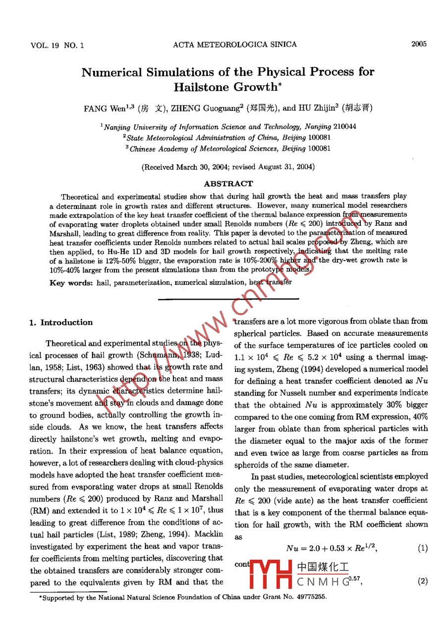 VOL.19 NO. 1ACTA METEOROLOGICA SINICA2005Numerical Simulations of the Physical Process forHailstone Growth*FANG Wen1,3 (房文), ZHENG Guoguang2 (鄭國(guó)光), and HU Zhjin3 (胡志晉)'Nanjing Univereity of Inforrmation Science and Technology, Nanjing 2100442 State Meteorological Administration of China, Beijing 1000813 Chinese Academy of Meterological Sciences, Bejjing 100081(Received March 30, 2004; revised August 31, 2004)ABSTRACTa determinant role in growth rates and different structures. However, many numerical model researchersmade extrapolation of the key heat transfer cofficient of the thermal balance expression from measurementsof evaporating water droplets obtained under small Renolds numbers (Re≤200) introduced by Ranz andMarshall, leading to great diference from reality. This paper is devoted to the parameterization of measuredheat transfer cofficients under Renolds numbers related to actual hail scales proposed by Zheng, which arethen applied, to Hu-He 1D and 3D models for hail growth respectively, indicating that the melting rateof a hailstone is 12% 50% bigger, the evaporation rate is 10%-20% higher and the dry-wet growth rate is10%-40% larger from the present simulations than from the prototype models.Key words: hail, paramneterization, numerical simulation, heat transfer1. Introductiontransfers are a lot more vigorous from oblate than fromspherical particles. Based on accurate measurementsTheoretical and experimental studies on the phys-of the surface temperatures of ice particles cooled onical processes of hail growth (Schumann, 1938; Lud-1.1 x 104≤Re≤5.2 x 104 using a thermal imag-lan, 1958; List, 1963) showed that its growth rate anding system, Zheng (1994) developed a numerical modelstructural characteristics depend on the heat and massfor defining a heat transfer coefficient denoted as Nutransfers; its dynamic characteristics determine hail-standing for Nusselt number and experiments indicatestone's movement and stay in clouds and damage donethat the obtained Nu is approximately 30% biggerto ground bodies, actually controlling the growth in-compared to the one coming from RM expression, 40%side clouds. As we know, the heat transfers affectslarger from oblate than from spherical particles withdirectly hailstone's wet growth, melting and evapo- the diameter equal to the major axis of the formerration. In their expression of heat balance equation,and even twice as large from coarse particles as fromhowever, a lot of researchers dealing with cloud-physicsspheroids of the same diamneter.models have adopted the heat transfer coefficient mea-In past studies, meteorological scientists employedsured from evaporating water drops at small Renoldsonly the measurement of evaporating water drops atnumbers (Re≤200) produced by Ranz and MarshallRe≤200 (vide ante) as the heat transfer cofficient(RM) and extended it to1x10≤Re≤1x 107, thus that is a key component of the thermal balance equa-leading to great difference from the conditions of ac-tion for hail growth, with the RM cofficient showntual hail particles (List, 1989; Zheng, 1994). Macklininvestigated by experiment the heat and vapor trans-Nu= 2.0+ 0.53 x Re-/2,(1)fer cofficients from melting particles, discovering thatcont中國(guó)煤化工the obtained transfers are considerably stronger com-pared to the equivalents given by RM and that theYHCNMHG.57,(2)"Supported by the National Natural Science Foundation of China under Grant No. 49775255.04ACTA METEOROLOGICA SINICAVOL.19Nu= 0.313 x Re0.599,(3)For convenience of later discussion Nu of Eqs.(1)Nu= 0.114 x Re0.74,(4to (4) are denoted as Nu1 through Nus, in order andother physical quantities calculated using Nu1 - Nuswhere Nu of Eqs.(2)-(4) measured at 1 x 104will be given by corresponding subscripts 1 throughRe≤5.2 x 104 proposed by Zheng who used a verti- 4. Nu1 to Nua, respectively, fom Eqs(1) to (4) atcally pesusenrtrollable wind tunnel for hail growth.1x103 ≤Re≤5.2x 104 are given in Table 1, in whichEquation (2) is applicable to smooth sphere, i.e., theirwe see that Nu2 is by 2%-30% larger than Nu, aboutaspect ratioa = 1; Eq.(3) holds for smooth oblate 14%, on average, higher; Nus exceeds Nu1 by 4%-particles witha= 0.67 and Eq.(4) is true for rough 69%, averaging roughly 35% larger; Nua(B = =2% par-oblate particles (a = 0.67) with surface having coarse ticle) is 83% greater compared to Nu, but at largerness β =2%.Re, Nus is by 150% larger than Nu1.Table 1. Comparison of Nu nunbers of hiltones with various characteristic at1x10°≤Re≤5.2x 10*R1x 1031.5x 1032.8x 1033.4 x 1034.4x 1035.2x 1036.5x 103Nu118.88722.68230.25733.13737.42140.50745.052u216.92421.32530.43633.99839.38143.41549.189Nu19.65125.05236.41040.90147.73152.75560.299Nua18.91925.53940.53246.79556.632 .64.08475.589Re7.6x 1039.4x 1031x 1042.2x 1043x 1043.7x 105.2x 10448.55353.77355.40081.20594.491104.717123.771Ne53.77560.70162.88098.559117.618132.551160.92966.21975.21178.051125.166150.720170.895209.538Nu484.86199.316103.97186.336234.409273.762352.166Equations (1)-(4) are parameterized and put, sep- interest in this study.arately, into the 1D and 3D time-dependent cumulusIn the derivation of the model expressions of Hu-models developed by Hu and He (1988; 1989), with He for wet-dry growth, melting and evaporation ofthe simulations for comparison.hailstones, the integral portion is approximated by anempirical expression. If, for example, the hail subli-2. Parameterization schememation expression were treated with that way,The 1D cloud model was employed to deriveSvh = πrkap(Qv - Qgo)NupooNoD'9exp( -入h D)dDthe specific water contents of in-cloud vepor, cloudJDgdroplets, the combination of graupels, ice crystals, rain= 2πkap(Qv - Qs0)0.29√pAvh/μwater and hail particles, and the conversion rate ofJ.NpDl-9exp(-AnD)dDspecific number concentration from 26 primary micro-physical processes, each of which is denoted by a cap-≈2πkap(Qv - Qso)0.29v pAvh/ μN(yùn)nH:9ital letter for the pr