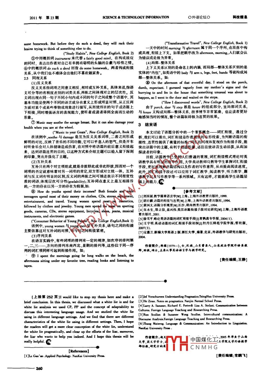 科技信息0外語(yǔ)論壇0SCTENCE & TECHNOLOGY NFORMATION2011年第23期Pragmatic Analysis on White Lie趙天毓(陜西省理工學(xué)院大學(xué)外語(yǔ)教學(xué)部陜西漢中723000)[摘要]善意的謊言是在 日常生活中常見的交際方法。本論文將對(duì)善意說(shuō)言作- -個(gè)大致的論述。在文中我將用語(yǔ)用學(xué)中常見的方法來(lái)分析它,有時(shí)還會(huì)遇到心理分析。我們還會(huì)遇到善意謊言發(fā)生的不同場(chǎng)景以及在達(dá)些場(chǎng)景中使用的善意謊言的特點(diǎn)。[Key words]White lie; Cooperntive principle (CP); Polite principle (PP); Adaptability; Contextual relate.All of us know to lie i bad and to white lie is ecesible. But thelisteners alwaye become angry beceuse they feel to be cheated. Why?Sometimes they appear for maintaining the social relationship or forJust because they think they have the right to know the fac. However, other purpoees, they need to do some preparing work to reach their aims:not all results are good to them. So, there is a tactful way to avoid“Good moming Mns. Creen, You always loo vigorous and never old, 1someone being affected by sad news- the using of white lie.really want to know where you've got this dreas, and I'm veryWhite lie takes an important role in our daily conversations. How appreciating of it. By the way I want to aalthe white lie happens and progresses, which interests me moet, will beht aleo can be used implicitly to imply there meaning for they don'tdiscused in this theis. The purpoee of writing this theis is for helping want to rise their request dretly:people to re establish their conception of lie (epecify the definition ofwhite lie) and to state more accessible lie when it is necesary, LieIt is obviously that the speaker's real aim of the words is ltting thesometimes is not 8s bad韶people always thinking, I promise most people listener to open the window. Participants need to make an effort tohave ever lied to others with diflerent aims. Now it is the time to change cooperate to satisfy the purpose of the conversation. The CP is adapted inthe atitude towards it. Then. to this useful and kind communicational most situations of conversations. The tllk which failed to suit thistactics, what should we pay attention to, how should we use it ia the principle is nol a Bucceas one.purpose of writing this thesis. Our aim is to speak more accessible lieTo discuse the Cooperative Principle more detailedly, Gricewhen it is necesar..subdivided it into 4 maxime:1 am glad to find that this ubjet has not been studied in linguisticQuality Maxim:way; I have got free space do this thesis. But many pecople have studied1)Make your contribution a informative 8 is required (for thelies in criminal paychology. So it is not a completely unfamiliar topic to curent purpose of the exchange).all ofus. What I have rerred is the theories on epplied paychology2)Do not make your contribution more informative than is requirod.(Applied peaychology, by Le Guo'an, Nankai University Prea). The exactQuantiy Maxim:white lie exarmples are used in many areas in which I would like toTry to make your contibution one that is true:discuss in separate sections all of which have their own features. As an1)Do not say what you believe to be false.important theoryADAPTABILTY will be drawn into the thesis to2)Do not ay that for which you lack adequale evidence.analyze the motivation of the epeaker for the reasons he/she uscea whiteBe relevant.The tools we need to analyze the white lie are abstract theories. It isManner Maxim:necessary to introduce them at first:Be perpicuous:I)Avoid obocurity of expression.1 Cooperative Principle2)Avoid ambiguity.3)Be brief (avoid uncesary prolixity).stage at tohich it oeeurs, by the accepted purpose or direction of the talk4)Be orderly.exchange in which you are enguged (Cole and Morgean, 1975:45).In this Thesis CP is used to analyue the rationality of utterances. ForGrice (1975) example,Above words is the definitin of CP (cooperative principle). The"To prevent latent danger, I have to lie lo othen."principle uncovers the main features and rules of the conversation.2 Politeness Principle and Face TheoryDuring the communication, all the sentences are clowely connected witheach other,llofthemshouldhem should have talked the same thing inPP (politeness principle) is rised by Lech (1983:132) which isspeaker's intention is not always clear to the listener. Sometimes these polieness principle may be formulated in a general way from too aspects:goals are explicily, for example:to minimite (other thing being equal) the expression of impolite beliefsA:I have a pet.and meaximite (other thing being equal) the epression of polite blif..."B: Oh what kind of a pe?(He Ziran, Notes on Pragmatics). So the six maxims appear in pain:A: It'sa dog,1) Tact Maxim (in impoitives and comissiwes)B: What kind of dog?a. Minimize coet to othen;A: It'sa Cocker Spaniel.b. Maximize beneft to othens.B: Crown up or■puppy?2) Generosity Maxim (in impoiives and comissives)A: It's full grown.a. Minimize benefit to self;B: What color is it?b. Mxinize co中國(guó)煤化工A: It's black and white.3) AprobaionB: Why didn't you say you had a full -gowrn black and whitea. Minimize dit:TYHCNMHGCocker Spaniel aa pet in the fimt place?b. Maximise prsise of othen.'2812011年第23期SCIENCE & TECHNOLOGY INFORMATIONO外語(yǔ)論壇O科技信息4) Modesty Maxim (in epressives and asertives)The four studying angles are:ze praiseFirst, we must afim thcontexxtual relates of adaptability. Theb. Maximize dispraise of others.5) Agreement Maxim (in assertives)utterance choosing. It relates to every aspects of physical context (ex. The且Minimize disgeement between self and other;distance afect the volume of the voice), the social relationships of theb. Maximize gcement betwen self and others.speaker and the listener, and the feeling and atitude of the partieipants.6