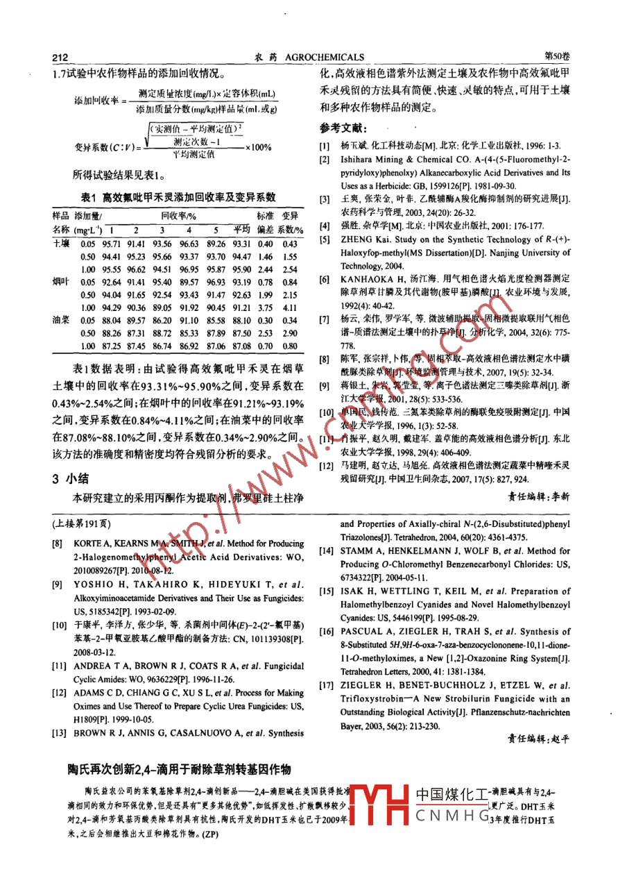 第50卷第3期Vl.50,No.32011年3月AGROCHEMICALSMar 2011研與開肟菌酯的合成工藝陸翠軍,劉建華,杜曉華浙江工業(yè)大學(xué)催化加氫研充中心,杭州310014)摘要:(方法]以苯酞為主要原料先與雙(三氯甲基)碳酸酯(BTC)開環(huán)反應(yīng)生成鄰氯甲基苯甲酰氯再與氰化鈉反應(yīng)得到鄰氯甲基苯甲酰氰,甲醇酯化然后與甲氧基胺鹽酸鹽肟化,最后與間三氟甲基苯乙酮肟縮合得到肟菌酯。[結(jié)果]合成路線5步總收率22%。[結(jié)論該工藝簡單經(jīng)濟(jì)條件溫和適合工業(yè)化生產(chǎn)。關(guān)鍵詞:殺菌劑;肟菌酯;鄰羥甲基苯甲酸內(nèi)酯;合成中圖分類號:TQ4603文獻(xiàn)標(biāo)志碼:A文章編號:10060413(201103018705Synthesis of TrifloxystrobinLU Cui-jun, LIU Jian-hua, DU Xiao-hua( Catalytic Hydrogenation Research Center, Zhejiang University of Technology, Hangzhou 310014, ChiAbstract: [Methods] Trifloxystrobin was synthesized using phthalide as a main starting material, by the reactions ofphthalide ring-opening with bis(trichloromethyl)carbonate to give o-chloromethylbenzoyl chloride, cyaniding to givea-chloromethylbenzoyl cyanide, esterifying with methanol, oximating with methoxyaminium chloride, and condensatingwith 3( trifluoromethyl)acetopheoxime. [Results] The total yield was 22% based on phthalide. [Conclusions] Thisprocess is simple, warm and economical, which is suitable for industrial scale manufacture.Key words: fungicide; trifloxystrobin; phthalide; synthesis肟菌酯 trifloxystrobin)是從天然產(chǎn)物 Strobilurins作為與甲氧基鹽酸鹽肟化,再經(jīng)N-溴丁二酰亞胺溴化得到2先導(dǎo)化合物成功開發(fā)的一種含氟殺菌劑。它能被植物蠟溴甲基-甲氧亞胺基苯乙酸甲酯,合成路線如下。質(zhì)層強(qiáng)烈吸附,對植物表面提供優(yōu)異的保護(hù)活性。主要用M,乙腰,cuBr2LBr于葡萄、蘋果、小麥、花生、香蕉、蔬菜等進(jìn)行莖葉處理、防治。肟菌酯在土壤中、水中可快速降解,對環(huán)境安全肟菌酯主要通過2-鹵代甲基-α-甲氧亞胺基苯乙酸酯與間三氟甲基苯乙酮肟縮合得到其中鹵素通常是氯或溴。按起始原料的不同,中間體2-鹵代甲基a-甲氧亞OOCH3胺基苯乙酸甲酯的合成方法可以歸納為以下10種。1)以鄰甲基苯乙酮為原料,經(jīng)高錳酸鉀的堿性氧化,與路線1)的不同之處在于2-氯甲基a-羰基苯乙酸甲甲醇酯化再與甲氧基鹽酸鹽肟化然后用N溴丁二酰亞酯通過步反應(yīng)得到看似簡化了反應(yīng)步驟但是第1步反胺溴化得到2-溴甲基—a-甲氧亞胺基苯乙酸甲酯,合成應(yīng)過程復(fù)雜,條件較苛刻且起始原料較昂貴不適合工業(yè)路線如下。化生產(chǎn)。3)以鄰甲基苯甲酸為原料,與亞硫酰氯回流得鄰甲基苯甲酰氯;與氰化鉀反應(yīng)得鄰甲基苯甲酰氰;然后酯化、肟化溴化得2-溴甲基a-甲氧亞胺基苯乙酸甲酯門,合成路線如下路線簡單,反應(yīng)條件溫和但是總收率較低,原子利用率不高;溴化過程難以控制容易產(chǎn)生二溴化合物。2)以鄰溴甲苯和乙二酰氯單甲酯為原料通過銅鋰試中國煤化工劑進(jìn)行偶聯(lián)反應(yīng)得到2-氯甲基α-羰基苯乙酸甲酯然后CNMHG牲較大的亞硫酰氯收稿日期:2010-12-15作者簡介:陸翠軍(1985),男江西九江人,碩士研究生。通訊作者:杜曉華。T:057188320430,E-mail::xiaohua@jut.edu.cn農(nóng)藥 AGROCHEMICALS產(chǎn)生有害氣體二氧化硫仍然采用了產(chǎn)率較低的溴化步驟第2步收率僅有30.3%,且該步驟中格式反應(yīng)難以控4)以鄰甲基苯甲醛為原料,5步反應(yīng)得2-溴甲基—a-甲制,形成的格式中間體不穩(wěn)定;第3步需要12MPa高壓反氧亞胺基苯乙酸甲酯,總收率16%,合成路線如下。應(yīng)對設(shè)備要求高8)以鄰羥甲基苯乙酸內(nèi)酯為原料,3步反應(yīng)得2-氯甲基a-甲氧亞胺基苯乙酸甲酯,總收率25%合成路線如下COo sx COOCHCH3OH路線較長,收率較低,溴代過程用到毒性較大的溴素亞硫酰氯四氯化碳5)以NN-二甲基芐胺和草酸二甲酯為起始原料,經(jīng)起始原料鄰羥甲基苯乙酸內(nèi)酯難以獲得,甲某化試劑3步反應(yīng)得2氯甲基-甲氧亞胺基苯乙酸甲酯,3步總收硫酸二甲酯毒性較大,亞硫酰氯使用過程中產(chǎn)生污染環(huán)境率55%,合成路線如下。的二氧化硫氣體。以鄰甲基苯乙酸甲酯為原料,經(jīng)二氧化硒氧化得2-氯甲基-α-羰基苯乙酸甲酯然后肟化、溴化得2-溴甲基—a-甲氧亞胺基苯乙酸甲酯,合成路線如下。O OCH3該路線相對簡單收率較高,但是第1步反應(yīng)需要用到貴的四丁基鋰,不利于工業(yè)化生產(chǎn)6)以鄰甲基苯乙腈為原料,5步反應(yīng)得2-氯甲基a-甲氧亞胺基苯乙酸甲酯,總收率239%,合成路線如下。該路線只在文獻(xiàn)中提到,沒有操作實(shí)例,并且原料二氧化硒價(jià)格較貴10)以鄰羥甲基苯甲酸內(nèi)酯為起始原料,4步反應(yīng)得2-氯甲基a-甲氧亞胺基苯乙酸甲酯,總收率46%,合成路NOCH3線如下。COOCH3COOCH第1步溴代反應(yīng)收率僅45%易產(chǎn)生多溴代物難以分離;第3步反應(yīng)需要無水無氧操作,且用到毒性較大的硫酸7)以鄰氯芐氯為原料,4步反應(yīng)得2-氯甲基α-甲氧亞苯酞開環(huán)生成酰氯基和氯甲基,省去了低收率的溴化胺基苯乙酸甲酯,總收率22%,合成路線如下?;蚵然襟E各步反應(yīng)條件溫和,總收率較高。但是該路線也存在較大的缺點(diǎn),開環(huán)反應(yīng)使用毒性較大的亞硫酰氯產(chǎn)生有害氣體二氧化硫,且后2步反應(yīng)需要使用過量氯化氫氣體對反應(yīng)設(shè)備的要求較高所以