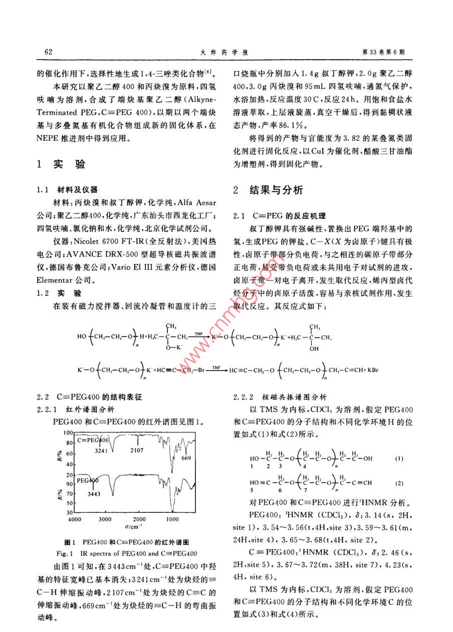 第33卷第6期火炸藥學報2010年12月 Chinese Journal of Explosives&. Propellants61端炔基聚乙二醇的合成及固化曲正陽,翟進賢,張晗昱,楊榮杰(北京理工大學材料科學與工程學院,北京100081)摘要:針對NEPE推進劑中端羥基聚醚和多異氰酸酯固化體系對水敏感的缺點,為獲得新的固化體系,依據(jù)點擊化學反應(click-chemistry-)原理,以聚乙二醇400和丙炔溴為原料,四氫呋喃為溶劑,在催化劑叔丁醇鉀存在下,溫度30C,反應時間24h,分離產物并真空干燥后,得到黏稠狀液態(tài)端炔基聚乙二醇,產率為86.1%用紅外、核磁共振和元素分析對端炔基聚乙二醇進行了表征。研究了端炔基聚乙二醇與疊氮類化合物的固化反應,表明其有望用作新的復合固體推進劑的固化體系。關鍵詞:有機化學;聚乙二醇;丙炔溴;端炔基聚乙二醇點擊化學固體推進劑中圖分類號:TJ55063文獻標志碼:A文章編號:1007-7812(201006-0061-04 Synthesis and Curing Research of Alkyne-Termin- Polyethylene Glycol QU Zheng-yang, ZHAI Jin-xian, ZHANG Han-yu, YANG Rong-ijie (School of Materials Science and Engineering, Beijing Institute of Technology, Beijing 100081, China) Abstract: The hydroxy-terminated polyether and multi-isocyanate curing system of the NEPE propellant is water- sensitive. Based on the click chemistry reaction and in order to obtain a new curing system, polyethylene glycol (PEG)and propargyl bromide were used as the raw materials, tetrahydrofuran as the solvent, the potassium tert- butanolthe as catalyst, temperature 30C, reaction time 24 hours, to synthesize alkyne-terminated PEG(C= PEG). The product was obtained as viscous liquid with a yield of 86. 1%. The C=PEG was characterized by IR NMR and EA. The reaction of the C=PEG with azido compound was studied, and expected to be able to form a new curing system used in the composite solid propellant. Key words: organic chemistry polyethylene glycol(peg) propargyl bromide; alkyne-termi- PEG; click chemistry: solid propellant徑之一是采用端炔基化合物和疊氮化合物組成的固引言化體系2點擊化學是一類反應容易進行、條件溫和、反應NEPE推進劑中的黏合劑一般采用聚乙二醇選擇性單一、沒有副反應的化學反應,實現(xiàn)碳雜原子PE)聚己酸內酯(PCL)或聚己酸內酯聚合物連接(C-X-C),是目前成本低、合成效率高的一種(PCP)、聚己二酸乙二醇酯(PGA)聚(環(huán)氧乙烷四強大且實用的合成方法。炔基(-C=CH)和疊氨基氫呋喃)共聚醚等,固化劑一般采用多官能度異氰酸(-N3)之間的反應屬于1,3偶極環(huán)加成反應,形成酯(N-100)、六次甲基二異氰酸酯(HDI)等此類的三唑環(huán)具有很高的穩(wěn)定性,是典型的點擊化學反固化體系中由于異氰酸酯化合物具有高度活性與應,為目前研究最為活躍的反應之一,已在藥物研水或有機酸能夠快速反應生成CO2在推進劑的固究、材料化學、生物綴合等領域得到廣泛應用6。端化過程中易形成很多氣孔使得推進劑的密度下降,炔基化合物與疊氮類化合物反應,在加熱條件下,生影響其力學性能,安全性和可靠性也下降解決的途成1,4-三唑和1,5-三唑類混合物。在有機銅離子收稿日期:2009-10-14;修回日期:2010-04-13基金項目:總裝預先研究重點基金項目(91028020510BQ109作者簡介:曲正陽(1984),男,博七研究生,從事固體推進劑黏合劑方向的研究。通訊作者:楊榮杰(1962-),男,教授,從事含能材料和高分子材料研究。62火炸藥學報第33卷第6期的催化作用下,選擇性地生成1,4-三唑類化合物.口燒瓶中分別加入1.4g叔丁醇鉀,2.0g聚乙二醇本研究以聚乙二醇400和丙炔溴為原料,四氫400,3.0g丙炔和95mL四氫呋喃,通氮氣保護,呋喃為溶劑,合成了端炔基聚乙二醇(Alkyne-水浴加熱,反應溫度30C,反應24h用飽和食鹽水 Terminated PEG,=Pe400),以期以兩個端炔溶液萃取,上層液旋蒸,真空干燥后,得到黏稠狀液基與多疊氮基有機化合物組成新的固化體系,在態(tài)產物產率86.1%NEPE推進劑中得到應用。將得到的產物與官能度為3.82的某疊氮類固化劑進行固化反應,以CuI為催化劑,醋酸三甘油酯1實驗為增塑劑,得到固化產物。1.1材料及儀器2結果與分析材料:丙炔溴和叔丁醇鉀,化學純, Alfa Aesar公司;聚乙二醇400,化學純,廣東汕頭市西龍化工廠;2.1C=PEG的反應機理四氫呋喃、氯化鈉和水,化學純,北京化學試劑公司。叔丁醇鉀具有強堿性,置換出PEG端羥基中的儀器: Nicolet67ft-i(全反射法)美國熱氫,生成PEG的鉀鹽C-X(X為鹵原子)鍵具有極電公司; AVANCE DRX-500型超導核磁共振波譜性,鹵原子帶部分負電荷,與之相連的碳原子帶部分儀,德國布魯克公司; Vario元素分析儀,德國正電荷,易受帶負電荷或未共用電子對試劑的進攻, Elementar公司。鹵原子帶一對電子離開,發(fā)生取代反應,烯丙型鹵代1.2實驗烴分子中的鹵原子活潑,容易與親核試劑作用,發(fā)生在裝有磁力攪拌器、回流冷凝管和溫度計的三取代反應。其反應式如下:HH HO fCH,-CH,-Of H+H,C-C-CH, THE +K-ofCH,-CH,-OfK"+H,C-C-CH.n o-K OH K-OfCH,-CHI-OfK+HC=C-CH,-Br-TE HC=C-CH-O fCH,-CH-O-CH,-C=CH+ KBr2.2C=PE400的結構表征2.2.2核磁共振譜圖分析2.2.1紅外譜圖分析以TMS為內標,CDCl3為溶劑,假定PEG400PEG400和C=PEG400的紅外譜圖見圖1和C=PEG400的分子結構和不同化學環(huán)境H的位100置如式(1)和式(2)所示。 80 C=6032412107669ho------4012342070344356750對PEG400和C=PEG400進行HNMR分析。400030000 PEG400:HNMR (CDCl3), 3.14(s,2H,site1),3.54~3.56(t,4h,site3),3.59~3.61(m,圖1PEG400和CPEG400的紅外譜圖24h,site4),3.65~3.68(t,4h,site2) Fig. IR spectra of PEG-400 and C=PEG400 C=PEG400: HNMR (CDCl3), 8: 2. 46(s,由圖1可知,在3443cm-1處,C=PEG