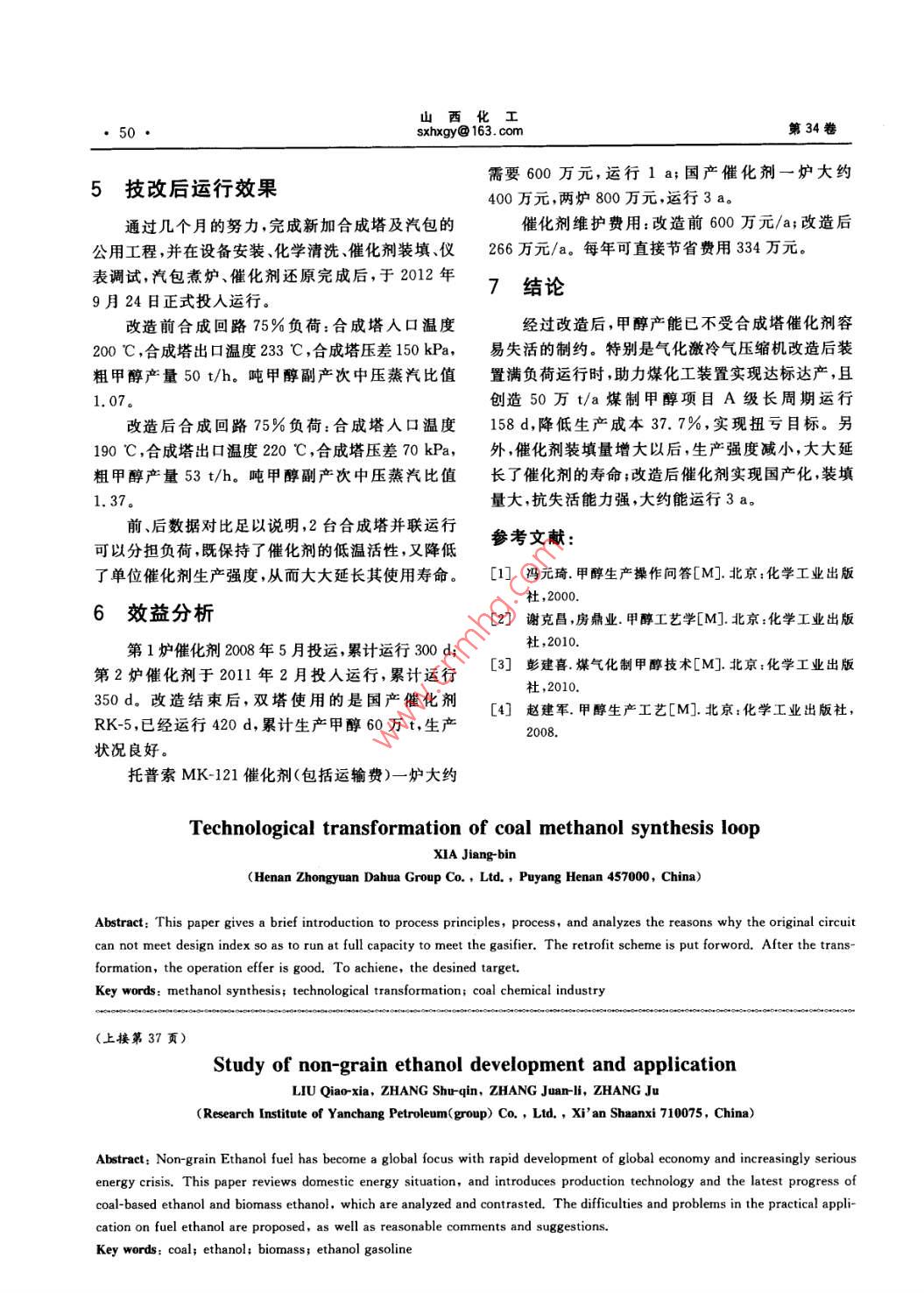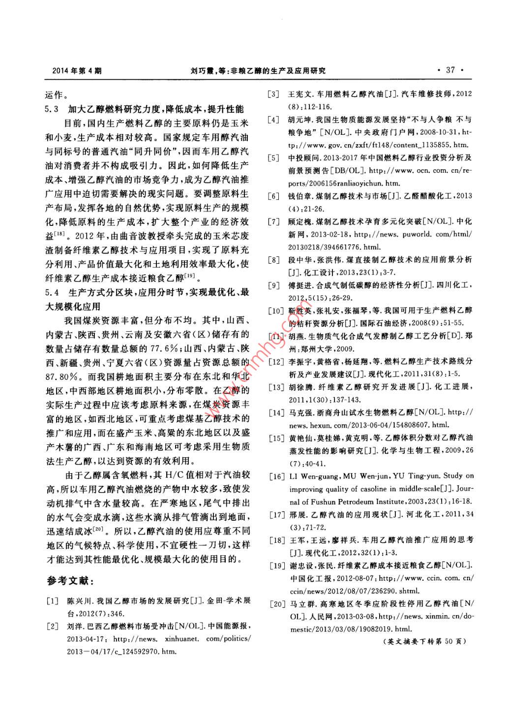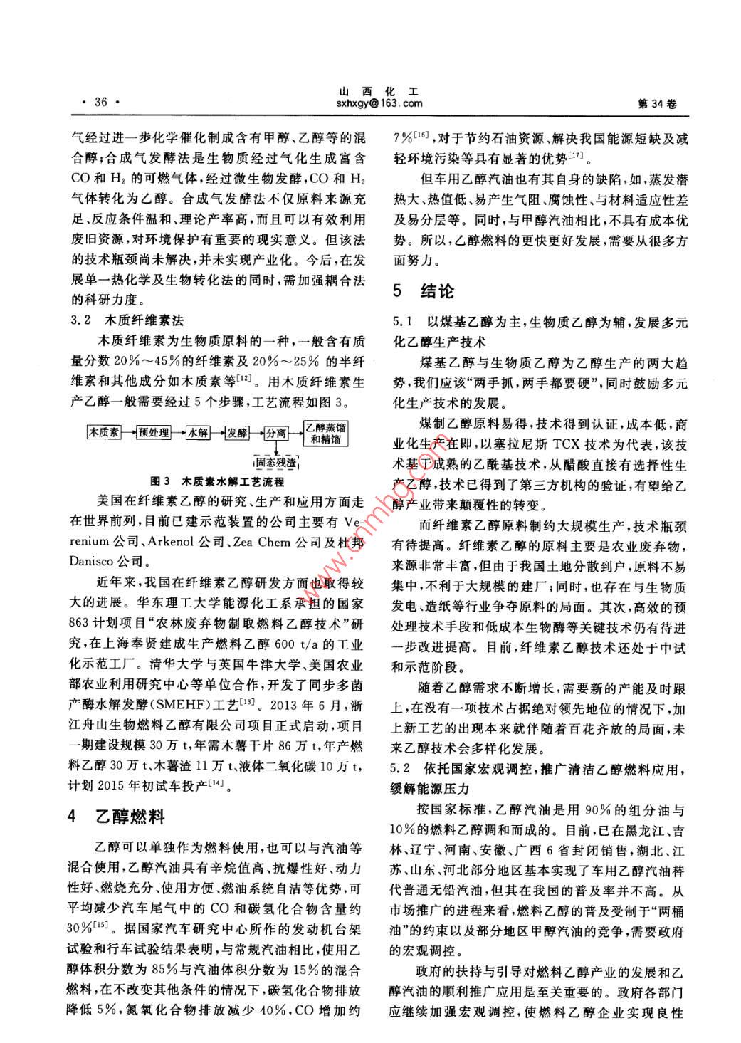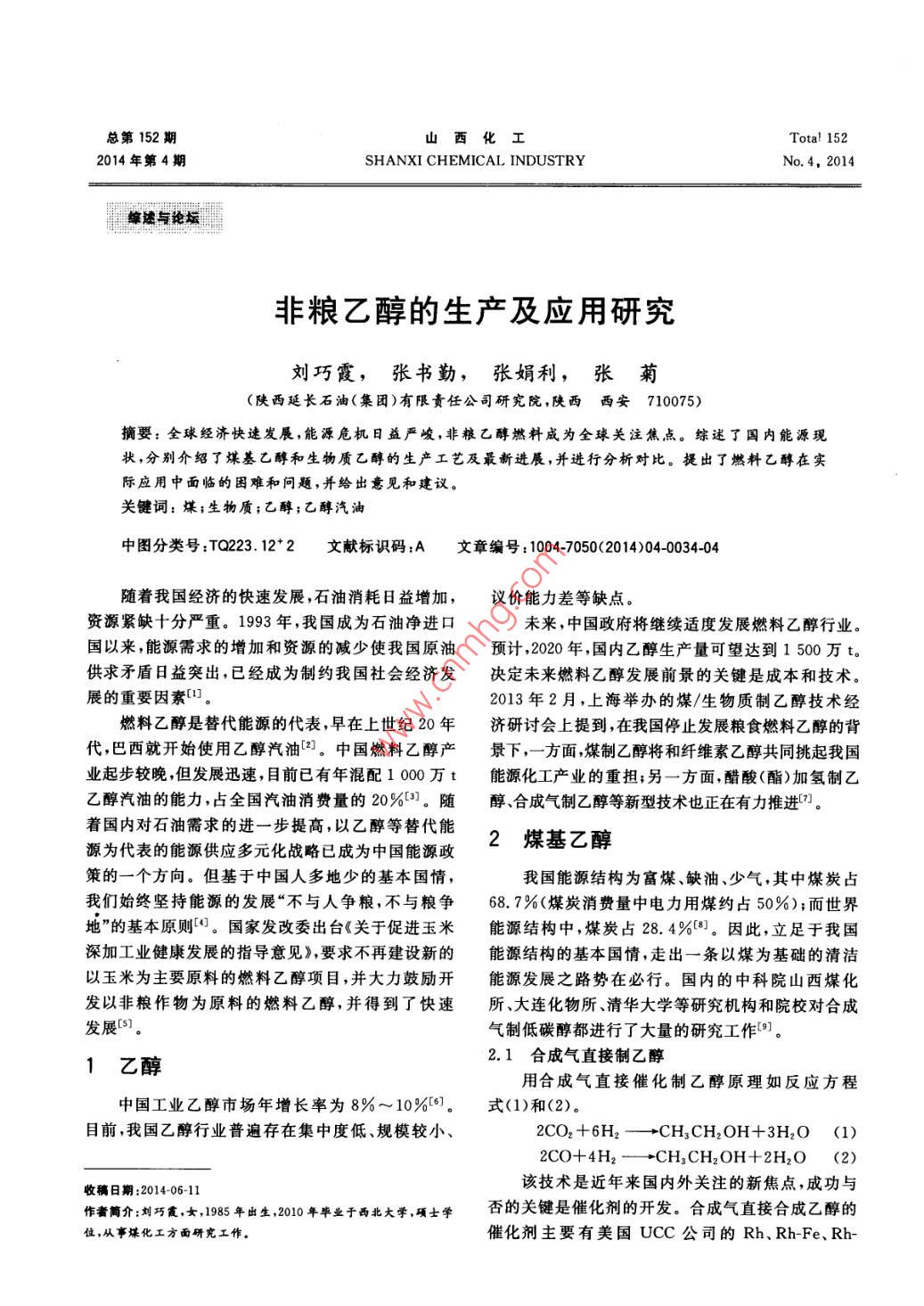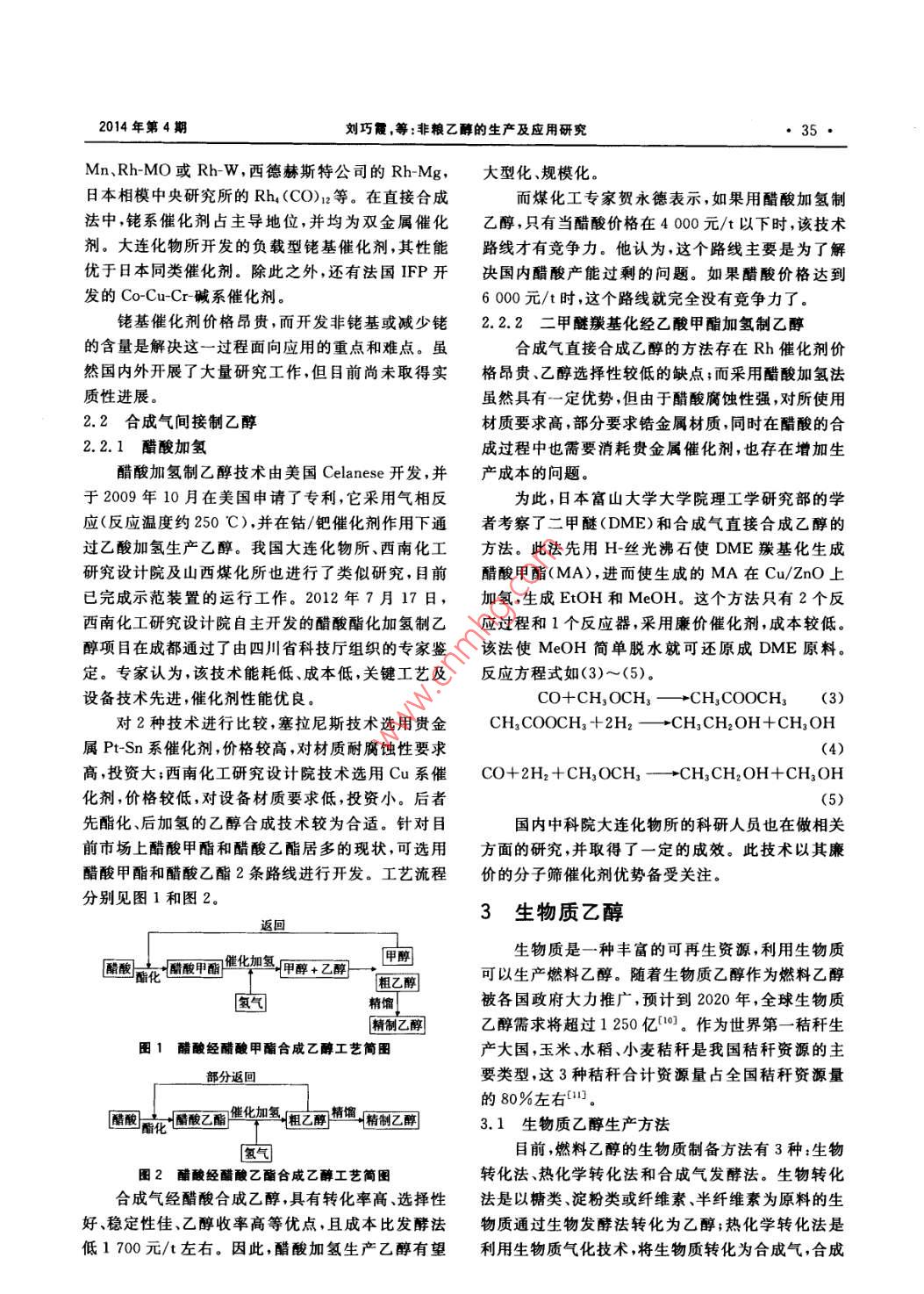 總第152期山西化工Total 12014年第4期SHANXI CHEMICAL INDUSTRYNo.4,2014排綜途與論壇非糧乙醇的生產(chǎn)及應(yīng)用研究劉巧霞,張書勤,張娟利,張菊(陜西延長石油(集團(tuán))有限責(zé)任公司研究院,陜西西安710075)摘要:全球經(jīng)濟(jì)快速發(fā)展,能源危機日益嚴(yán)峻,非糧乙醇燃料成為全球關(guān)注焦點。綜述了國內(nèi)能源現(xiàn)狀,分別介紹了煤基乙醇和生物質(zhì)乙醇的生產(chǎn)工藝及最新進(jìn)展,并進(jìn)行分析對比。提出了燃料乙醇在實際應(yīng)用中面臨的困難和問題,并給出意見和建議。關(guān)鍵詞:煤;生物質(zhì);乙醇;乙醇汽油中圖分類號:TQ223.122文獻(xiàn)標(biāo)識碼:A文章編號:1004-7050(2014)04003404隨著我國經(jīng)濟(jì)的快速發(fā)展,石油消耗日益增加,議價能力差等缺點。資源緊缺十分嚴(yán)重。1993年,我國成為石油凈進(jìn)口未來,中國政府將繼續(xù)適度發(fā)展燃料乙醇行業(yè)國以來,能源需求的增加和資源的減少使我國原油預(yù)計,2020年,國內(nèi)乙醇生產(chǎn)量可望達(dá)到1500萬t。供求矛盾日益突出,已經(jīng)成為制約我國社會經(jīng)濟(jì)發(fā)決定未來燃料乙醇發(fā)展前景的關(guān)鍵是成本和技術(shù)。展的重要因素(。2013年2月,上海舉辦的煤/生物質(zhì)制乙醇技術(shù)經(jīng)燃料乙醇是替代能源的代表,早在上世紀(jì)20年濟(jì)研討會上提到,在我國停止發(fā)展糧食燃料乙醇的背代,巴西就開始使用乙醇汽油2。中國燃料乙醇產(chǎn)景下,一方面煤制乙醇將和纖維素乙醇共同挑起我國業(yè)起步較晚,但發(fā)展迅速,目前已有年混配1000萬t能源化工產(chǎn)業(yè)的重?fù)?dān);另一方面,醋酸(酯)加氫制乙乙醇汽油的能力古全國汽油消費量的20%。隨醇合成氣制乙醇等新型技術(shù)也正在有力推進(jìn)?。著國內(nèi)對石油需求的進(jìn)一步提高,以乙醇等替代能源為代表的能源供應(yīng)多元化戰(zhàn)略已成為中國能源政2煤基乙醇策的一個方向。但基于中國人多地少的基本國情,我國能源結(jié)構(gòu)為富煤、缺油、少氣,其中煤炭占我們始終堅持能源的發(fā)展“不與人爭糧,不與糧爭68.7%(煤炭消費量中電力用煤約占50%);而世界地”的基本原則4。國家發(fā)改委出臺《關(guān)于促進(jìn)玉米能源結(jié)構(gòu)中,煤炭占28.4%8。因此,立足于我國深加工業(yè)健康發(fā)展的指導(dǎo)意見》要求不再建設(shè)新的能源結(jié)構(gòu)的基本國情,走出一條以煤為基礎(chǔ)的清潔以玉米為主要原料的燃料乙醇項目,并大力鼓勵開能源發(fā)展之路勢在必行。國內(nèi)的中科院山西煤化發(fā)以非糧作物為原料的燃料乙醇,并得到了快速所、大連化物所清華大學(xué)等研究機構(gòu)和院校對合成發(fā)展氣制低碳醇都進(jìn)行了大量的研究工作9。1乙醇2.1合成氣直接制乙醇用合成氣直接催化制乙醇原理如反應(yīng)方程中國工業(yè)乙醇市場年增長率為8%~10%61。式(1)和(2)。目前,我國乙醇行業(yè)普遍存在集中度低、規(guī)模較小2CO2+6H2-CH3 CH, OH+3H,O (1)2C0+4H2 -CH3 CH2 OH+2H,0(2)收稿日期:201406-11該技術(shù)是近年來國內(nèi)外關(guān)注的新焦點,成功與作者茼介:劉巧霞,女,1985年幽生,2010年畢業(yè)于西北大季,項士學(xué)否的關(guān)鍵是催化劑的開發(fā)。合成氣直接合成乙醇的位,從事煤化工方面研究工作。催化劑主要有美國UCC公司的Rh、RhFe、Rh2014年第4期劉巧霞,等:非糧乙醇的生產(chǎn)及應(yīng)用研究35Mn、RhMO或RhW,西德赫斯特公司的RhMg,大型化、規(guī)?;毡鞠嗄V醒胙芯克腞h4(CO12等。在直接合成而煤化工專家賀永德表示,如果用醋酸加氫制法中,銠系催化劑占主導(dǎo)地位,并均為雙金屬催化乙醇只有當(dāng)醋酸價格在4000元/t以下時,該技術(shù)劑。大連化物所開發(fā)的負(fù)載型銠基催化劑其性能路線才有競爭力。他認(rèn)為這個路線主要是為了解優(yōu)于日本同類催化劑。除此之外,還有法國IFP開決國內(nèi)醋酸產(chǎn)能過剩的問題。如果醋酸價格達(dá)到發(fā)的 Co-Cu-Cr-堿系催化劑。6000元/t時,這個路線就完全沒有競爭力了銠基催化劑價格昂貴,而開發(fā)非銠基或減少銠2.2.2二甲醚羰基化經(jīng)乙酸甲酯加氫制乙醇的含量是解決這一過程面向應(yīng)用的重點和難點。雖合成氣直接合成乙醇的方法存在Rh催化劑價然國內(nèi)外開展了大量研究工作但目前尚未取得實格昂貴、乙醇選擇性較低的缺點;而采用醋酸加氫法質(zhì)性進(jìn)展。雖然具有一定優(yōu)勢,但由于醋酸腐蝕性強,對所使用2.2合成氣間接制乙醇材質(zhì)要求高,部分要求鋯金屬材質(zhì),同時在醋酸的合2.2.1醋酸加氫成過程中也需要消耗貴金屬催化劑,也存在增加生醋酸加氫制乙醇技術(shù)由美國 Celanese開發(fā),并產(chǎn)成本的問題。于2009年10月在美國申請了專利,它采用氣相反為此,日本富山大學(xué)大學(xué)院理工學(xué)研究部的學(xué)應(yīng)(反應(yīng)溫度約250℃),并在鈷/鈀催化劑作用下通者考察了二甲醚(DME)和合成氣直接合成乙醇的過乙酸加氫生產(chǎn)乙醇。我國大連化物所、西南化工方法。此法先用H絲光沸石使DME羰基化生成研究設(shè)計院及山西煤化所也進(jìn)行了類似研究,目前醋酸甲酯(MA),進(jìn)而使生成的MA在Cu/ZnO上已完成示范裝置的運行工作。2012年7月17日,加氫,生成EtOH和MeOH。這個方法只有2個反西南化工研究