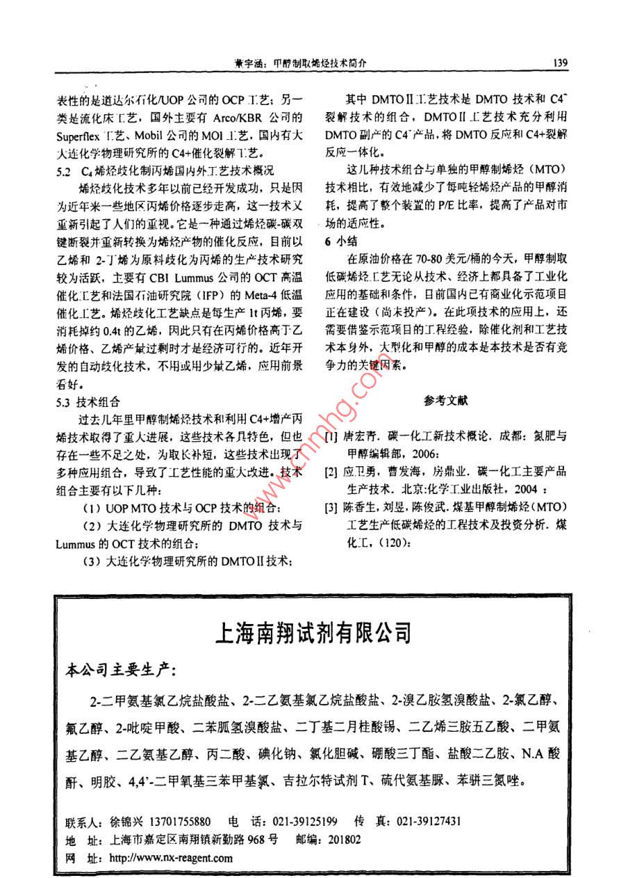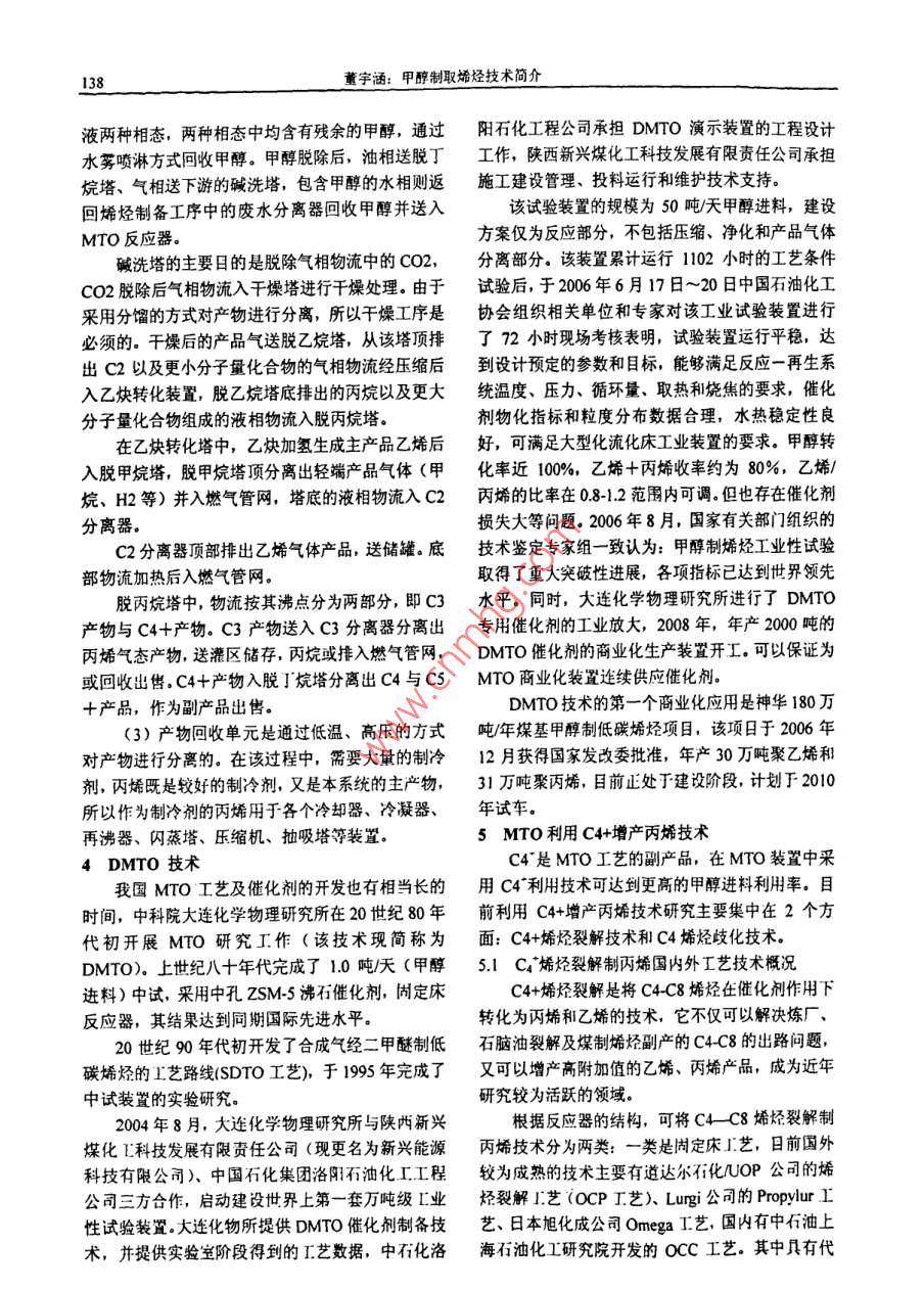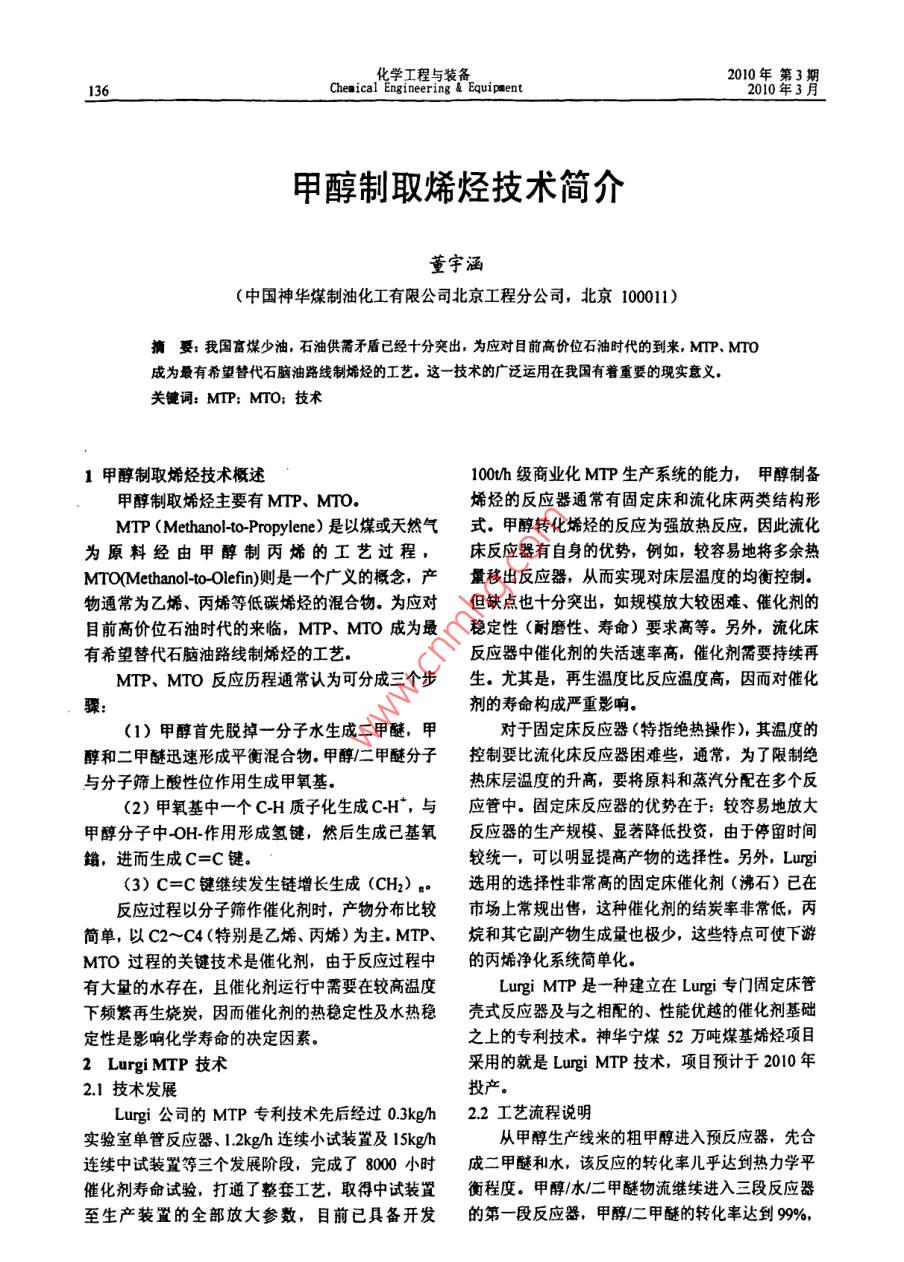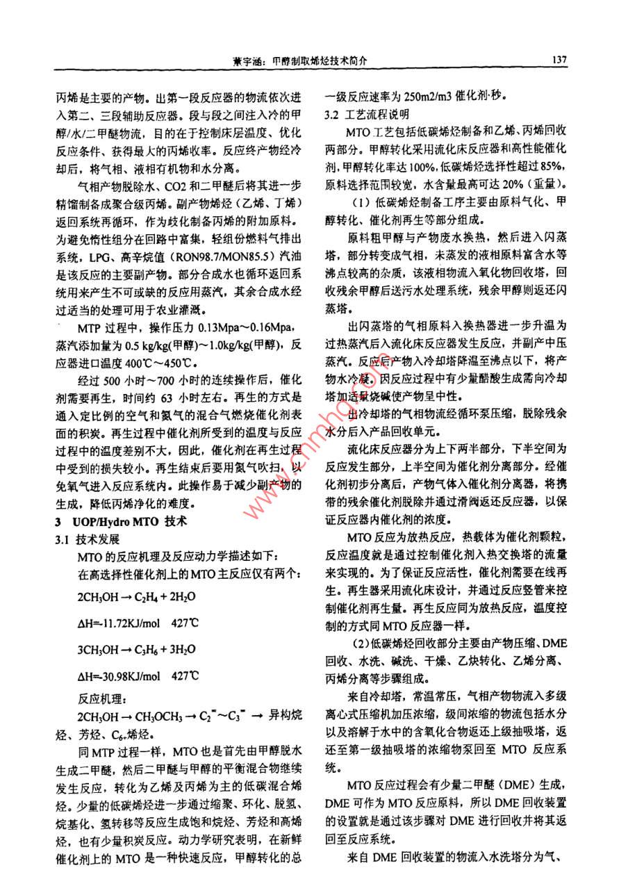 化學(xué)工程與裝備Eouiment2010年第3期136Chenical Engineering & Equipo ent2010年3月甲醇制取烯烴技術(shù)簡介董宇涵(中國神華煤制油化工有限公司北京工程分公司,北京10011)摘要: 我國富煤少油,石油供需矛盾已經(jīng)十分突出,為應(yīng)對目前高價位石油時代的到來, MTP. MTO成為最有希望替代石腦油路線制烯烴的工藝。這-技術(shù)的廣泛運(yùn)用在我國有著重要的現(xiàn)實意義。關(guān)鍵詞: MTP; MTO;技術(shù)1甲醇制取烯烴技術(shù)概述100t/h級商業(yè)化MTP生產(chǎn)系統(tǒng)的能力,甲 醇制備甲醇制取烯烴主要有MTP、MTO.烯烴的反應(yīng)器通常有固定床和流化床兩類結(jié)構(gòu)形MTP (Methanol-to-Propylene)是以煤或天然氣式.甲醇轉(zhuǎn)化烯烴的反應(yīng)為強(qiáng)放熱反應(yīng),因此流化為原料經(jīng)由甲醇制丙烯的工藝過程,床反應(yīng)器有自身的優(yōu)勢,例如,較容易地將多余熱MTO(Methanol-to-Olefin)則是- 一個廣義的概念, 產(chǎn)量移出反應(yīng)器,從而實現(xiàn)對床層溫度的均衡控制。物通常為乙烯、丙烯等低碳烯烴的混合物。為應(yīng)對但缺點也十分突出,如規(guī)模放大較困難、催化劑的目前高價位石油時代的來臨,MTP、MTO成為最穩(wěn)定性(耐磨性、壽命)要求高等。另外,流化床有希望替代石腦油路線制烯烴的工藝。反應(yīng)器中催化劑的失活速率高,催化劑需要持續(xù)再MTP、MTO反應(yīng)歷程通常認(rèn)為可分成三個步生。尤其是,再生溫度比反應(yīng)溫度高,因而對催化驟:劑的壽命構(gòu)成嚴(yán)重影響。(1)甲醇首先脫掉-分子水生成二甲醚,甲對于固定床反應(yīng)器(特指絕熱操作),其溫度的醇和二甲醚迅速形成平衡混合物.甲醇/二甲醚分子控制要比流化床反應(yīng)器困難些,通常,為了限制絕與分子篩上酸性位作用生成甲氧基。熱床層溫度的升高,要將原料和蒸汽分配在多個反(2)甲氧基中一個C-H質(zhì)子化生成C-H*,與應(yīng)管中。固定床反應(yīng)器的優(yōu)勢在于:較容易地放大甲醇分子中-OH-作用形成氫鍵,然后生成已基氧反應(yīng)器的生產(chǎn)規(guī)模、顯著降低投資,由于停留時間錯,進(jìn)而生成C=C鍵.較統(tǒng)- -,可以明顯提高產(chǎn)物的選擇性。另外,Lurgji(3) C=C鍵繼續(xù)發(fā)生鏈增長生成(CH2) 。選用的選擇性非常高的固定床催化劑(沸石)已在反應(yīng)過程以分子篩作催化劑時,產(chǎn)物分布比較市場上常規(guī)出售,這種催化劑的結(jié)炭率非常低,丙簡單,以C2~C4 (特別是乙烯、丙烯)為主. MTP、.烷和其它副產(chǎn)物生成量也極少,這些特點可使下游MTO過程的關(guān)鍵技術(shù)是催化劑,由于反應(yīng)過程中的丙烯凈化系統(tǒng)簡單化。有大量的水存在,且催化劑運(yùn)行中需要在較高溫度Lungi MTP是- -種建 立在Lungi專門固定床管下頻繁再生燒炭,因而催化劑的熱穩(wěn)定性及水熱穩(wěn)殼式反應(yīng)器及與之相配的、性能優(yōu)越的催化劑基礎(chǔ),定性是影響化學(xué)壽命的決定因素。之.上的專利技術(shù)。神華寧煤52萬噸煤基烯烴項目2 Lurgi MTP技術(shù)采用的就是Lungi MTP技術(shù),項目預(yù)計于2010年2.1技術(shù)發(fā)展投產(chǎn)。Lurgi公司的MTP專利技術(shù)先后經(jīng)過0.3kg/h2.2工藝流程說明實驗室單管反應(yīng)器、1.2kg/h連續(xù)小試裝置及l(fā)5kgh從甲醇生產(chǎn)線米的粗甲醇進(jìn)入預(yù)反應(yīng)器,先合連續(xù)中試裝置等三個發(fā)展階段,完成了8000 小時成二甲醚和水,該反應(yīng)的轉(zhuǎn)化率兒乎達(dá)到熱力學(xué)平催化劑壽命試驗,打通了整套工藝,取得中試裝置衡程度。甲醇/水/二甲醚物流繼續(xù)進(jìn)入三段反應(yīng)器至生產(chǎn)裝置的全部放大參數(shù),目前已具備開發(fā)的第- -段反應(yīng)器,甲醇/二甲醚的轉(zhuǎn)化率達(dá)到99%,董字涵:甲醇制取烯烴技術(shù)簡介137丙烯是主要的產(chǎn)物。出第一段反應(yīng)器的物流依次進(jìn)一級反應(yīng)速率為250m2/m3催化劑秒。入第二、三段輔助反應(yīng)器。段與段之間注入冷的甲3.2工藝流程說明醇/水/二甲醚物流,目的在于控制床層溫度、優(yōu)化MTO工藝包括低碳烯烴制備和乙烯、丙烯回收反應(yīng)條件、獲得最大的丙烯收率。反應(yīng)終產(chǎn)物經(jīng)冷兩部分。甲醇轉(zhuǎn)化采用流化床反應(yīng)器和高性能催化卻后,將氣相、液相有機(jī)物和水分離。劑,甲醇轉(zhuǎn)化率達(dá)100%,低碳烯烴選擇性超過85%,氣相產(chǎn)物脫除水、cO2和二甲醚后將其進(jìn)一步原料選抒范圍較寬,水含量最高可達(dá)20% (重量)。精餾制備成聚合級丙烯。副產(chǎn)物烯烴(乙烯、丁烯)(1)低碳烯烴制備工序主要由原料氣化、甲返回系統(tǒng)再循環(huán),作為歧化制備丙烯的附加原料。醇轉(zhuǎn)化、催化劑再生等部分組成。為避免惰性組分在回路中富集,輕組份燃料氣排出原料粗甲醇與產(chǎn)物廢水換熱,然后進(jìn)入閃蒸系統(tǒng),LPG、高辛烷值(RON98.7MON85.5)汽油塔,部分轉(zhuǎn)變成氣相,未蒸發(fā)的液相原料富含水等是該反應(yīng)的主要副產(chǎn)物。部分合成水也循環(huán)返回系沸點較高的雜質(zhì),該液相物流入氧化物回收塔,回統(tǒng)用來產(chǎn)生不可或缺的反應(yīng)用蒸汽,其余合成水經(jīng)收殘余甲醇后送污水處理系統(tǒng),殘余甲醇則返還閃過適當(dāng)?shù)奶幚砜捎糜谵r(nóng)業(yè)灌溉。蒸塔。MTP過程中,