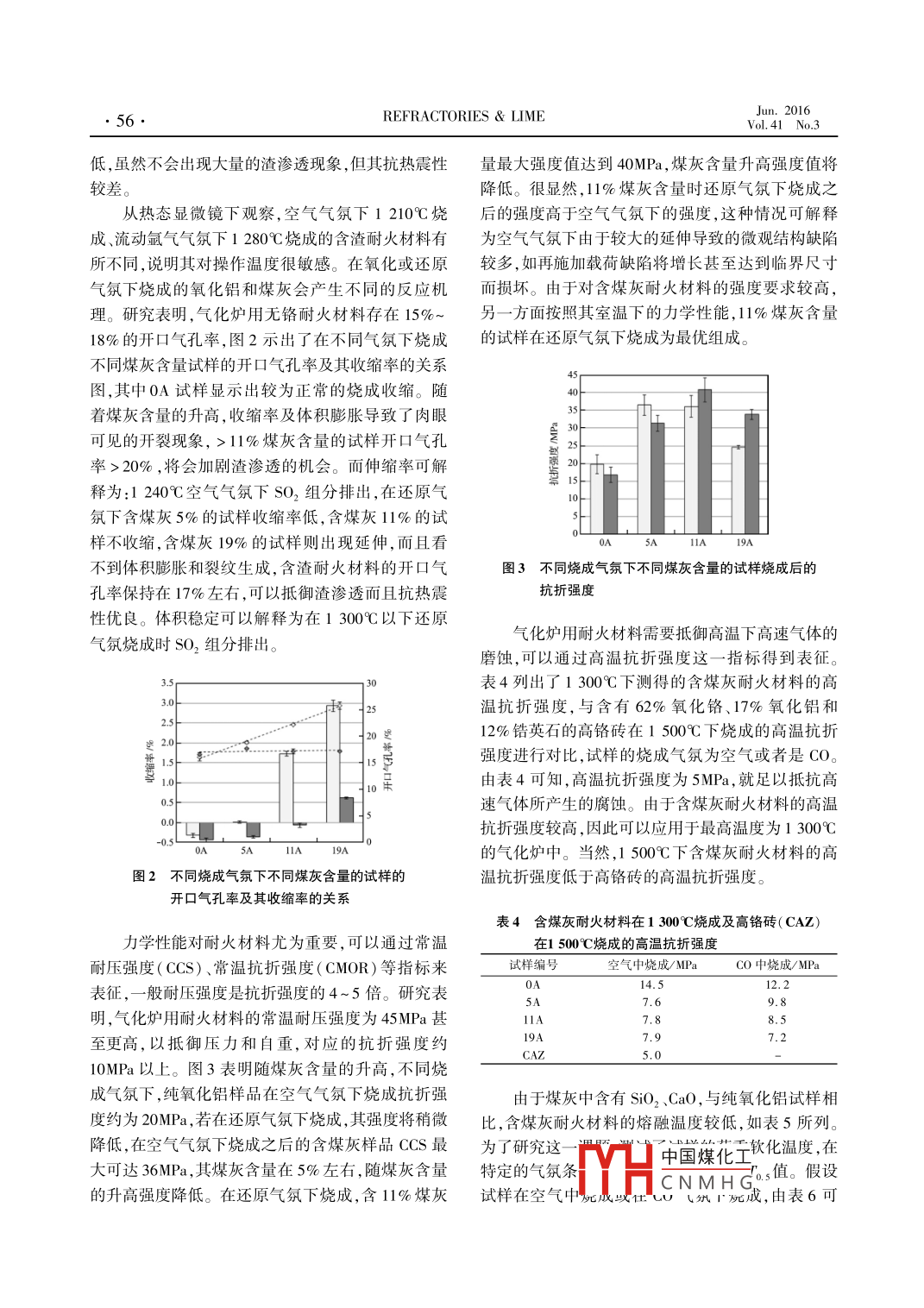 Jun. 2016REFRACTORIES & LIMEVol.41 No.3含渣耐火材料在氣化爐中的應(yīng)用摘要:氣化工藝是指將原料碳、氧氣及水反應(yīng)生產(chǎn)合成氣的過(guò)程,新氣化工藝技術(shù)將爐壁內(nèi)襯的溫度降至了1 300C ,因此,從經(jīng)濟(jì)效益和生態(tài)效益出發(fā),目前使用的高鉻材料可被無(wú)鉻材料所取代。本研究將含有不同褐煤灰含量的氧化鋁質(zhì)澆注料在不同氣氛中燒成,并在與氣化工藝類(lèi)似的工況條件下通過(guò)熱力學(xué)性能、相組成和抗熱震性進(jìn)行了分析。發(fā)現(xiàn)含11%煤灰并在還原氣氛中燒成的試樣,其力學(xué)性能和抗渣性能較好,在1 400C下作為氣化爐內(nèi)襯爐壁使用很有發(fā)展前景。關(guān)鍵詞:氧化鋁質(zhì)耐火材料;抗熱震性;侵蝕;氣化中圖分類(lèi)號(hào): TQ175.719文獻(xiàn)標(biāo)識(shí)碼: A文章編號(hào): 1673-7792 (2016) 03-0054-08在實(shí)驗(yàn)室條件下,氧化鉿、鉿硅酸鹽、硅酸鋯具有較1介紹.好的抗侵蝕性。此外,還研究了垃圾焚燒爐中使用化石燃料,如天然氣和原油- -般用于發(fā)電,但也的SiC材料的侵蝕機(jī)理和耐火材料在此工況下的反可以作為基礎(chǔ)的工業(yè)材料使用。未來(lái)由于化石燃料應(yīng)。的需求量將會(huì)不足,煤作為碳源將走向前列,使用焦新型的氣化工藝已經(jīng)發(fā)展至低的爐溫,其操作炭作為碳源的一種氣化工藝將是不可或缺的工藝過(guò)溫度在1300~14009C之間,這樣給經(jīng)濟(jì)型和生態(tài)程。以氣化爐為容器,褐煤等含碳材料、氧氣及水在友好型新材料創(chuàng)造了很大機(jī)會(huì),這種材料要具備較1 300~1 600C、壓力約20~40bar還原氣氛下可生好的抗熱震性能,在高溫、還原氣氛、高堿度以及壓成合成氣。另外,新技術(shù)需要在今后的一段時(shí)間提力環(huán)境下具有較好的抗渣性。高效率、增加靈活性減少CO2排放,并保持氣化爐礬土是廣泛使用的廉價(jià)耐火原料,其以較好的的可持續(xù)性。機(jī)械性能、良好的抗酸堿侵蝕性著稱(chēng),然而實(shí)驗(yàn)結(jié)果在氣化過(guò)程中耐火材料內(nèi)襯在高溫下保護(hù)著氣表明,氧化鋁和褐煤渣會(huì)發(fā)生反應(yīng)形成低熔相并導(dǎo)化爐鋼殼,使其免受熱震損毀、固態(tài)顆粒煤渣的磨致顯微結(jié)構(gòu)的損壞。改善氧化鋁耐火材料抗渣侵蝕蝕、蠕變以及堿性和堿土金屬組成的熔渣的侵蝕。性能將是-一個(gè)較好的研究課題,可以加人褐煤渣制總的來(lái)講,耐火材料與這些組分的接觸引起了低熔成所謂的含渣耐火材料,作為在1 300C還原氣氛下物形成以及耐火材料向熔渣中的溶解或者熱面上結(jié)使用的內(nèi)襯耐火材料,總的來(lái)說(shuō)含煤渣耐火材料是合相的溶解,導(dǎo)致耐火材料的剝落。這是因?yàn)槟突饛U料中加人CaO SiO2 、Al203以及不同的堿性金屬材料與熔渣反應(yīng)形成了新的固相,其密度較低、會(huì)導(dǎo)氧化物,然而,其特定的組成受到渣產(chǎn)生的工藝過(guò)程.致體積膨脹和大量耐火材料的不規(guī)則剝蝕。的影響,比如煉鋼中產(chǎn)生的渣含有重金屬鉻和釩,燃上世紀(jì)70~ 80年代,在氣化工藝中使用了大量煤或煤氣化過(guò)程產(chǎn)生的渣含有更多的堿金屬,硫和的耐火材料進(jìn)行評(píng)價(jià)試驗(yàn),主要包括硅酸鋁、高鋁、氧化鐵則取決于原煤的組成。目前有兩種生產(chǎn)含渣鉻-鎂鋁尖晶石、鋁-鎂、鋁-鉻和碳化硅材料等。試耐火材料的工藝:一種是在工藝中充填熔渣鑄造成驗(yàn)研究和工業(yè)生產(chǎn)證明:由于氧化鉻在褐煤渣中具.磚,冷卻之后可做為廉價(jià)的基礎(chǔ)建筑材料;另一種是有較低的溶解度,只有內(nèi)襯使用75% (質(zhì)量)的氧化來(lái) 自燃煤電廠(chǎng)過(guò)濾器的煤灰,Schiie 等研究了水泥鉻的材料才能較好的滿(mǎn)足要求,另一方面,氧化鉻與和火山灰混凝物,加入的煤灰改善了水泥抗氯化物渣中的鐵反應(yīng)形成鉻鐵尖晶石可以封閉鉻磚的表及硫酸鹽的侵蝕性。面,阻止渣的進(jìn)--步滲透,但是,形成的鉻鐵尖晶石加入大量煤渣的耐火澆注料在高溫下的使用是層卻極易剝落。有前途的,尤其是化學(xué)成分上與褐煤渣相類(lèi)似的煤耐火材料中加人磷酸鹽化合物能改善其抗渣渣加入后耐火中國(guó)煤化工高,這是由 于性,并降低渣對(duì)材料的滲透。為了降低生產(chǎn)成本,提侵蝕介質(zhì)褐煤此氣化過(guò)程高其與環(huán)境的相容性,很多學(xué)者開(kāi)始研究無(wú)鉻材料:中耐火材料的|YHCNMH;頂件以。但定,這一理論是建立在2016年6月第41卷第3期耐火與石灰●55●實(shí)驗(yàn)室條件下的,而且這種方法只適用于渣成分不熱震循環(huán)5次之后測(cè)試了殘余強(qiáng)度保持率。假設(shè)試會(huì)嚴(yán)重降低材料熔融溫度(形成低溶物)前提下的。樣是在還原氣氛下燒成的,急冷實(shí)驗(yàn)的熱源來(lái)自于為了檢驗(yàn)這一-課題的可行性,研究了氧化鋁材料在碳化床。另外采用含有CuKax衍射的X射線(xiàn)衍射儀還原氣氛下使用時(shí)的性能,尤其是熱力學(xué)性能。測(cè)試了4種樣條試樣的相組成。采用坩堝法研究其抗渣性能,加入30g酸性褐2材料和研究方法煤灰,分別于1300°C、3h 和1450熱處理;而且模為了制得不同的樣品,按照Fuak和Dinger的擬了氣化過(guò)程中渣從內(nèi)襯壁上流下的過(guò)程,即“指粒度分布模型設(shè)