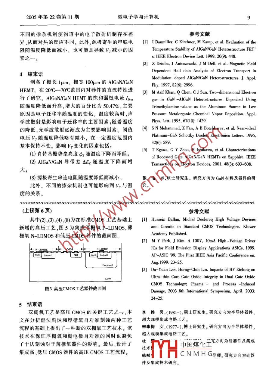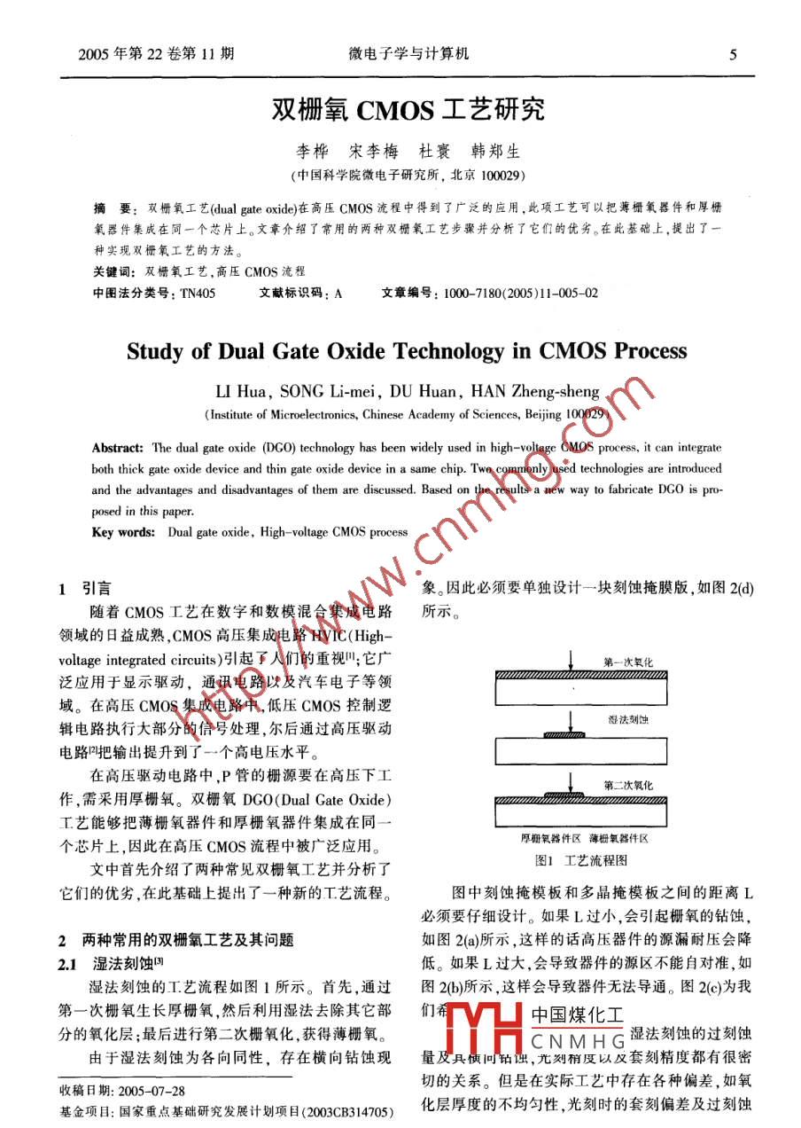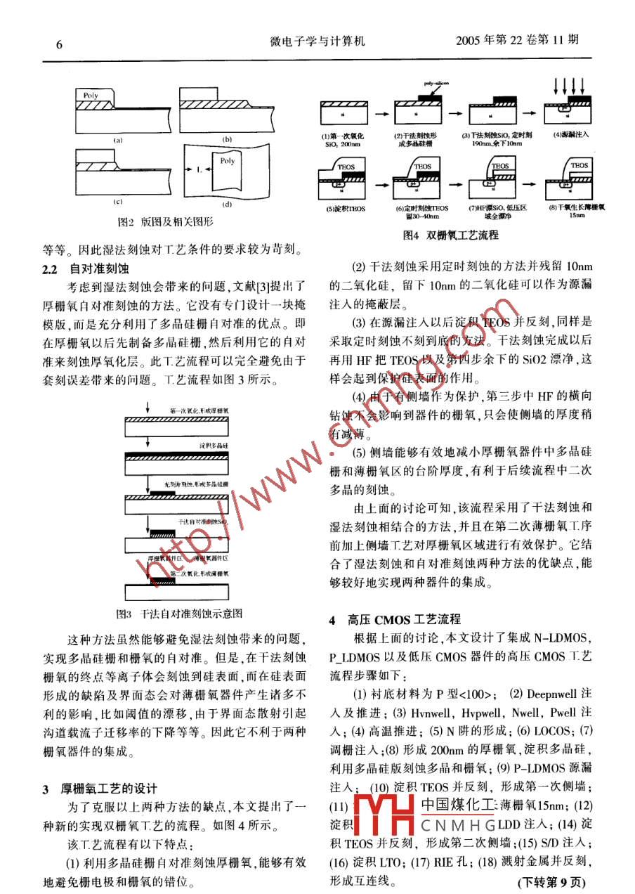 2005年第22卷第11期微電子學(xué)與計(jì)算機(jī)雙柵氧CMOS工藝研究李樺宋李梅杜寰韓鄭生(中國科學(xué)院微電子研究所,北京100029)要:雙柵氧工藝( dual gate oxide)在高壓CMOS流程中得到了廣泛的應(yīng)用,此項(xiàng)工藝可以把薄柵氧器件和厚柵氧器件集成在同一個芯片上。文章介紹了常用的兩種雙柵氧工藝步驟并分析了它們的優(yōu)劣。在此基礎(chǔ)上,提出了一種實(shí)現(xiàn)雙柵氧工藝的方法關(guān)鍵詞:雙柵氧工藝,高壓CMOS流程中圖法分類號:TN40文獻(xiàn)標(biāo)識碼:A文章編號:1000-7180(2005)11-00502Study of Dual Gate Oxide Technology in CMOS ProcessLI Hua, SONG Li-mei, DU Huan, Han Zheng-sheng(Institute of Microelectronics, Chinese Academy of Sciences, Beijing 100029)Abstract: The dual gate oxide(DGO) technology has been widely used in high-voltage CMOS process, it can integrateboth thick gate oxide device and thin gate oxide device in a same chip. Two commonly used technologies are introducedand the advantages and disadvantages of them are discussed. Based on the results a new way to fabricate DGO is pro-posed in thisKey words: Dual gate oxide, High-voltage CMOS process1引言象。因此必須要單獨(dú)設(shè)計(jì)一塊刻蝕掩膜版,如圖2(d隨著CMOS工藝在數(shù)字和數(shù)?;旌霞呻娐匪?。領(lǐng)域的日益成熟,CMOS高壓集成電路HVC(Highroltage integrated circuits)引起了人們的重視";它廣第一次氧化泛應(yīng)用于顯示驅(qū)動,通訊電路以及汽車電子等領(lǐng)域。在高壓CMOS集成電路中,低壓CMOS控制邏輯電路執(zhí)行大部分的信號處理,爾后通過高壓驅(qū)動濕法刻蝕電路把輸出提升到了一個高電壓水平。在高壓驅(qū)動電路中,P管的柵源要在高壓下工第二次氧化作,需采用厚柵氧。雙柵氧DGO( Dual Gate Oxide)工藝能夠把薄柵氧器件和厚柵氧器件集成在同個芯片上,因此在高壓CMOS流程中被廣泛應(yīng)用厚柵氧器件區(qū)薄櫥氧器件區(qū)文中首先介紹了兩種常見雙柵氧工藝并分析了圖1工藝流程圖它們的優(yōu)劣,在此基礎(chǔ)上提出了一種新的工藝流程。圖中刻蝕掩模板和多晶掩模板之間的距離L必須要仔細(xì)設(shè)計(jì)。如果L過小,會引起柵氧的鉆蝕2兩種常用的雙柵氧工藝及其問題如圖2(a)所示,這樣的話高壓器件的源漏耐壓會降21濕法刻蝕國低。如果L過大,會導(dǎo)致器件的源區(qū)不能自對準(zhǔn),如濕法刻蝕的工藝流程如圖1所示。首先,通過圖2(b)所示,這樣會導(dǎo)致器件無法導(dǎo)通。圖2(c)為我第一次柵氧生長厚棚氧然后利用濕法去除其它部們V凵中國煤化工分的氧化層;最后進(jìn)行第二次柵氧化,獲得薄柵氧。CNMHG濕法刻蝕的過刻蝕由于濕法刻蝕為各向同性,存在橫向鉆蝕現(xiàn)量及具憤叫蝕,元刻稍度以反套刻精度都有很密收稿日期:2005-07-28切的關(guān)系。但是在實(shí)際工藝中存在各種偏差,如氧基金項(xiàng)目:國家重點(diǎn)基礎(chǔ)研究發(fā)展計(jì)劃項(xiàng)目(2003CB314705)化層厚度的不均勻性,光刻時(shí)的套刻偏差及過刻蝕6微電子學(xué)與計(jì)算機(jī)2005年第22卷第11期441)第次氧化3)T法刻性SO定時(shí)刻(4)源注入SiO, 20)nm成多晶硅柵Poly65淀積ros(6定時(shí)刻TOsHF源sO,低壓區(qū)(8干氧生長薄柵氧圖2版圖及相關(guān)圖形圖4雙柵氧工藝流程等等。因此濕法刻蝕對T藝條件的要求較為苛刻。22自對準(zhǔn)刻蝕(2)干法刻蝕采用定時(shí)刻蝕的方法并殘留10m考慮到濕法刻蝕會帶來的問題,文獻(xiàn)3提出了的二氧化硅,留下10mm的二氧化硅可以作為源漏厚柵氧自對準(zhǔn)刻蝕的方法。它沒有專門設(shè)計(jì)一塊掩注入的掩蔽層。模版,而是充分利用了多晶硅柵自對準(zhǔn)的優(yōu)點(diǎn)。即(3)在源漏注入以后淀積TEOS并反刻,同樣是在厚柵氧以后先制備多晶硅柵,然后利用它的自對采取定時(shí)刻蝕不刻到底的方法。干法刻蝕完成以后準(zhǔn)來刻蝕厚氧化層。此T藝流程可以完全避免由于再用HF把TEOS以及第四步余下的S02漂凈,這套刻誤差帶來的問題。工藝流程如圖3所示樣會起到保護(hù)硅表面的作用(4)由于有側(cè)墻作為保護(hù),第三步中HF的橫向鉆蝕不會影響到器件的柵氧,只會使側(cè)墻的厚度稍有減薄(5)側(cè)墻能夠有效地減小厚柵氧器件中多晶硅柵和薄柵氧區(qū)的臺階厚度,有利于后續(xù)流程中二次多晶的刻蝕。由上面的討論可知,該流程采用了干法刻蝕和濕法刻蝕相結(jié)合的方法,并且在第二次薄柵氧工序前加上側(cè)墻工藝對厚柵氧區(qū)域進(jìn)行有效保護(hù)。它結(jié)厚橙氧器件區(qū)根氧器件區(qū)合了濕法刻蝕和自對準(zhǔn)刻蝕兩種方法的優(yōu)缺點(diǎn),能次氧化哥戒氧夠較好地實(shí)現(xiàn)兩種器件的集成。圖3干法自對準(zhǔn)刻蝕示意圖4高壓CMOS工藝流程這種方法雖然能夠避免濕法刻蝕帶來的問題根據(jù)上面的討論,本文設(shè)計(jì)了集成N- LDMOS實(shí)現(xiàn)多晶硅柵和柵氧的自對準(zhǔn)。但是,在干法刻蝕 P LDMOS以及低壓CMOS器件的高壓 CMOS T藝柵氧的終點(diǎn)等離子體會刻蝕到硅表面,而在硅表面流程步驟如下形成的缺陷及界面態(tài)會對薄柵氧器件產(chǎn)生諸多不(1)襯底材料為P型<100>;(2) Deepwell注利的影響,比如閾值的漂移,由于界面態(tài)散射引起及推進(jìn);(3) Hanwell, Hvpwell,Nwel,Pwel注溝道載流子遷移率的下降等等。因此它不利于兩種入;(4)高溫推進(jìn);(5)N阱的形成;(6) LOCOS;(7)柵氧器件的集成調(diào)柵注入;(8)形成200