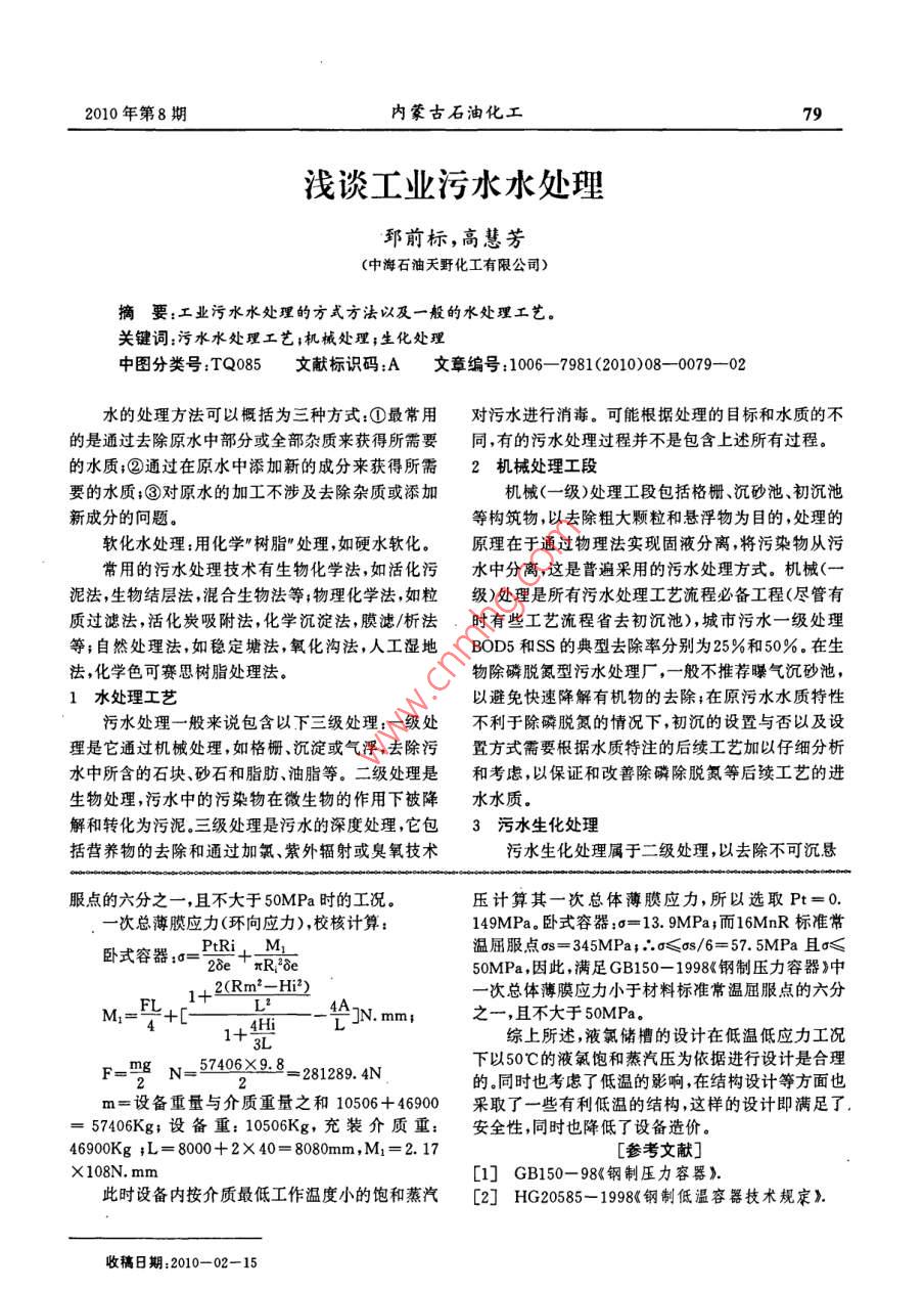 2010年第8期內(nèi)蒙古石油化工79淺談工業(yè)污水水處理郅前標(biāo),高慧芳(中海石油天野化工有限公司)摘要:工業(yè)污水水處理的方式方法以及一般的水處理工藝。關(guān)鍵詞:污水水處理工藝;機(jī)械處理;生化處理中圖分類號:TQ085文獻(xiàn)標(biāo)識碼:A文章編號:1006-7981(2010)08-00790水的處理方法可以概括為三種方式:①最常用對污水進(jìn)行消毒??赡芨鶕?jù)處理的目標(biāo)和水質(zhì)的不的是通過去除原水中部分或全部雜質(zhì)來獲得所需要同,有的污水處理過程并不是包含上述所有過程。的水質(zhì);②通過在原水中添加新的成分來獲得所需2機(jī)械處理工段要的水質(zhì);③對原水的加工不涉及去除雜質(zhì)或添加機(jī)械(一級)處理工段包括格柵、沉砂池、初沉池新成分的問題。等構(gòu)筑物,以去除粗大顆粒和懸浮物為目的,處理的軟化水處理:用化學(xué)”樹脂"處理,如硬水軟化。原理在于通過物理法實(shí)現(xiàn)固液分離,將污染物從污常用的污水處理技術(shù)有生物化學(xué)法,如活化污水中分離,這是普遍采用的污水處理方式。機(jī)械(泥法,生物結(jié)層法,混合生物法等;物理化學(xué)法如粒級)處理是所有污水處理工藝流程必備工程(盡管有質(zhì)過濾法,活化炭吸附法,化學(xué)沉淀法,膜濾/析法時有些工藝流程省去初沉池),城市污水一級處理等;自然處理法,如穩(wěn)定塘法,氧化溝法,人工濕地BOD5和SS的典型去除率分別為25%和50%。在生法,化學(xué)色可賽思樹脂處理法。物除磷脫氮型污水處理廠,一般不推薦曝氣沉砂池,1水處理工藝以避免快速降解有機(jī)物的去除;在原污水水質(zhì)特性污水處理一般來說包含以下三級處理:一級處不利于除磷脫氮的情況下,初沉的設(shè)置與否以及設(shè)理是它通過機(jī)械處理,如格柵、沉淀或氣浮,去除污置方式需要根據(jù)水質(zhì)特注的后續(xù)工藝加以仔細(xì)分析水中所含的石塊、砂石和脂肪、油脂等。二級處理是和考慮,以保證和改善除磷除脫氮等后續(xù)工藝的進(jìn)生物處理,污水中的污染物在微生物的作用下被降水水質(zhì)。解和轉(zhuǎn)化為污泥。三級處理是污水的深度處理,它包3污水生化處理括營養(yǎng)物的去除和通過加氯、紫外輻射或臭氧技術(shù)污水生化處理屬于二級處理,以去除不可沉懸服點(diǎn)的六分之一,且不大于50MPa時的工況壓計(jì)算其一次總體薄膜應(yīng)力,所以選取Pt=0.次總薄膜應(yīng)力(環(huán)向應(yīng)力),校核計(jì)算14MPa。臥式容器:=13.9MPa;而16MnR標(biāo)準(zhǔn)常臥式容器:0=2+xR26溫屈服點(diǎn)as=345MPa;∴∝≤s/6=57.5MPa且?!?0MPa,因此,滿足GB150-1998《鋼制壓力容器》中M2=E,1+2(Rm-一次總體薄膜應(yīng)力小于材料標(biāo)準(zhǔn)常溫屈服點(diǎn)的六分之一,且不大于50MPa綜上所述,液氯儲槽的設(shè)計(jì)在低溫低應(yīng)力工況57406×9.8下以50℃的液氣飽和蒸汽壓為依據(jù)進(jìn)行設(shè)計(jì)是合理FN=2812894N的同時也考慮了低溫的影響,在結(jié)構(gòu)設(shè)計(jì)等方面也m=設(shè)備重量與介質(zhì)重量之和10506+46900采取了一些有利低溫的結(jié)構(gòu),這樣的設(shè)計(jì)即滿足了=57406Kg;設(shè)備重:10506Kg,充裝介質(zhì)重:安全性,同時也降低了設(shè)備造價46900Kg;L=8000+2×40=8080mm,M1=2.17[參考文獻(xiàn)]X108N. mm[1]GB150-98《鋼制壓力容器》.此時設(shè)備內(nèi)按介質(zhì)最低工作溫度小的飽和蒸汽[2]HG20585-1998《鋼制低溫容器技術(shù)規(guī)》.收稿日期:2010-02-15內(nèi)蒙古石油化工2010年第8期浮物和溶解性可生物降解有機(jī)物為主要目的,其工能維持在適當(dāng)范圍內(nèi)溫度的變化與氣候有關(guān),對于藝構(gòu)成多種多樣,可分成活性污泥法、AB法、A/O萬噸級的城市污水處理廠,特別是采用活性污泥工法、A2/O法、SBR法、氧化溝法、穩(wěn)定塘法、土地處藝時,對溫度的控制難以實(shí)施,在經(jīng)濟(jì)上和工程上都理法等多種處理方法。日前大多數(shù)城市污水處理廠不是十分可行的因此,一般是通過設(shè)計(jì)參數(shù)的適當(dāng)都采用活性污泥法。生物處理的原理是通過生物作選取來滿足不同溫度變化的處理要求,以達(dá)到處理用,尤其是微生物的作用,完成有機(jī)物的分解和生物目標(biāo)因此,工藝控制的主要目標(biāo)就落在活性污泥本體的合成,將有機(jī)污染物轉(zhuǎn)變成無害的氣體產(chǎn)物身以及可通過調(diào)控手段來改變的環(huán)境因素上,控制(CO2)、液體產(chǎn)物(水)以及富含有機(jī)物的固體產(chǎn)物的主要任務(wù)就是采取合適的措施,克服外界因素對微生物群體或稱生物污泥);多余的生物污泥在沉活性污泥系統(tǒng)的影響,使其能持續(xù)穩(wěn)定地發(fā)揮作用。淀池中經(jīng)沉淀池固液分離,從凈化后的污水中除去。實(shí)現(xiàn)對生物反應(yīng)系統(tǒng)的過程控制關(guān)鍵在于控制3.1在污水生化處理過程中,影響微生物活性的因?qū)ο蠡蚩刂茀?shù)的選取,而這又與處理工藝或處理素可分為基質(zhì)類和環(huán)境類兩大類:目標(biāo)密切相關(guān)。3.1.1基質(zhì)類包括營養(yǎng)物質(zhì),如以碳元素為主的有前已述及溶解氧是生物反應(yīng)類型和過程中一個機(jī)化合物即碳源物質(zhì)、氮源、磷源等營養(yǎng)物質(zhì)、以及非常重要的指示參數(shù),它能直觀且比較迅速地反映鐵鋅、錳