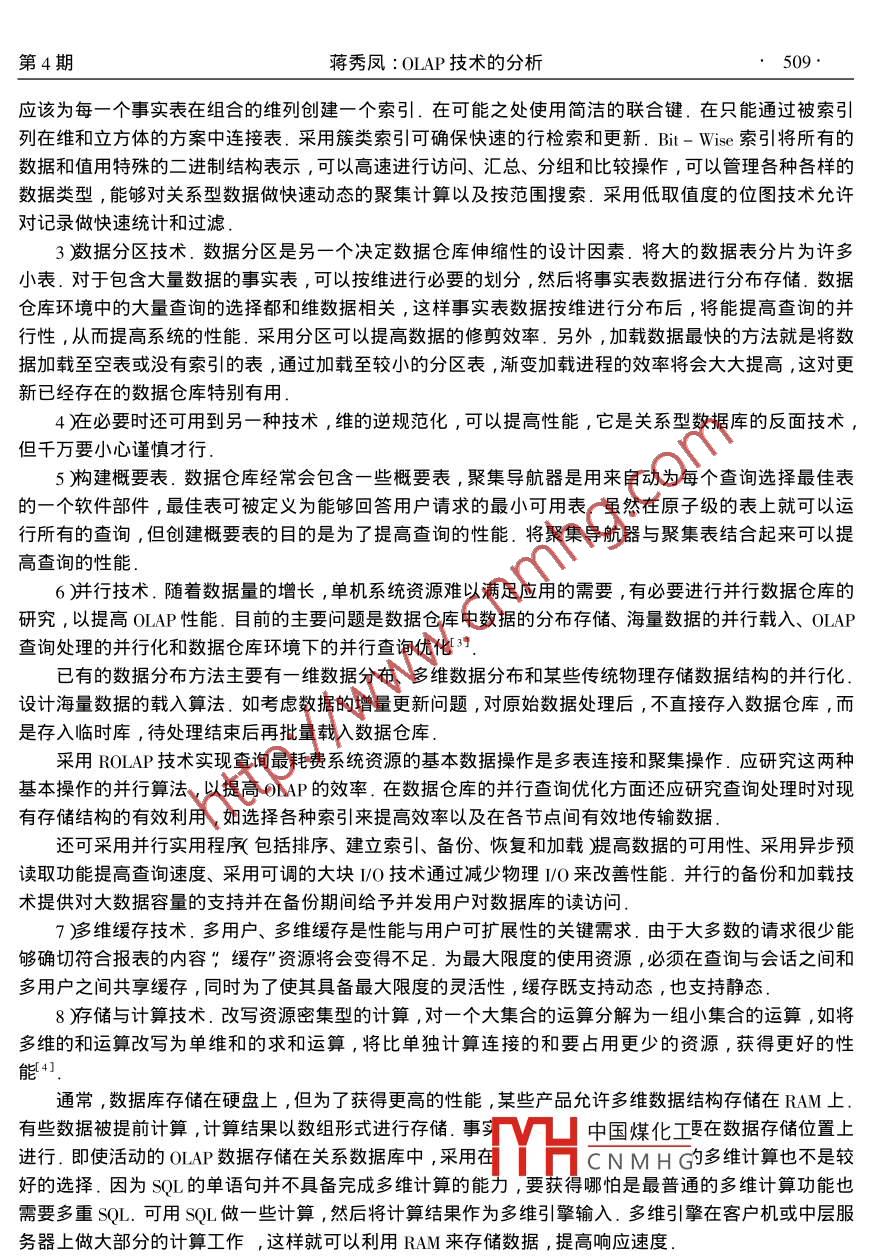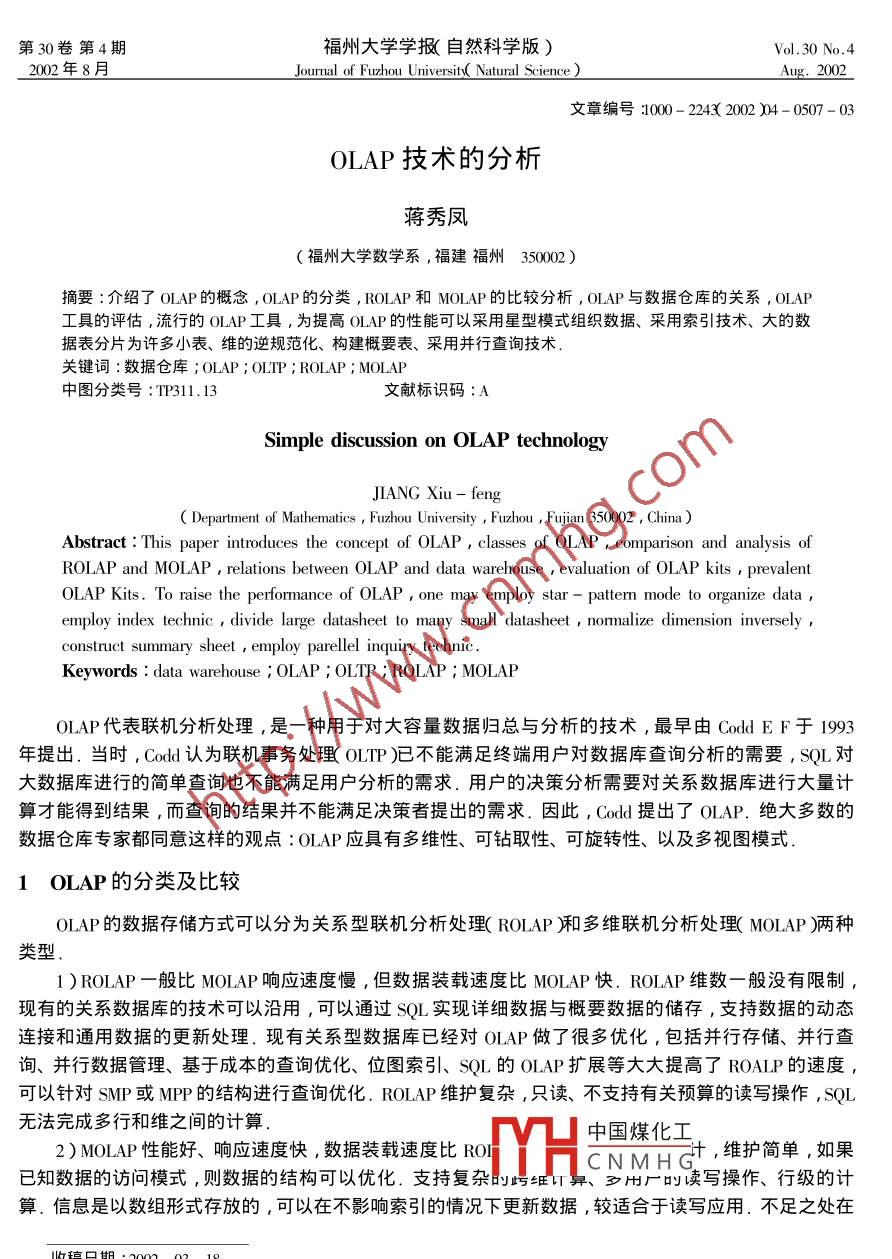 第30卷第4期福州大學學報(自然科學版)Vol. 30 No.42002年8月Joumnal of Fuzhou University( Natural Science )Aug. 2002_文章編號:1000- 2243( 2002 )04 - 0507 - 03OLAP技術的分析蔣秀鳳(福州大學數(shù)學系,福建福州350002 )摘要:介紹了0LAP的概念, OLAP的分類, ROLAP和MOLAP的比較分析, OLAP與數(shù)據(jù)倉庫的關系,OLAP工具的評估,流行的OLAP工具,為提高OLAP的性能可以采用星型模式組織數(shù)據(jù)、采用索引技術、大的數(shù)據(jù)表分片為許多小表、維的逆規(guī)范化、構建概要表、采用并行查詢技術.關鍵詞:數(shù)據(jù)倉庫;OLAP ;OLTP ; ROLAP ; MOLAP中圖分類號:TP311.13文獻標識碼:ASimple discussion on OLAP technologyJIANG Xiu- feng .( Department of Mathematics , Fuzhou University , Fuzhou , Fujian 350002 , China)Abstract : This paper introduces the concept of OLAP , classes of OLAP , comparison and analysis ofROL AP and MOL AP , relations between OLAP and data warehouse , evaluation of OLAP kits , prevalentOLAP Kits. To raise the performance of OLAP , one may employ star - patterm mode to organize data ,employ index technic , divide large datasheet to many small datasheet , normalize dimension inversely ,construct summary sheet , employ parellel inquiry technic.Keywords : data warehouse ; OLAP ; OLTP ; ROLAP ; MOLAPOLAP代表聯(lián)機分析處理,是一種用于對大容量數(shù)據(jù)歸總與分析的技術,最早由Codd E F于1993年提出.當時,Codd認為聯(lián)機事務處理(0LTP)已不能滿足終端用戶對數(shù)據(jù)庫查詢分析的需要,SQL對大數(shù)據(jù)庫進行的簡單查詢也不能滿足用戶分析的需求.用戶的決策分析需要對關系數(shù)據(jù)庫進行大量計算才能得到結果,而查詢的結果并不能滿足決策者提出的需求.因此, Codd提出了OLAP.絕大多數(shù)的數(shù)據(jù)倉庫專家都同意這樣的觀點:OLAP應具有多維性、可鉆取性、可旋轉性、以及多視圖模式.1 OLAP 的分類及比較OLAP的數(shù)據(jù)存儲方式可以分為關系型聯(lián)機分析處理( ROLAP )和多維聯(lián)機分析處理( MOLAP )兩種類型.1)ROLAP-般比MOLAP響應速度慢,但數(shù)據(jù)裝載速度比MOLAP快.ROLAP維數(shù)一般沒有限制,現(xiàn)有的關系數(shù)據(jù)庫的技術可以沿用,可以通過SQL實現(xiàn)詳細數(shù)據(jù)與概要數(shù)據(jù)的儲存,支持數(shù)據(jù)的動態(tài)連接和通用數(shù)據(jù)的更新處理.現(xiàn)有關系型數(shù)據(jù)庫已經(jīng)對OLAP做了很多優(yōu)化,包括并行存儲、并行查詢、并行數(shù)據(jù)管理、基于成本的查詢優(yōu)化、位圖索引、SQL的OLAP擴展等大大提高了ROALP的速度,可以針對SMP或MPP的結構進行查詢優(yōu)化. ROLAP維護復雜,只讀、不支持有關預算的讀寫操作, SQL .無法完成多行和維之間的計算.中國煤化工2) MOLAP性能好、響應速度快,數(shù)據(jù)裝載速度比ROI.JHCNMHGt ,維護簡單,如果已知數(shù)據(jù)的訪問模式, 則數(shù)據(jù)的結構可以優(yōu)化.支持復雜的肟細訂異、3用廠的讀寫操作、行級的計算.信息是以數(shù)組形式存放的,可以在不影響索引的情況下更新數(shù)據(jù), 較適合于讀寫應用.不足之處在收稿日期:2002-03- 18作者簡介:蔣秀鳳( 1963- ),女, 碩士,副教授.508●福州大學學報(自然科學版)第30卷于系統(tǒng)復雜度、培訓與維護費用增加;受操作系統(tǒng)平臺中文件大小的限制,難以達到TB級;維數(shù)有限,需要進行預計算,可能導致數(shù)據(jù)爆炸;無法支持維的動態(tài)變化,缺乏數(shù)據(jù)模型和數(shù)據(jù)訪問的標準,不支持通用的更新處理;對數(shù)據(jù)的動態(tài)連接的支持是有問題的,如果對路徑的訪問不被數(shù)據(jù)設計所支持的話,這種結構就顯得不靈活.對這兩種技術的選擇,應視具體情況取決于實際應用范疇.建立大型的、功能交錯的企業(yè)級數(shù)據(jù)庫,選擇ROLAP為宜;而建立具有明確定義的、單一的分析型數(shù)據(jù)集市,維數(shù)相對少,也不太需要詳細的、原子級的數(shù)據(jù),那么選擇MOLAP較合適.2 OLAP與數(shù)據(jù)倉庫OLAP數(shù)據(jù)庫與數(shù)據(jù)倉庫之間的關系是互補的.一般情況下,數(shù)據(jù)倉庫作為OLAP的基礎,從中選出細節(jié)數(shù)據(jù)的- -個子集傳到0LAP數(shù)據(jù)庫中,進行數(shù)據(jù)的匯總或聚集.數(shù)據(jù)倉庫能容納細節(jié)數(shù)據(jù),OLAP數(shù)據(jù)庫保存的是各種輕度綜合的數(shù)據(jù),DSS分析員還可向下鉆取到數(shù)據(jù)倉庫的細節(jié)級,而0LAP數(shù)據(jù)庫中的匯總數(shù)據(jù)也被存儲在數(shù)據(jù)倉庫中.數(shù)據(jù)定期從數(shù)據(jù)倉庫中導入到OLAP數(shù)據(jù)庫中,由于操作型環(huán)境的數(shù)據(jù)進入到數(shù)據(jù)倉庫時已被集成,因此OLAP數(shù)據(jù)庫就不用從操作型環(huán)境中抽取與集成數(shù)據(jù).數(shù)據(jù)倉庫與OLAP數(shù)據(jù)庫的區(qū)別是:①數(shù)據(jù)倉庫存有大量的數(shù)據(jù), OLAP數(shù)據(jù)庫中的數(shù)據(jù)至少要少一個數(shù)量級;②數(shù)據(jù)倉庫只適于少量的靈活訪問,OLAP數(shù)據(jù)庫適合大量的非預知的訪問和分析;③數(shù)據(jù)倉庫存儲很長時間范圍內(nèi)的數(shù)據(jù)(5~10年),OLAP數(shù)據(jù)庫中存儲著較短時間范圍內(nèi)的數(shù)據(jù);④數(shù)據(jù)倉庫允許分析人員以受限的形式訪問數(shù)據(jù),OLAP數(shù)據(jù)庫允許自由的訪問;⑤數(shù)據(jù)倉庫側重于存儲和管理面向決策主題的數(shù)據(jù),