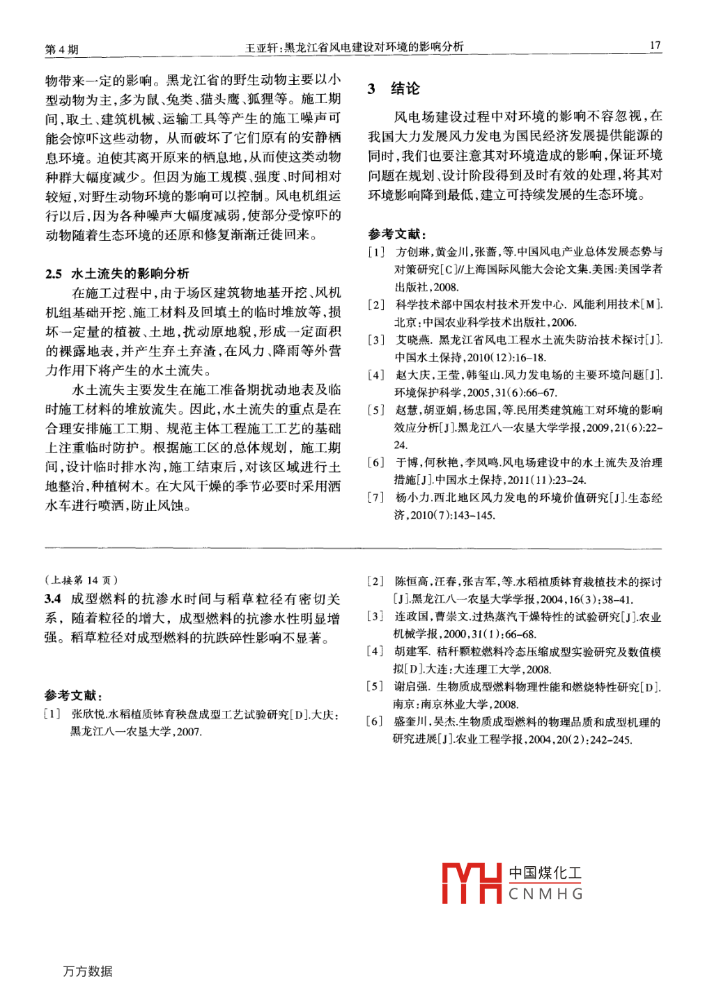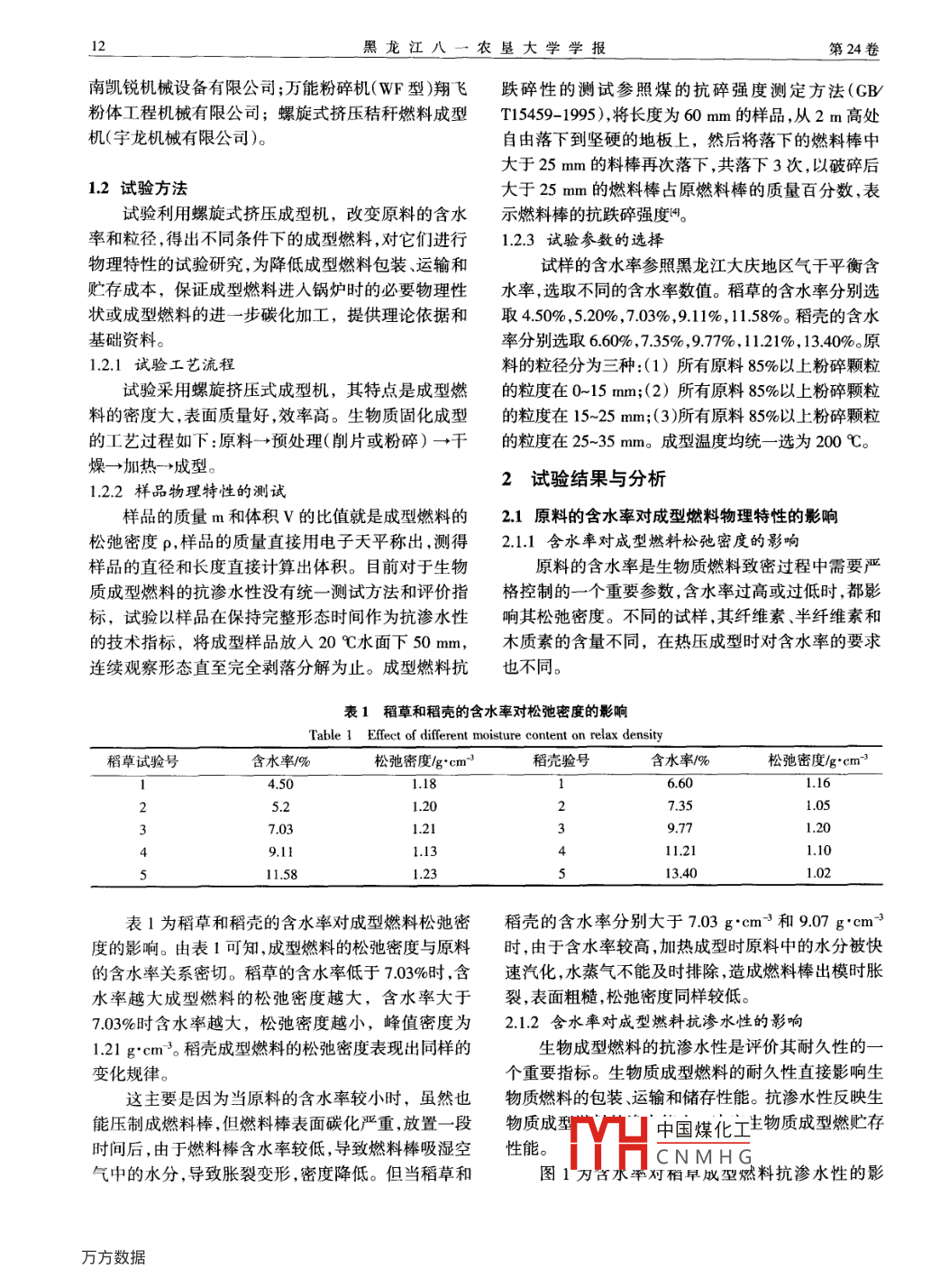 第24卷第4期黑龍江八一農(nóng)墾大學(xué)學(xué)報24(4):11-142012年月Journal of heile文章編號:1002-2090(2012)04-0011-04稻秸稈生物質(zhì)成型燃料物理特性的研究李慶達’,于海明',張偉',胡軍',王黎明',汪春',孫勇2(1黑龍江八一農(nóng)墾大學(xué)工程學(xué)院,大慶163319;2東北農(nóng)業(yè)大學(xué)工程學(xué)院摘要:試驗研究了稻秸稈的含水率和原料粒徑對其成型燃料物理特性的影響。試驗結(jié)果表明,隨著含水率的提高,稻秸稈成型燃料的松弛密度和抗?jié)B水性呈現(xiàn)先增大后減小的變化趨勢,成型燃料的抗跌碎性隨著稻秸稈含水率的增加而降低,稻草和稻殼的最佳含水率區(qū)間分別為6.50%-7.80%和680%-850%。隨著粒徑的增大,稻草成型燃料的松弛密度逐漸減小,抗?jié)B水性明顯增強。稻草粒徑對成型燃料的抗趺碎性影響不顯著。關(guān)鍵詞:生物質(zhì)成型燃料;松弛密度;抗跌碎性;抗?jié)B水性中圖分類號:X712文獻標(biāo)識碼:AStudy on the Physical Performance of the Biomass Densification Briquetting Fuel of StrawLi Qingda, Yu Haiming, Zhang Wei, Hu Jun, Wang Liming, Wang Chun, Sun Yong(1. College of Engineering, Heilongjiang Bayi Agricultural University, Daqing 1633192. College of Engineering, Northeast Agricultural UniversityAbstract: The effect of the moisture content and size of the straw on physical performance of the biomass densification briquettingfuel was studied. The results indicated that with the moisture content increasing, the relax density and water resistance increasedfirstly and then decreased, and the shatter resistance of briquetting fuel decreased. The optimal interval of moisture content of strawand rice husk were 6.50%0-7.80% and 6.80%-8.50%. With the size of the straw increasing, the relax density of straw decreasedand water resistance improved. Influence of size of the straw on the shatter resistance of briquetting fuel was not notableKey words: biomass densification briquetting fuel; relax density; shatter resistance; water resistance水稻植質(zhì)缽育秧盤是黑龍江八一農(nóng)墾大學(xué)研制利推廣,加快生物質(zhì)能源的開發(fā)利用,課題組系統(tǒng)研的以稻草秸稈為原料配以固體膠黏劑及其他特殊物究了生物質(zhì)燃料的壓縮成型技術(shù)。試驗主要硏究了質(zhì)的缽育秧盤叫。此種秧盤具有諸多優(yōu)點:在土壤中稻秸稈的含水率和原料粒徑對稻秸稈成型燃料物理能夠降解;秧苗栽植時無需分離秧盤;可實現(xiàn)秸稈還特性的影響。田;使水稻生產(chǎn)綠色環(huán)保。水稻植質(zhì)缽育秧盤的研制有利于實現(xiàn)秧盤制造的產(chǎn)業(yè)化、育秧生產(chǎn)的工廠化、1實驗材料與方法秧苗供應(yīng)的社會化、作物栽培的標(biāo)準(zhǔn)化以及水稻生1.1試驗原料與試驗設(shè)備產(chǎn)的機械化四。蒸汽烘干植質(zhì)缽育秧盤可以使秧盤本1.1.1試驗原料身的各方面性能達到較優(yōu)水平。蒸汽烘干是指蒸汽稻草和稻殼與被烘干物料直接接觸而去除水分的干燥方式。1.1.2試驗設(shè)備植質(zhì)缽育秧盤的蒸汽烘干過程中,需要消耗大電子天平(YP102型)梅特勒-托利多儀器有限量能源燃料,但傳統(tǒng)的化石能源對環(huán)境會造成巨大公司;鼓風(fēng)十燥箱(DGG-9070型)上海森信實驗儀的危害,且成本較高。為實現(xiàn)水稻植質(zhì)缽育技術(shù)的順器有限公司;數(shù)顯式電子萬能試驗機(WDW型)濟收稿日期:2012-03-15基金項目:黑龍江農(nóng)墾總局科技攻關(guān)項目(HNK10A-09-05);黑龍江省科技攻關(guān)項目作者簡介:李慶達(1982-),男,講師,東北大學(xué)材料學(xué)博土研究生畢業(yè),現(xiàn)主要從事嗎YH中國煤化工CNMHG方面的研究工黑龍江八一農(nóng)墾大學(xué)學(xué)報第24卷南凱銳機械設(shè)備有限公司;萬能粉碎機(WF型)翔飛跌碎性的測試參照煤的抗碎強度測定方法(CB粉體工程機械有限公司;螺旋式擠壓秸稈燃料成型T15459-1995),將長度為60mm的樣品,從2m高處機(宇龍機械有限公司)。自由落下到堅硬的地板上,然后將落下的燃料棒中大于25mm的料棒再次落下,共落下3次,以破碎后1.2試驗方法大于25mm的燃料棒占原燃料棒的質(zhì)量百分?jǐn)?shù),表試驗利用螺旋式擠壓成型機,改變原料的含水示燃料棒的抗跌碎強度。率和粒徑,得出不同條件下的成型燃料,對它們進行1.23試驗參數(shù)的選擇物理特性的試驗研究,為降低成型燃料包裝、運輸和試樣的含水率參照黑龍江大慶地區(qū)氣干平衡含貯存成本,保證成型燃料進入鍋爐時的必要物理性水率,選取不同的含水率數(shù)值。稻草的含水率分別選狀或成型燃料的進一步碳化加工,提供理論依據(jù)和取4.50%,5.20%,7.03%,9.11%,11.58%。稻殼的含水基礎(chǔ)資料。率分別選取660%,7.35%,977%,11.21%,13.40%。原1.2.1試驗工藝流程料的粒徑分為三種:(1)所有原料85%以上粉碎顆粒試驗采用螺旋擠壓式成型機,其特點是成型燃的粒度在0-15mm;(2)所有原料85%以上粉碎顆粒料的密度大,表面質(zhì)量好,效率高。生物質(zhì)固化成型的粒度在15-25mm;(3)所有原料85%以上粉碎顆粒的工藝過程如下:原料→預(yù)處理(削片或粉碎)→干的粒度在25~35mm。成型溫度均統(tǒng)一選為200℃燥→加熱→成型1.2.2樣品物理特性的測試2試驗結(jié)果與分析樣品的質(zhì)量m和體積V的比值就是成型燃料的21原料的含水率對成型燃料物理特性的影響松弛密度p樣品的質(zhì)量直接用電子天平稱出,測得2.11含水率對成型燃料松弛密度的影響樣品的直徑和長度直接計算出體