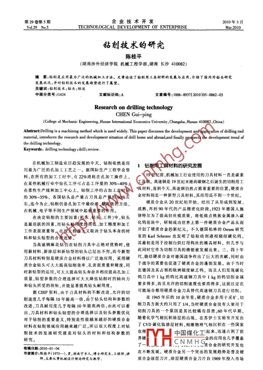 第29卷第5期企業(yè)技術(shù)開(kāi)發(fā)2010年3月_Vol.29 No.5TECHNOLOGICAL DEVELOPMENT 0F ENTERPRISEMar.2010鉆削技術(shù)的研究陳桂平(湖南涉外經(jīng)濟(jì)學(xué)院機(jī)械工程學(xué)部,湖南長(zhǎng)沙410082)摘要:鉆削是應(yīng)用最為廣泛的機(jī)械加工方法。 文章論述了鉆削用工具材料的發(fā)展與應(yīng)用,介紹了國(guó)內(nèi)外鉆頭研究發(fā)展?fàn)顩r,并對(duì)鉆削技術(shù)的發(fā)展趨勢(shì)進(jìn)行了展望。關(guān)鍵詞:鉆削技術(shù);鉆頭;綜述.中團(tuán)分類號(hào):G424文獻(xiàn)標(biāo)識(shí)碼:A文章編號(hào):1006- 8937(2010 )05-0062-03Research on drilling technologyCHEN Gui-ping(College of Mechanic Engineering, Hunan Intemational Economics University ,Changsha, Hunan 410082 ,China)Abtract:Dilling is a machining method which is used widely. This paper discusses the development and application of dillig toolmaterial, introduces the research and development situation of drill home and abroad,and finally prospects the development trend ofthe dilling technology.Keywords: dilling technology ;rill;review.在機(jī)械加工制造業(yè)日趨發(fā)展的今天,鉆削依然是應(yīng)1鉆削用工具材料的研究發(fā)展用最為廣泛的孔加工工藝之一。據(jù)國(guó)際生產(chǎn)工程學(xué)會(huì)資19世紀(jì)前,機(jī)械加工行業(yè)使用的刀具材料一直是碳素料,在所有的加工工時(shí)中,有22%消耗在孔加工操作上,在某些機(jī)械行業(yè)中鉆孔工序可占總工序量的30%-40%,工具鋼。高速鋼是19世紀(jì)末繼高碳鋼之后誕生的切削用工在柔性生產(chǎn)線和加工中心上,鉆削工序約占加工總時(shí)間具材料,直到今天,高速鋼仍然占據(jù)著重要的位置。硬質(zhì)合的30%~35%。各國(guó)鉆頭總產(chǎn)最占刀具總產(chǎn)最的60%左金材料則是一種新型刀具材料,其應(yīng)用還不到一個(gè)世紀(jì)。右。迄今為止,鉆削仍是孔加工中最經(jīng)濟(jì)、最高效的方法,硬質(zhì)合金從20世紀(jì)初開(kāi)始,經(jīng)歷了從形成到發(fā)展.在機(jī)械、電子等不同生產(chǎn)領(lǐng)域中起著重要的作用。成熟,再到90年代的產(chǎn)品精密化階段。1923年德國(guó)人施在決定鉆削的主要因素(機(jī)床、鉆頭、工件)中,鉆頭律特爾為了提高拉絲模質(zhì)量,將低熔點(diǎn)鐵族金屬滲入碳是最活躍的因素,而鉆頭耐用度的高低、加工精度和加工化鎢坯塊中,研制成功世界上第一件硬質(zhì)合金產(chǎn)品從而工件表面質(zhì)量等,在很大程度上又取決于鉆頭本身的材開(kāi)創(chuàng)了硬質(zhì)合金的新紀(jì)元。不久德國(guó)柏林的Osram研究料和鉆頭鉆型的合理選擇。室的KarlSchroter也發(fā)明了鈷粘結(jié)劑液相燒結(jié)碳化鎢,當(dāng)高速鋼麻花鉆仍在鉆削刀具中占絕對(duì)優(yōu)勢(shì)時(shí),使其最初是用于拉制白熾燈用鎢絲的模具材料,但幾乎與用新材料.新涂層和新鉆型的鉆頭已層出不窮。而今新型此同時(shí)它作為切削刀具的潛能被發(fā)掘出來(lái)。三、四十年刀具材料特別是硬質(zhì)合金材料得以廣泛地應(yīng)用,采用硬代,燒結(jié)硬質(zhì)合金對(duì)德國(guó)戰(zhàn)爭(zhēng)作出了巨大的貢獻(xiàn),同時(shí)由質(zhì)合金鉆頭可大大提高鉆削效率孔表面質(zhì)量和精度。同于戰(zhàn)爭(zhēng)的需要也促進(jìn)了硬質(zhì)合金的蓬勃發(fā)展。由于當(dāng)時(shí)時(shí)新鉆型的運(yùn)用,可大大提高鉆頭壽命并相應(yīng)提高孔加工在德國(guó)及其占領(lǐng)的歐洲極度缺乏鎢,而且人們發(fā)現(xiàn)碳化質(zhì)量,鉆型參數(shù)的合理選撣可大大降低鉆削時(shí)的軸向力鎢刀具中1 kg的鎢比高速鋼刀具中1 kg的鎢切削金屬和鉆頭所受的扭矩,并能顯著提高鉆頭耐用度。要多得多,而且允許的切削速度也要高得多,這就注定在據(jù)CIRP資料,由于刀具材料的不斷改進(jìn),允許的切可能場(chǎng)合都用硬質(zhì)合金刀具替代高速鋼刀具進(jìn)行切削。削速度幾乎每隔10年提高一倍,由于鉆頭結(jié)構(gòu)和參數(shù)的在1945年后的10余年里,硬質(zhì)合金多用于采礦,切改進(jìn),刀具耐用度幾乎每隔10年提高兩倍。由此可以看削刀具方面大約只用了1/4,當(dāng)時(shí)硬質(zhì)合金沒(méi)有大量用于出,刀具材料和鉆頭鉆型的合理選擇以及鉆頭參數(shù)優(yōu)化切削刀具的一個(gè)原因是其比較稀有昂貴。60年代早期,對(duì)于鉆削的重要意義,特別是性能越來(lái)越好的硬質(zhì)合金隨著化學(xué)氣相沉積涂層的出現(xiàn),在蘇伊士實(shí)驗(yàn)室開(kāi)發(fā)出材料在鉆削領(lǐng)域應(yīng)用越來(lái)越廣泛。所以很大程度上對(duì)鉆了CVD碳化鈦涂層材料,相繼物理氣相沉積在-些國(guó)家削技術(shù)的發(fā)展研究就是對(duì)鉆頭的材料和結(jié)構(gòu)參數(shù)的也中國(guó)煤化工起來(lái),迅速占到了世研究。界硬二金的應(yīng)用也幾乎覆蓋了:DH. CNM HS質(zhì)合金的研究開(kāi)發(fā)也收稿日期:2010-01-04作者簡(jiǎn)介:陳桂平(1975-).男,湖南寧鄉(xiāng)人,博士研究生,工程師,講在不斷發(fā)展。硬質(zhì)合金另一個(gè)突出的發(fā)展趨勢(shì)是普及硬師,主要從事機(jī)械設(shè)計(jì)理論研究與教學(xué)。質(zhì)合金涂層刀片,涂層硬質(zhì)合金刀片自1969年投入市場(chǎng)第29卷第5期.陳桂平:鉆削技術(shù)的研究63以來(lái),在工業(yè)發(fā)達(dá)國(guó)家已占據(jù)了全部硬質(zhì)