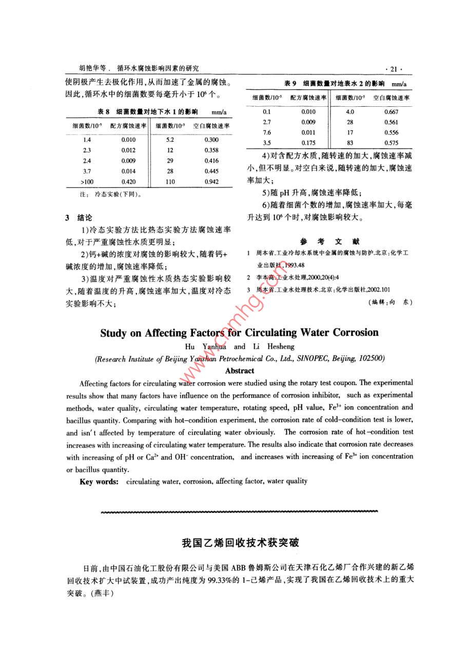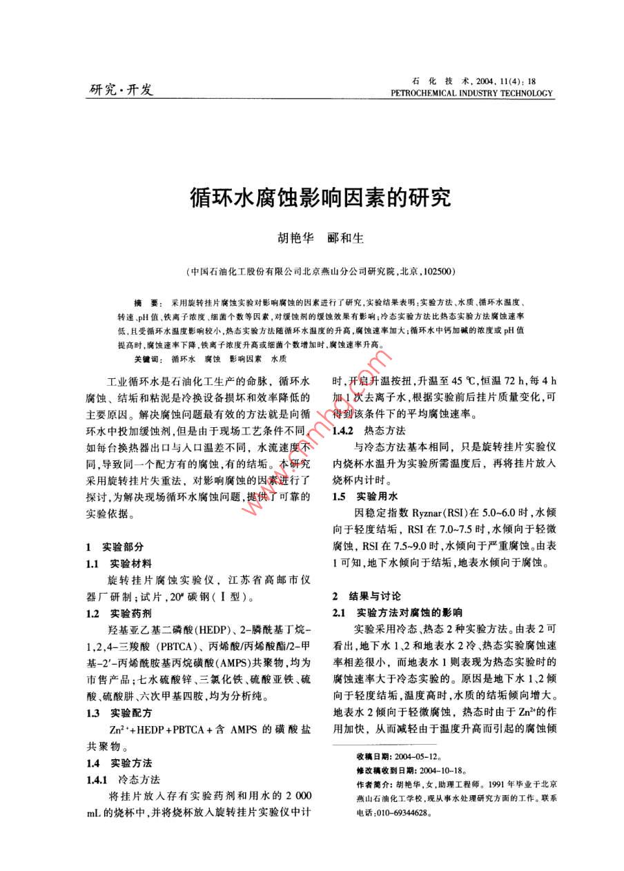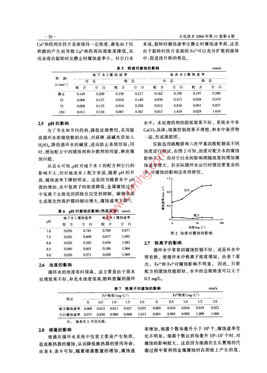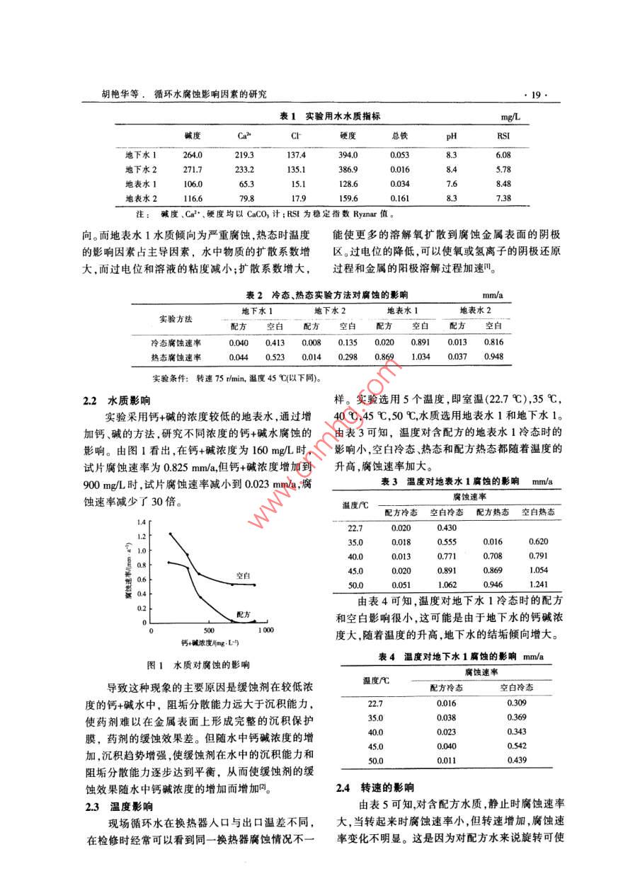 石化技術(shù),2004,11(4):18研究·開(kāi)發(fā)PETROCHEMICAL INDUSTRY TECHNOLOGY循環(huán)水腐蝕影響因素的研究胡艷華酈和生(中國(guó)石油化工股份有限公司北京燕山分公司研究院,北京,102500)摘要:采用旋轉(zhuǎn)掛片腐蝕實(shí)驗(yàn)對(duì)影響腐蝕的因素進(jìn)行了研究,實(shí)驗(yàn)結(jié)果表明:實(shí)驗(yàn)方法、水質(zhì)、循環(huán)水溫度轉(zhuǎn)速pH值鐵離子濃度、細(xì)菌個(gè)數(shù)等因素,對(duì)緩蝕劑的緩蝕效果有影響;冷態(tài)實(shí)驗(yàn)方法比熱態(tài)實(shí)驗(yàn)方法腐蝕速率低,且受循環(huán)水溫度影響較小,熱態(tài)實(shí)驗(yàn)方法隨循環(huán)水溫度的升高,腐蝕速率加大;循環(huán)水中鈣加堿的濃度或pH值提高時(shí),腐蝕速率下降,鐵離子濃度升高或細(xì)菌個(gè)數(shù)增加時(shí)腐蝕速率升高關(guān)鍵詞;循環(huán)水腐蝕影響因素水質(zhì)工業(yè)循環(huán)水是石油化工生產(chǎn)的命脈,循環(huán)水時(shí),開(kāi)啟升溫按扭,升溫至45℃,恒溫72h,每4h腐蝕、結(jié)垢和粘泥是冷換設(shè)備損壞和效率降低的加1次去離子水根據(jù)實(shí)驗(yàn)前后掛片質(zhì)量變化,可主要原因。解決腐蝕問(wèn)題最有效的方法就是向循得到該條件下的平均腐蝕速率環(huán)水中投加緩蝕劑,但是由于現(xiàn)場(chǎng)工藝條件不同,14.2熱態(tài)方法如每臺(tái)換熱器出口與入口溫差不同,水流速度不與冷態(tài)方法基本相同,只是旋轉(zhuǎn)掛片實(shí)驗(yàn)儀同,導(dǎo)致同一個(gè)配方有的腐蝕,有的結(jié)垢。本研究?jī)?nèi)燒杯水溫升為實(shí)驗(yàn)所需溫度后,再將掛片放人采用旋轉(zhuǎn)掛片失重法,對(duì)影響腐蝕的因素進(jìn)行了燒杯內(nèi)計(jì)時(shí)討,為解決現(xiàn)場(chǎng)循環(huán)水腐蝕問(wèn)題,提供了可靠的1.5實(shí)驗(yàn)用水驗(yàn)依據(jù)。因穩(wěn)定指數(shù) Ryznar(RSI在5.0-60時(shí),水傾向于輕度結(jié)垢,RSI在70-7.5時(shí),水傾向于輕微1實(shí)驗(yàn)部分腐蝕,RSI在7590時(shí),水傾向于嚴(yán)重腐蝕。由表1,1實(shí)驗(yàn)材料1可知,地下水傾向于結(jié)垢,地表水傾向于腐蝕。旋轉(zhuǎn)掛片腐蝕實(shí)驗(yàn)儀,江蘇省高郵市儀器廠研制;試片,20碳鋼(Ⅰ型)。2結(jié)果與討論1.2實(shí)驗(yàn)藥劑21實(shí)驗(yàn)方法對(duì)腐蝕的影響羥基亞乙基二磷酸(HEDP)、2-膦?;⊥閷?shí)驗(yàn)采用冷態(tài)、熱態(tài)2種實(shí)驗(yàn)方法。由表2可1,2,4-三羧酸( PBTCA)、丙烯酸丙烯酸酯2-甲看出,地下水1、2和地表水2冷、熱態(tài)實(shí)驗(yàn)腐蝕速基-2-丙烯酰胺基丙烷磺酸(AMPS)共聚物,均為率相差很小,而地表水l則表現(xiàn)為熱態(tài)實(shí)驗(yàn)時(shí)的市售產(chǎn)品;七水硫酸鋅、三氯化鐵、硫酸亞鐵、硫腐蝕速率大于冷態(tài)實(shí)驗(yàn)的。原因是地下水1、2傾酸、硫酸肼、六次甲基四胺,均為分析純。向于輕度結(jié)垢,溫度高時(shí),水質(zhì)的結(jié)垢傾向增大。13實(shí)驗(yàn)配方地表水2傾向于輕微腐蝕,熱態(tài)時(shí)由于Zn2的作Zn2+HEDP+ PBTCA+含AMPS的磺酸鹽用加快,從而減輕由于溫度升高而引起的腐蝕傾共聚物。14實(shí)驗(yàn)方法收稿日期:200405-12。修改稿收到日期:2004-10-18。14.1冷態(tài)方法作者簡(jiǎn)介:胡艷華,女,助理工程師。1991年畢業(yè)于北京將掛片放入存有實(shí)驗(yàn)藥劑和用水的2000燕山石油化工學(xué)校,現(xiàn)從事水處理研究方面的工作。聯(lián)系mL的燒杯中,并將燒杯放入旋轉(zhuǎn)掛片實(shí)驗(yàn)儀中計(jì)電話(huà):01069344628。胡艷華等.循環(huán)水腐蝕影響因素的研究表1實(shí)驗(yàn)用水水質(zhì)指標(biāo)硬度總鐵地下水1地下水22717135.138690016地表水112868.48地表水21596738注:堿度、C2、硬度均以CaCO3計(jì);RS為穩(wěn)定指數(shù) ryznar值。向。而地表水1水質(zhì)傾向?yàn)閲?yán)重腐蝕熱態(tài)時(shí)溫度能使更多的溶解氧擴(kuò)散到腐蝕金屬表面的陰極的影響因素占主導(dǎo)因素,水中物質(zhì)的擴(kuò)散系數(shù)增區(qū)。過(guò)電位的降低,可以使氧或氫離子的陰極還原大,而過(guò)電位和溶液的粘度減小;擴(kuò)散系數(shù)增大,過(guò)程和金屬的陽(yáng)極溶解過(guò)程加速表2冷態(tài)、熱態(tài)實(shí)驗(yàn)方法對(duì)腐蝕的影響地下水1地下水2地表水1地表水2實(shí)驗(yàn)方法配方空白配方空白配方空白配方空白冷態(tài)腐蝕速率004004130.0080.13500200.8910.0130.816熱態(tài)腐蝕速率00440.5230.0140.2980.86910340.0370.948實(shí)驗(yàn)條件:轉(zhuǎn)速75rmin,溫度45℃以下同)22水質(zhì)影響樣。實(shí)驗(yàn)選用5個(gè)溫度,即室溫(22.7℃),35℃,實(shí)驗(yàn)采用鈣+堿的濃度較低的地表水,通過(guò)增40℃,45℃,50℃水質(zhì)選用地表水1和地下水1。加鈣、堿的方法,研究不同濃度的鈣+堿水腐蝕的由表3可知,溫度對(duì)含配方的地表水1冷態(tài)時(shí)的影響。由圖1看出,在鈣+堿濃度為160mg/L時(shí),影響小,空白冷態(tài)、熱態(tài)和配方熱態(tài)都隨著溫度的試片腐蝕速率為0825mm/a,但鈣+堿濃度增加到升高腐蝕速率加大。900mg時(shí),試片腐蝕速率減小到0.023mm/a,腐表3溫度對(duì)地表水1腐蝕的影響mm/a蝕速率減少了30倍。腐蝕速率溫度/C配方冷態(tài)空白冷態(tài)配方熱態(tài)空白熱態(tài)055500160.620空自.054由表4可知,溫度對(duì)地下水1冷態(tài)時(shí)的配方和空白影響很