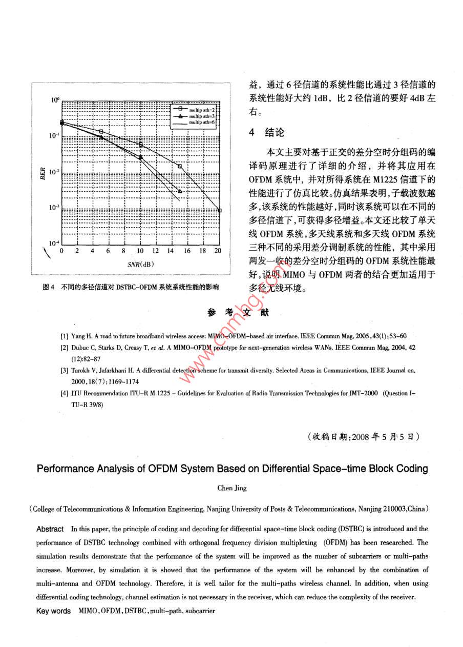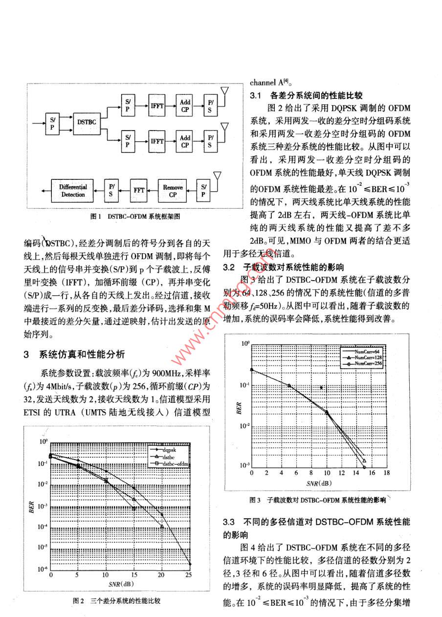 基于著分時分組碼的OFDM系綿的性能分析陳靜(南京郵電大學(xué)通信與信息工程學(xué)院南京210003)摘要本文介紹了差分空時分組碼的編譯碼原理,研究了采用差分空時分組碼的OFDM系統(tǒng)( DSTBC-OFDM)性能,仿真結(jié)果表明, DSTBC-OFDM系統(tǒng)的性能隨著子載波數(shù)及子信道數(shù)的增加而提高。通過仿真還證明了多天線技術(shù)與OFDM技術(shù)相結(jié)合,系統(tǒng)性能可得到提高,更適用于多徑無線信道,而且采用差分編碼技術(shù),接收端不需要信道估計,可以大大降低接收機的復(fù)雜度。關(guān)鍵詞多輸入多輸出正交頻分復(fù)用差分空時分組碼多徑信道子載波1引言送天線數(shù)目較多時也變得越來越困難,這將嚴(yán)重制約這些空時編碼的應(yīng)用。因此, Tarokh和 Jafarkhani移動通信的不斷發(fā)展和人們對通信需求的日益在空時分組碼理論的基礎(chǔ)上,提出了基于正交設(shè)計增長,要求在有效的頻譜資源上實現(xiàn)綜合業(yè)務(wù)的快的差分空時分組碼,該方案提供了簡單的差分編碼速傳輸,需要頻譜效率極高的技術(shù)。OFDM技術(shù),利和譯碼的方法。對于單天線系統(tǒng),差分相移鍵控用多載波之間的正交性,高效利用頻譜資源MMO(DSK)編碼,不要進行信道估計,該差分方案已經(jīng)( Multiple Input Multiple Output)技術(shù),可以在不增加在實際蜂窩移動通信系統(tǒng)中廣泛使用。例如美國數(shù)帶寬的情況下,成倍的提高通信系統(tǒng)的容量和頻譜字蜂窩系統(tǒng)標(biāo)準(zhǔn)IS54就使用了-DSK。本文利用率,一般的MIMO技術(shù)僅適用于平坦衰落信道,將差分方案擴展到MMO系統(tǒng)中,主要介紹了基于而OFDM技術(shù)可以將一個頻率選擇性衰落信道分割成若干并行的平坦衰落子信道,所以在MMO系統(tǒng)正交設(shè)計的差分空時分組碼,并以兩發(fā)一收的MI中采用OFDM技術(shù)能夠?qū)购蜏p小多徑傳輸引起的MO-OFDM系統(tǒng)為例,對其在M1225信道下的性能碼間干擾,使信道更符合MMo技術(shù)所需的傳輸特進行了仿真和分析。性2差分空時分組碼編譯碼原理目前空時編碼技術(shù)主要包括分層空時碼,空時分組編碼空時網(wǎng)格編碼。上述各類空時碼的研究均21差分空時分組碼編碼原理是在準(zhǔn)靜態(tài)衰落信道條件下進行的,且需要信道信當(dāng)發(fā)射天線數(shù)為2時,該方案首先發(fā)送兩個參息進行信道估計。然而在實際無線通信系統(tǒng)中,并不考調(diào)制信號x1和x2。根據(jù) Alamouti提出的空時分組能保證這個假設(shè)條件,信道估計在衰落較快或者發(fā)碼論,發(fā)送端在t=1時刻,從兩根天線同時發(fā)送信號x1和x2,并在t=2時刻,從兩根天線發(fā)送信號x2根天線的基帶信號的總發(fā)射功率為1。和x1。這兩次傳輸不攜帶任何數(shù)據(jù)信息。然后,發(fā)送任何一個復(fù)信號矢量(x21,x22)都可以唯一的端采用差分方式對后面待發(fā)送的數(shù)據(jù)進行編碼并用“和(-x2,x)正交基表示。表達式的系按如下方式進行發(fā)送。數(shù)為在2+1時刻,編碼器根據(jù)先前發(fā)送的信號和差分矢量,計算后面要傳輸?shù)恼{(diào)制符號為M2=-x2+1x2+x2+2x21(4)(x21,x2)=M1(x21,x2)+M2(-x2,x21)(1)對于給定星座A和參考矢量(x21,x2)來說,有因此,在2+1時刻分別從發(fā)射天線1和2發(fā)送2個不同的差分矢量(MM,),對應(yīng)于2個不同的信號x;和x2,在2+2時刻分別從發(fā)射天線1和2信號矢量(x21,x2)因此,一個2b信息比特的分組發(fā)送一x2和x2,重復(fù)這一過程直到數(shù)據(jù)幀結(jié)束。與差分矢量M之間存在一一對應(yīng)的關(guān)系。由此可見,2+1和2+2時刻發(fā)送的信號可以表22差分空時分組碼譯碼原理為時刻2-1和2的線性組合。線性組合的系數(shù)設(shè)只有一根接收天線。r表示時刻t接收到的信(MM2)為差分矢量,由該時刻發(fā)送的數(shù)據(jù)決定。差號,n表示時刻t的噪聲采樣,和h表示時刻t從分空時分組碼的關(guān)鍵步驟是計算一組差分矢量集發(fā)射天線1和2到接收天線的衰落系數(shù)。2-1、2、M,并將發(fā)送的信息比特映射到這個差分矢量集。下2+1和2+2時刻的接收信號可以表示為B,面介紹如何得到差分矢量的元素。廠2+1,r2+2設(shè)信息比特星座集為2-PSKh, h,令H且N2=(n21,n2)N2=(n2,2τkyl;k=0,1,2,…,2式中,信號幅度除以√2,功率歸一化,這樣兩接收信號可以表示為hstn2=((2+12(2(xmx2:+xx2)+(xnx:)BN2+N(x2:2)+M12,(5n-2:=(12+1221(-x1:x+2x2:)+(x212)BN2+N21H(22:)+N212,(6)我們可以令M1=2r2-1+r2+2r2N2=(x21x2)HN21+N21B(x21x2)+N2nN2M2=2+12-7222N=(x. x,HN,N,.H(-X. x,)+N.N則根據(jù)式(5)和(6)(M1M2)是差分矢量(MM2)的相應(yīng)函數(shù)。由于集MM1=2,h+252=(12+1)M+y(7)中的所有差分矢量都具有相等的長度,因此接收端Mh212M2+2(8)可從M中選擇一個與判決統(tǒng)計矢量(M,M2)的最近判決統(tǒng)計信號矢量可表示為的差分矢量。然后逆映射,進行譯碼。(MM=(1+1(MM1)+(所9)23 DSTBC-OFDM系統(tǒng)框架圖DSTBC-OFDM系統(tǒng)框架如圖1所示,以兩發(fā)對于給定的信道h1和h2,判決統(tǒng)計信號矢量收的系統(tǒng)為例。待發(fā)送的數(shù)據(jù)先進行差分空時分組channel A。3.1各差分系統(tǒng)間的性能比較P圖2給出了采用 DQPSK調(diào)制的OFDMDSTBC系統(tǒng),采用兩發(fā)一收的差分空時分組碼系統(tǒng)和采用兩發(fā)一收差分空時分組碼的OFDM系統(tǒng)三種差分系統(tǒng)的性能比較。從圖中可以看出,采用兩發(fā)一收差分空時分組碼的