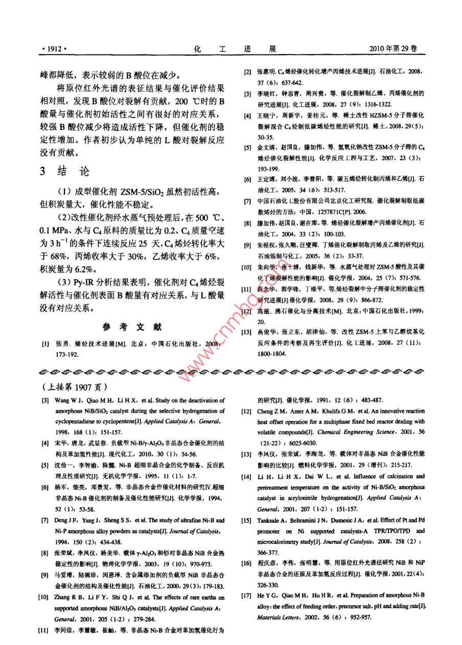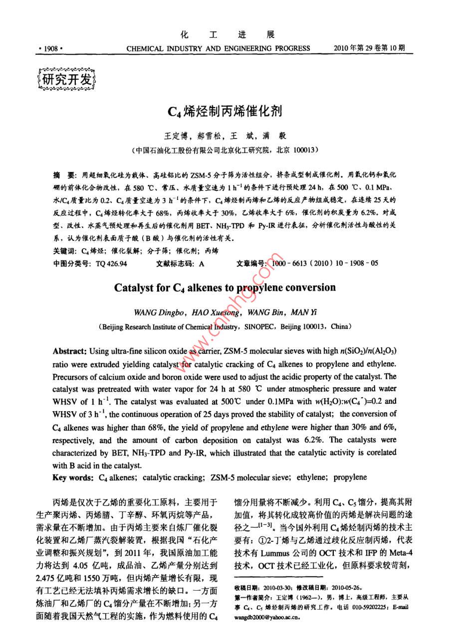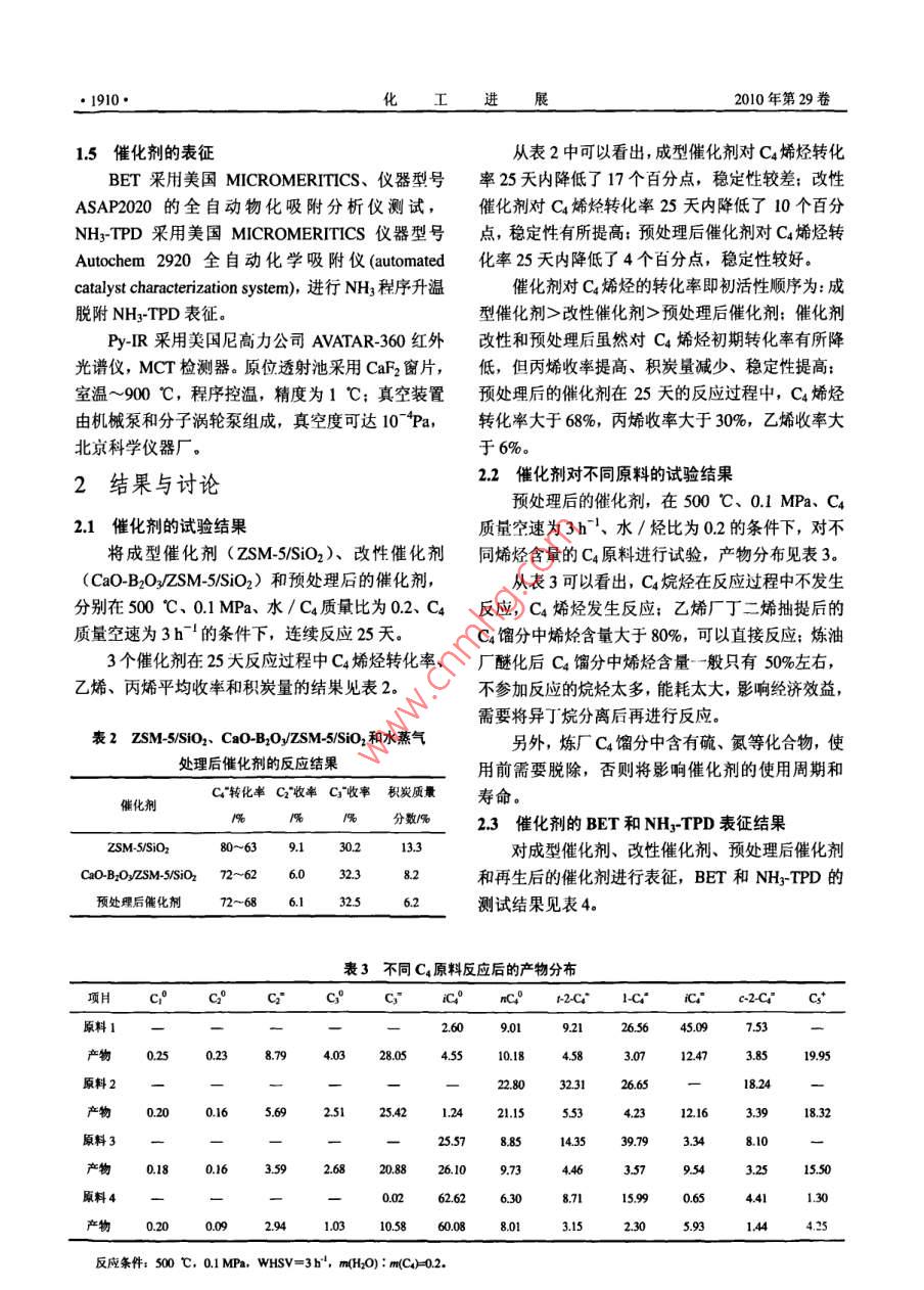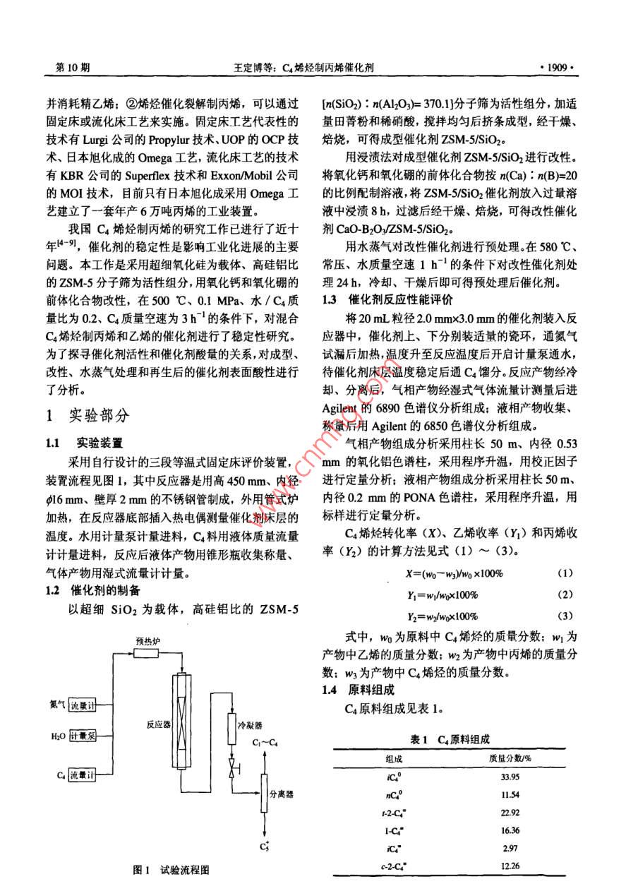 化I進(jìn)展●1908●CHEMICAL INDUSTRY AND ENGINEERING PROGRESS2010年第29卷第10期研究開(kāi)發(fā)C4烯烴制丙烯催化劑王定博,郝雪松,王斌,滿毅(中國(guó)石油化工股份有限公司北京化工研究院,北京100013)摘要:用超細(xì)氧化硅為載體、高硅鋁比的ZSM-5分子篩為活性組分,擠條成型制成催化劑。用氧化鈣和氧化硼的前體化合物改性,在580 C.常壓、水質(zhì)量空速為1h-'的條件下進(jìn)行預(yù)處理24h,在500 C、0.1 MPa.水/C.質(zhì)量比為0.2、Cs質(zhì)量空速為3 h '的條件下,C4烯烴制丙烯和乙烯的反應(yīng)產(chǎn)物組成穩(wěn)定,在連續(xù)25天的反應(yīng)過(guò)程中,Cg烯烴轉(zhuǎn)化率大于68%,丙烯收率大于30%,乙烯收率大于6%,催化劑的積炭量為6.2%.對(duì)成型、改性、水蒸氣預(yù)處理和再生后的催化劑用BET、NHs-TPD 和Py-IR 進(jìn)行表征,分析催化劑活性與酸性的關(guān)系,認(rèn)為催化劑表面質(zhì)子酸(B酸)與催化劑的活性有關(guān)。關(guān)鍵詞: C.烯烴;催化裂解;分子篩;催化劑;丙烯中圖分類號(hào): TQ 426.94文獻(xiàn)標(biāo)志碼: A文章編號(hào): 1000- 6613 (2010) 10- 1908 - 05 ;Catalyst for C4 alkenes to propylene conversionWANG Dingbo, HAO Xuesong,WANG Bin, MAN Yi(Beijing Research Institute of Chemical Industy, SINOPEC, Beijing 100013, China)Abstract: Using ultra-fine silicon oxide as carrier, ZSM-5 molecular sieves with high n(SiO2)/n(Al2O3)ratio were extruded yielding catalyst for catalytic cracking of C4 alkenes to propylene and ethylene.Precursors of calcium oxide and boron oxide were used to adjust the acidic property of the catalyst. Thecatalyst was pretreated with water vapor for 24 h at 580 C under atmospheric pressure and waterWHSV of 1 h*'. The catalyst was evaluated at 500C under 0.1MPa with w(H2O):w(C4" )=0.2 andWHSV of 3 h*', the continuous operation of 25 days proved the stability of catalyst; the conversion ofC4 alkenes was higher than 68%, the yield of propylene and ethylene were higher than 30% and 6%, .respectively, and the amount of carbon deposition on catalyst was 6.2%. The catalysts werecharacterized by BET, NH3-TPD and Py-IR, which illustrated that the catalytic activity is corelatedwith B acid in the catalyst.Key words: C4 alkenes; catalytic cracking; ZSM-5 molecular sieve; ethylene; propylene丙烯是僅次于乙烯的重要化工原料,主要用于餾分用量將不斷減少。利用C4、Cs餾分,提高其附生產(chǎn)聚丙烯、丙烯腈、丁辛醇、環(huán)氧丙烷等產(chǎn)品,加值,將其轉(zhuǎn)化成較高價(jià)值的丙烯是解決問(wèn)題的途需求量在不斷增加。由于丙烯主要來(lái)自煉廠催化裂徑之一(1-31。當(dāng)今國(guó)外利用Ca烯烴制丙烯的技術(shù)主化裝置和乙烯廠蒸汽裂解裝置,根據(jù)我國(guó)“石化產(chǎn)要有:①2-丁烯與乙烯通過(guò)歧化反應(yīng)制丙烯,代表業(yè)調(diào)整和振興規(guī)劃”,到2011年,我國(guó)原油加工能技術(shù)有Lummus公司的0CT技術(shù)和IFP的Meta-4力將達(dá)到4.05億噸,成品油、乙烯產(chǎn)量分別達(dá)到技術(shù),OCT 技術(shù)已經(jīng)工業(yè)化,但原料要求較苛刻,2.475億噸和1550萬(wàn)噸,但內(nèi)烯產(chǎn)量增長(zhǎng)有限,現(xiàn)有工藝已經(jīng)無(wú)法填補(bǔ)丙烯需求增長(zhǎng)的缺口。-方面收稿日期: 2010-03-30; 修改稿日期: 2010-05-26.煉油廠和乙烯廠的C4餾分產(chǎn)量在不斷增加:另一方第- -作者簡(jiǎn)介:王定博(1962-),男,博上,高級(jí)工程師,主要從事C. C,烯烴制丙烯的研究工作。電話010-592225: E-mail面隨著我國(guó)天然氣工程的實(shí)施,作為燃料使用的C4wandb2000@ybo.acn.o第10期王定博等: Cs 烯烴制丙烯催化劑●1909.并消耗精乙烯;②烯烴催化裂解制丙烯,可以通過(guò)[n(SiO2) : n(Al2O3)= 370.1]分子篩為活性組分,加適固定床或流化床工藝來(lái)實(shí)施。固定床工藝代表性的量田菁粉和稀硝酸,攪拌均勻后擠條成型,經(jīng)干燥、技術(shù)有Lurgi公司的Propylur技術(shù)、UOP的OCP技焙燒,可得成型催化劑ZSM-5/Si02。術(shù)、日本旭化成的Omega工藝,流化床I藝的技術(shù)用浸漬法對(duì)成型催化劑ZSM-5/SiO2進(jìn)行改性。有KBR公司的Superflex技術(shù)和Exxon/Mobil公司將氧化鈣和氧化硼的前體化合物按n(Ca) : n(B)=20的MOI技術(shù),目前只有8本旭化成采用Omega工的比例配制溶液,將ZSM-5/SiO2 催化劑放入過(guò)最溶藝建立了一套年產(chǎn)6萬(wàn)噸丙烯的工業(yè)裝置。液中浸漬8h,過(guò)濾后經(jīng)干燥、焙燒,可得改性催化我國(guó)C4烯烴制丙烯的研究工作已進(jìn)行了近十劑CaO_B2O3/ZSM-5/SiO2。年14-91,催化劑的穩(wěn)定性是影響工業(yè)化進(jìn)展的主要用水蒸氣對(duì)改性催化劑進(jìn)行預(yù)處理。在580 C、問(wèn)題。本工作是采用超細(xì)氧化硅為載體、高硅鋁比常壓、水質(zhì)量空速1 h~'的條件下對(duì)改性催化劑處的ZSM-5分子篩為活性組分,用氧化鈣和氧化硼的理24h,冷卻、干燥后即可得預(yù)處理后催化劑。前體化合物改性,在500 C、0.1 MPa、水/C4質(zhì)1.3 催化劑反應(yīng)性能評(píng)價(jià)量比為0.2、Cs質(zhì)量空速為3h^ 1的條件下,對(duì)混合將20 mL粒徑2.0 mmx3.0 mm的催化劑裝入反C4烯烴制丙烯和乙烯的催化劑進(jìn)行了穩(wěn)定性研究。應(yīng)器中,催化劑上、下分別裝適量的瓷環(huán),通氮?dú)鉃榱颂綄ご呋瘎┗钚院痛呋瘎┧崃康年P(guān)系,對(duì)成型、試漏斤加熱,溫度升至反應(yīng)溫度后開(kāi)啟計(jì)量泵通水,改性、水蒸氣處理和再生后的催化劑表面酸性進(jìn)行待催化劑床層溫度