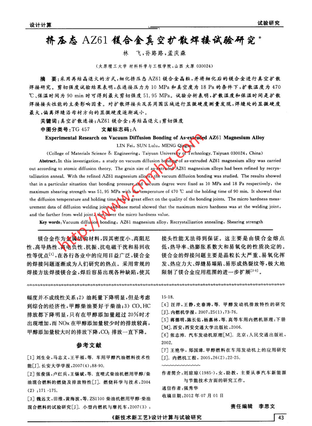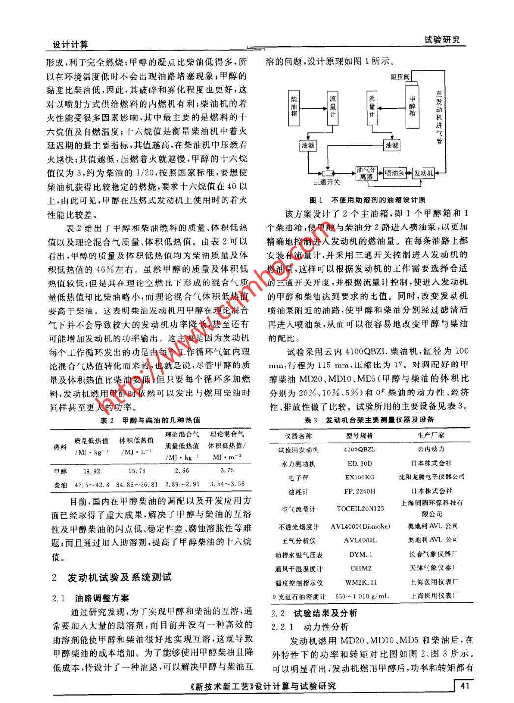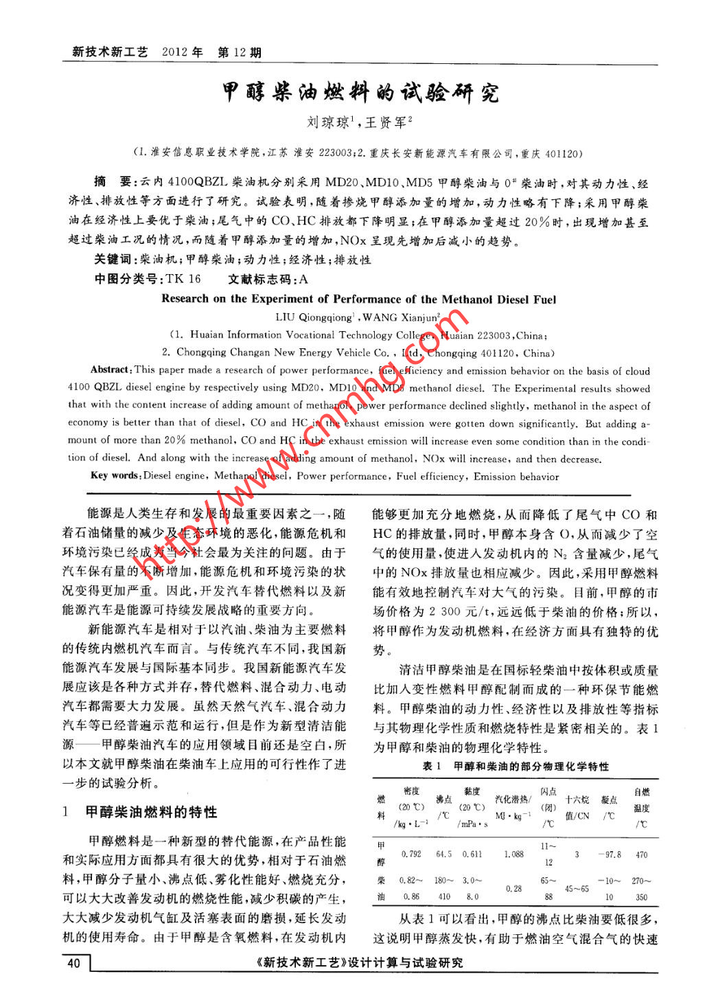 新技術(shù)新工藝2012年 第12期甲醇柴油燃料的試驗(yàn)研究劉瓊瓊',王賢軍2(1.淮安信息職業(yè)技術(shù)學(xué)院,江蘇淮安223003;2. 重慶長(zhǎng)安新能源汽車(chē)有限公司,重慶40120)摘要:云內(nèi) 4100QBZL柴油機(jī)分別采用MD20、MD10、MD5甲醇柴油與0#柴油時(shí),對(duì)其動(dòng)力性、經(jīng)濟(jì)性、排放性等方面進(jìn)行了研究。試驗(yàn)表明,隨著摻燒甲醇添加量的增加,動(dòng)力性略有下降;采用甲醇柴油在經(jīng)濟(jì)性.上要優(yōu)于柴油;尾氣中的CO.HC排放都下降明顯;在甲醇添加量超過(guò)20%時(shí),出現(xiàn)增加甚至超過(guò)柴油工況的情況,而隨著甲醇添加量的增加,NOx呈現(xiàn)先增加后減小的趨勢(shì)。關(guān)鍵詞:柴油機(jī);甲醇柴油;動(dòng)力性;經(jīng)濟(jì)性;排放性中圖分類(lèi)號(hào):TK 16文獻(xiàn)標(biāo)志碼:AResearch on the Experiment of Performance of the Methanol Diesel FuelLIU Qiongqiong' ,W ANG Xianjun2(1. Huaian Information Vocational Technology College, Huaian 223003 ,China;2. Chongqing Changan New Energy Vehicle Co. , Lid, Chongqing 401 120, China)Abstract:This paper made a research of power performance, fuel efliciency and ernission behavior on the basis of cloud4100 QBZL diesel engine by respectively using MD20,MD10 and MD5 methanol diesel. The Experimental results showedthat with the content increase of adding amount of methanol, power performance declined slightly, methanol in the aspect ofeconomy is better than that of diesel, CO and HC in the exhaust emission were gotten down significantly. But adding a-mount of more than 20% methanol, CO and HC in the exhaust emission will increase even some condition than in the condi-tion of diesel. And along with the increase of adding amount of methanol, NOx will increase, and then decrease.Key words: Diesel engine, Methanol diesel, Power performance, Fuel efficiency, Emission behavior能源是人類(lèi)生存和發(fā)展的最重要因素之一,隨能夠更加充分地燃燒,從而降低了尾氣中CO和著石油儲(chǔ)量的減少及生態(tài)環(huán)境的惡化,能源危機(jī)和HC的排放量,同時(shí),甲醇本身含O,從而減少了空環(huán)境污染已經(jīng)成為當(dāng)今社會(huì)最為關(guān)注的問(wèn)題。由于氣的使用量,使進(jìn)人發(fā)動(dòng)機(jī)內(nèi)的N2含量減少,尾氣汽車(chē)保有量的不斷增加,能源危機(jī)和環(huán)境污染的狀中的NOx排放量也相應(yīng)減少。因此,采用甲醇燃料況變得更加嚴(yán)重。因此,開(kāi)發(fā)汽車(chē)替代燃料以及新能有效地控制汽車(chē)對(duì)大氣的污染。目前,甲醇的市能源汽車(chē)是能源可持續(xù)發(fā)展戰(zhàn)略的重要方向。場(chǎng)價(jià)格為2 300元/t,遠(yuǎn)遠(yuǎn)低于柴油的價(jià)格;所以,新能源汽車(chē)是相對(duì)于以汽油.柴油為主要燃料將甲醇作為發(fā)動(dòng)機(jī)燃料,在經(jīng)濟(jì)方面具有獨(dú)特的優(yōu)的傳統(tǒng)內(nèi)燃機(jī)汽車(chē)而言。與傳統(tǒng)汽車(chē)不同,我國(guó)新勢(shì)。能源汽車(chē)發(fā)展與國(guó)際基本同步。我國(guó)新能源汽車(chē)發(fā)清潔甲醇柴油是在國(guó)標(biāo)輕柴油中按體積或質(zhì)量展應(yīng)該是各種方式并存,替代燃料、混合動(dòng)力、電動(dòng)比加人變性燃料甲醇配制而成的一種環(huán)保節(jié)能燃汽車(chē)都需要大力發(fā)展。雖然天然氣汽車(chē)、混合動(dòng)力料。甲醇柴油的動(dòng)力性、經(jīng)濟(jì)性以及排放性等指標(biāo)汽車(chē)等已經(jīng)普遍示范和運(yùn)行,但是作為新型清潔能與其物理化學(xué)性質(zhì)和燃燒特性是緊密相關(guān)的。表1源一甲醇柴油汽車(chē)的應(yīng)用領(lǐng)域目前還是空白,所為甲醇和柴油的物理化學(xué)特性。以本文就甲醇柴油在柴油車(chē)上應(yīng)用的可行性作了進(jìn)表1甲醇和柴油的部分物理化學(xué)特性一步的試驗(yàn)分析。密度沸黏度汽化潛熱/,內(nèi)點(diǎn)十六烷凝點(diǎn)自燃1甲 醇柴油燃料的特性(20 C),/M.kg-'(閉)值/CN /C溫度/kq.L-1/mPa.s/甲醇燃料是一種新型的替代能源,在產(chǎn)品性能甲110.792 64.5 0.6111. 0883- -97.8 470和實(shí)際應(yīng)用方面都具有很大的優(yōu)勢(shì),相對(duì)于石油燃12料,甲醇分子量小、沸點(diǎn)低、霧化性能好、燃燒充分,0.82~ 180~ 3.0~65-10~ 270~0.2845~65可以大大改善發(fā)動(dòng)機(jī)的燃燒性能,減少積碳的產(chǎn)生,油0.86 410 8.0810 35大大減少發(fā)動(dòng)機(jī)氣缸及活塞表面的磨損,延長(zhǎng)發(fā)動(dòng)從表1可以看出,甲醇的沸點(diǎn)比柴油要低很多,機(jī)的使用壽命。由于甲醇是含氧燃料,在發(fā)動(dòng)機(jī)內(nèi)這說(shuō)明甲醇蒸發(fā)快,有助于燃油空氣混合氣的快速《新技術(shù)新工藝》設(shè)計(jì)計(jì)算與試驗(yàn)研究.試驗(yàn)研究設(shè)計(jì)計(jì)算形成,利于完全燃燒;甲醇的凝點(diǎn)比柴油低得多,所溶的問(wèn)題,設(shè)計(jì)原理如圖1所示。以在環(huán)境溫度低時(shí)不會(huì)出現(xiàn)油路堵塞現(xiàn)象;甲醇的限壓閥黏度比柴油低,因此,其破碎和霧化程度也更好,這對(duì)以噴射方式供給燃料的內(nèi)燃機(jī)有利;柴油機(jī)的著尊|發(fā)動(dòng)火性能受很多因索影響,其中最主要的是燃料的十六烷值及自燃溫度;十六烷值是衡量柴油機(jī)中著火延遲期的最主要指標(biāo),其值越高,在柴油機(jī)中壓燃著火越快;其值越低,壓燃著火就越饅,甲醇的十六烷.值僅為3,約為柴